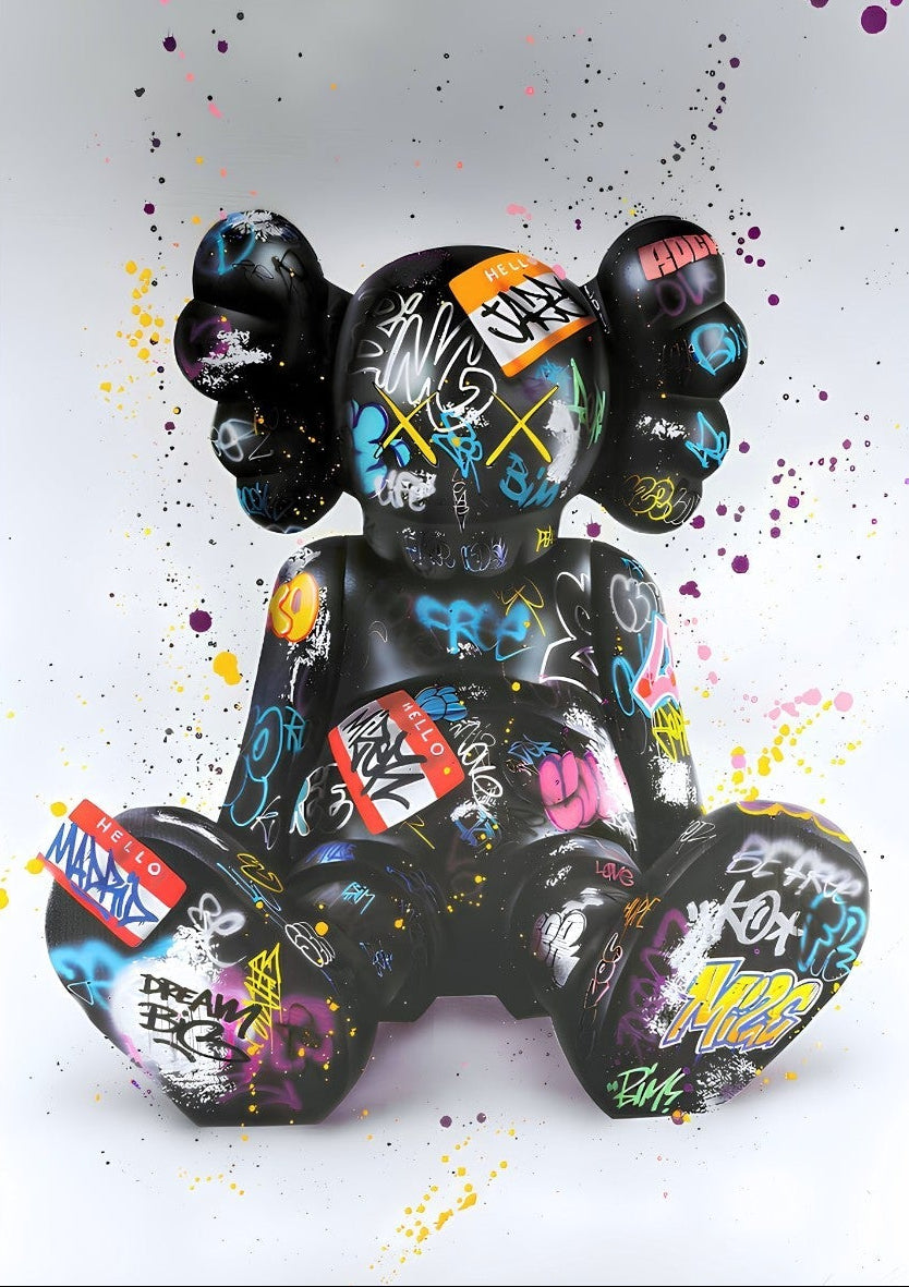 Sitting KAWS brings bold street culture into your space, with the iconic figure transformed through graffiti-inspired tags and vibrant splashes of colour. The striking black base contrasts with neon accents, creating a powerful modern statement. Perfect for contemporary lofts, creative studios, or urban-inspired interiors, this artwork adds energy, attitude, and pop culture flair, making it a standout centrepiece for anyone who loves edgy, expressive, and unconventional wall art.