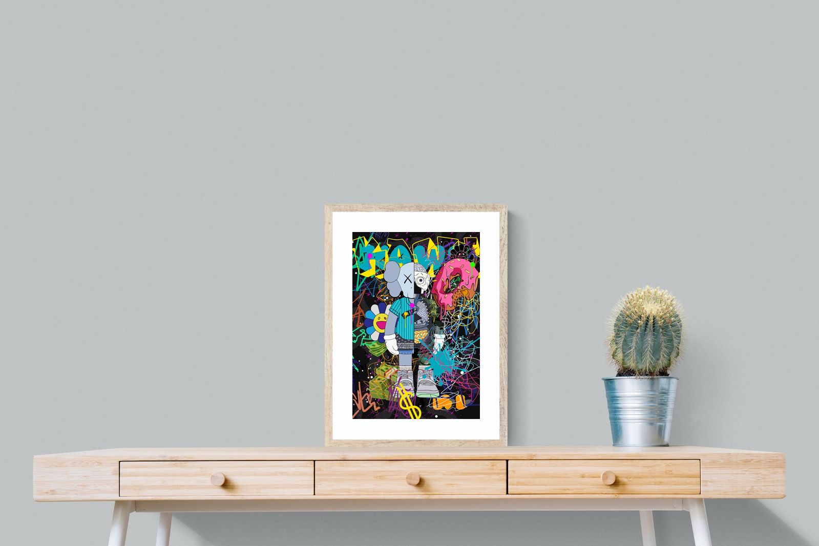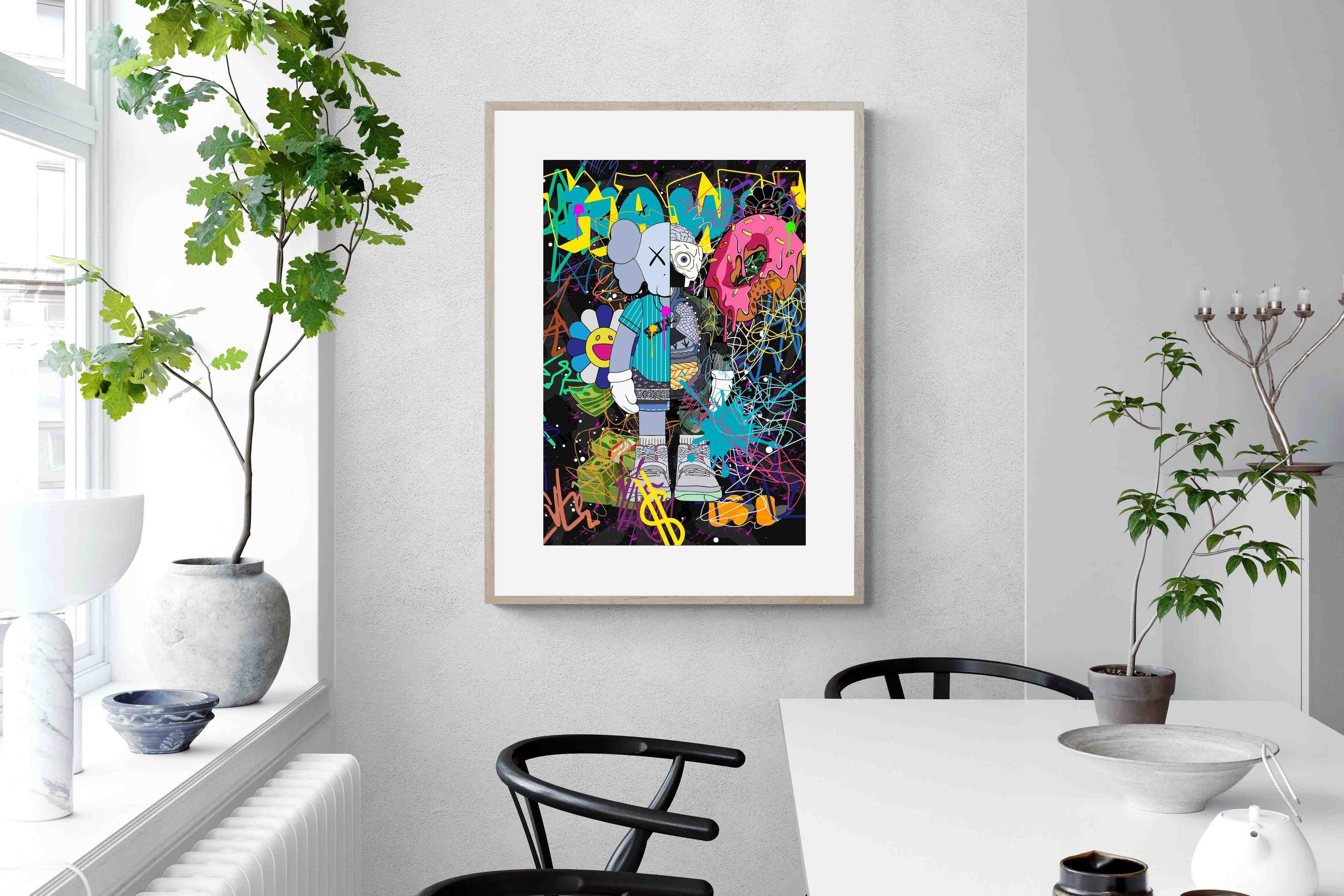 Delve into a whirlwind of colour and creativity with "Street Art KAWS". This piece exudes an electric energy that captures the essence of contemporary street art. Dominated by wild brush strokes, graffiti elements, and vibrant splatters, this artwork makes a bold statement in any space it adorns.