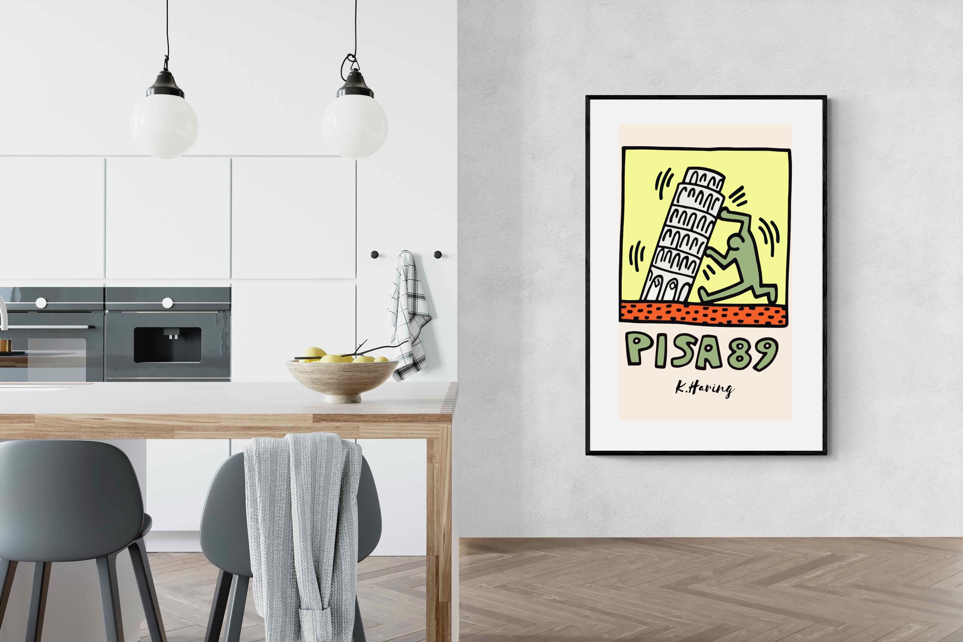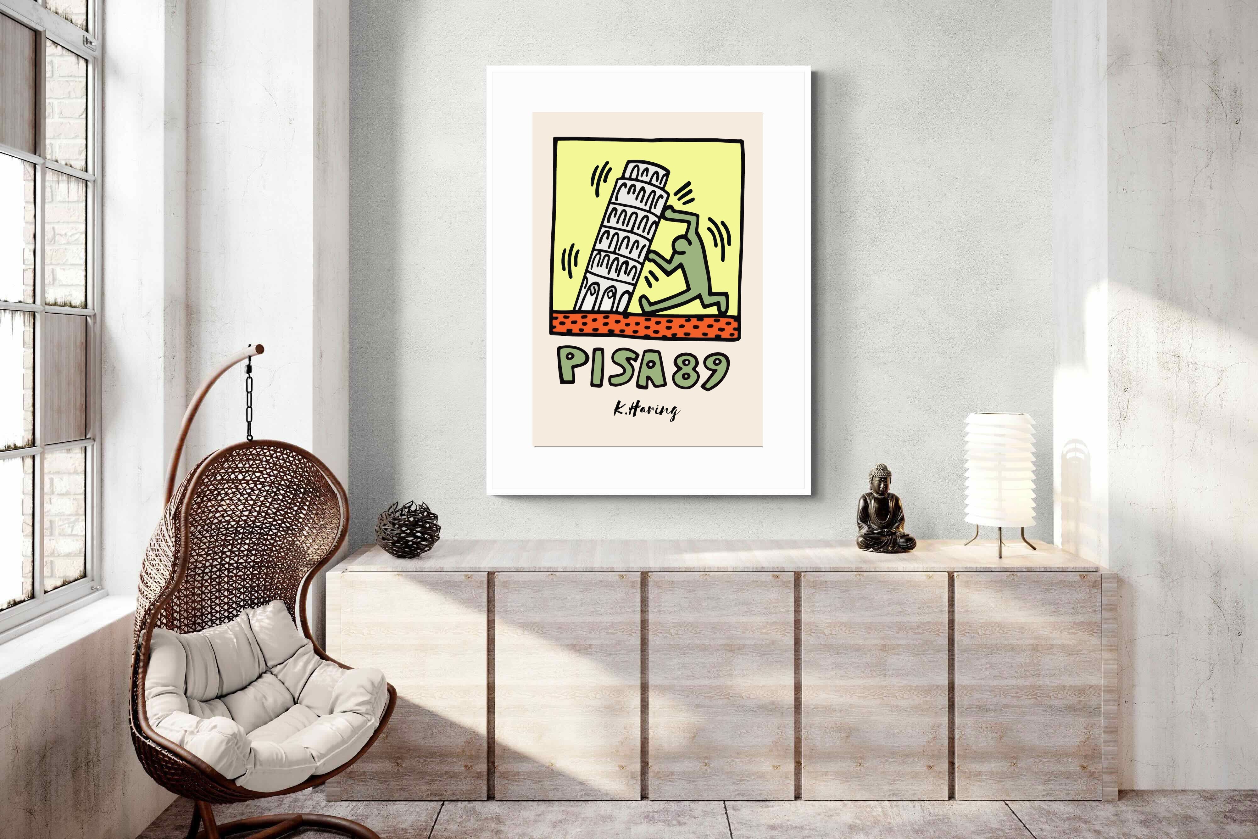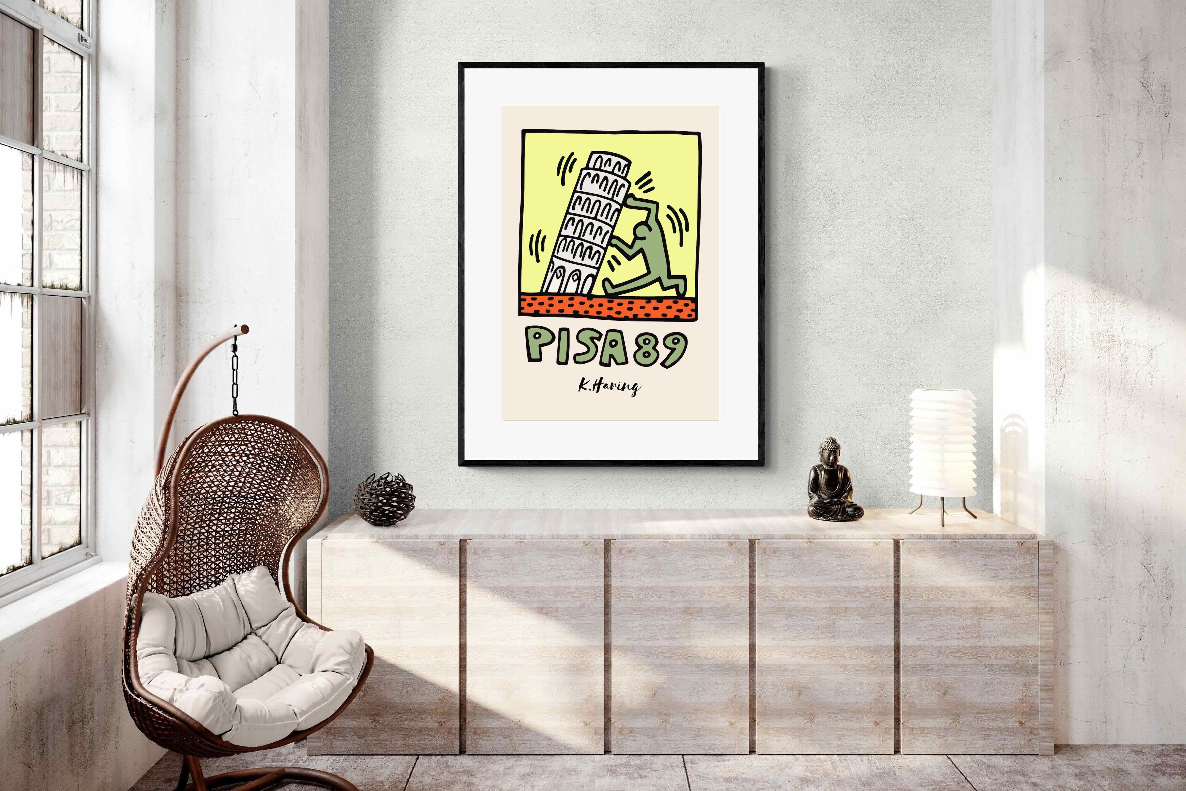 This Keith Haring print epitomises his trademark vibrant and animated style. Haring's playful approach to the iconic Leaning Tower of Pisa, reimagined with his characteristic figures, injects humour and contemporary relevance into a historical landmark. As wall art, this piece would not only serve as a striking visual focal point but also evoke smiles and lighten the atmosphere of any room, making it a delightful addition to the modern home.