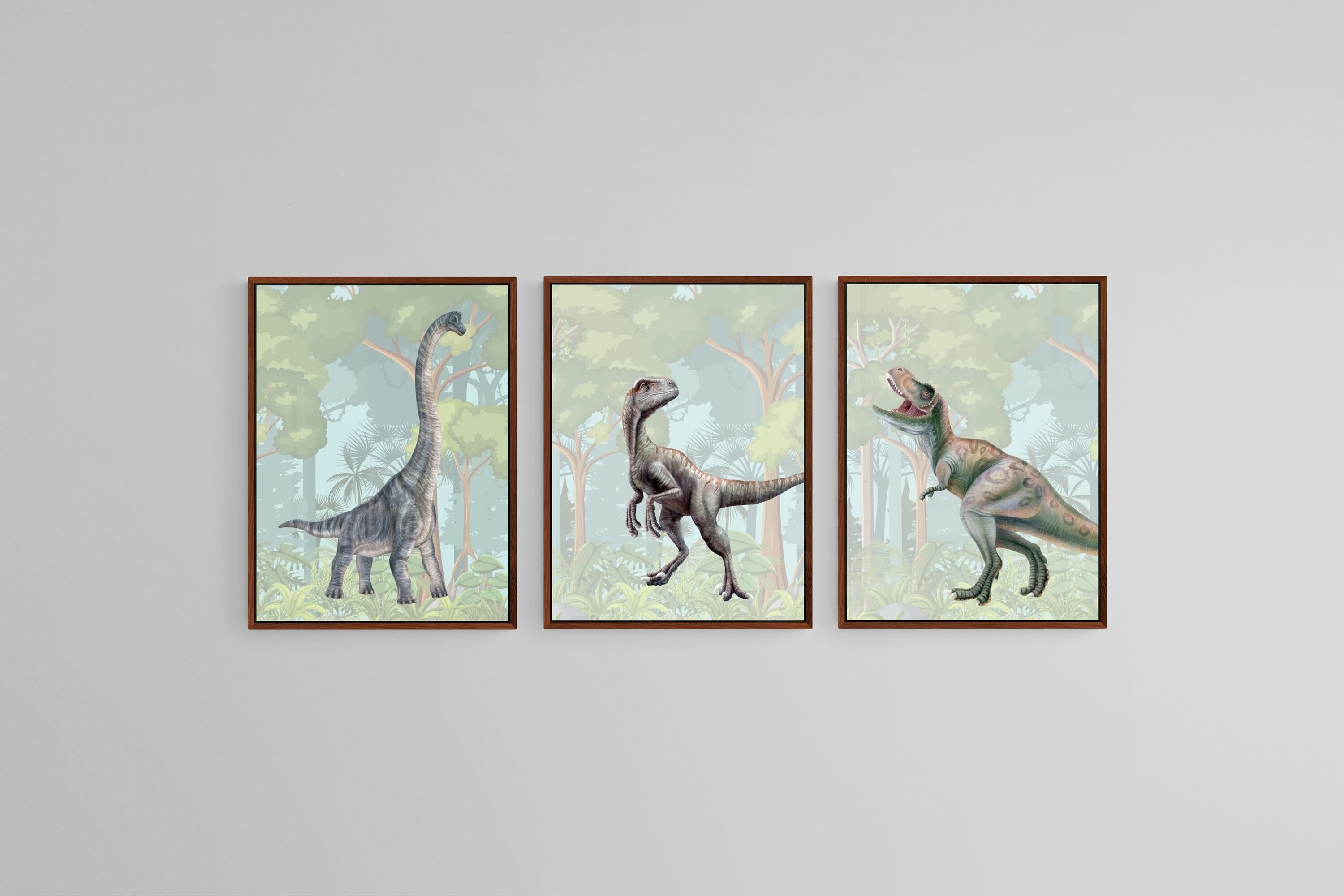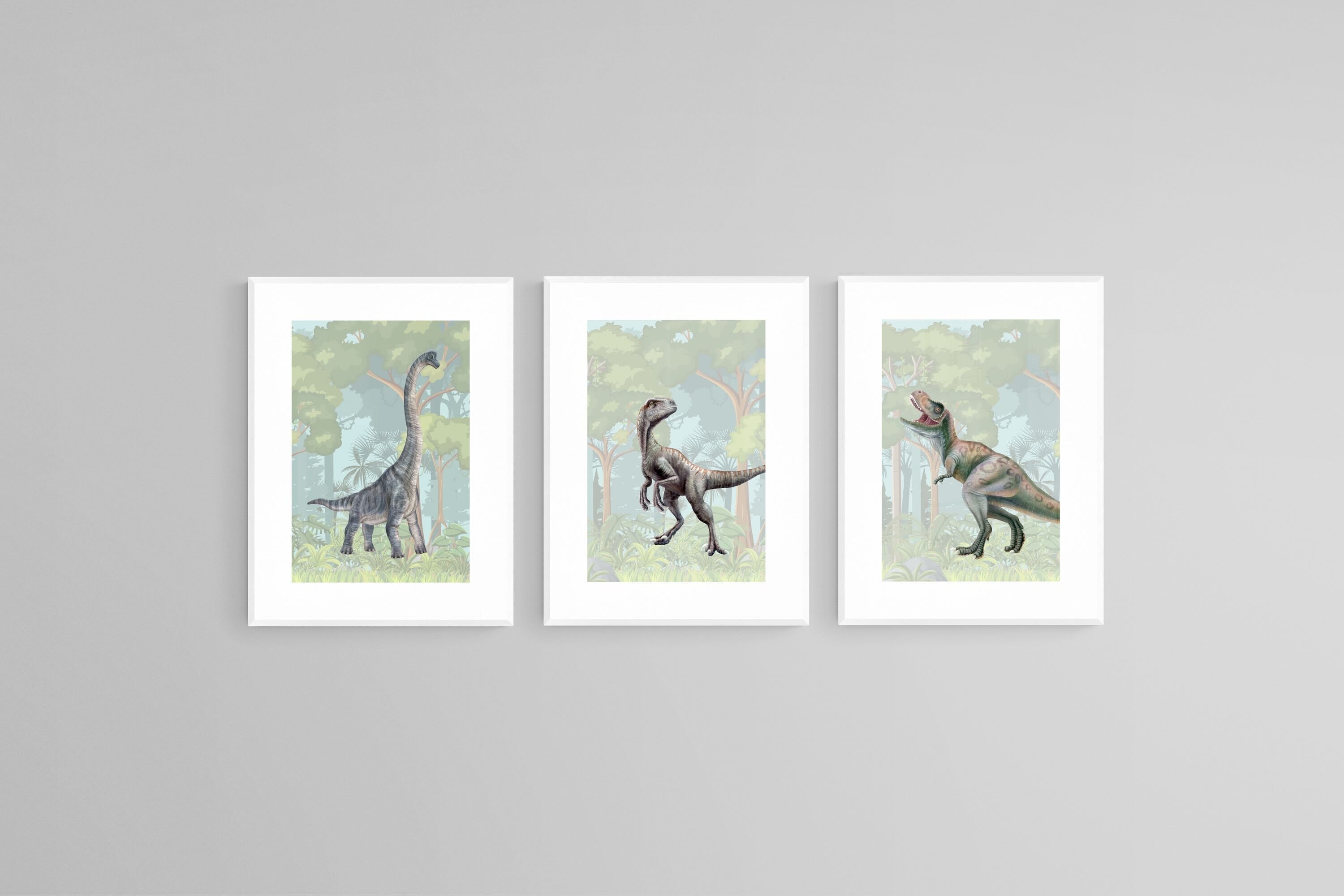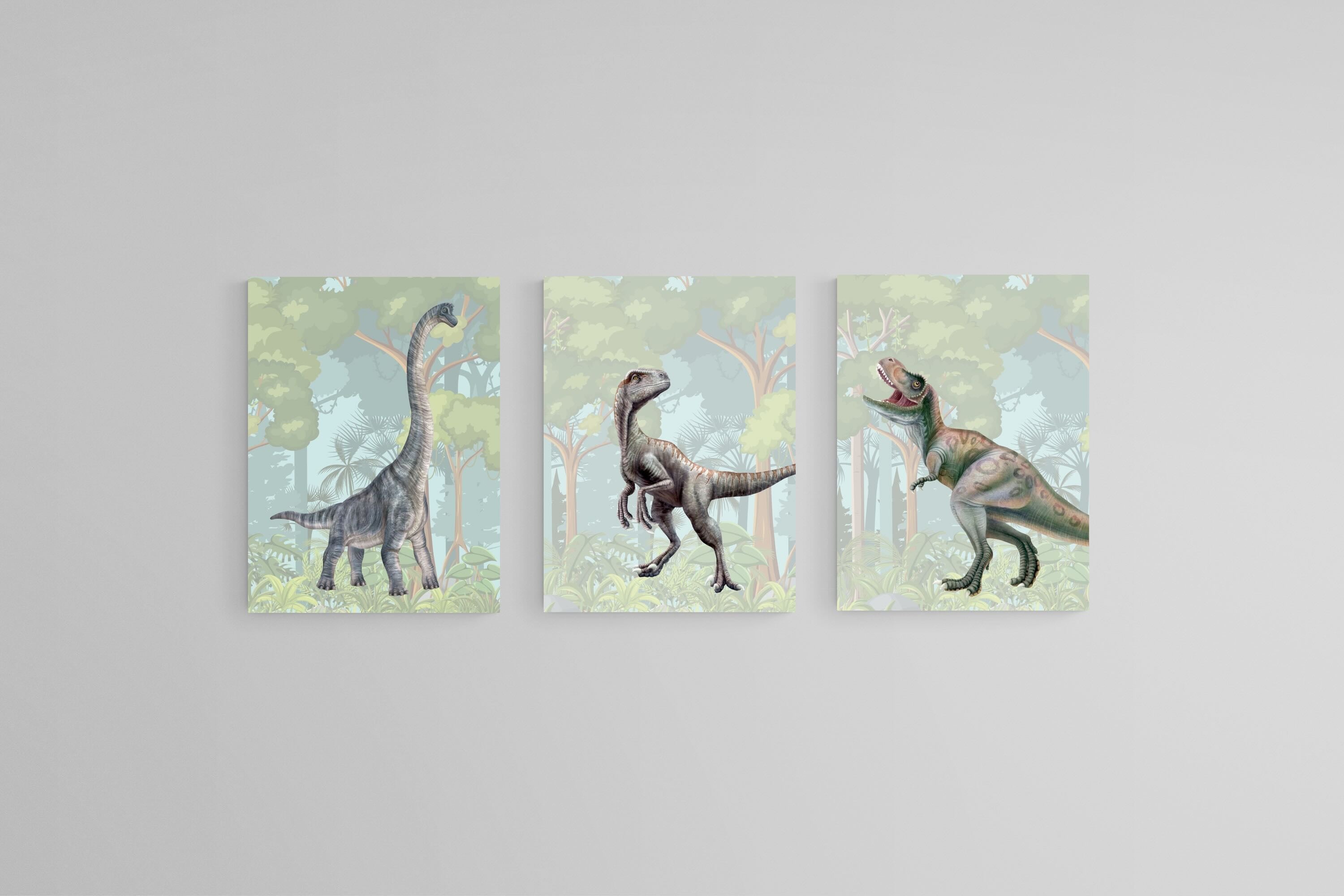 A playful set of three dinosaur illustrations brings prehistoric charm into a soft jungle setting. Each panel features a different species, creating variety while maintaining a cohesive colour palette and gentle backdrop. Ideal for children’s bedrooms, nurseries or playrooms, this set adds personality without overwhelming the space. It offers a balanced, engaging display that sparks imagination while keeping a calm, decorative aesthetic suited to modern family homes.