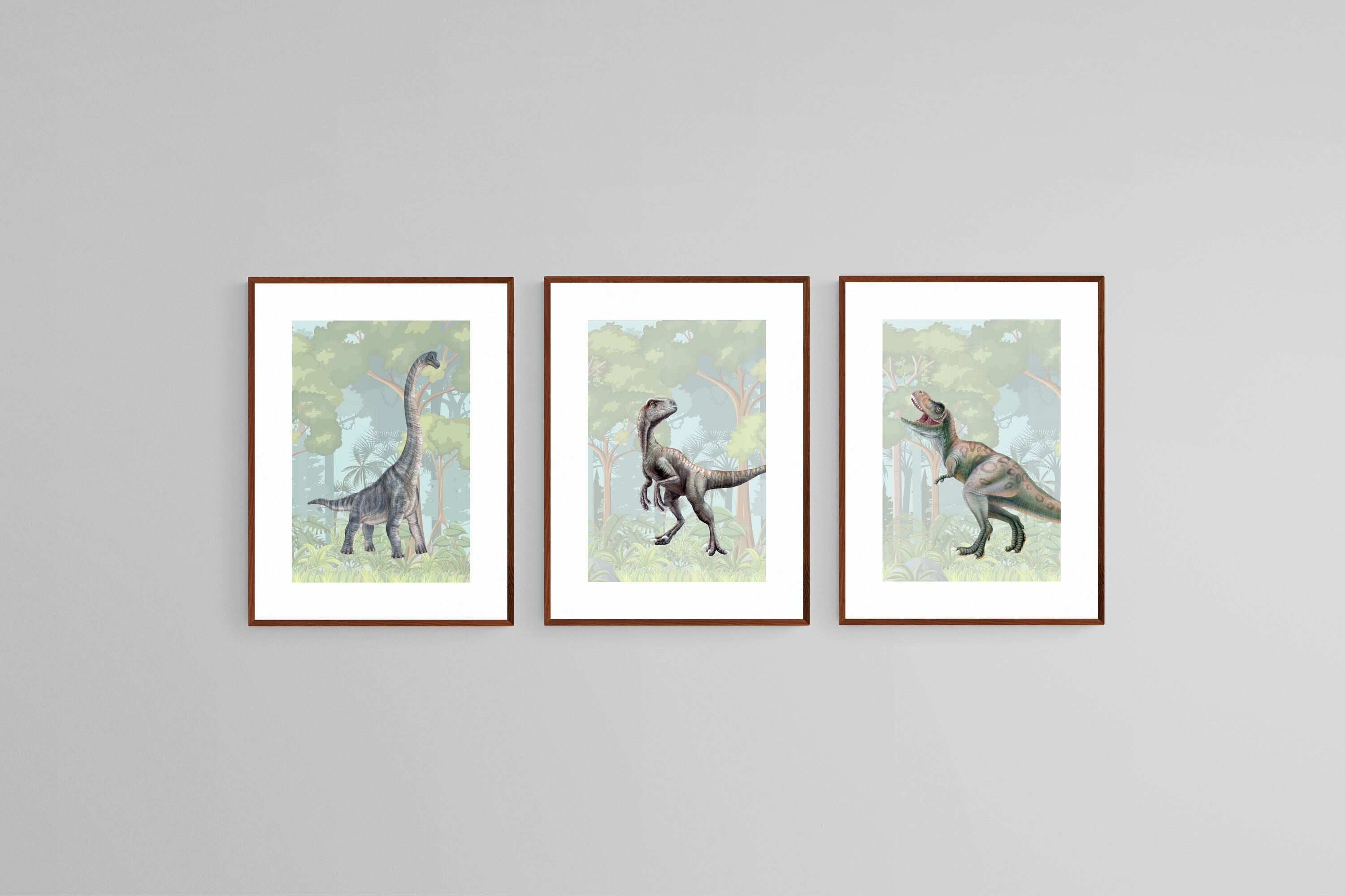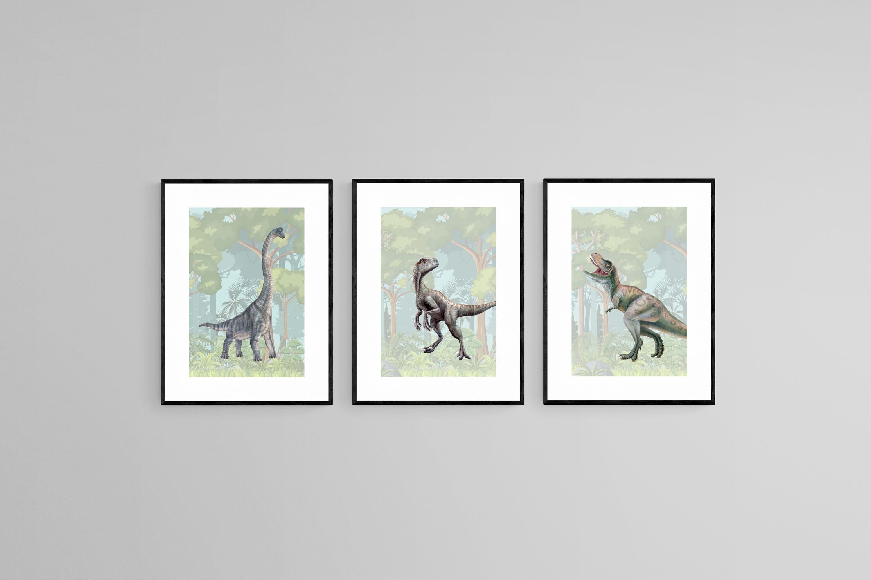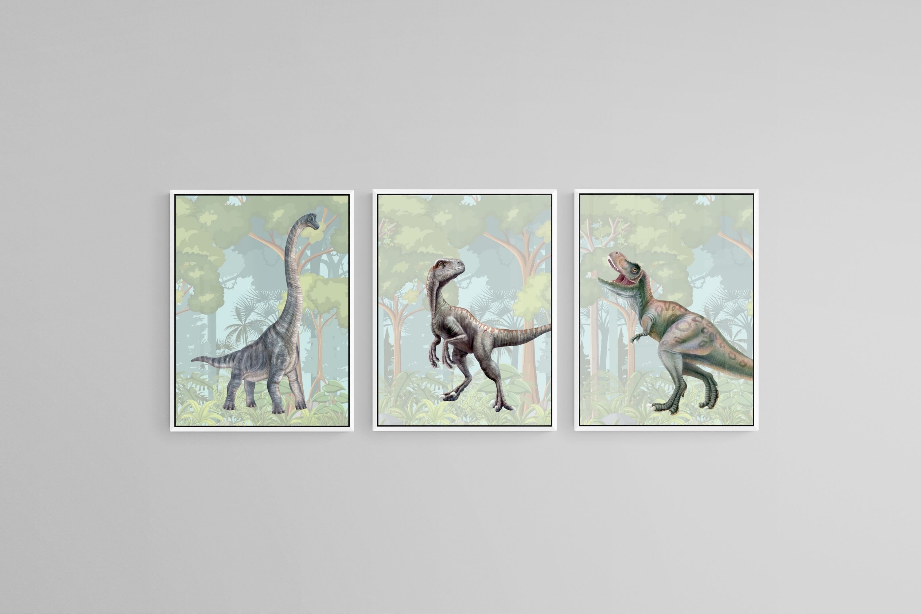 A playful set of three dinosaur illustrations brings prehistoric charm into a soft jungle setting. Each panel features a different species, creating variety while maintaining a cohesive colour palette and gentle backdrop. Ideal for children’s bedrooms, nurseries or playrooms, this set adds personality without overwhelming the space. It offers a balanced, engaging display that sparks imagination while keeping a calm, decorative aesthetic suited to modern family homes.