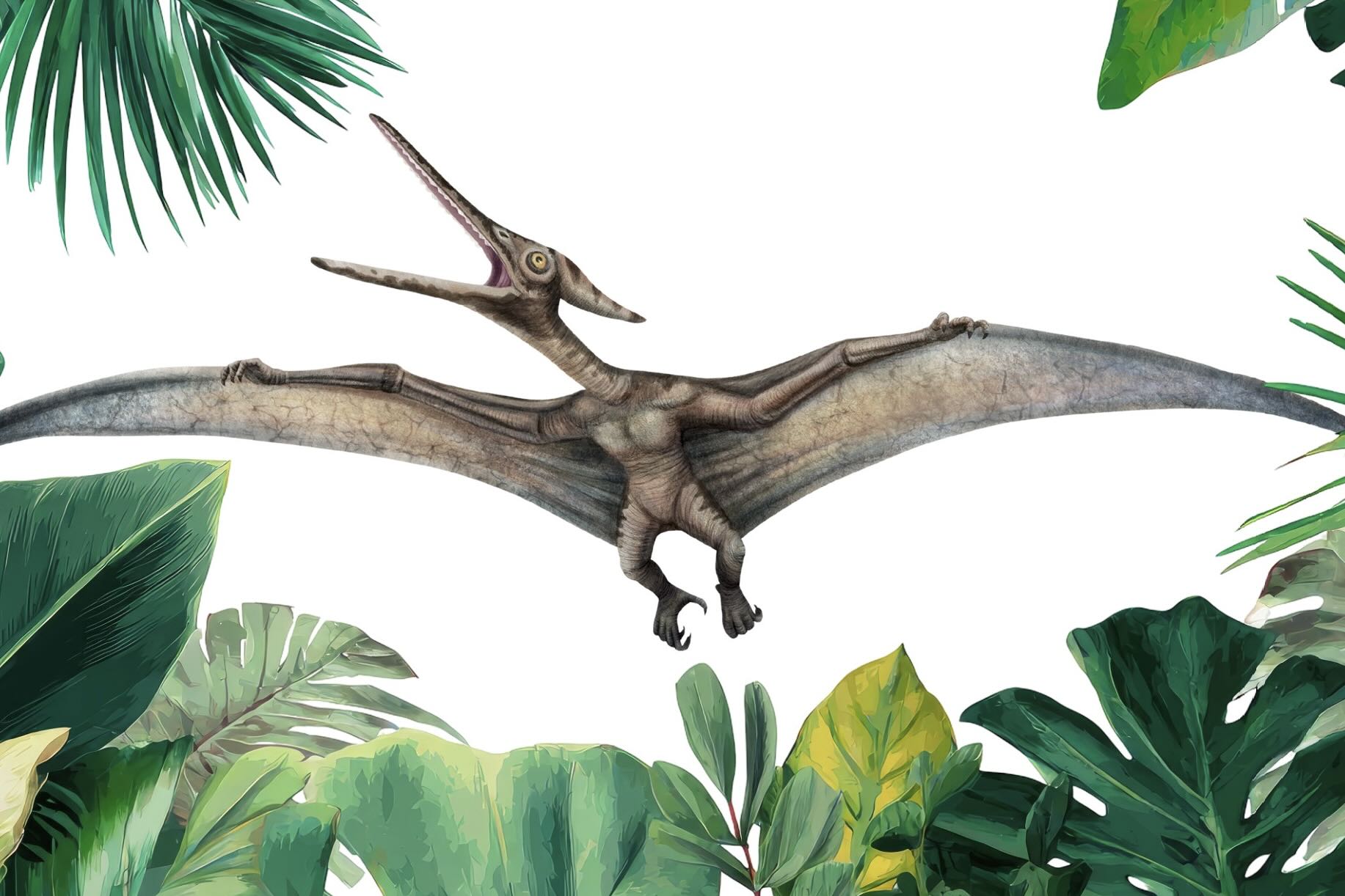 A dynamic pterosaur glides through lush tropical foliage, combining prehistoric intrigue with vibrant botanical detail. The clean background keeps the composition fresh while the illustrated leaves frame the scene with colour and movement. Ideal for playful, modern interiors, this piece works particularly well in children’s bedrooms, playrooms or creative spaces. It offers an engaging blend of education and imagination, bringing a sense of adventure and curiosity to any wall.