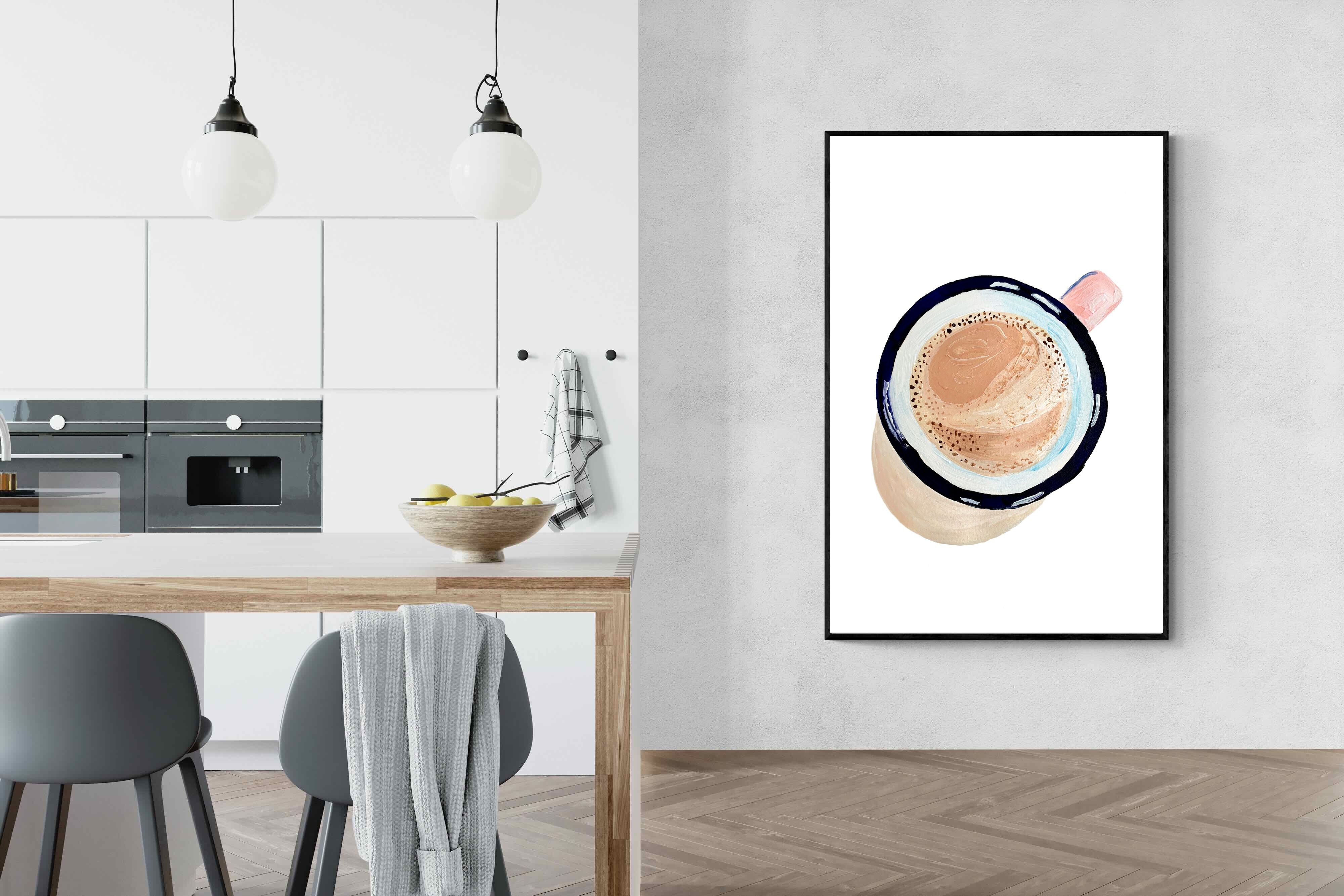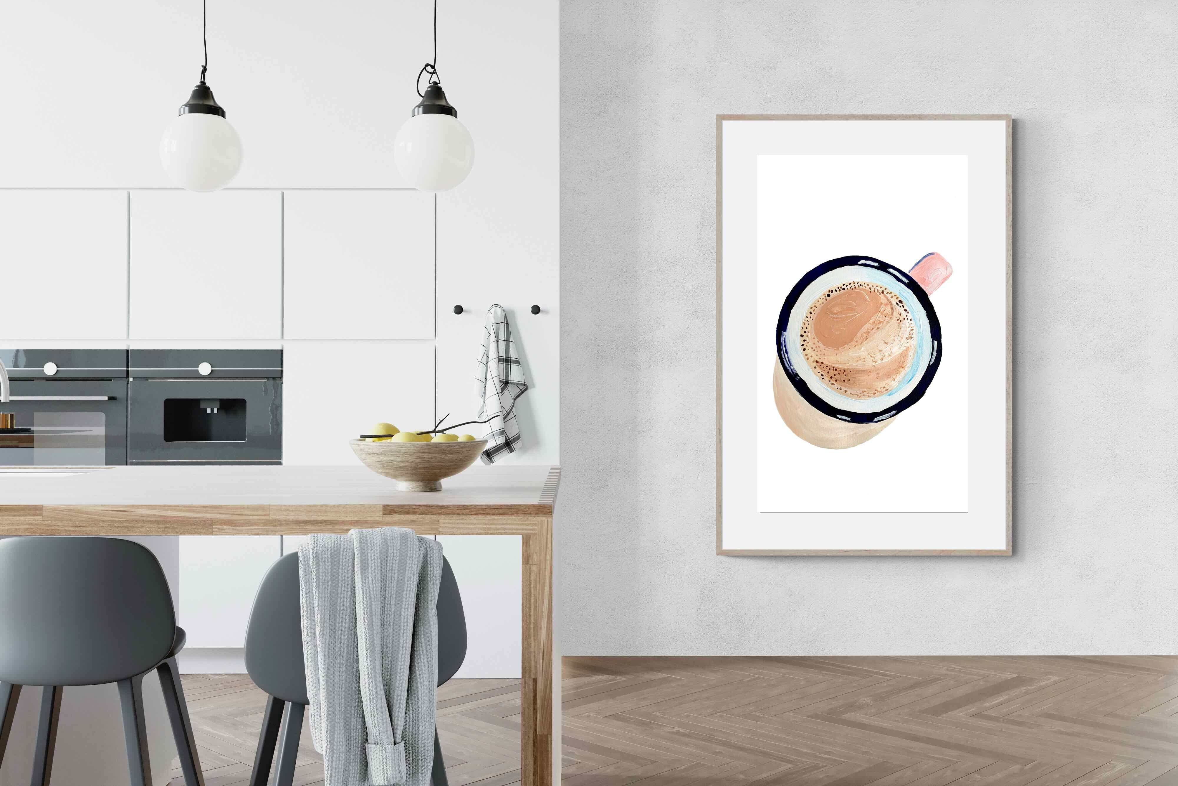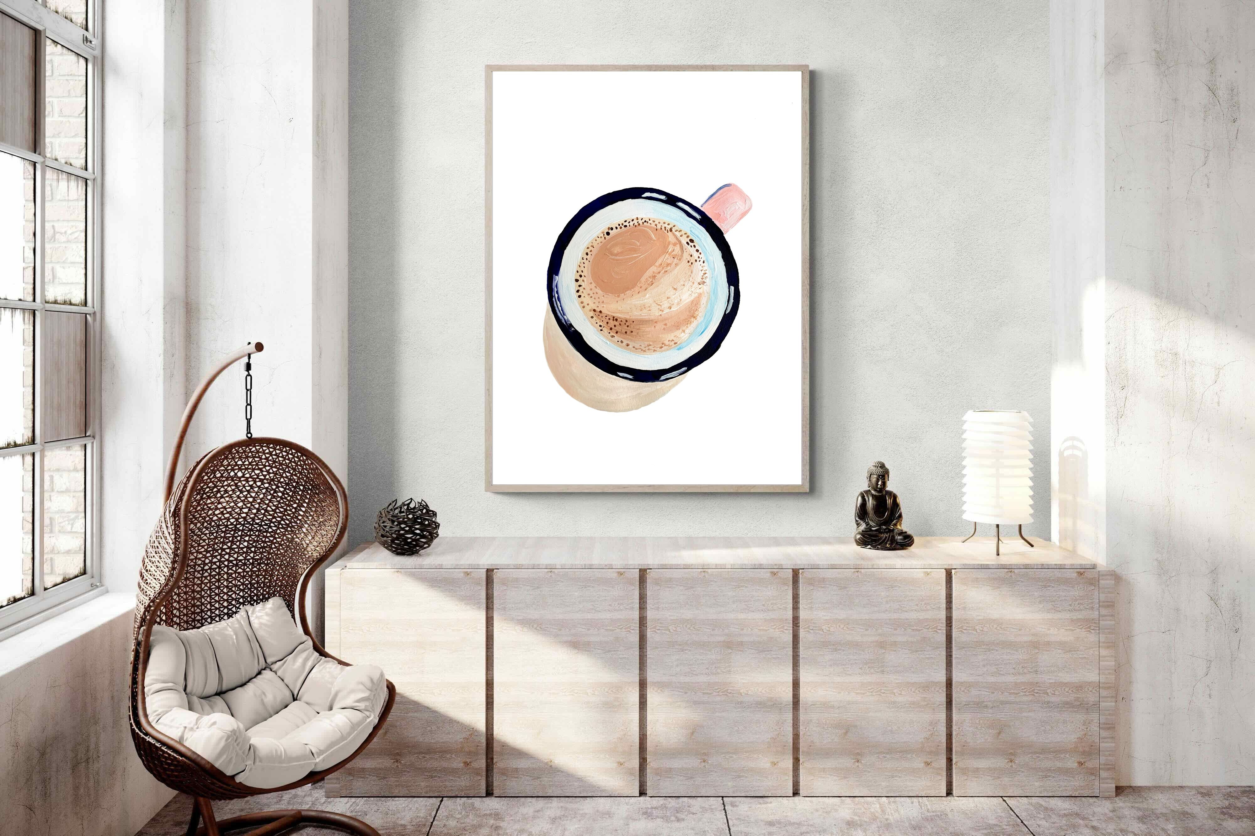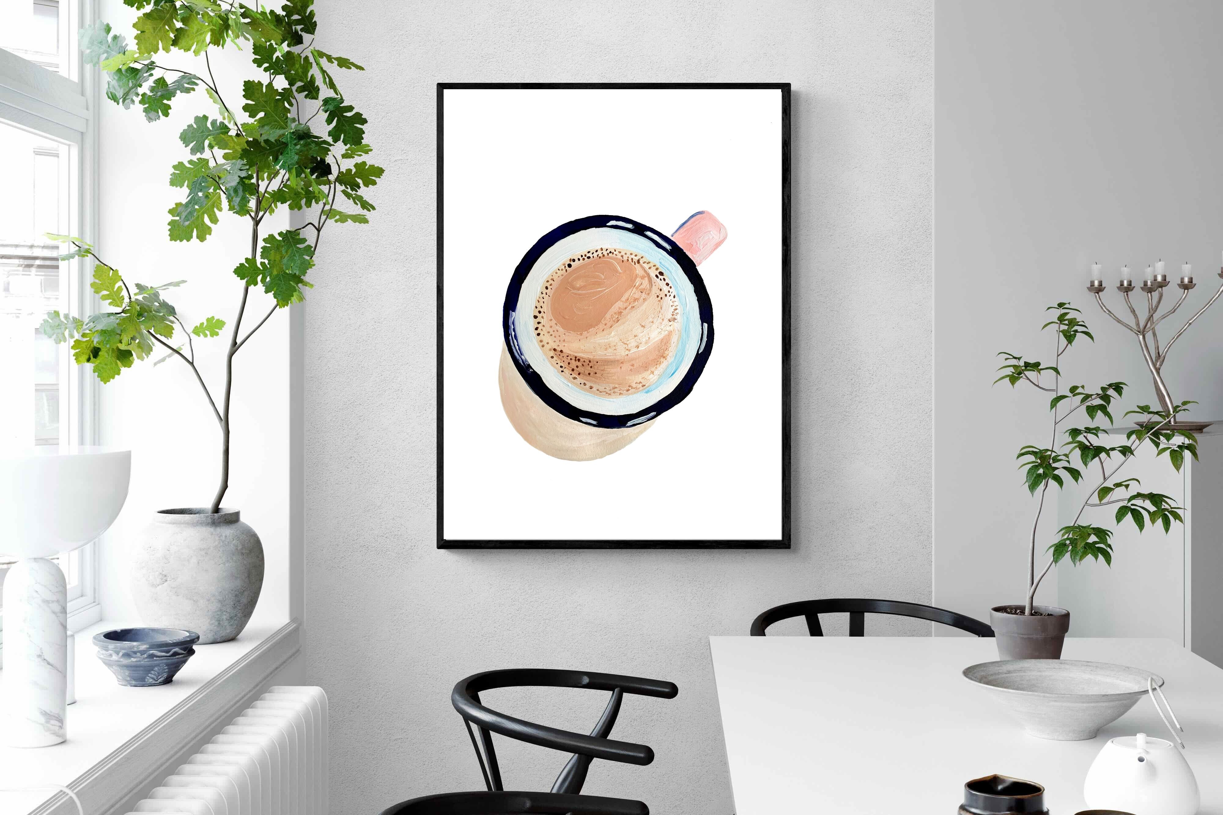This artwork offers a charming, bird's-eye view of a frothy cup of coffee, capturing the simple pleasure of a morning ritual. The soft, pastel tones and delicate brushstrokes create a warm, inviting atmosphere, perfect for kitchens or cosy nooks in contemporary homes. The minimalist style ensures it blends seamlessly with modern decor while adding a touch of homely comfort. It's an ideal piece for anyone who appreciates the beauty in everyday moments, making mornings a little brighter.