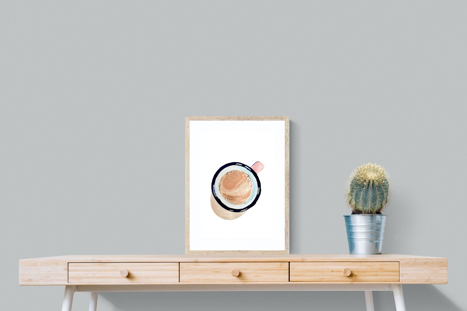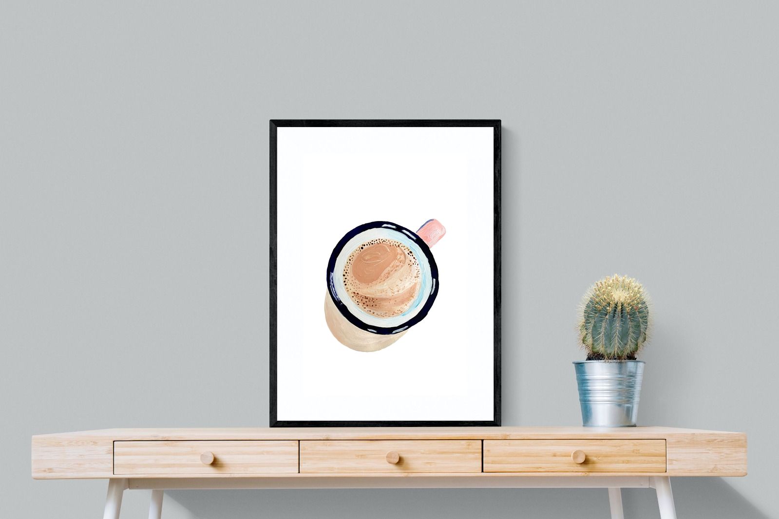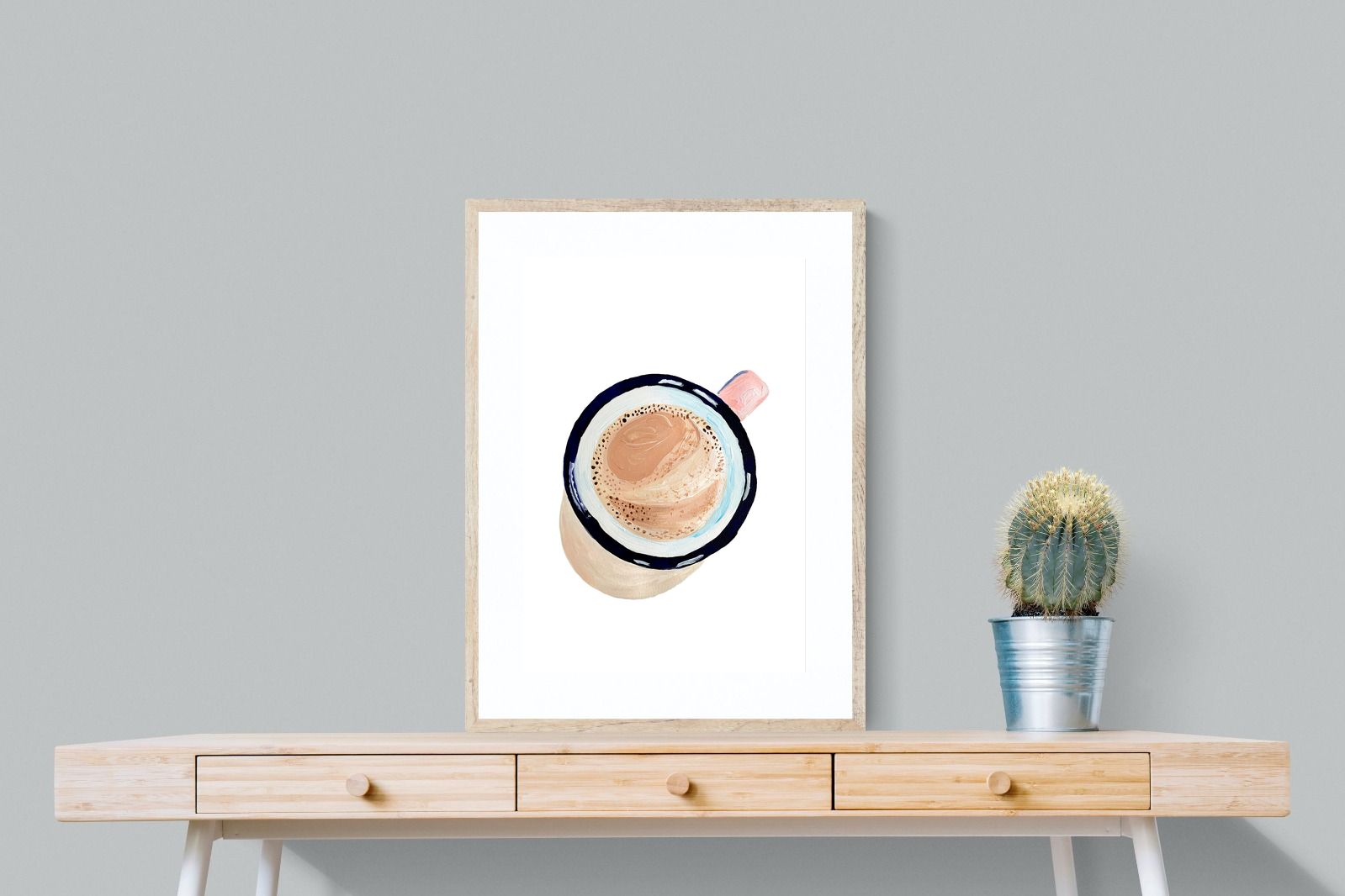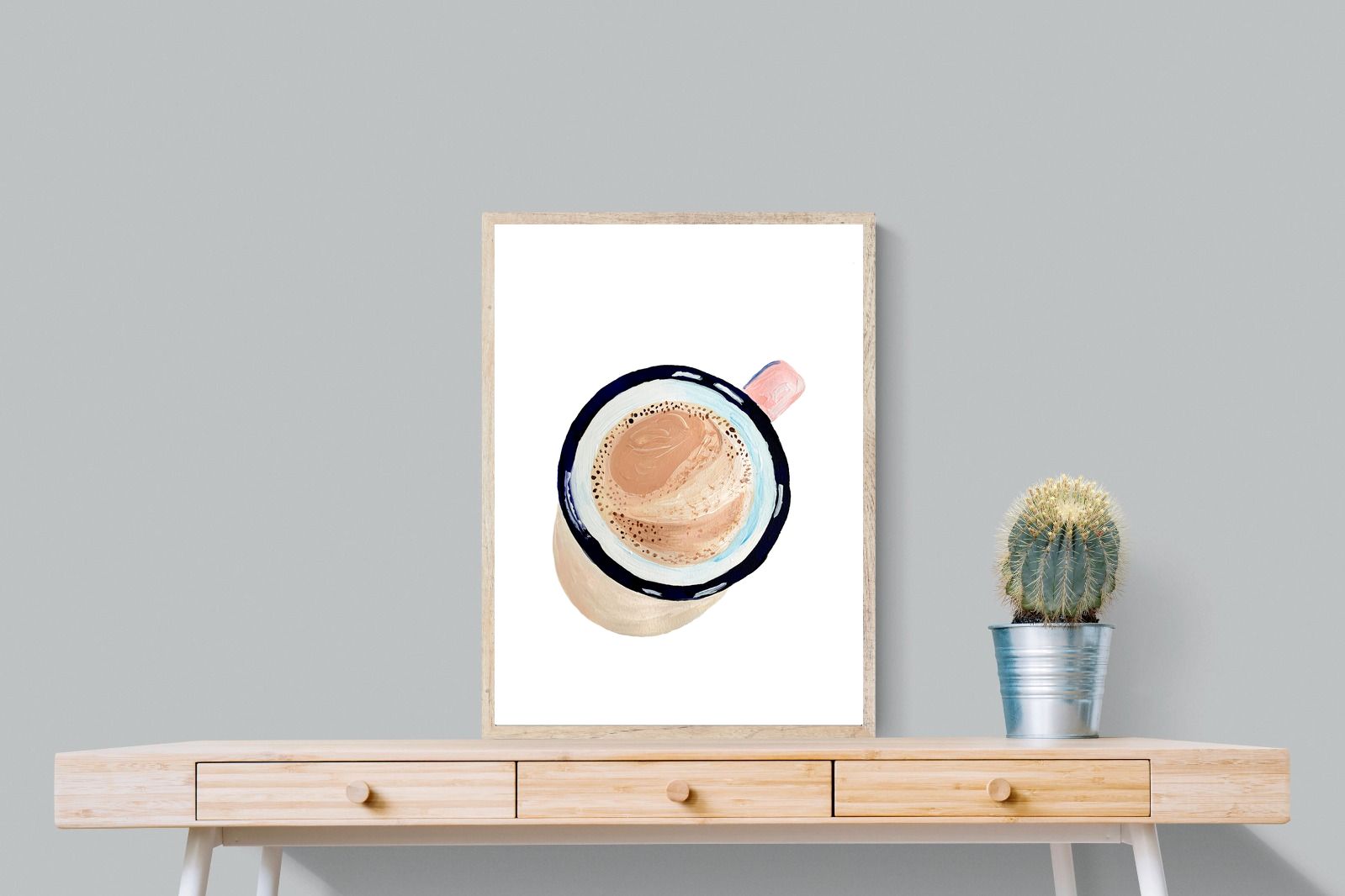 This artwork offers a charming, bird's-eye view of a frothy cup of coffee, capturing the simple pleasure of a morning ritual. The soft, pastel tones and delicate brushstrokes create a warm, inviting atmosphere, perfect for kitchens or cosy nooks in contemporary homes. The minimalist style ensures it blends seamlessly with modern decor while adding a touch of homely comfort. It's an ideal piece for anyone who appreciates the beauty in everyday moments, making mornings a little brighter.