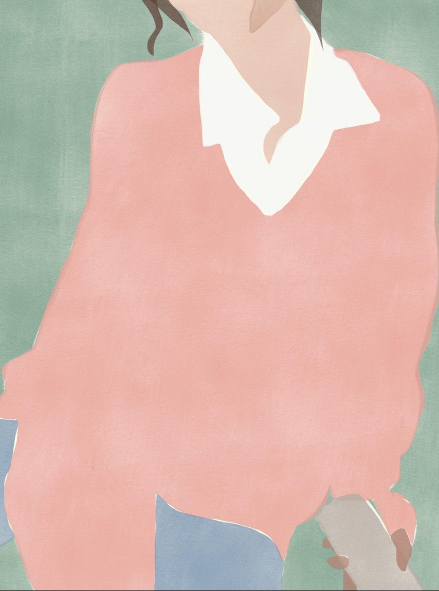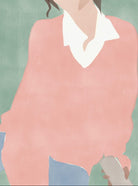 This artwork depicts a close-up of a person wearing a pink sweater and white shirt, rendered in soft, pastel tones. The lack of facial details draws attention to the colours and shapes, creating a serene and modern aesthetic. This piece would be a great addition to a contemporary home, offering a subtle pop of colour and a sense of calm. Its minimalist style ensures it complements a wide range of interior designs.