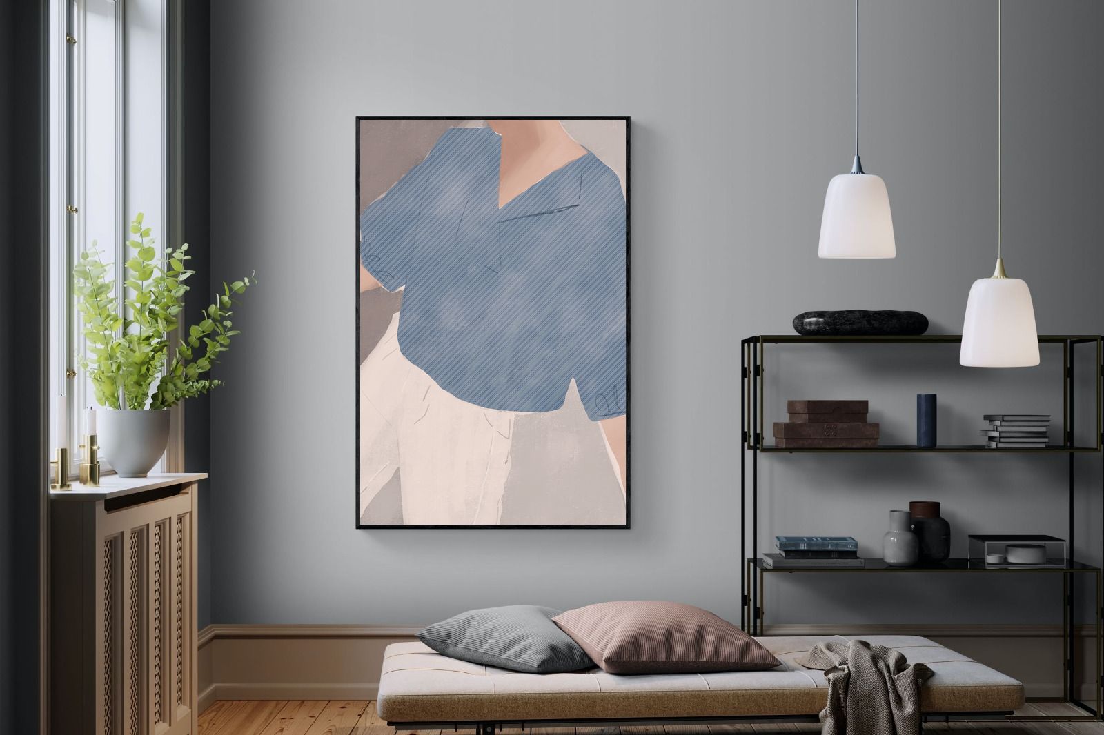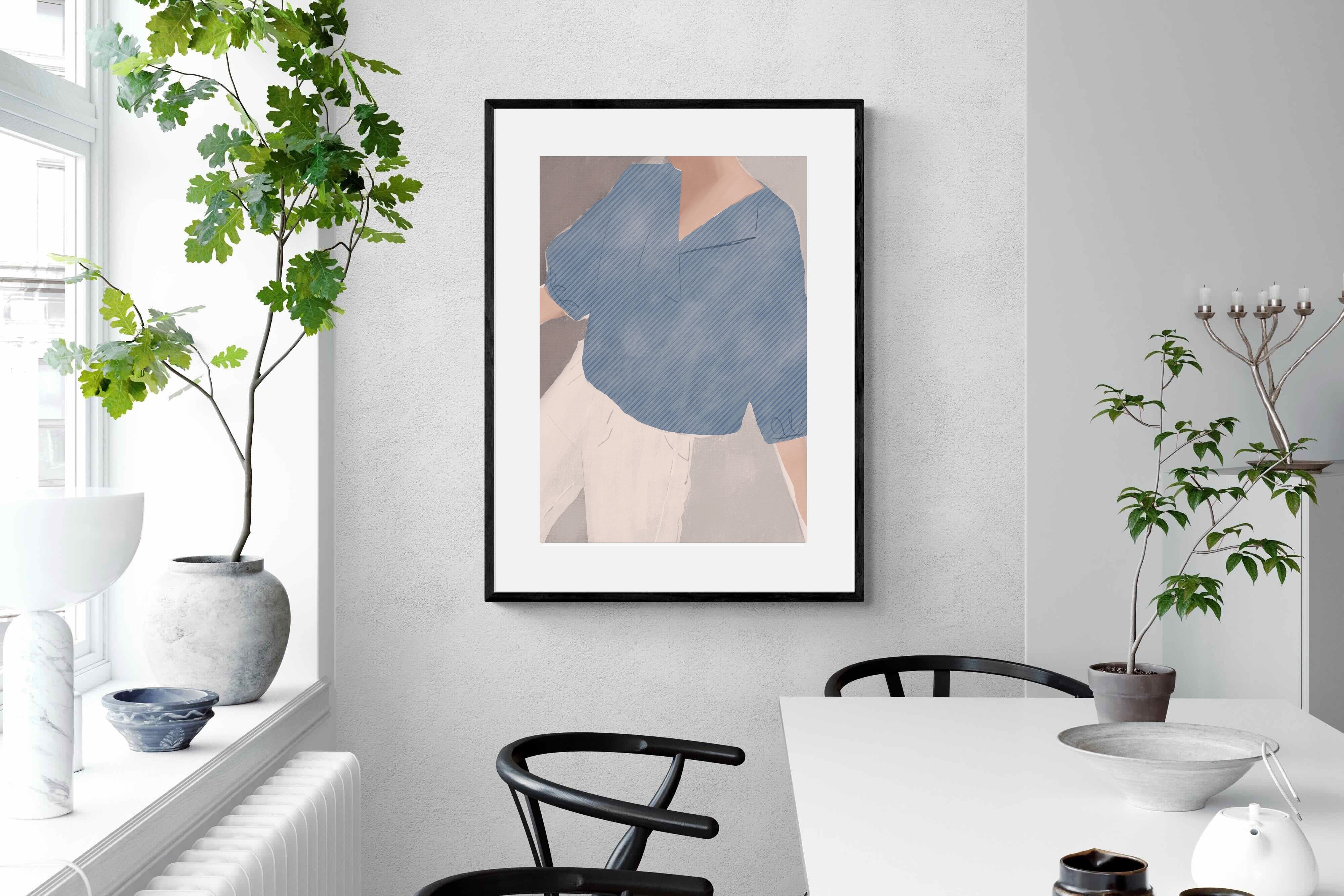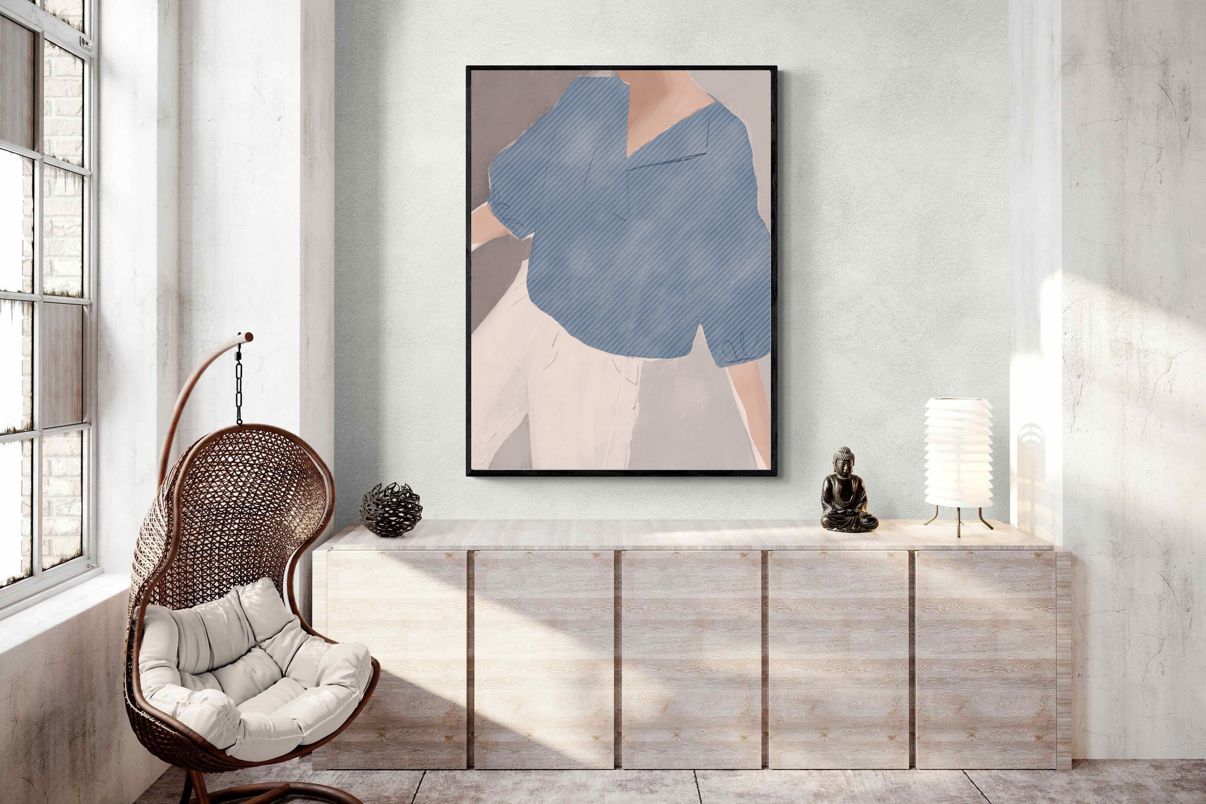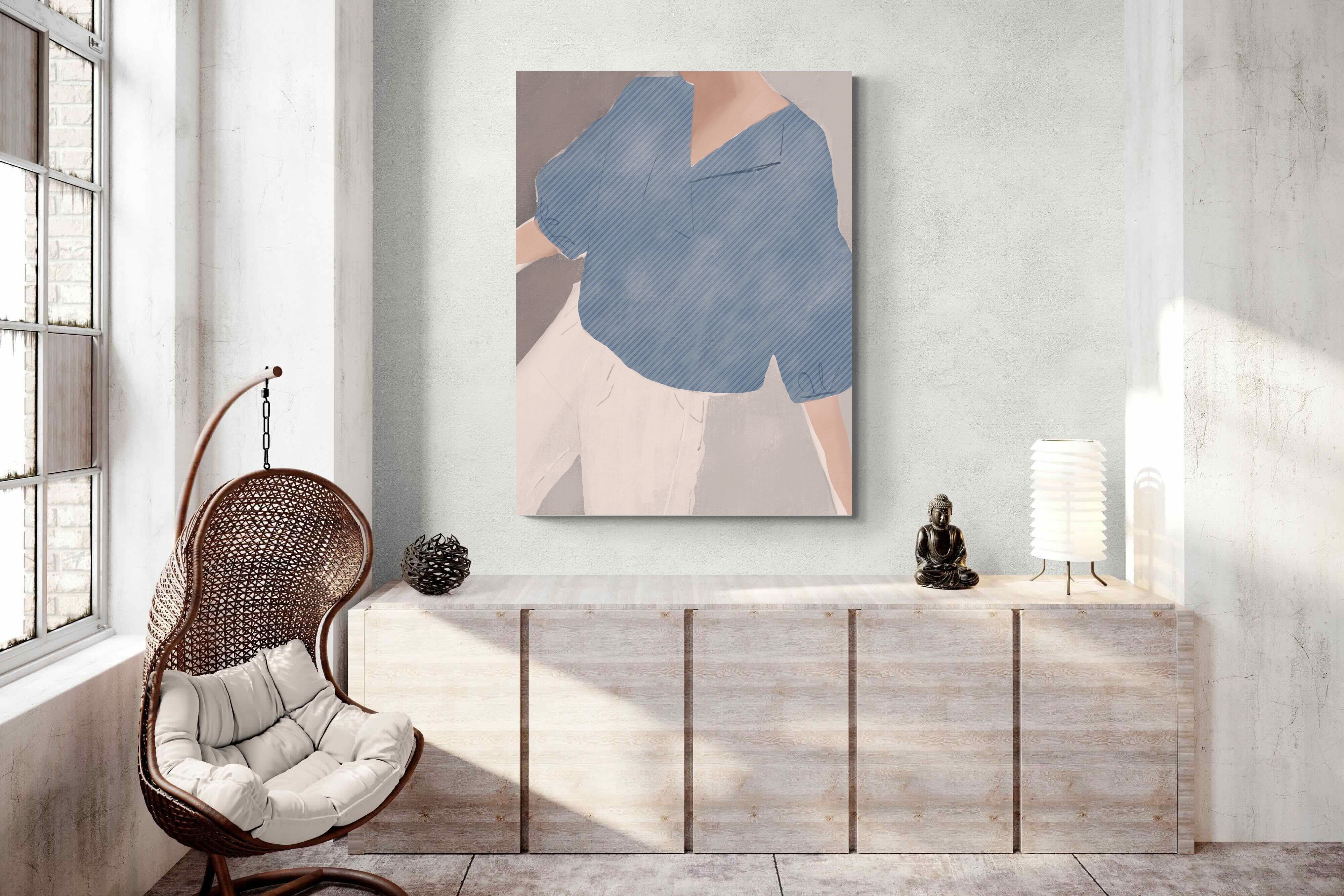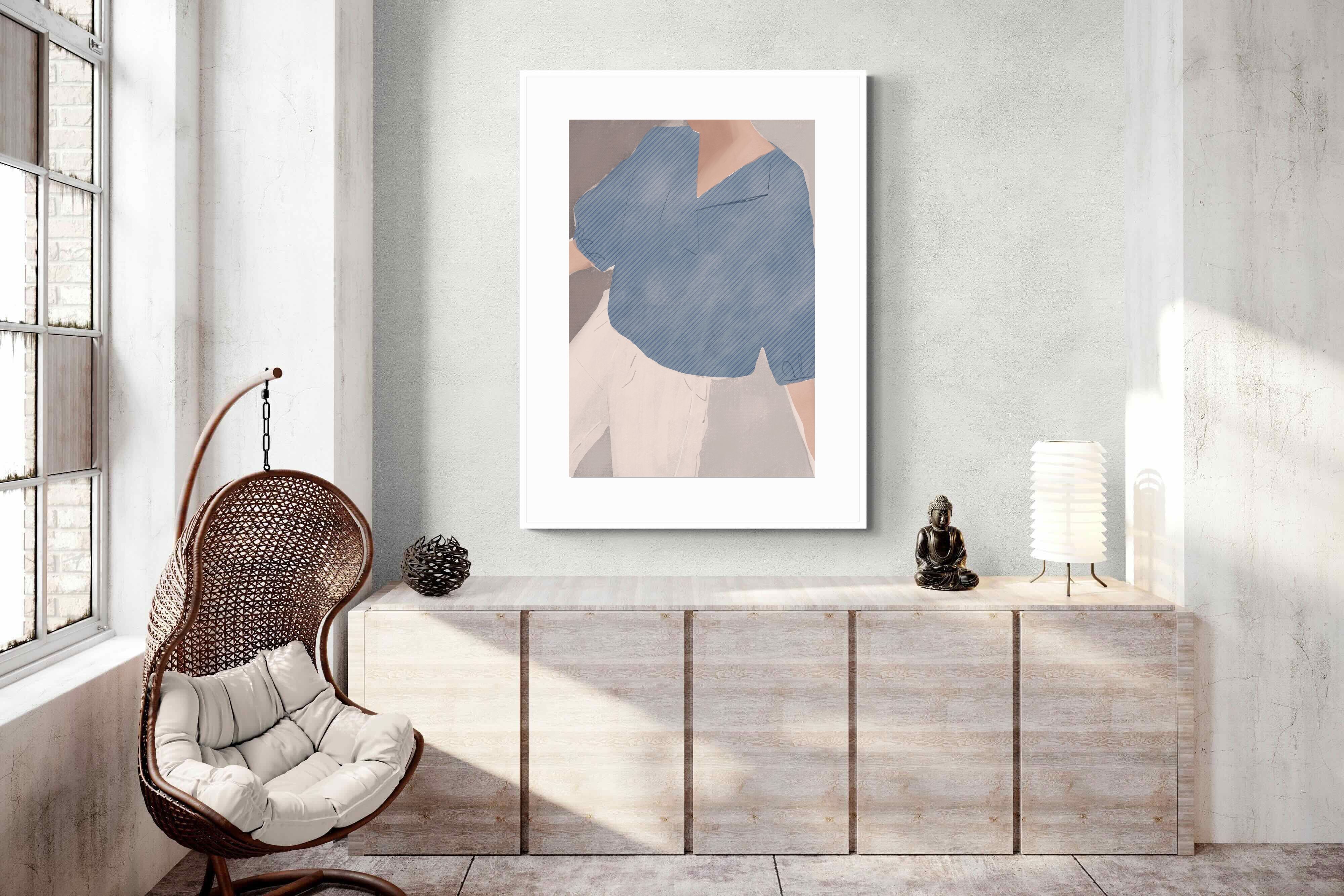 A refined, minimalist illustration captures the gentle form of a seated figure, defined by soft shapes and subtle texture. The muted palette of blues, creams, and warm neutrals creates a calm, balanced composition, while delicate linework adds understated detail. The relaxed posture and simplified style evoke quiet elegance and modern femininity. Ideal for contemporary, Scandinavian, or minimalist interiors, this artwork brings softness, sophistication, and a serene visual presence to any thoughtfully styled space.