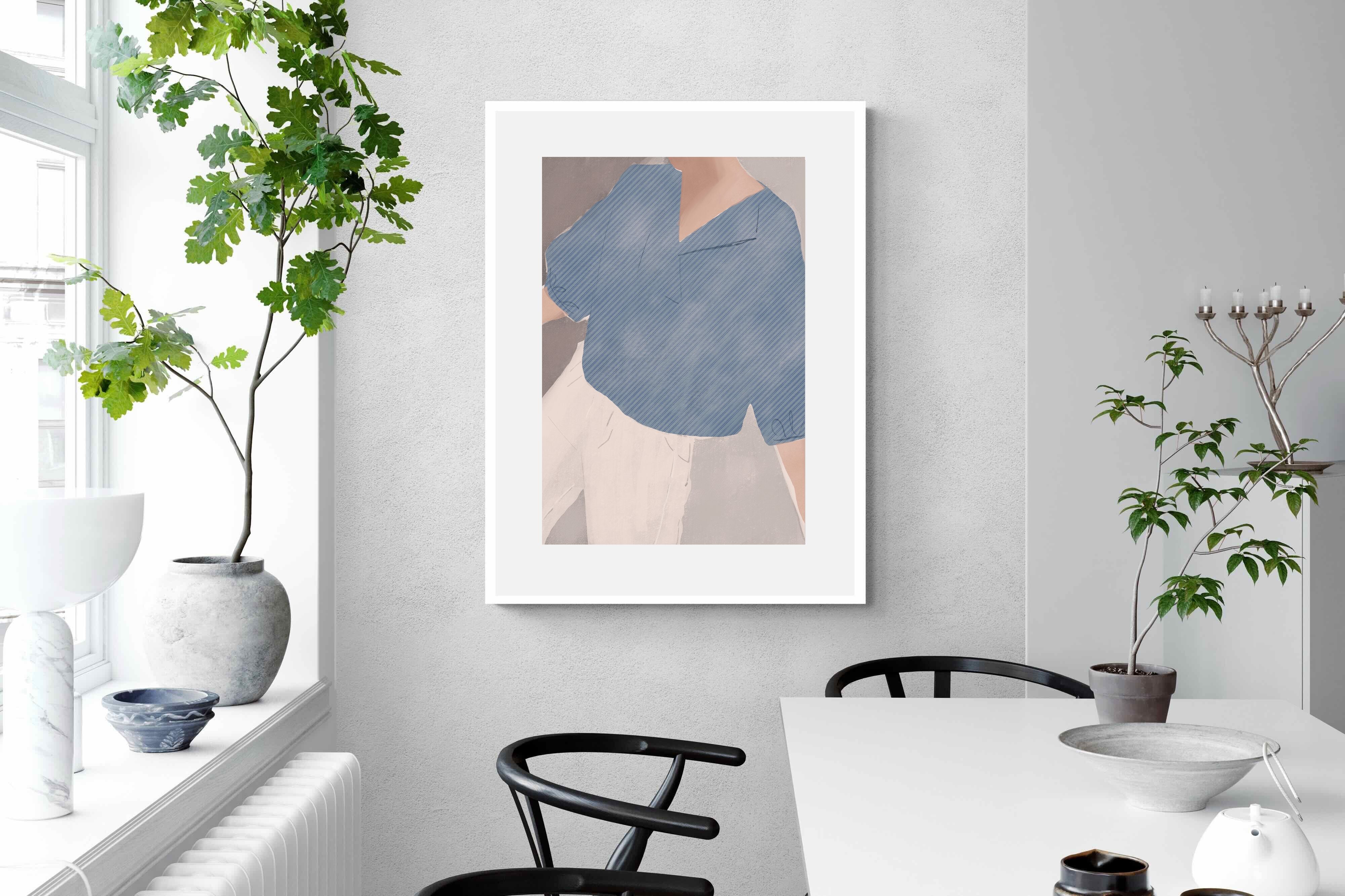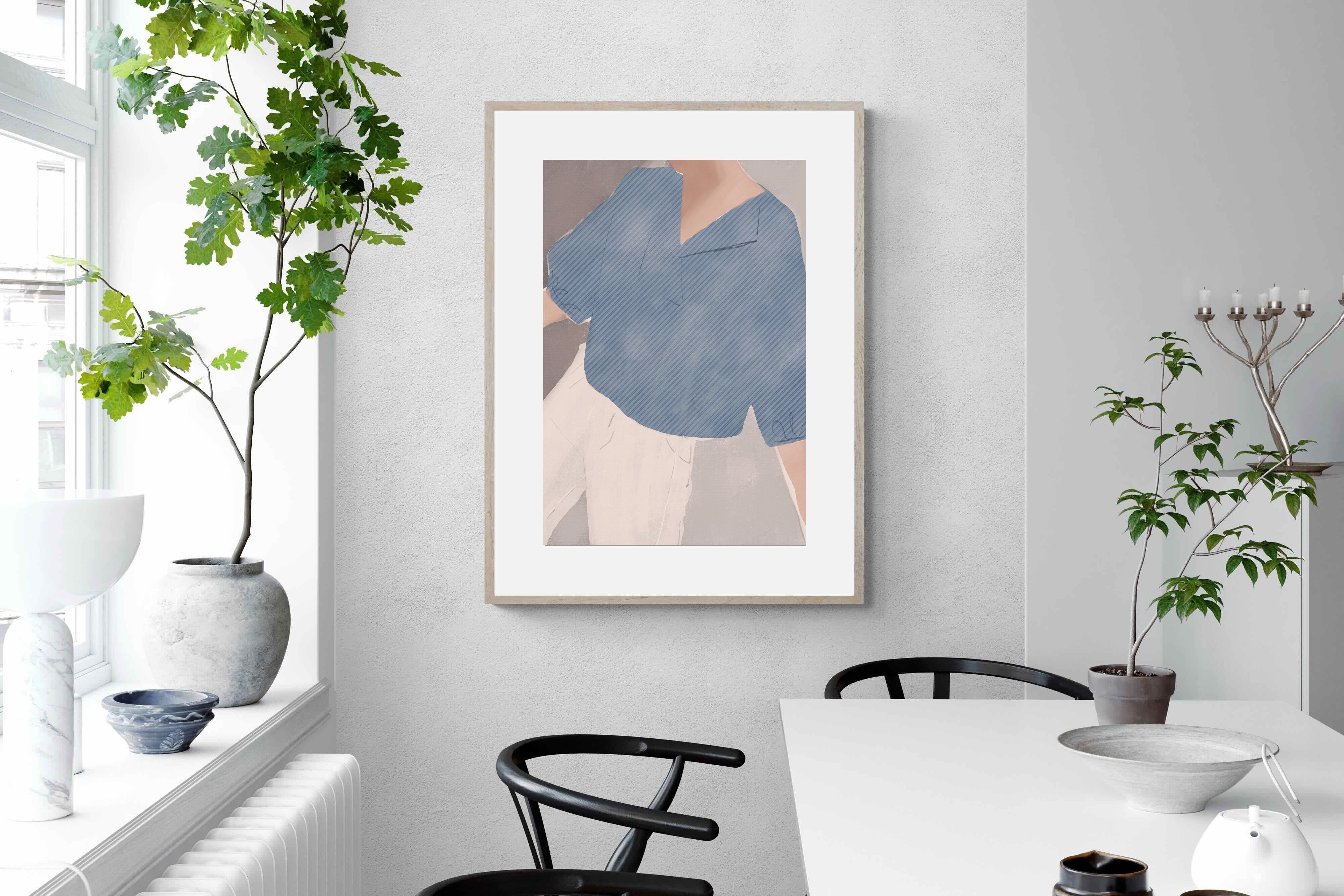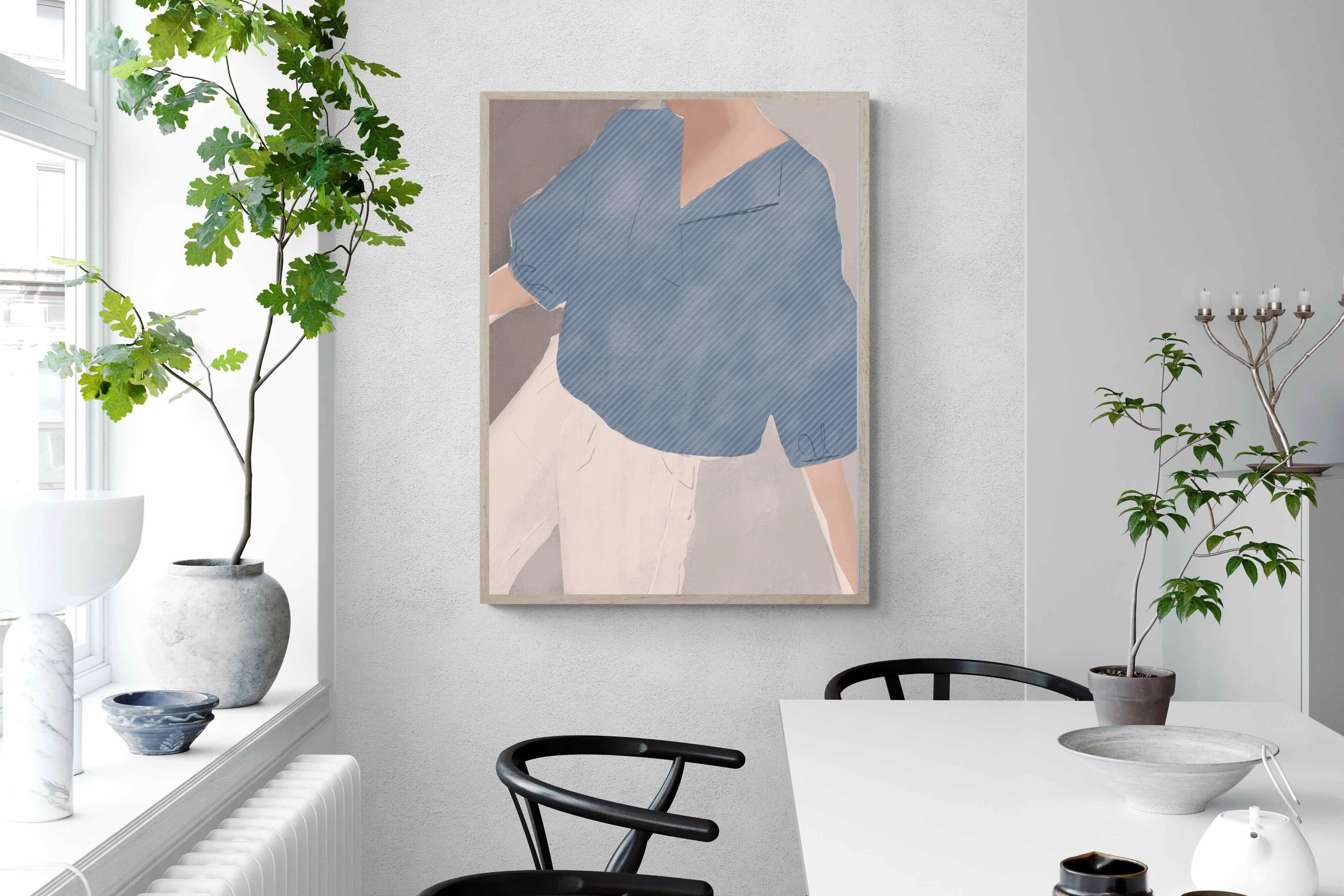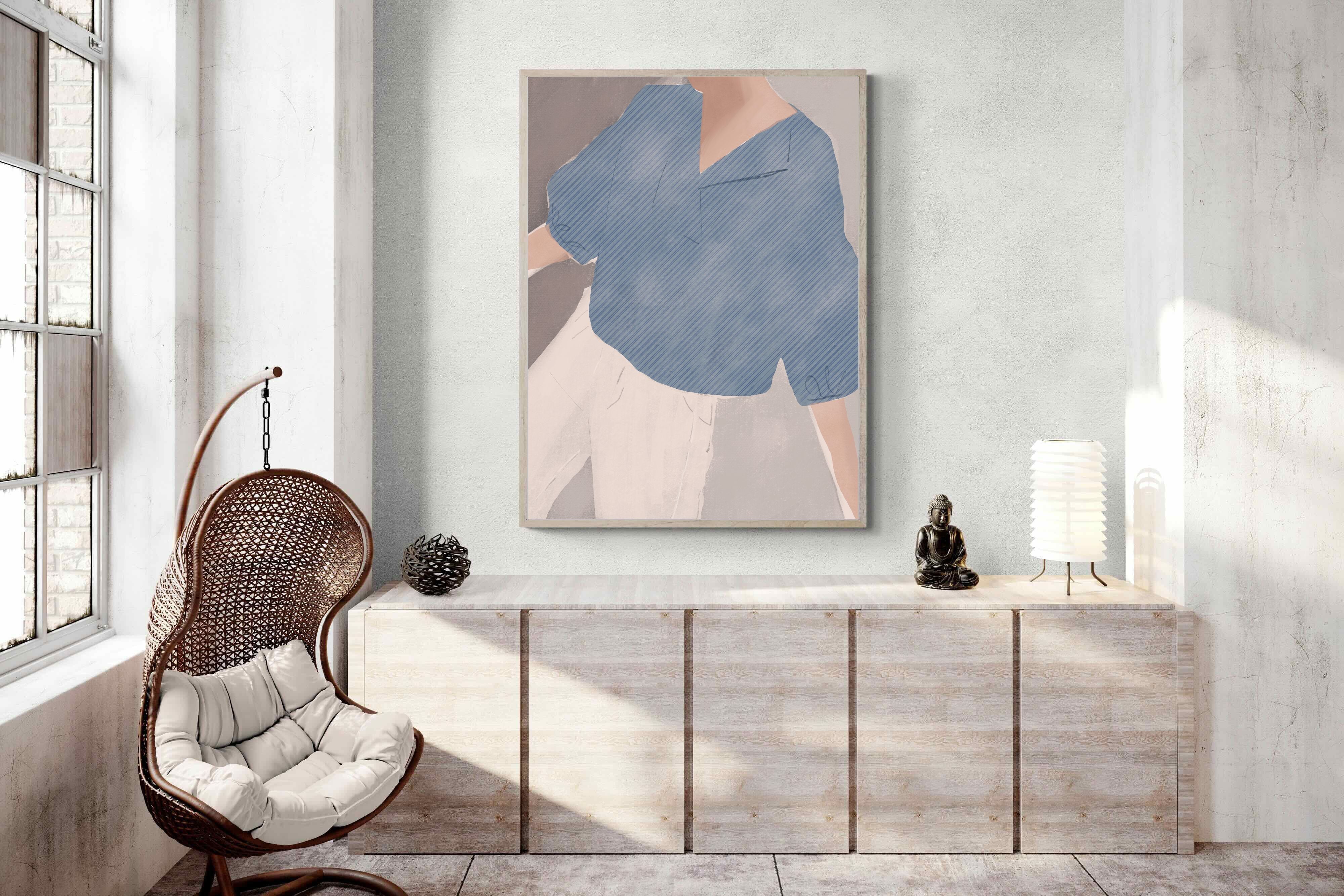 A refined, minimalist illustration captures the gentle form of a seated figure, defined by soft shapes and subtle texture. The muted palette of blues, creams, and warm neutrals creates a calm, balanced composition, while delicate linework adds understated detail. The relaxed posture and simplified style evoke quiet elegance and modern femininity. Ideal for contemporary, Scandinavian, or minimalist interiors, this artwork brings softness, sophistication, and a serene visual presence to any thoughtfully styled space.