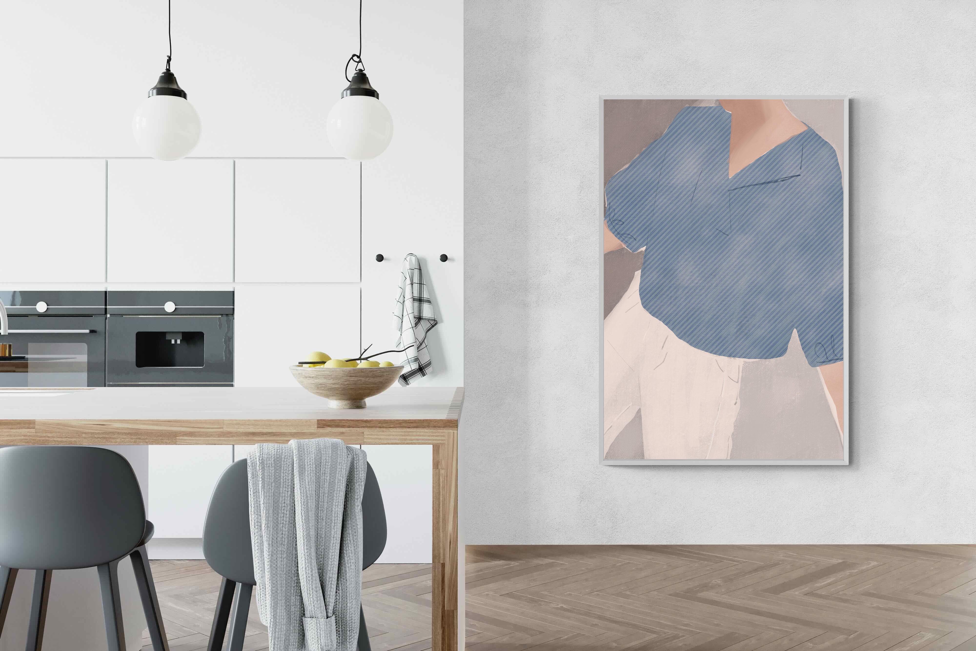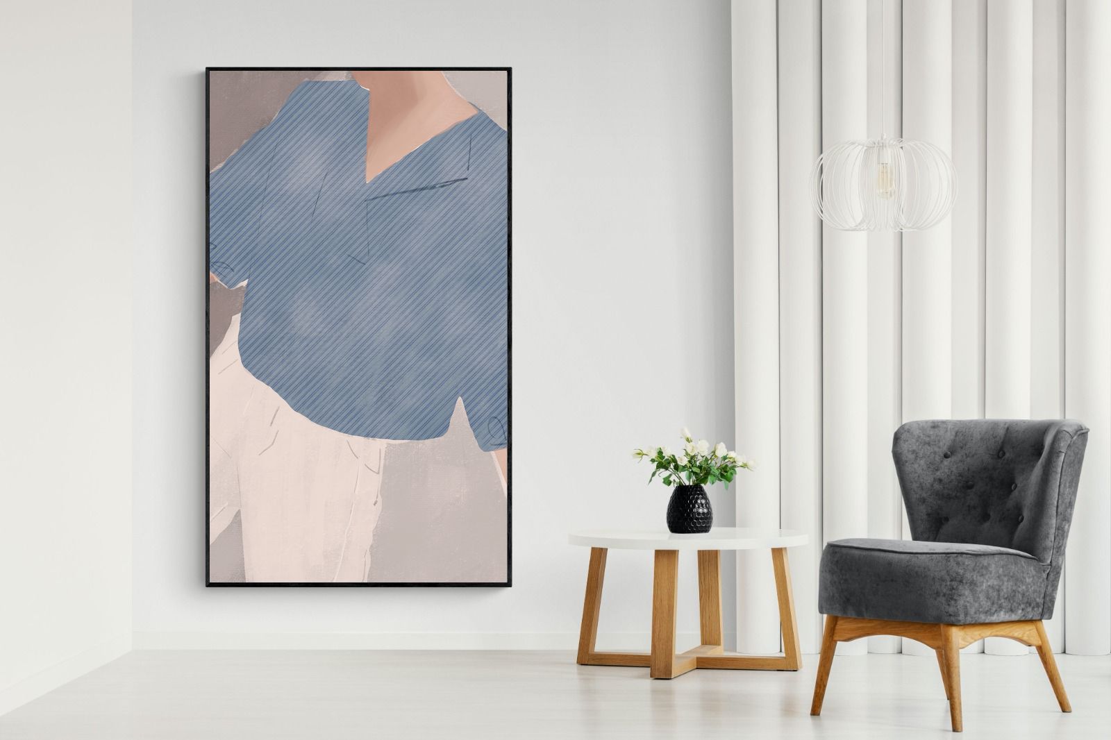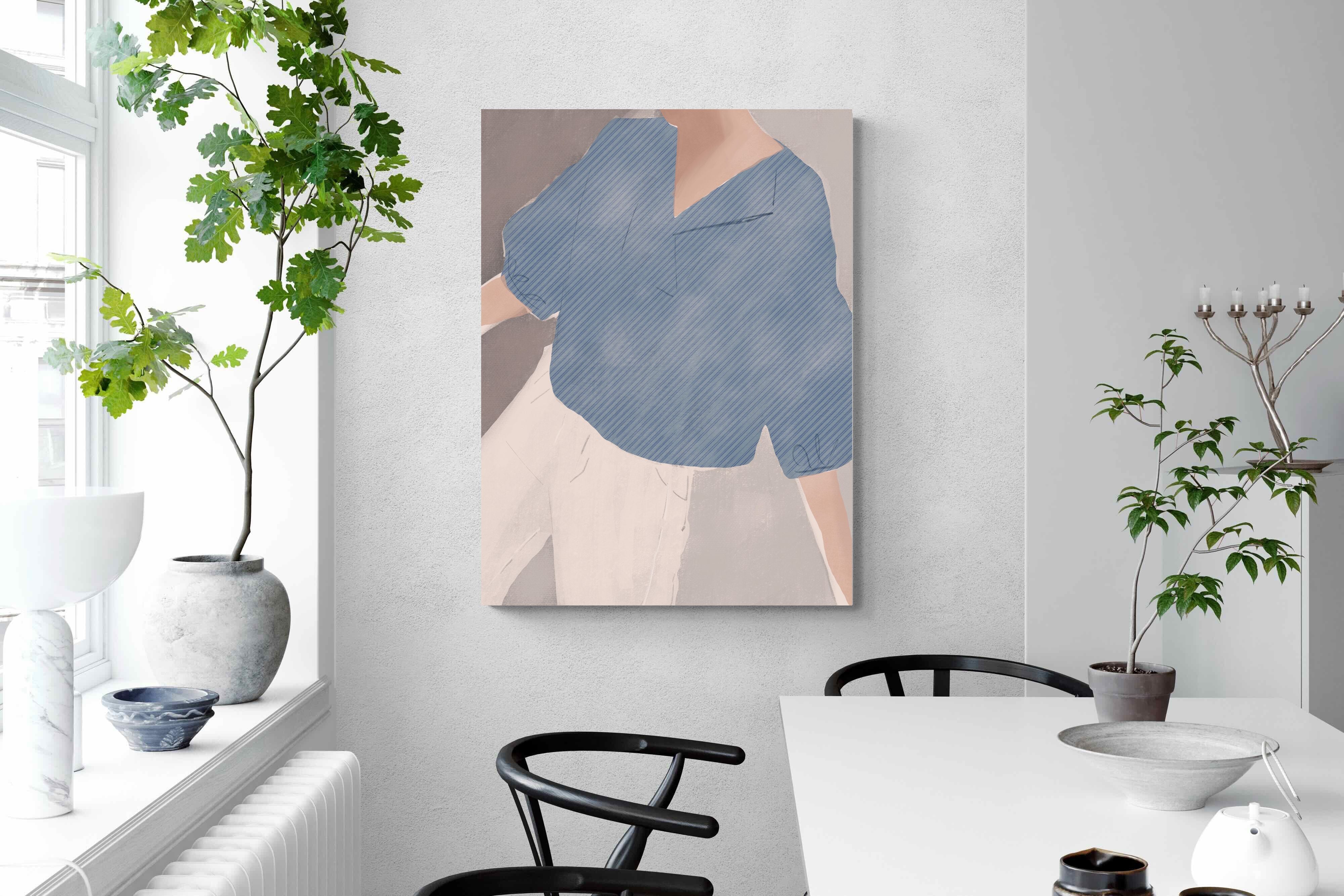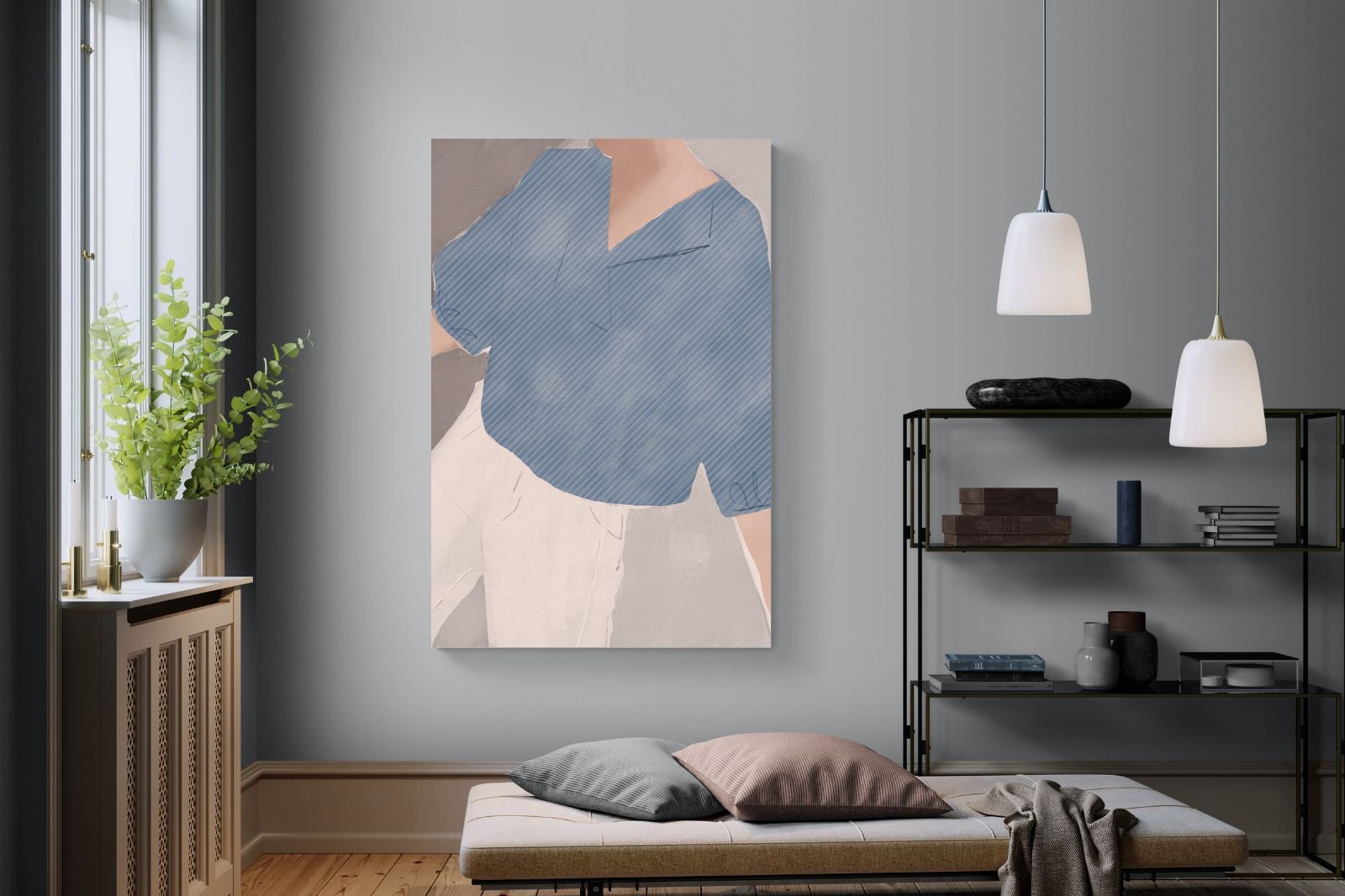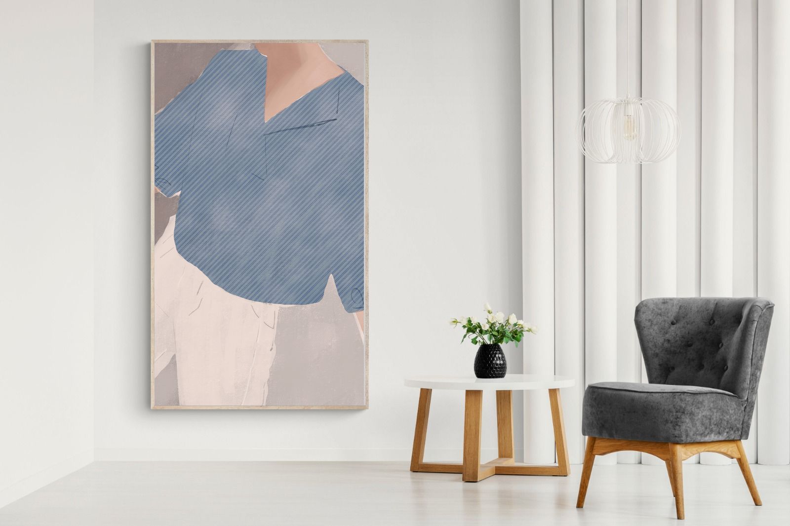 A refined, minimalist illustration captures the gentle form of a seated figure, defined by soft shapes and subtle texture. The muted palette of blues, creams, and warm neutrals creates a calm, balanced composition, while delicate linework adds understated detail. The relaxed posture and simplified style evoke quiet elegance and modern femininity. Ideal for contemporary, Scandinavian, or minimalist interiors, this artwork brings softness, sophistication, and a serene visual presence to any thoughtfully styled space.