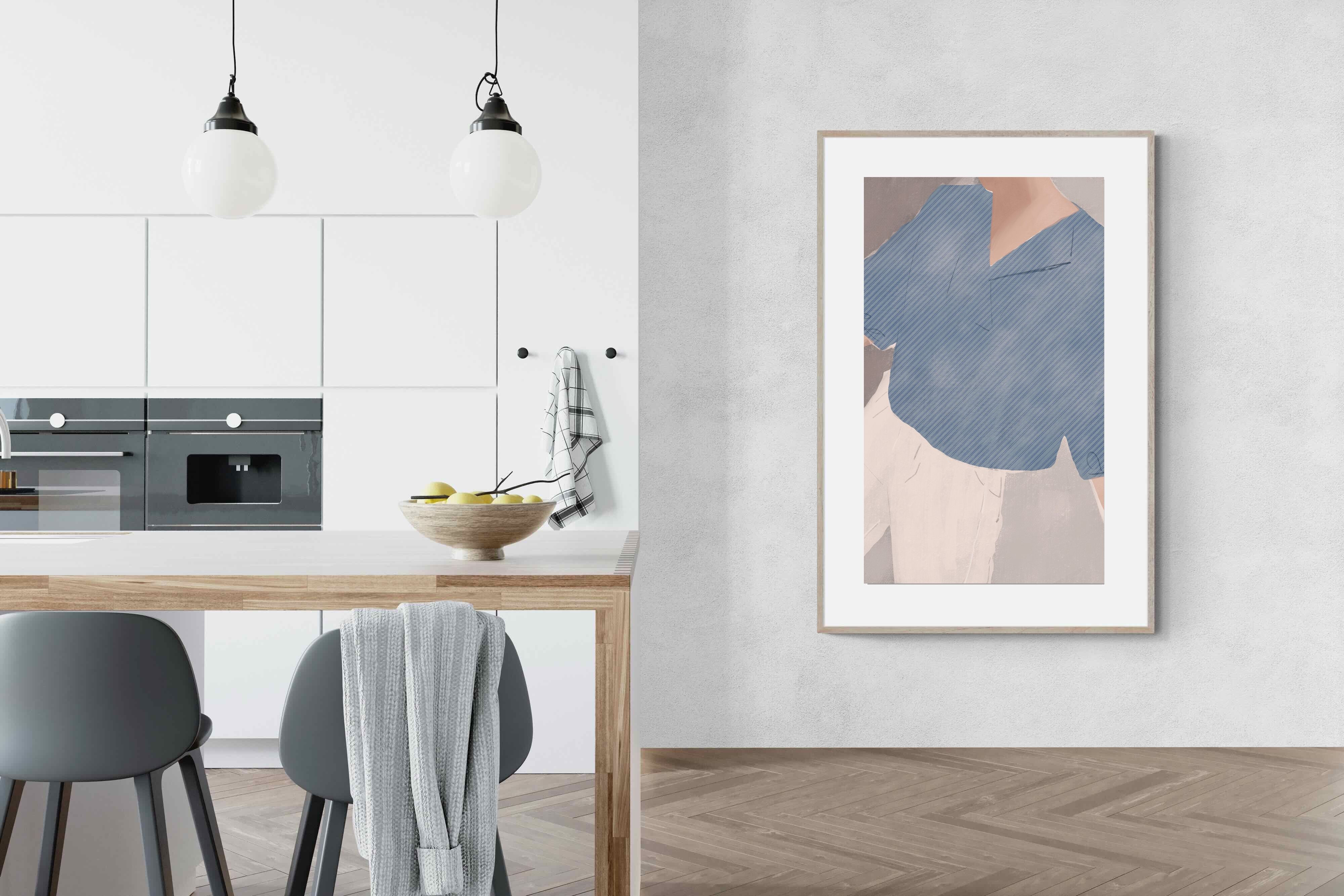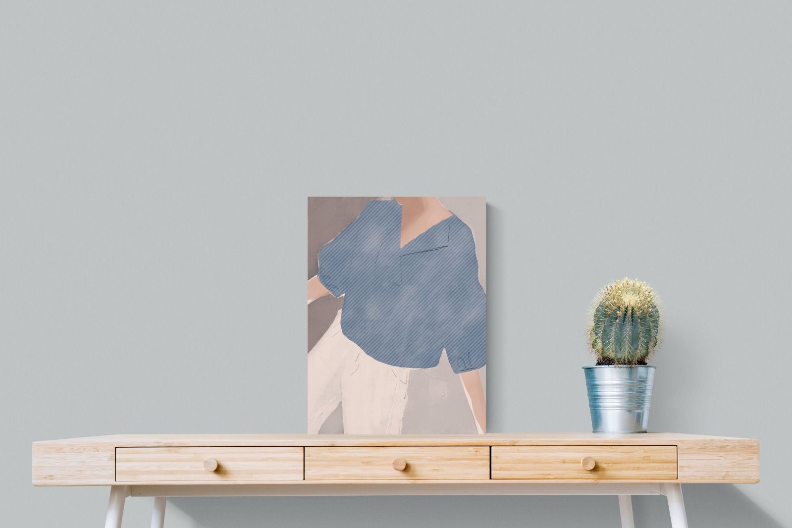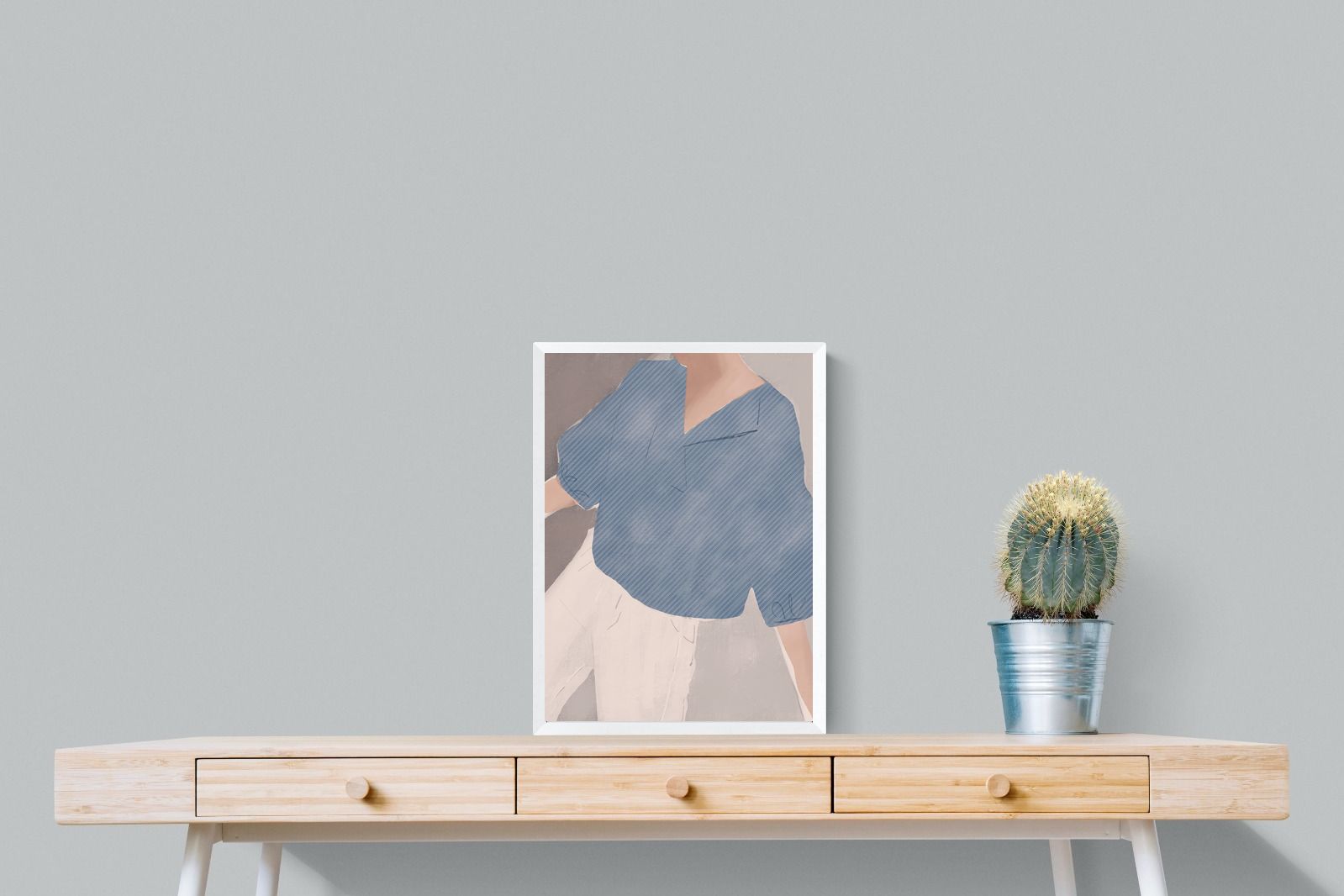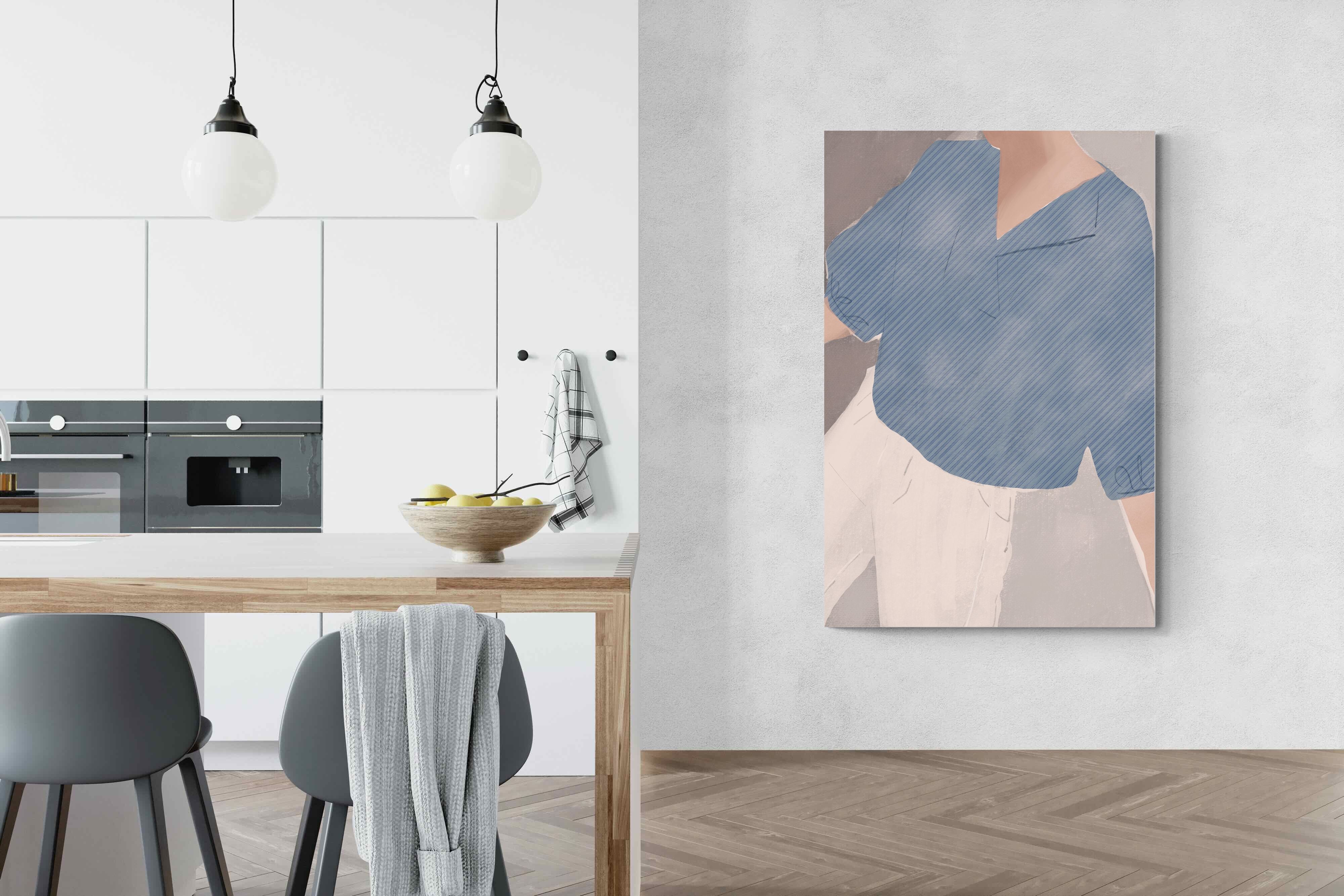A refined, minimalist illustration captures the gentle form of a seated figure, defined by soft shapes and subtle texture. The muted palette of blues, creams, and warm neutrals creates a calm, balanced composition, while delicate linework adds understated detail. The relaxed posture and simplified style evoke quiet elegance and modern femininity. Ideal for contemporary, Scandinavian, or minimalist interiors, this artwork brings softness, sophistication, and a serene visual presence to any thoughtfully styled space.