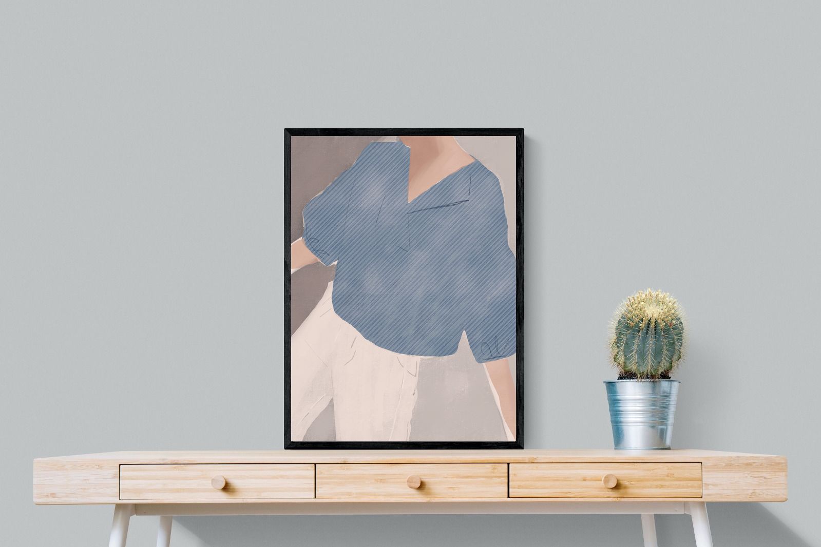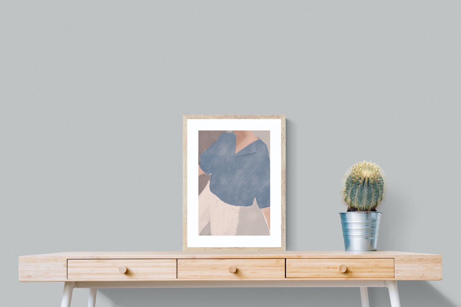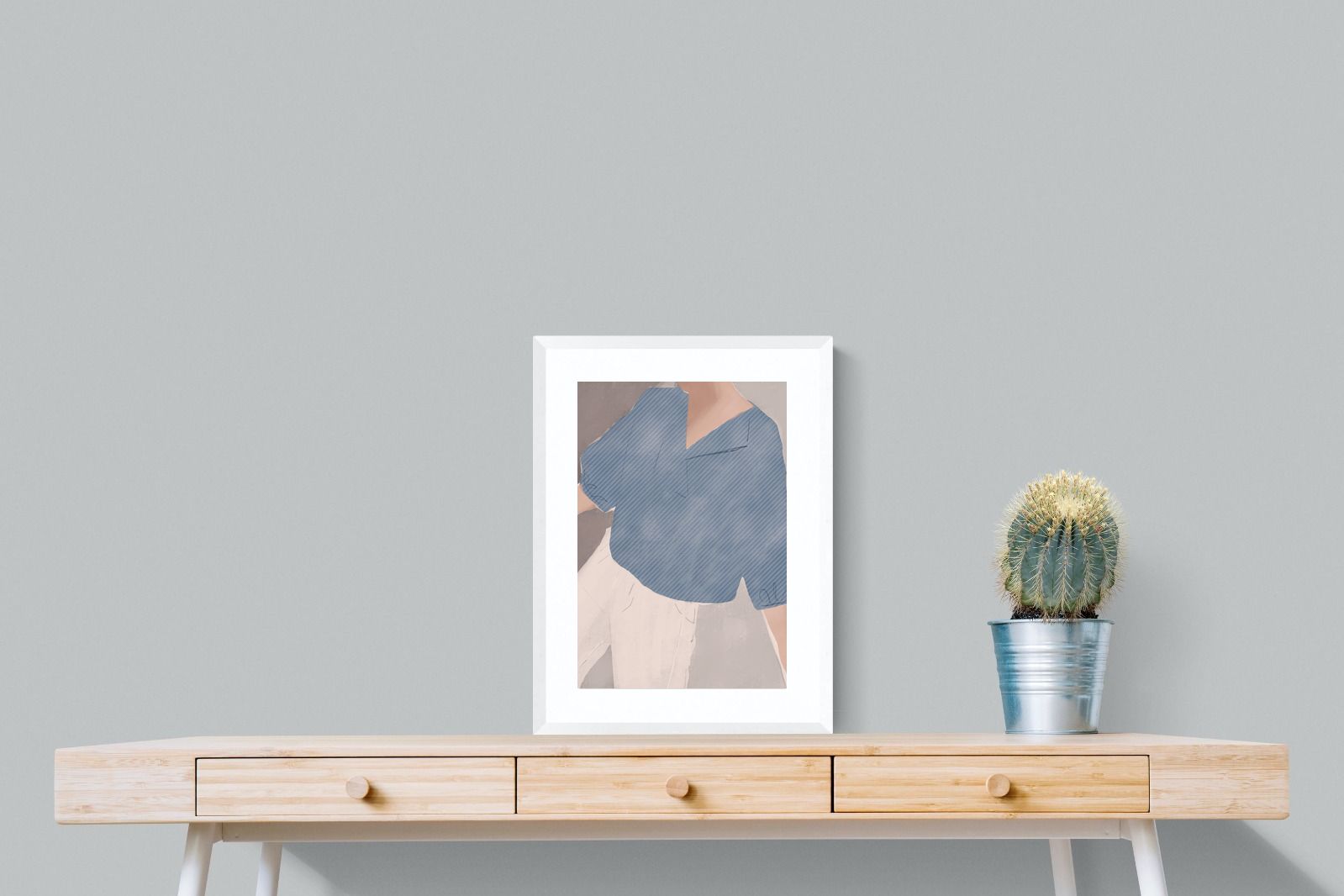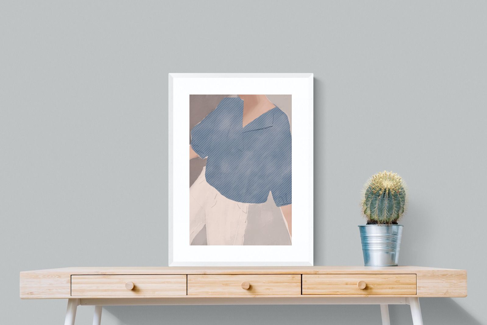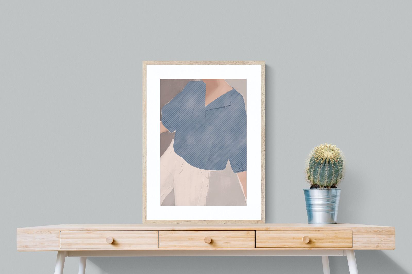 A refined, minimalist illustration captures the gentle form of a seated figure, defined by soft shapes and subtle texture. The muted palette of blues, creams, and warm neutrals creates a calm, balanced composition, while delicate linework adds understated detail. The relaxed posture and simplified style evoke quiet elegance and modern femininity. Ideal for contemporary, Scandinavian, or minimalist interiors, this artwork brings softness, sophistication, and a serene visual presence to any thoughtfully styled space.