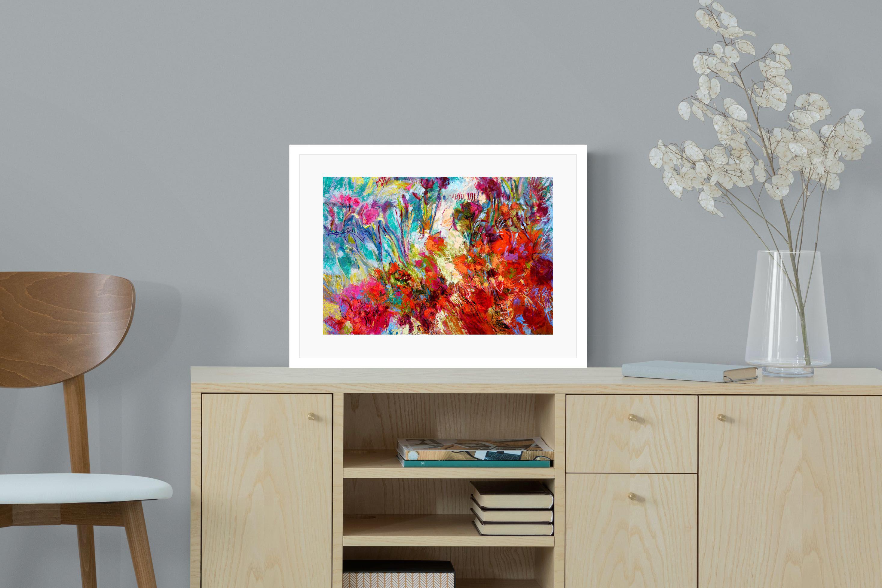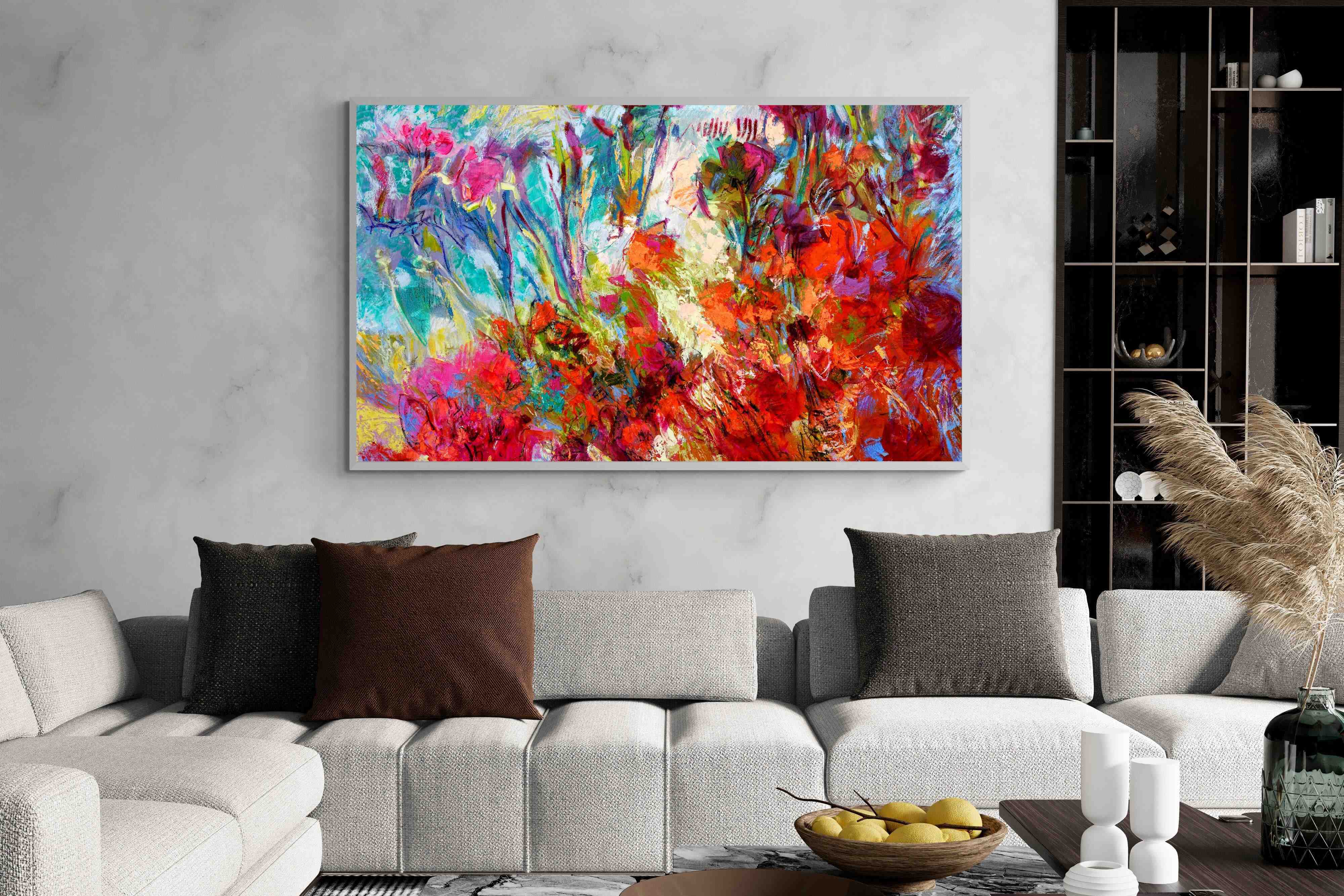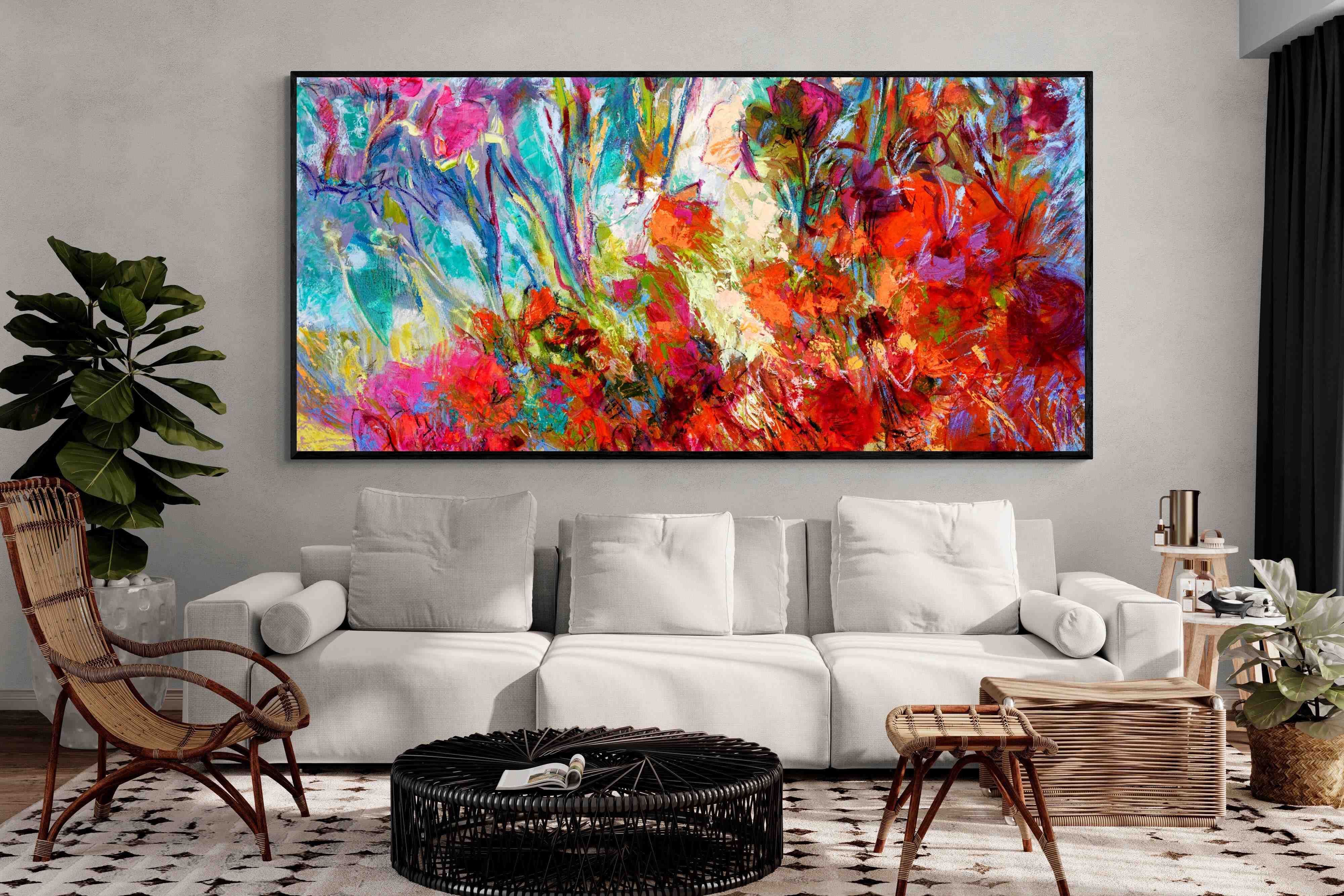 Our mounted canvas option is ready to hang and beautifully translates the vivacious energy and vibrant colours of this painting. Learn more about this option by watching this short video. Alternatively, you may opt for our floating frame in black, white, or natural wood, which can elegantly complement this vibrant artwork.