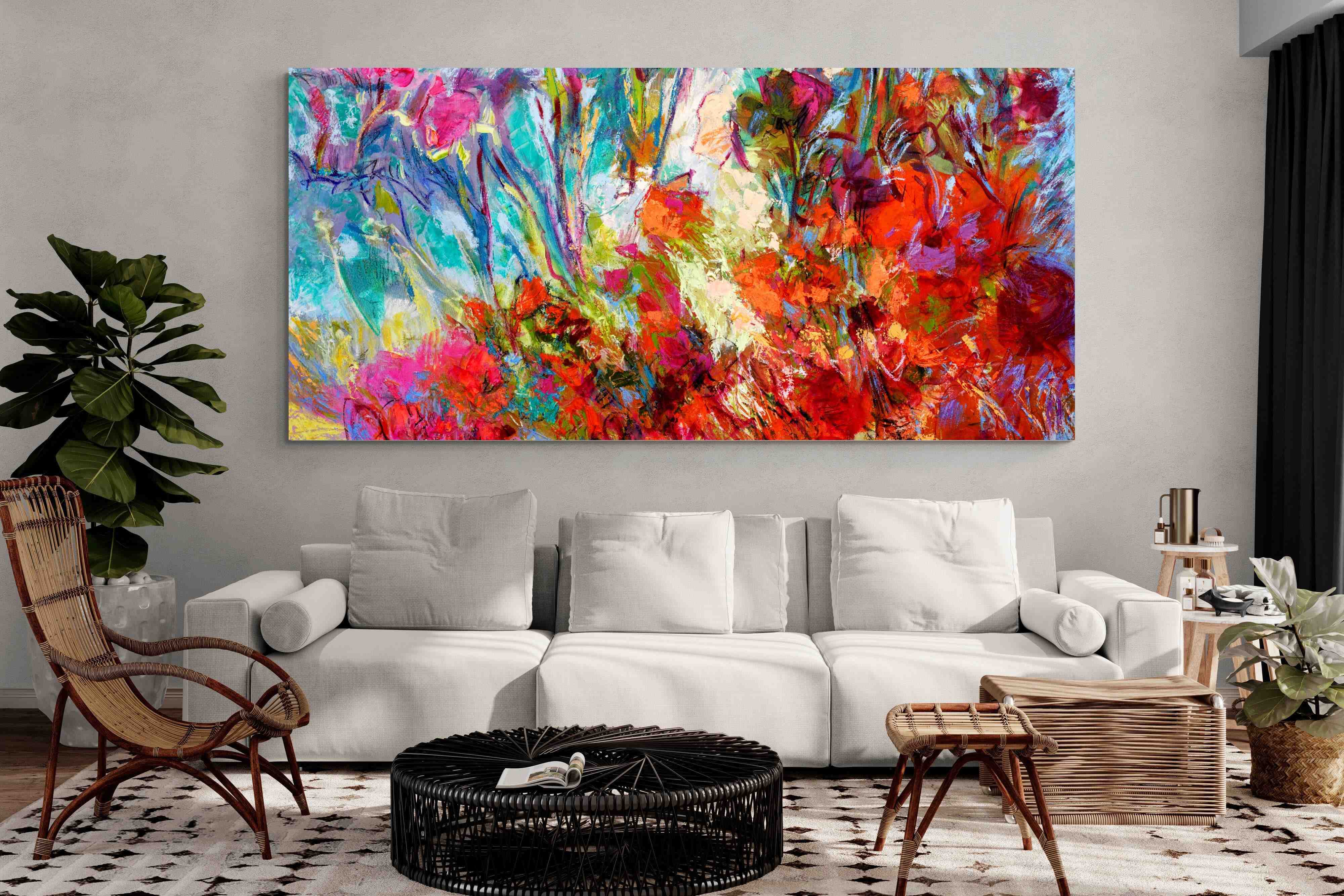 Presenting "Let Me Bloom" Wall Art, a breathtakingly vibrant painting by the acclaimed artist Dorothy Fagan. This abstract floral composition radiates with a burst of red, orange, and turquoise colours, embodying an intoxicating sense of life and growth.