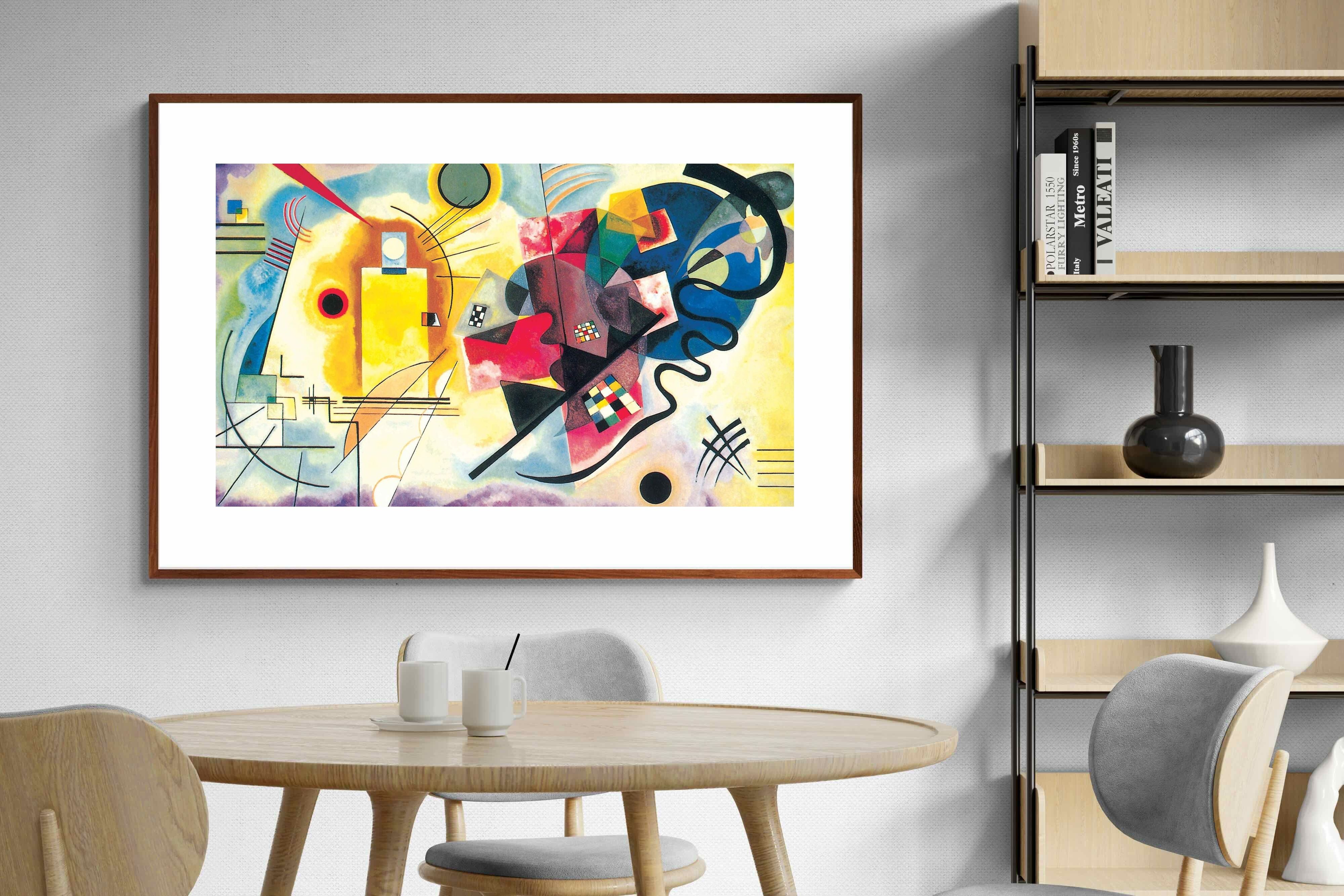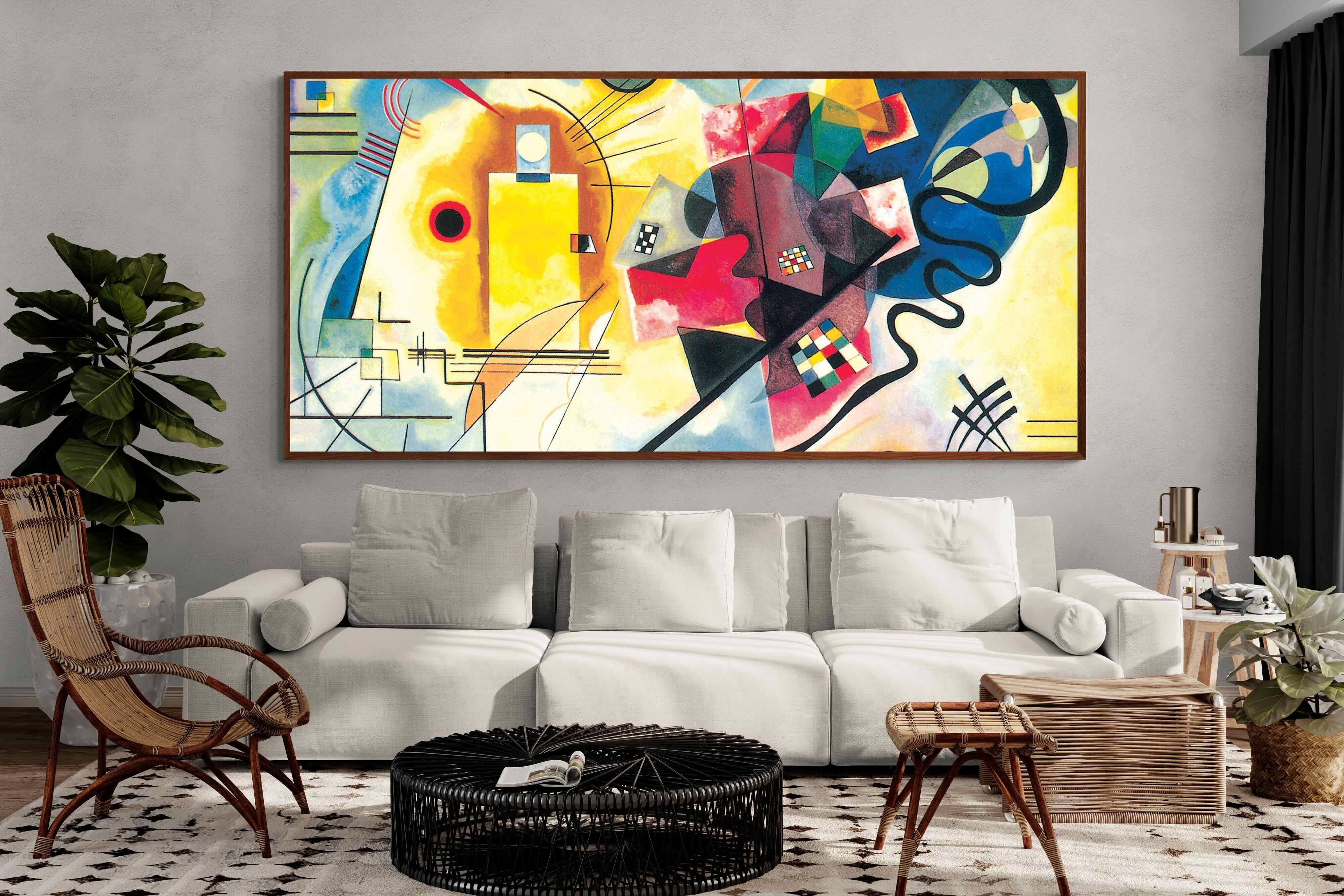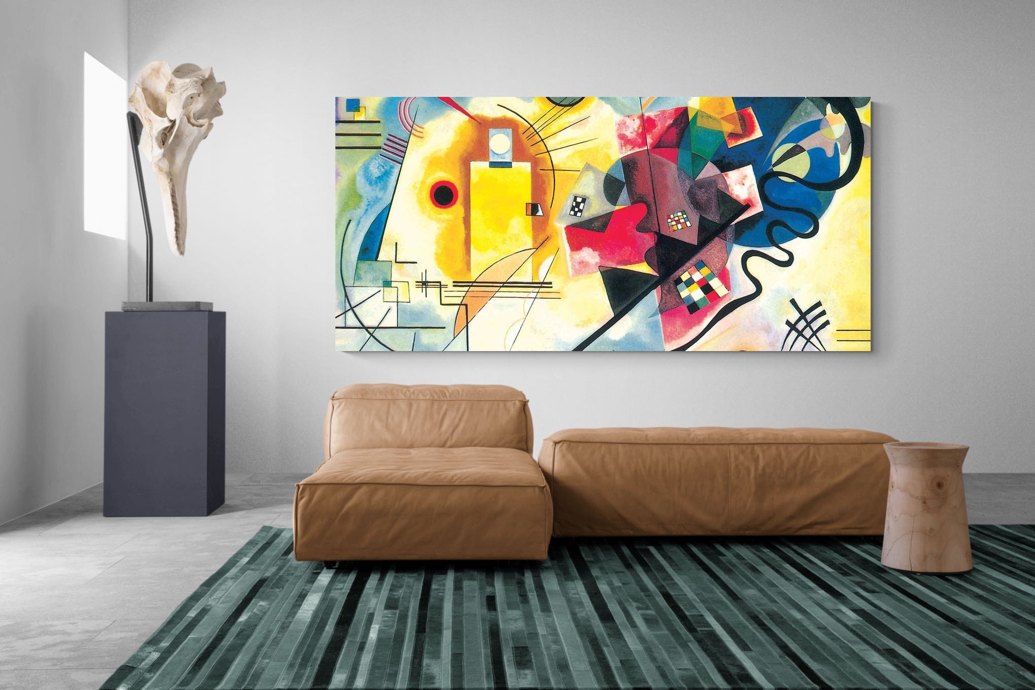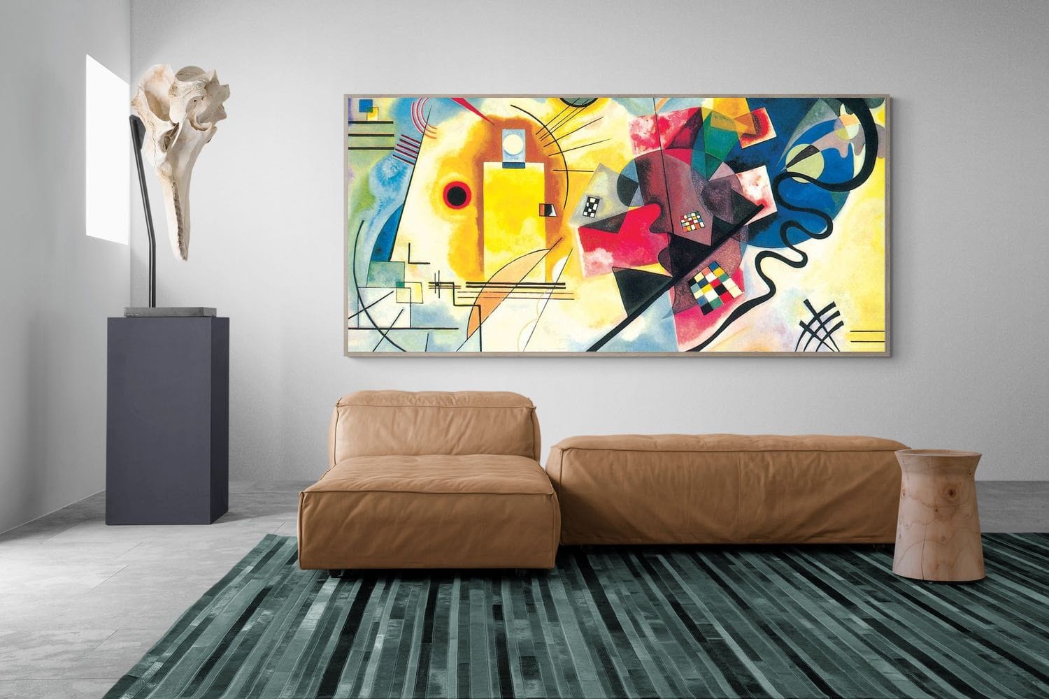 Suprematism was a Russian art movement focused on portraying basic geometric forms in a limited range of colours. Bauhaus was a modernist art school in Germany which had a major influence on 20th century art, and where Kandinsky taught from 1922 to 1933. Yellow-Red-Blue, painted by Kandinsky during his time at Bauhaus, can be seen as a symphony he created by merging his style with Bauhaus techniques and suprematist ideas. It can be divided into two parts with geometric shapes and bright colours on the left and abstract shapes and dark colours on the right.