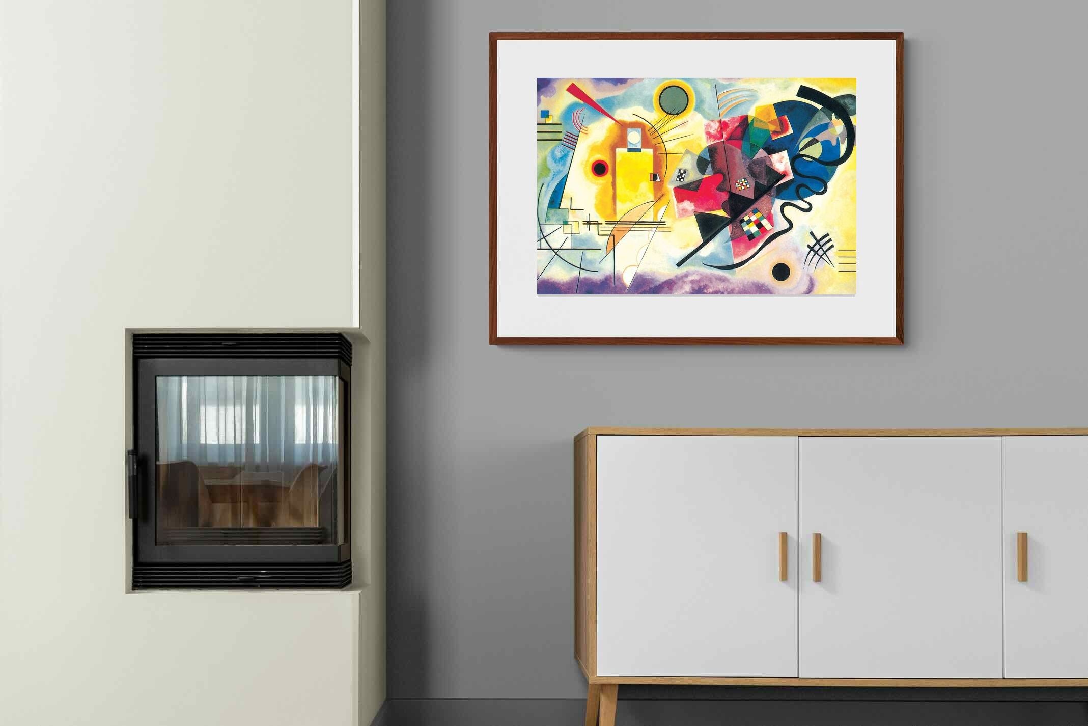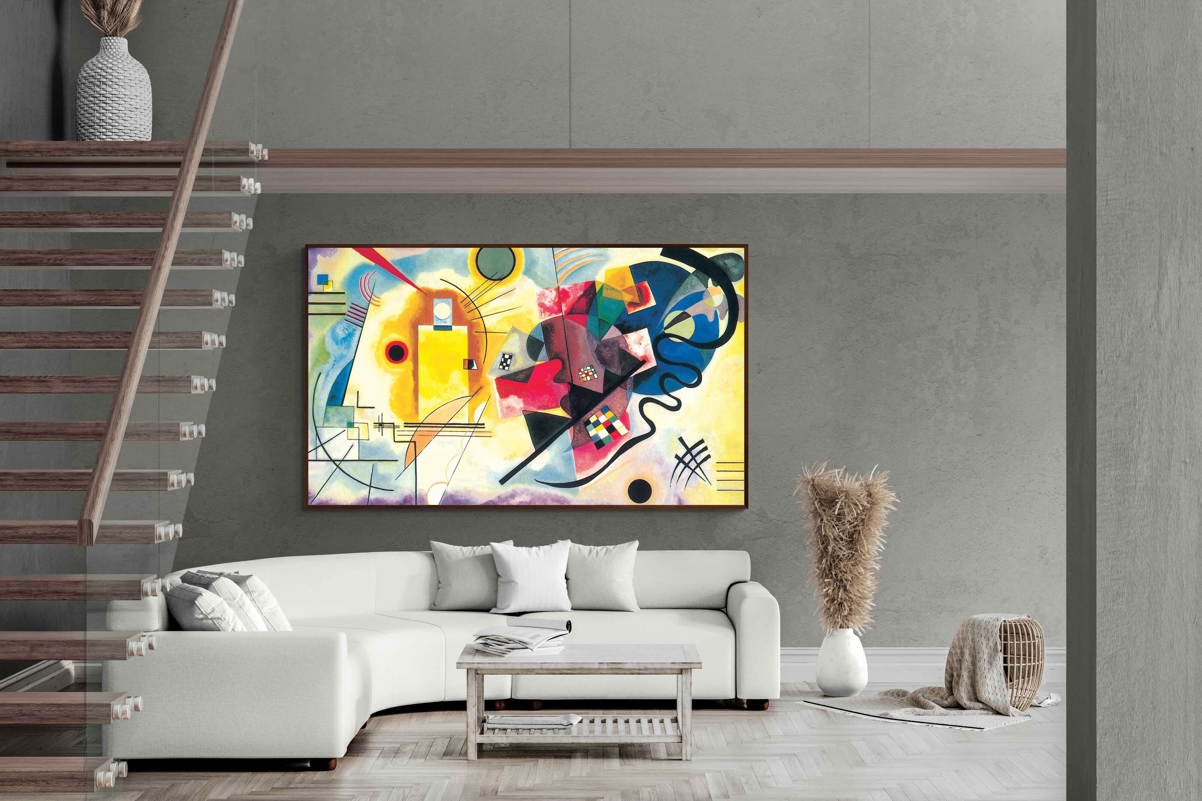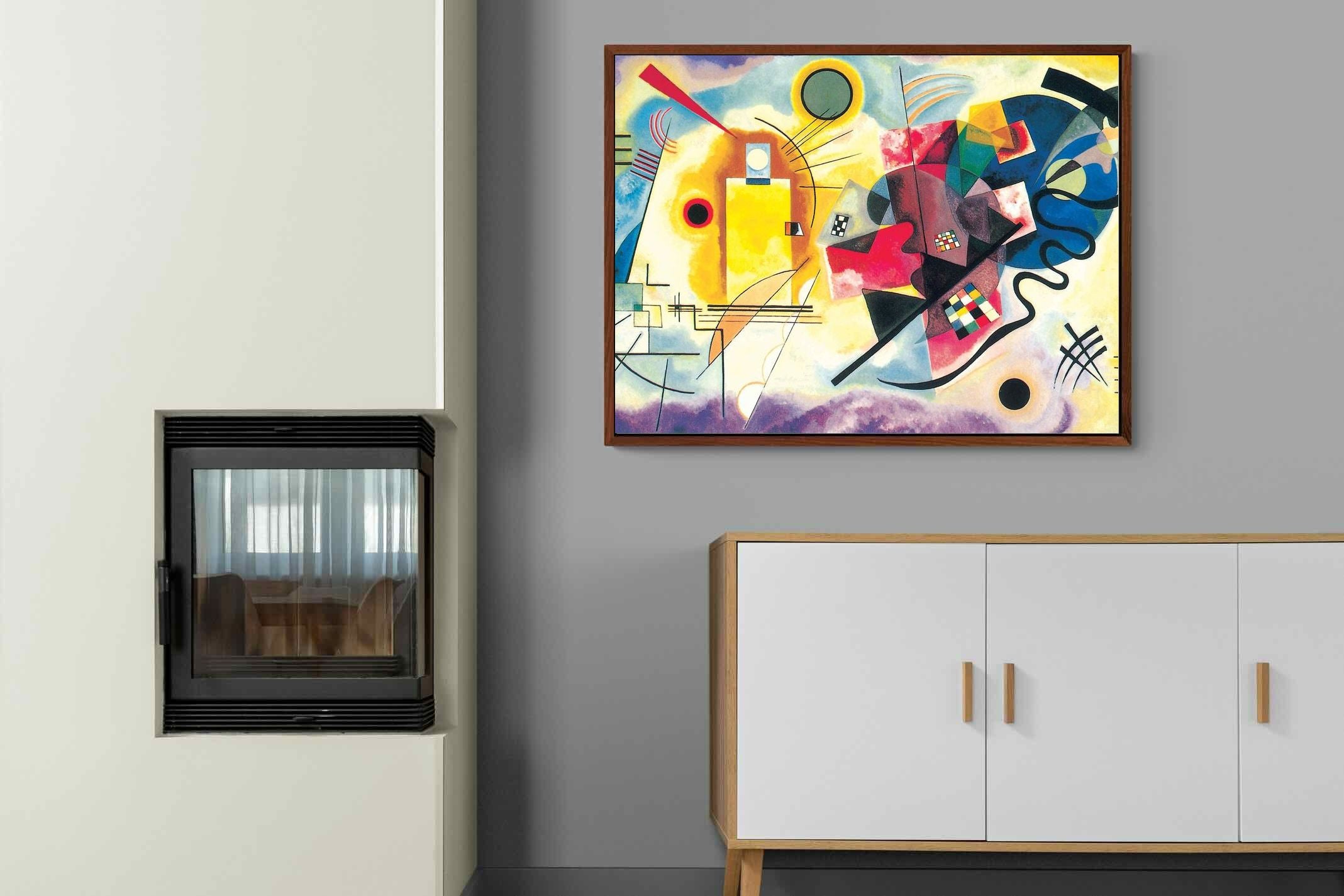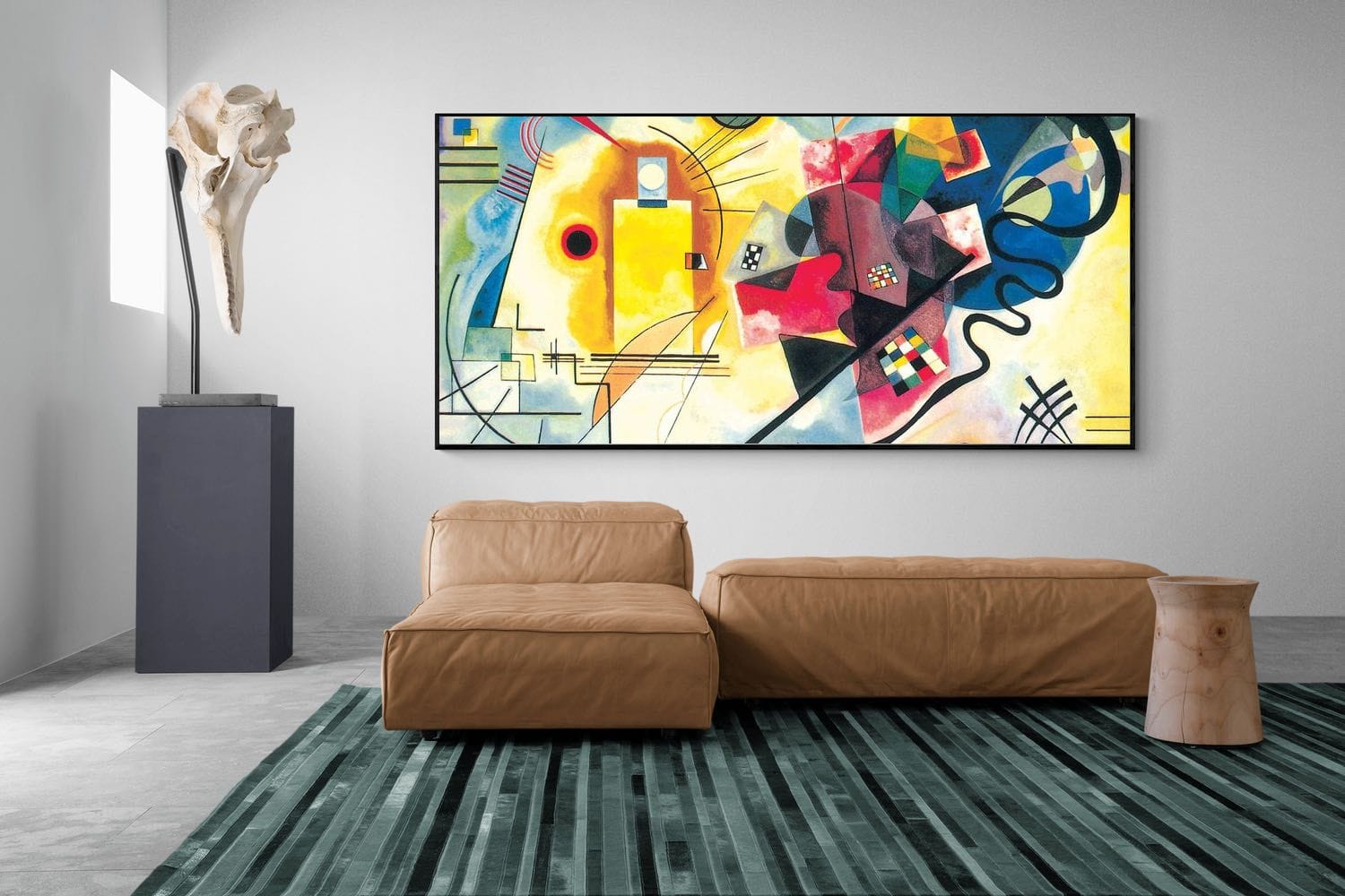 Suprematism was a Russian art movement focused on portraying basic geometric forms in a limited range of colours. Bauhaus was a modernist art school in Germany which had a major influence on 20th century art, and where Kandinsky taught from 1922 to 1933. Yellow-Red-Blue, painted by Kandinsky during his time at Bauhaus, can be seen as a symphony he created by merging his style with Bauhaus techniques and suprematist ideas. It can be divided into two parts with geometric shapes and bright colours on the left and abstract shapes and dark colours on the right.