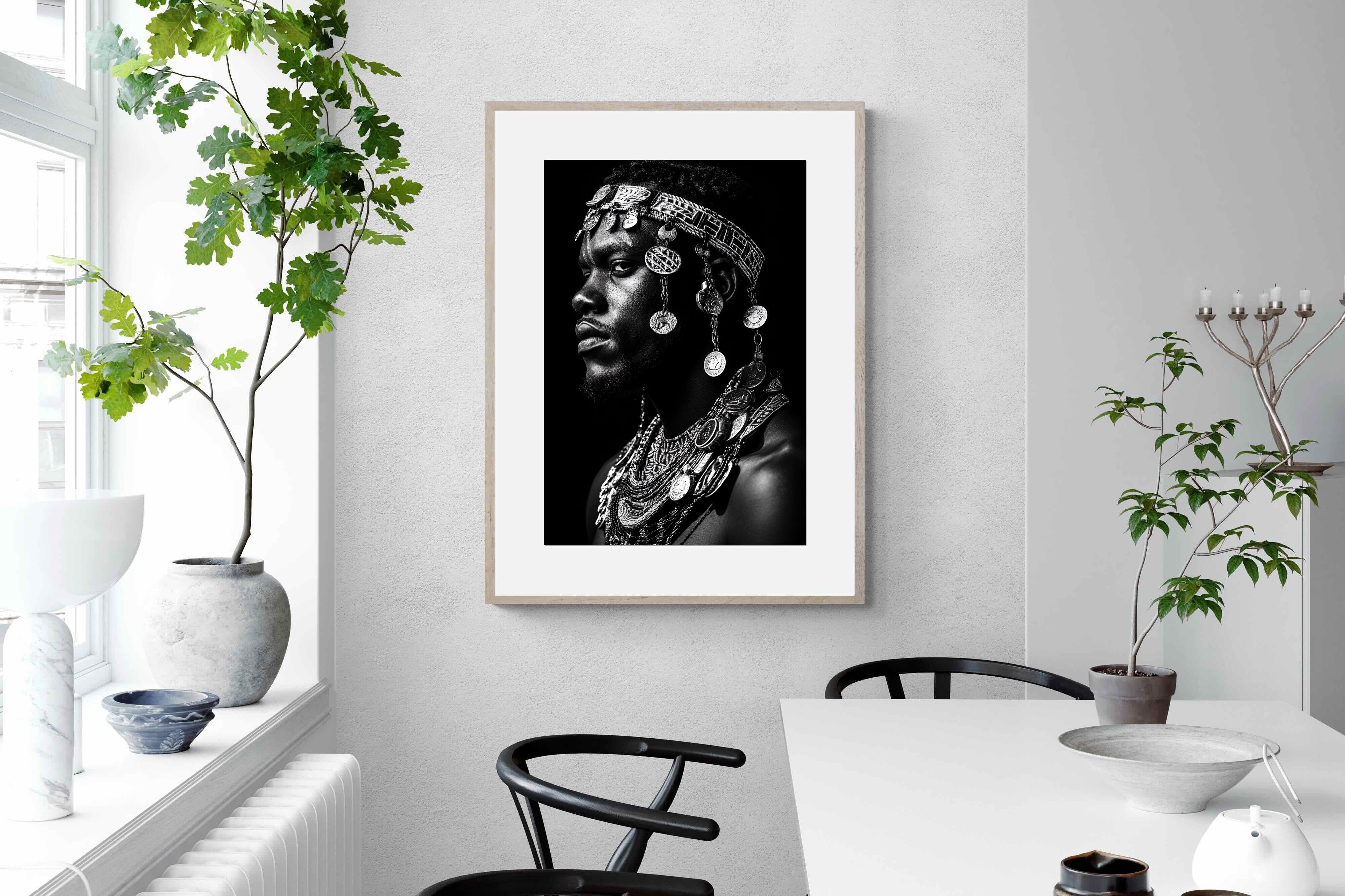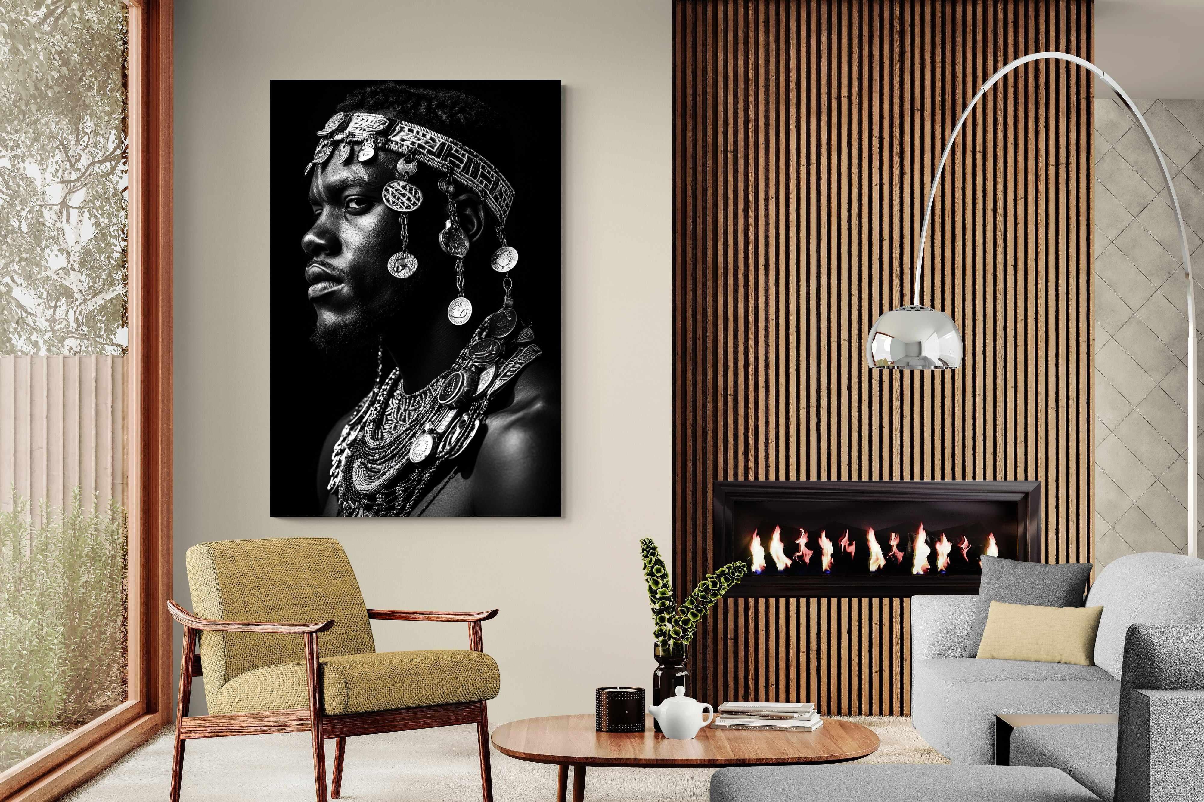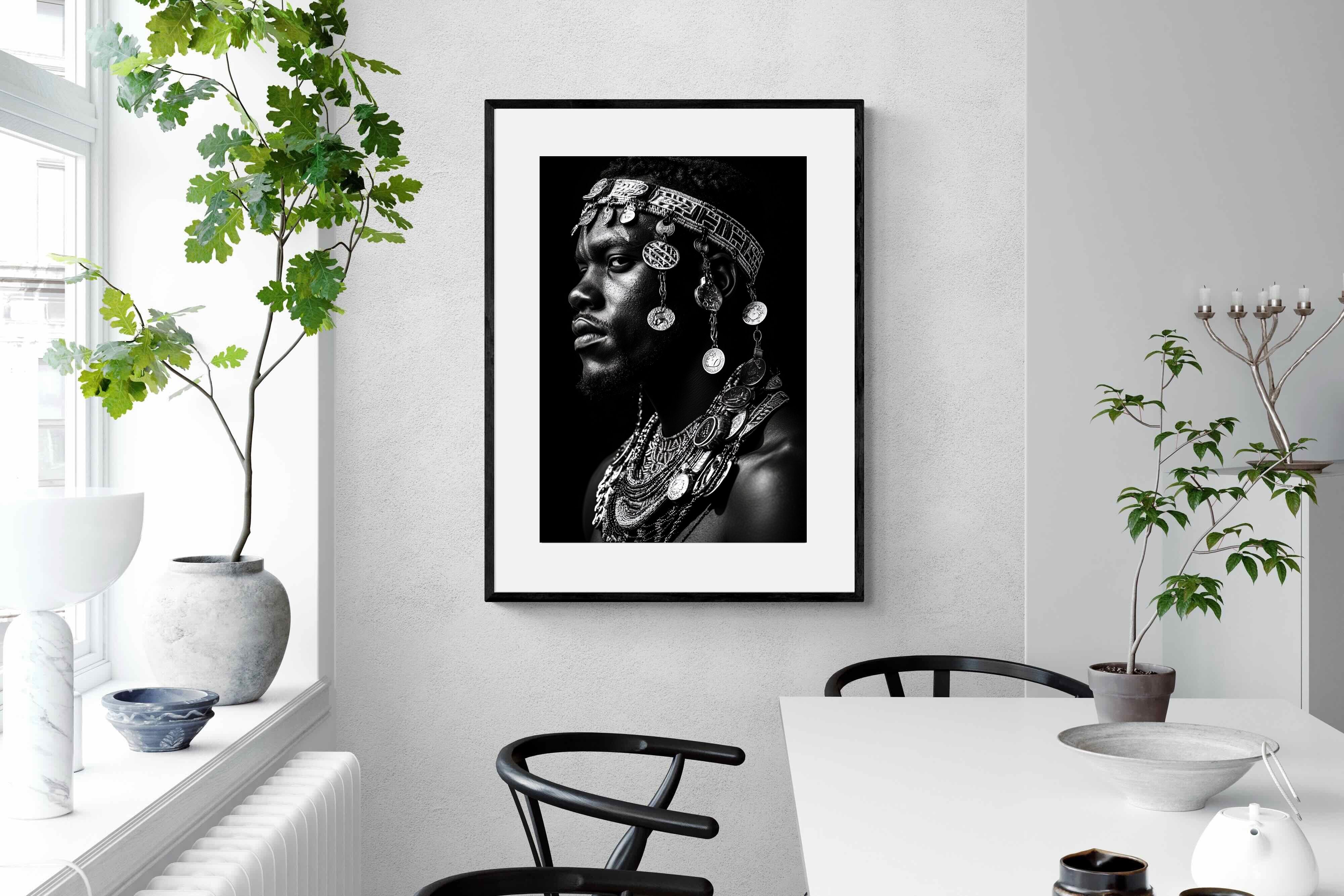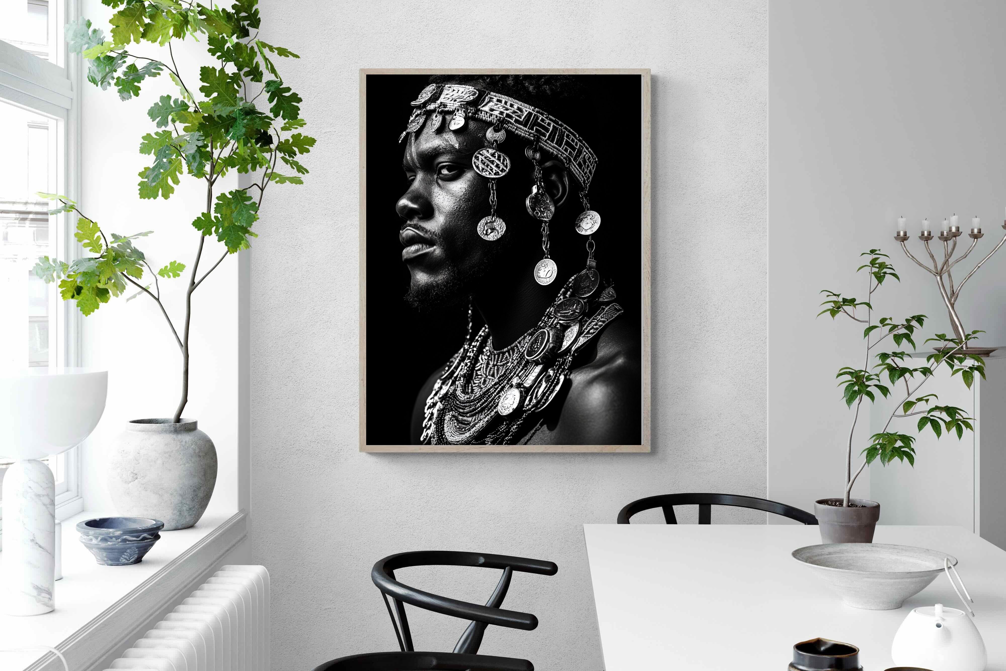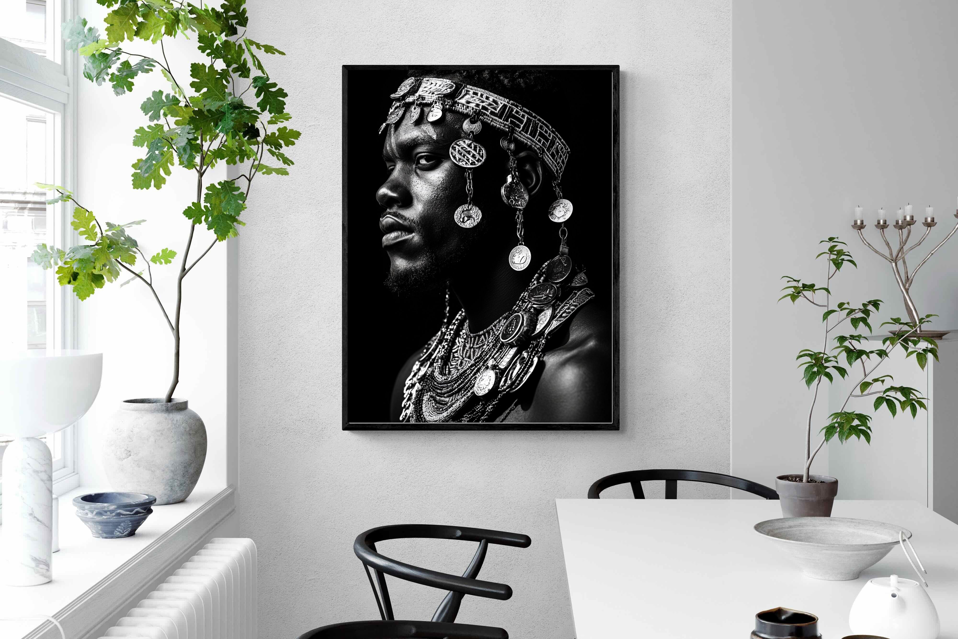 This powerful black-and-white portrait embodies the spirit of African tribal heritage. The subject’s intense gaze, adorned with intricate beaded jewellery and cascading metal charms, reflects a legacy of strength, tradition, and ancestral pride. The interplay of light and shadow enhances the craftsmanship of the adornments, evoking the richness of African warrior culture. A striking statement piece, this artwork brings depth, history, and cultural authenticity to any modern space, celebrating the resilience and beauty of African traditions.