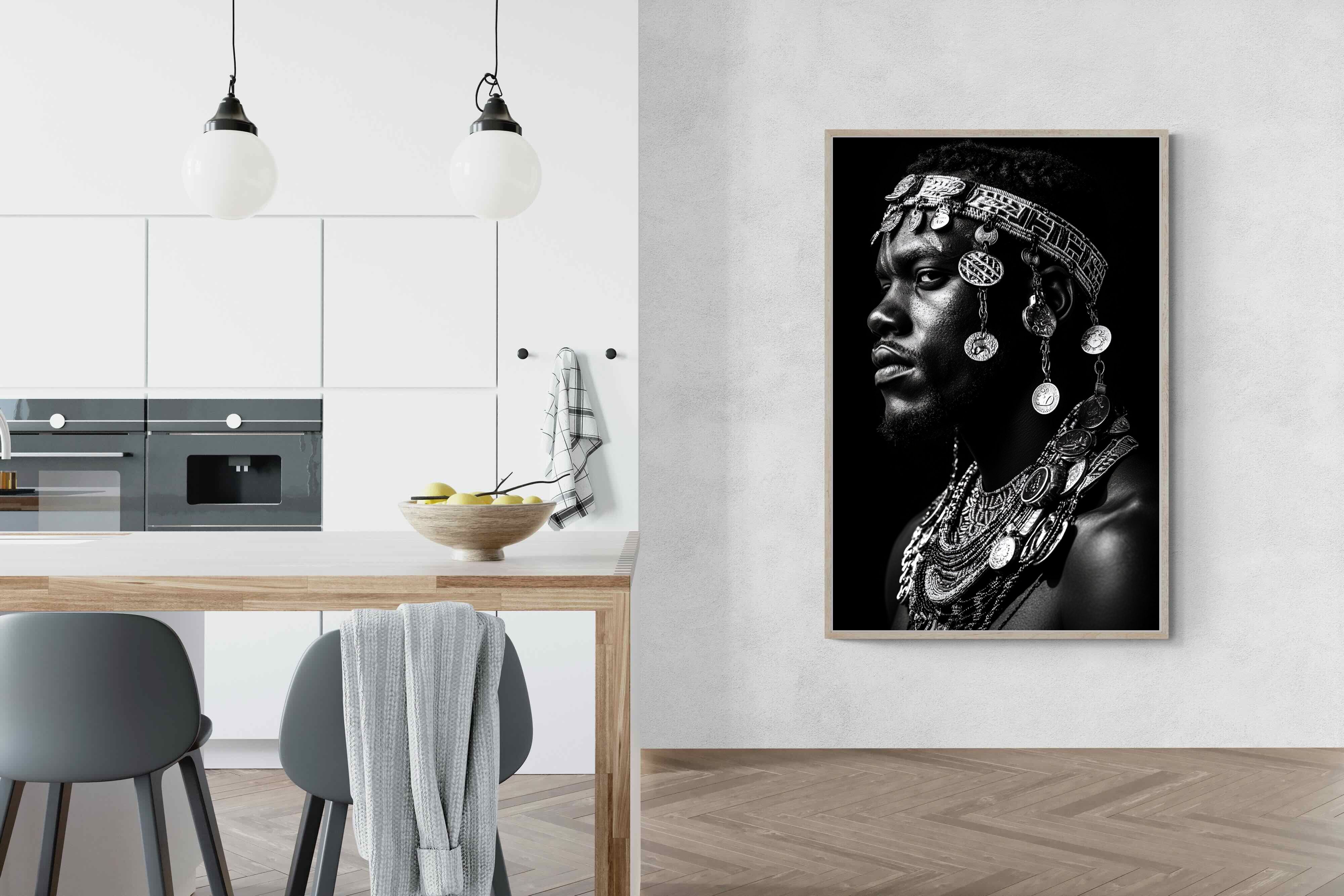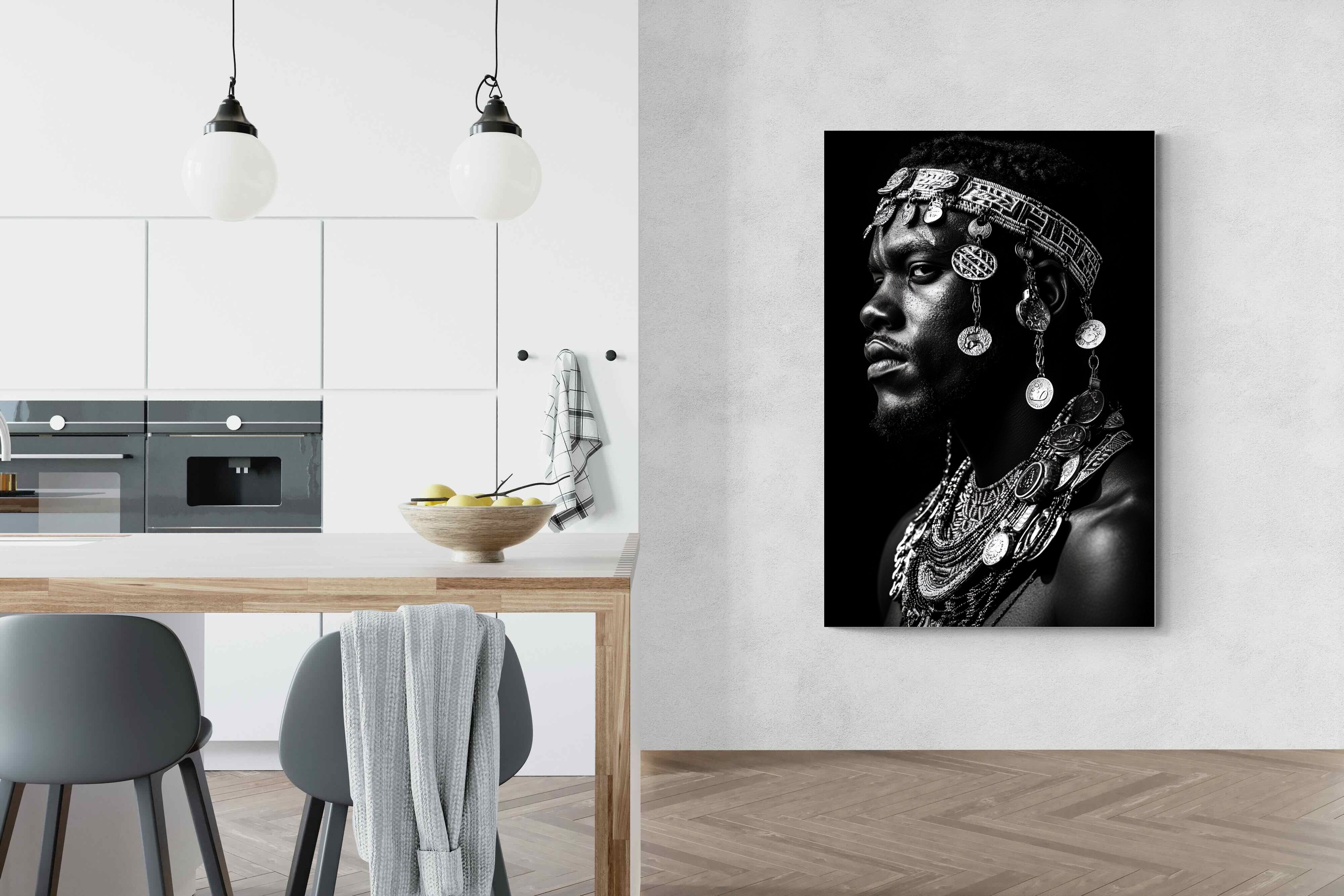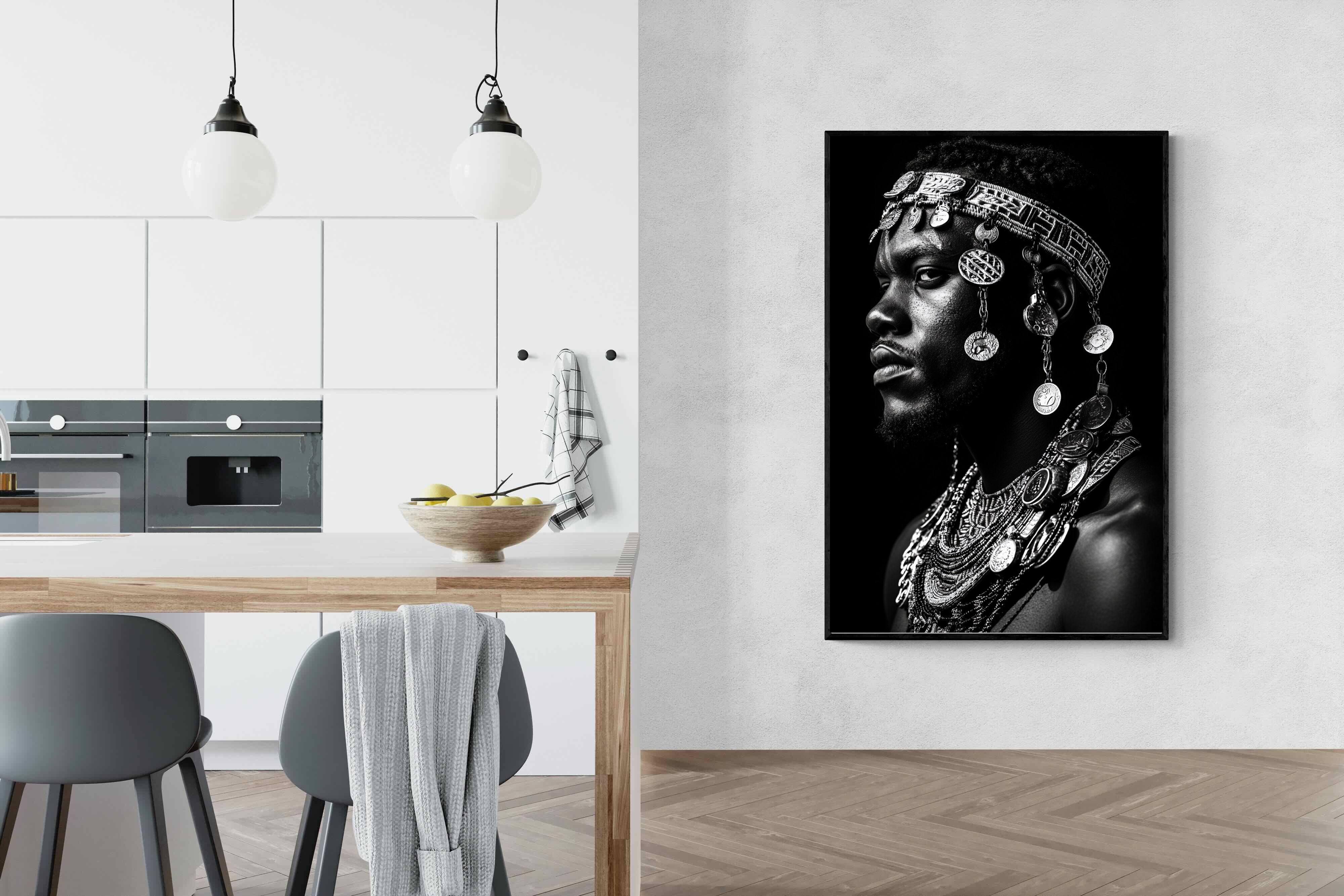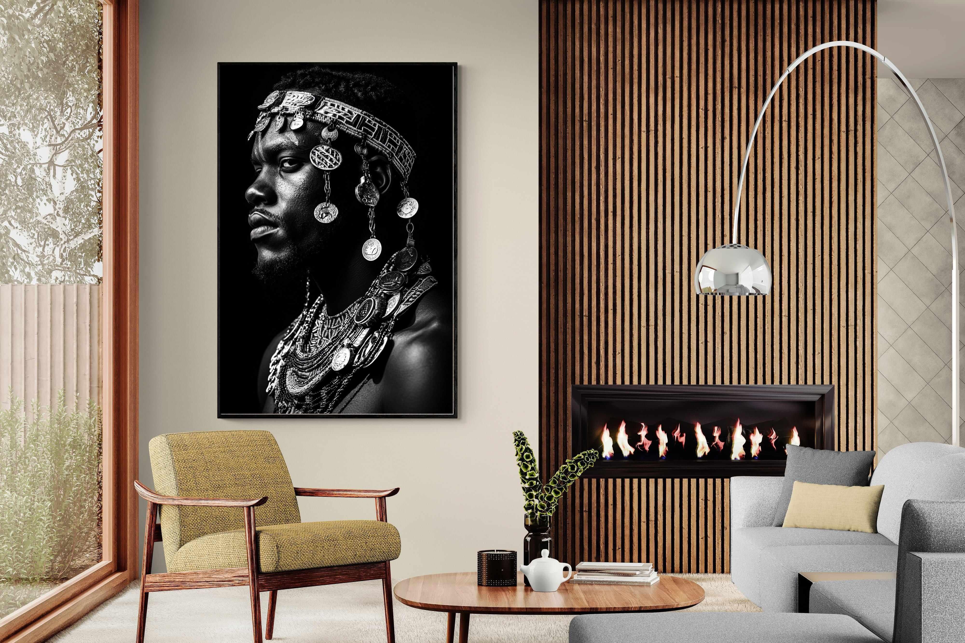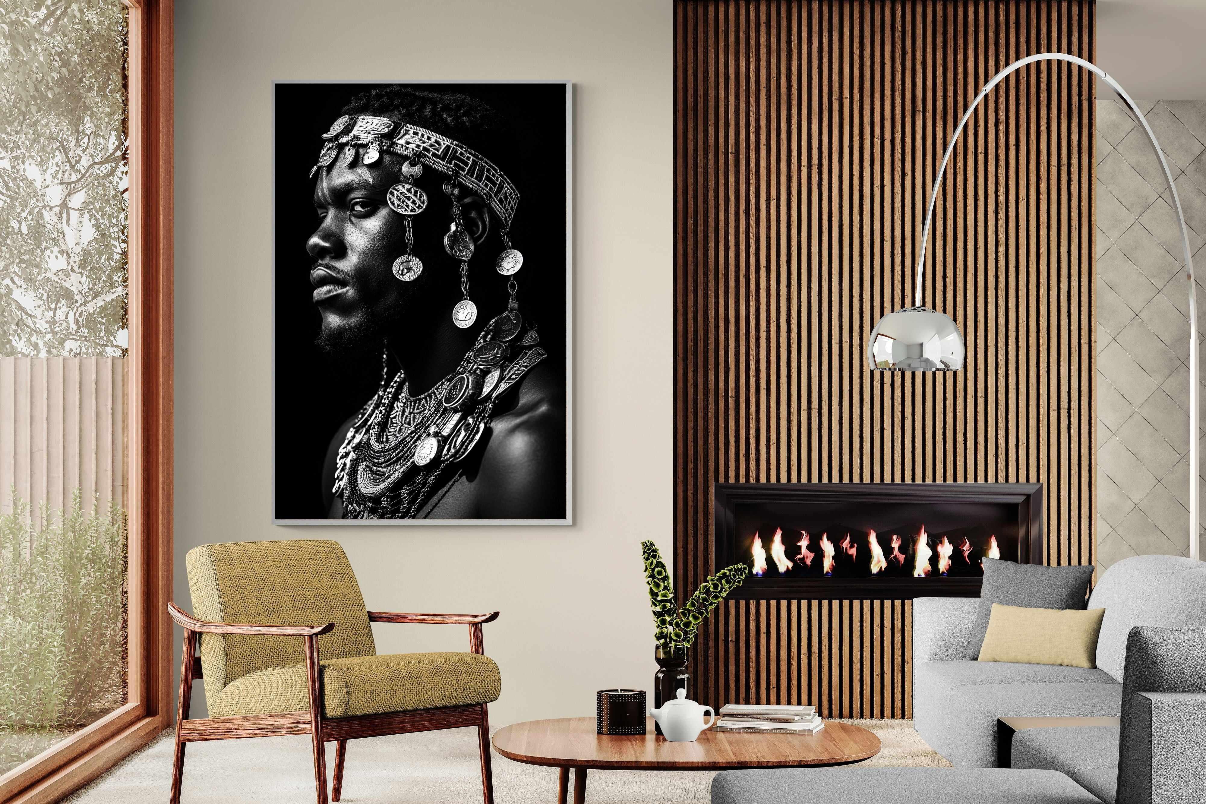 This powerful black-and-white portrait embodies the spirit of African tribal heritage. The subject’s intense gaze, adorned with intricate beaded jewellery and cascading metal charms, reflects a legacy of strength, tradition, and ancestral pride. The interplay of light and shadow enhances the craftsmanship of the adornments, evoking the richness of African warrior culture. A striking statement piece, this artwork brings depth, history, and cultural authenticity to any modern space, celebrating the resilience and beauty of African traditions.