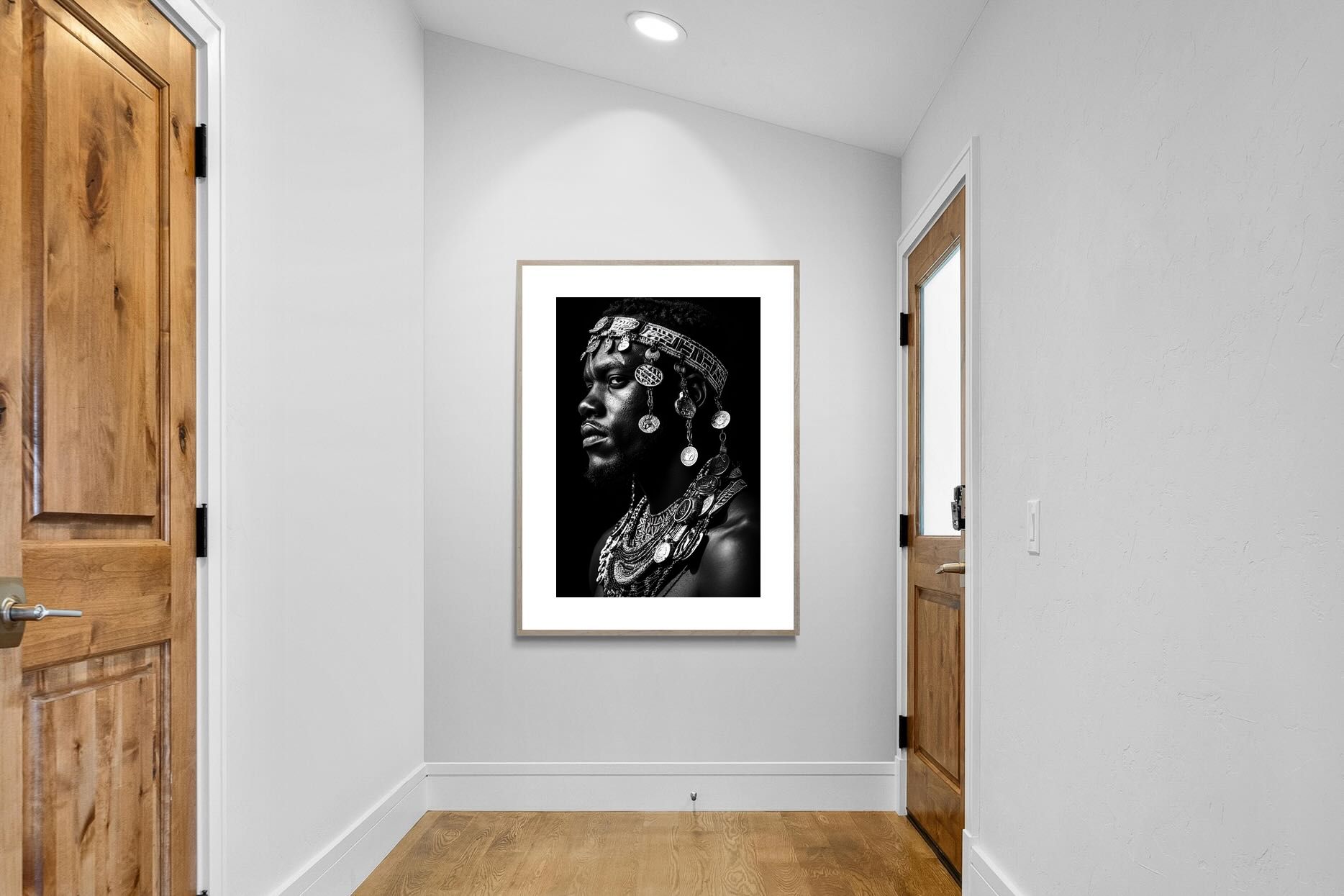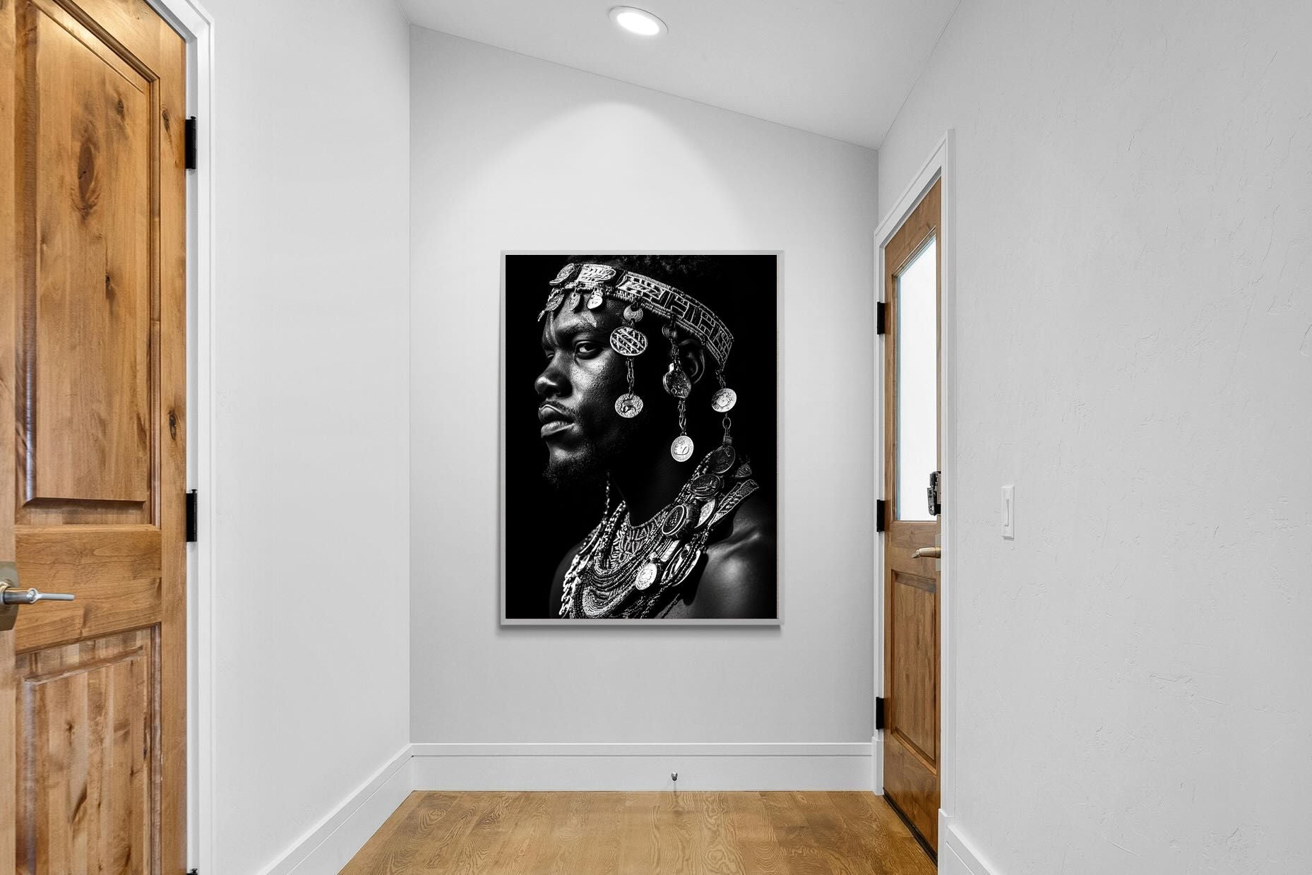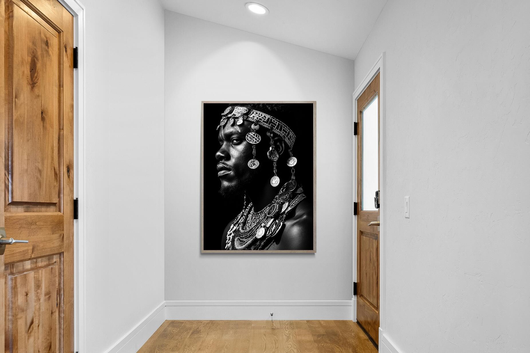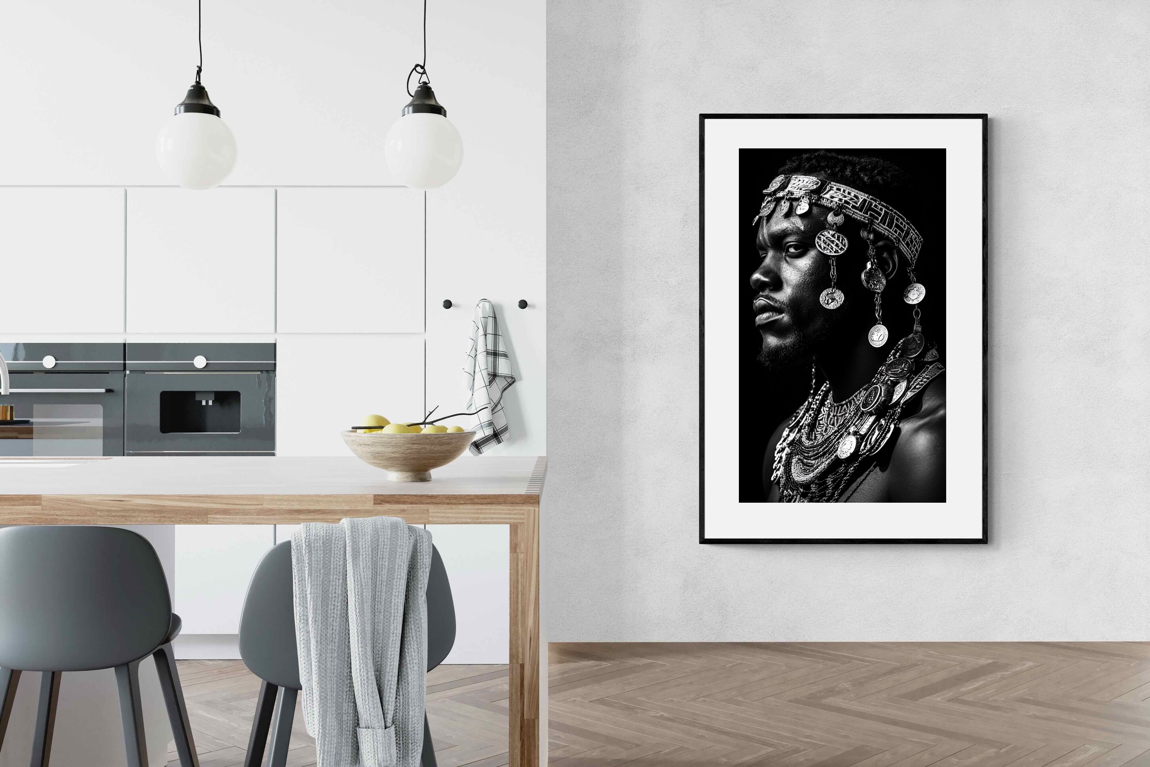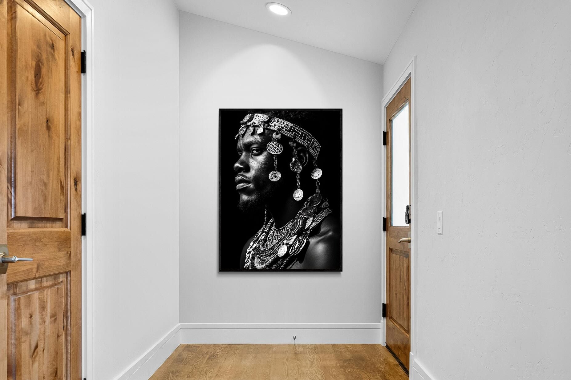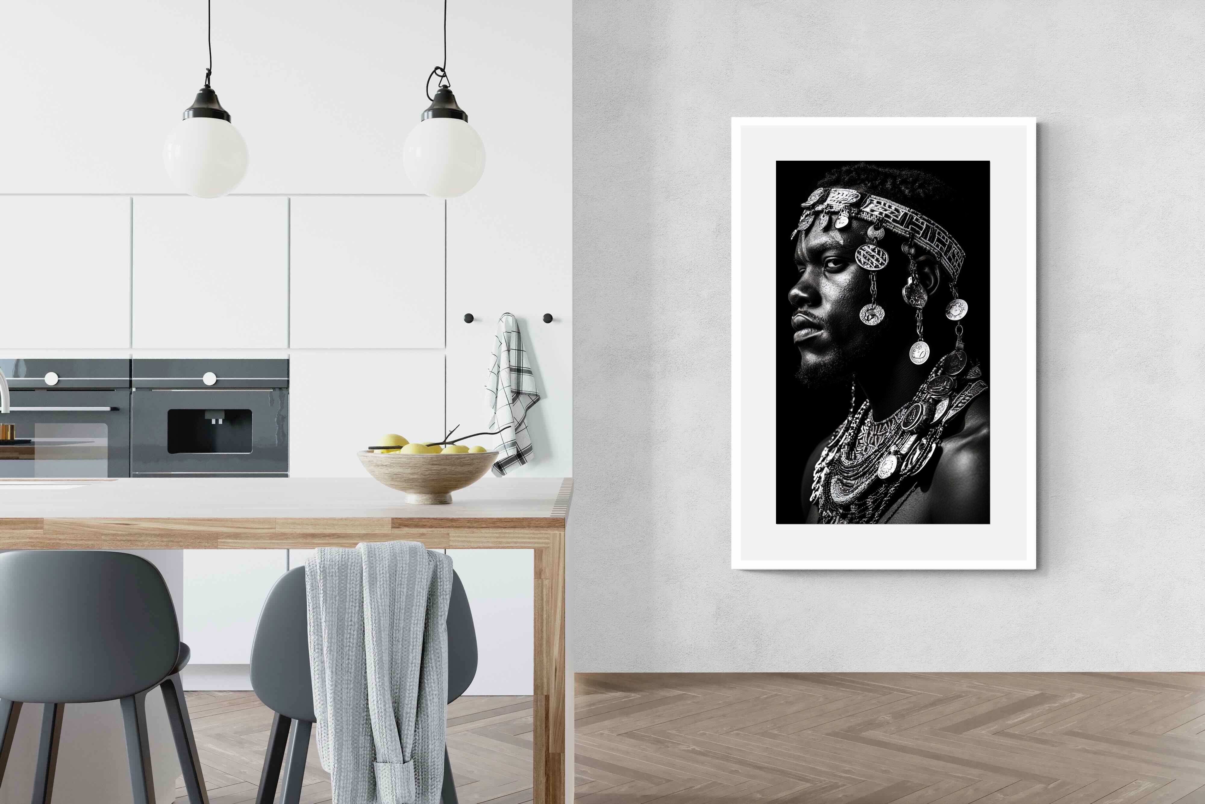 This powerful black-and-white portrait embodies the spirit of African tribal heritage. The subject’s intense gaze, adorned with intricate beaded jewellery and cascading metal charms, reflects a legacy of strength, tradition, and ancestral pride. The interplay of light and shadow enhances the craftsmanship of the adornments, evoking the richness of African warrior culture. A striking statement piece, this artwork brings depth, history, and cultural authenticity to any modern space, celebrating the resilience and beauty of African traditions.