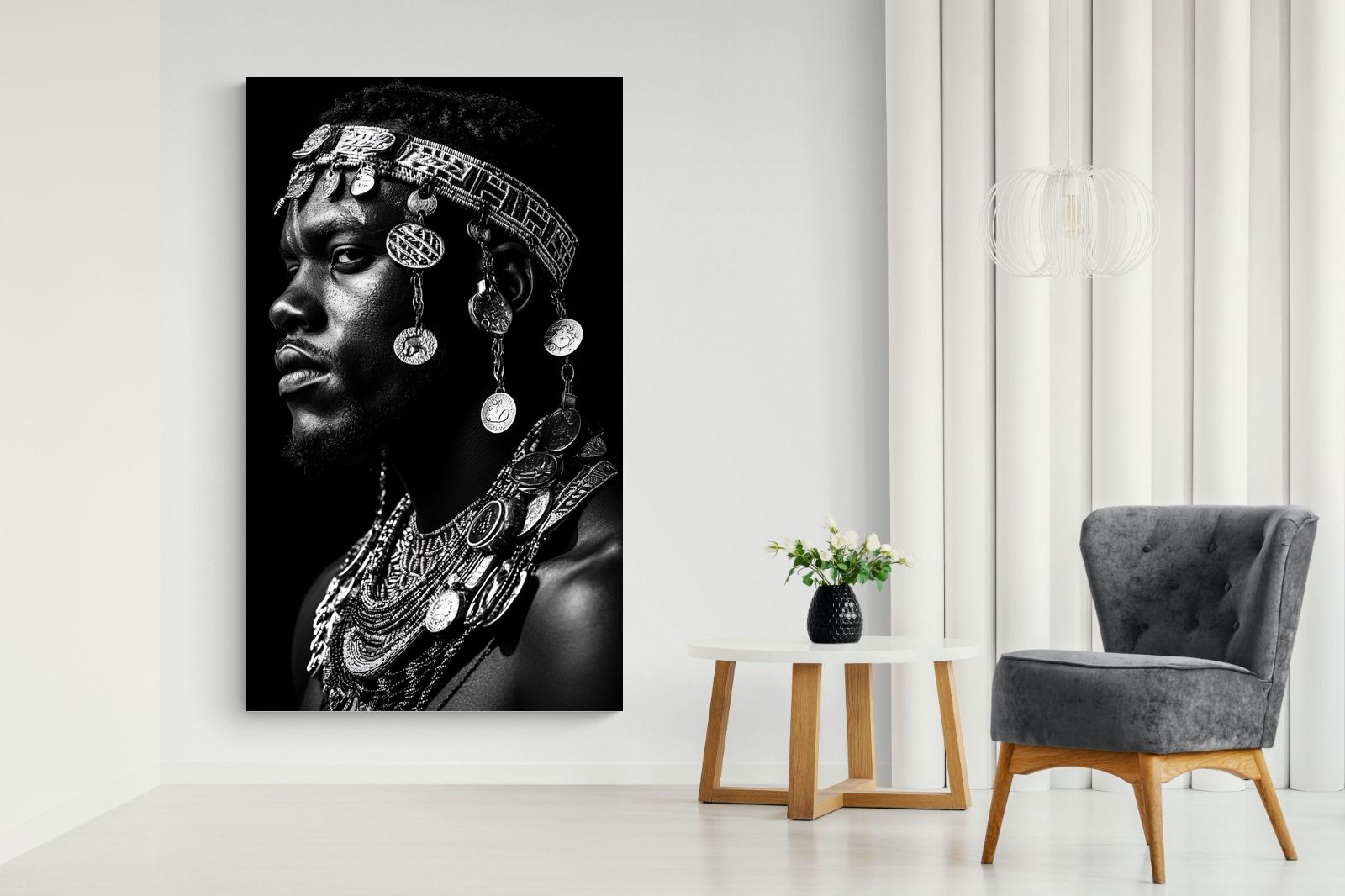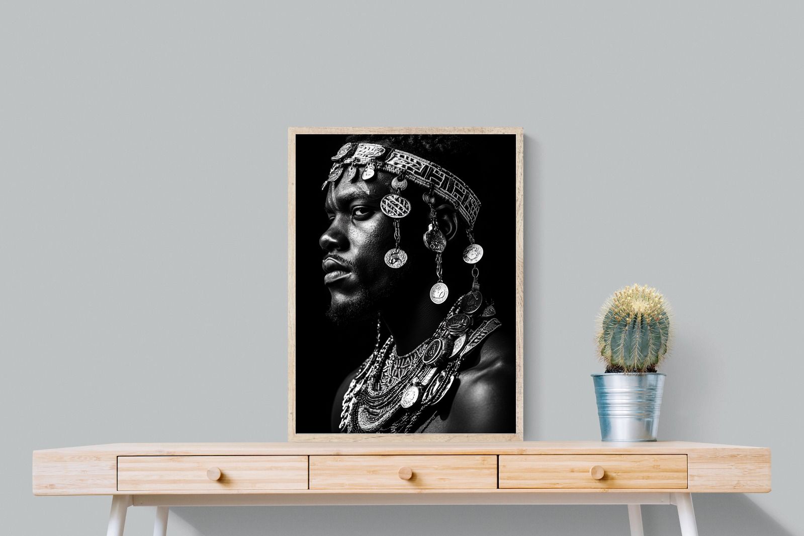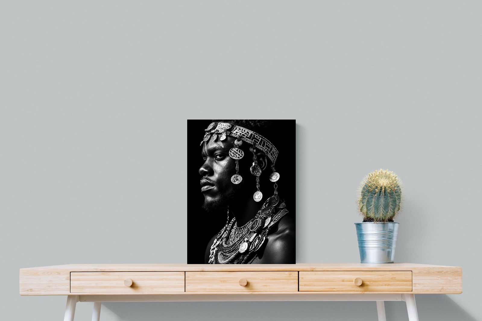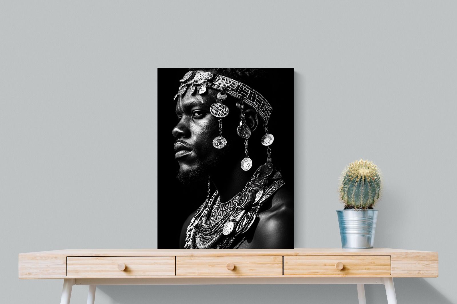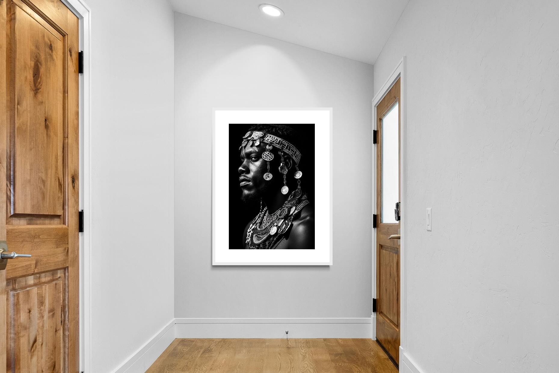 This powerful black-and-white portrait embodies the spirit of African tribal heritage. The subject’s intense gaze, adorned with intricate beaded jewellery and cascading metal charms, reflects a legacy of strength, tradition, and ancestral pride. The interplay of light and shadow enhances the craftsmanship of the adornments, evoking the richness of African warrior culture. A striking statement piece, this artwork brings depth, history, and cultural authenticity to any modern space, celebrating the resilience and beauty of African traditions.