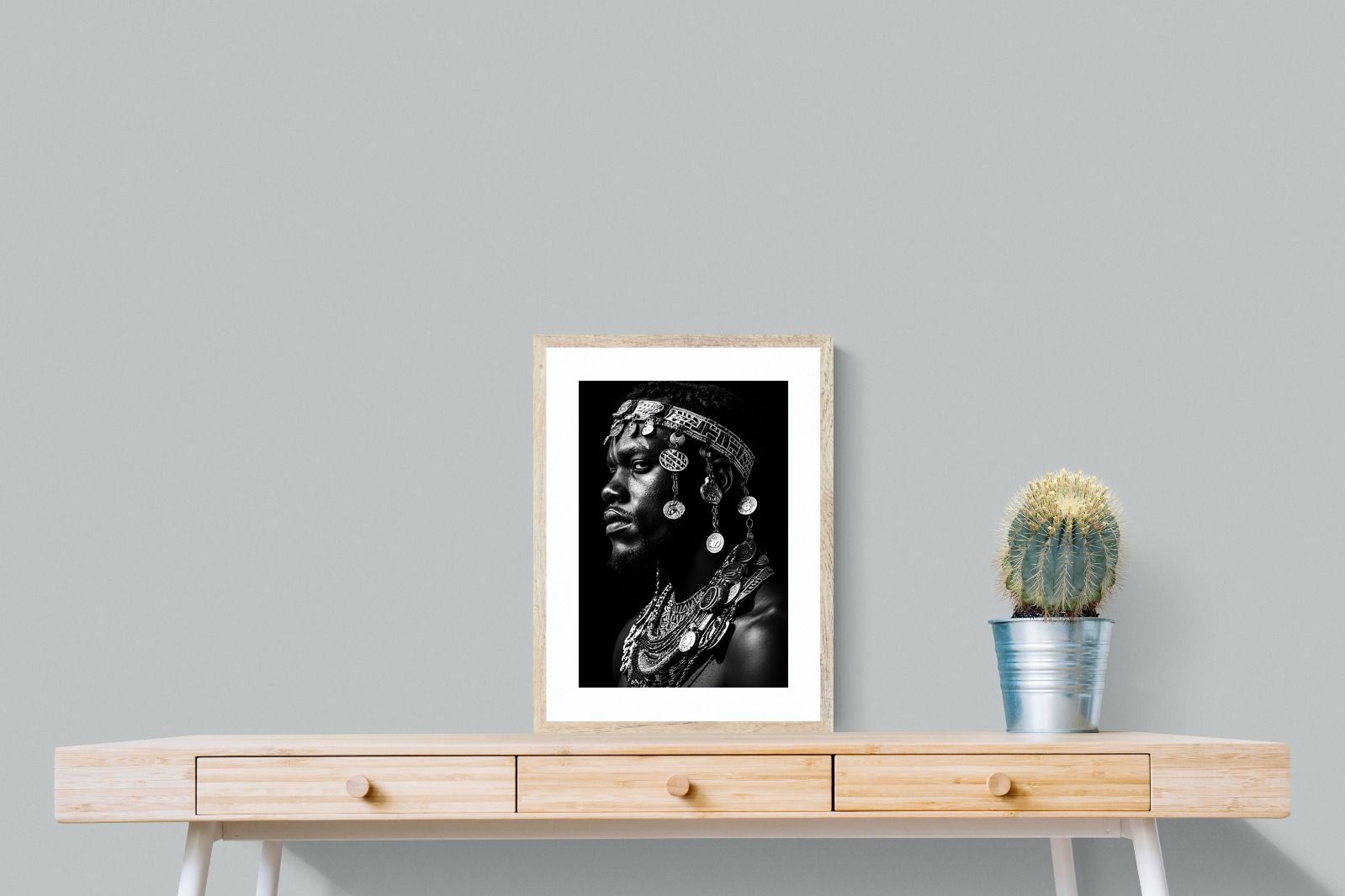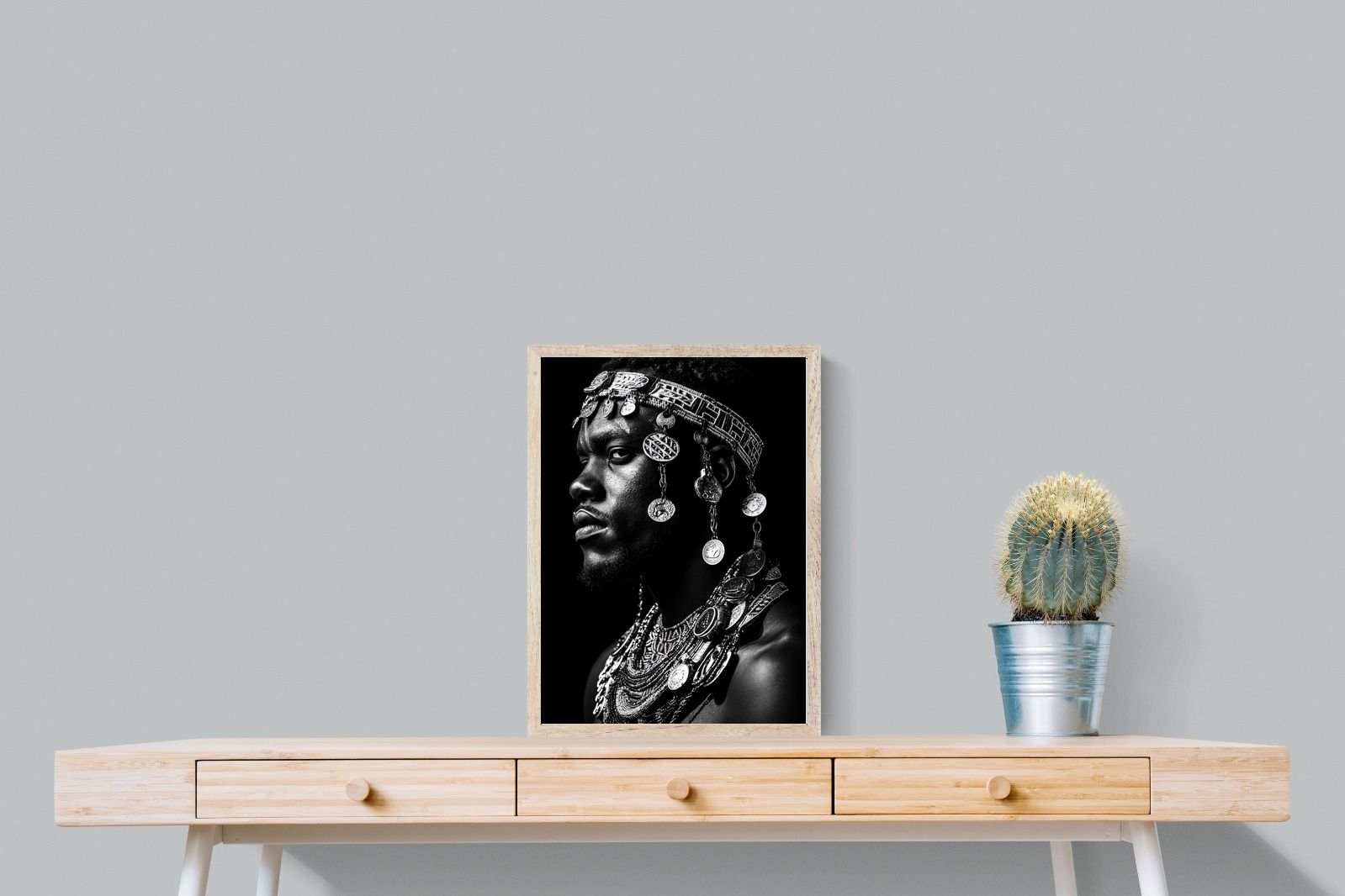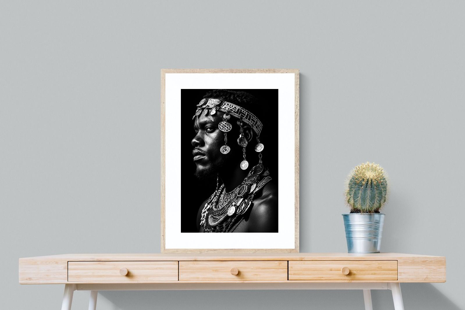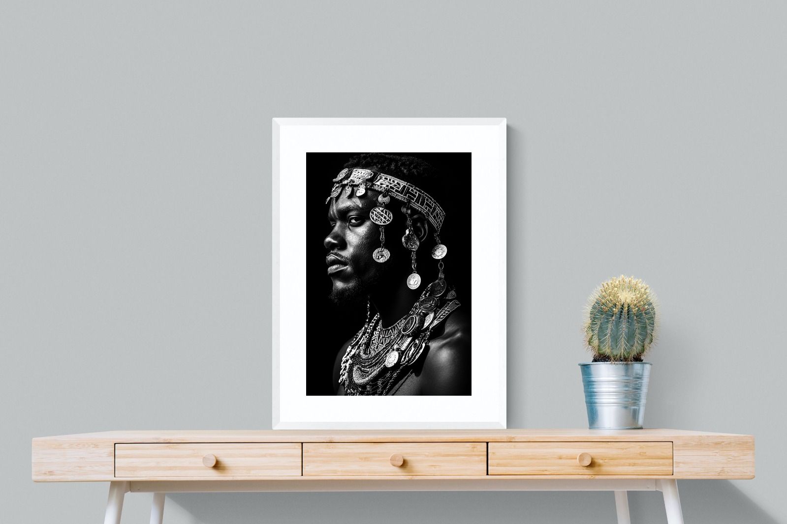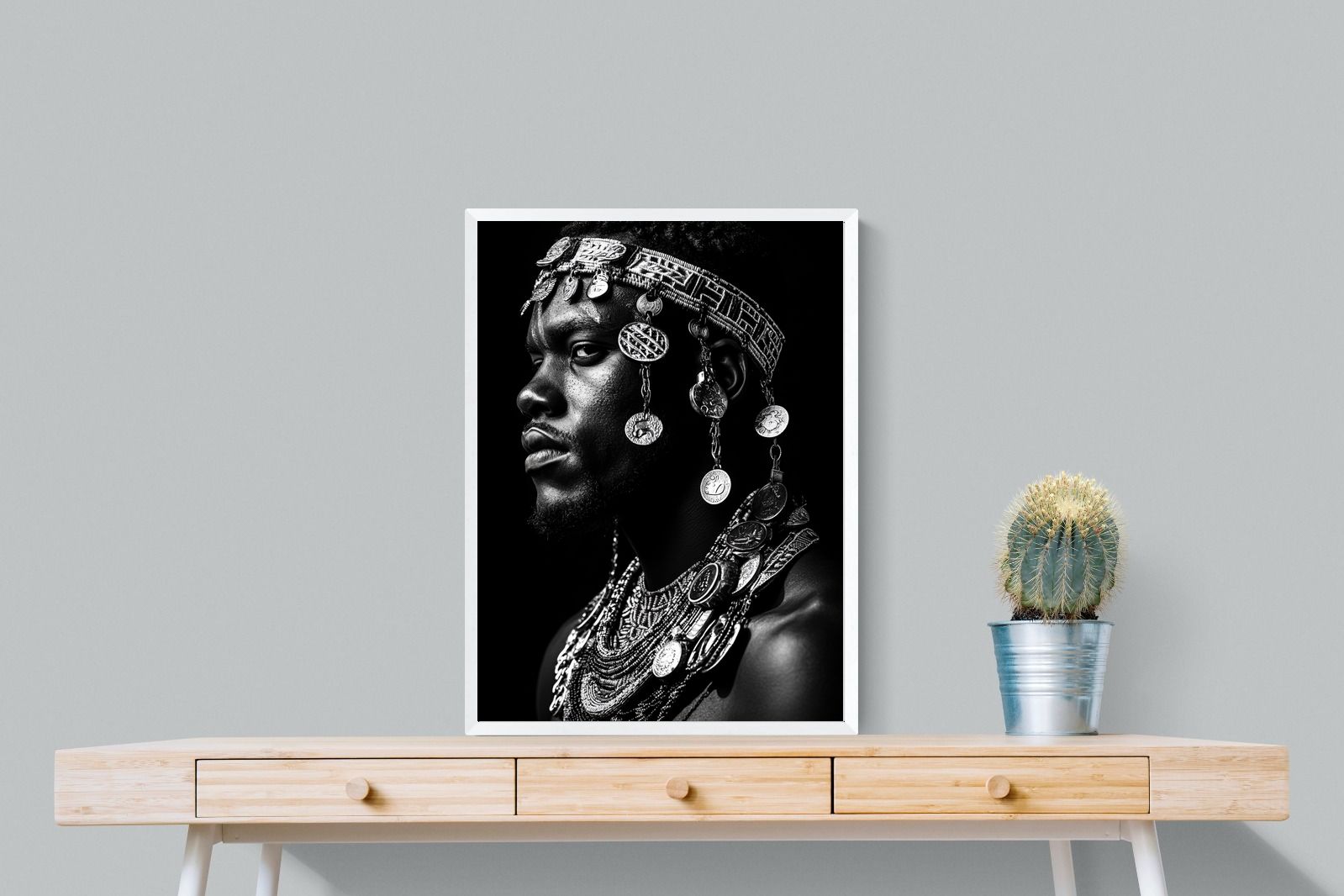 This powerful black-and-white portrait embodies the spirit of African tribal heritage. The subject’s intense gaze, adorned with intricate beaded jewellery and cascading metal charms, reflects a legacy of strength, tradition, and ancestral pride. The interplay of light and shadow enhances the craftsmanship of the adornments, evoking the richness of African warrior culture. A striking statement piece, this artwork brings depth, history, and cultural authenticity to any modern space, celebrating the resilience and beauty of African traditions.