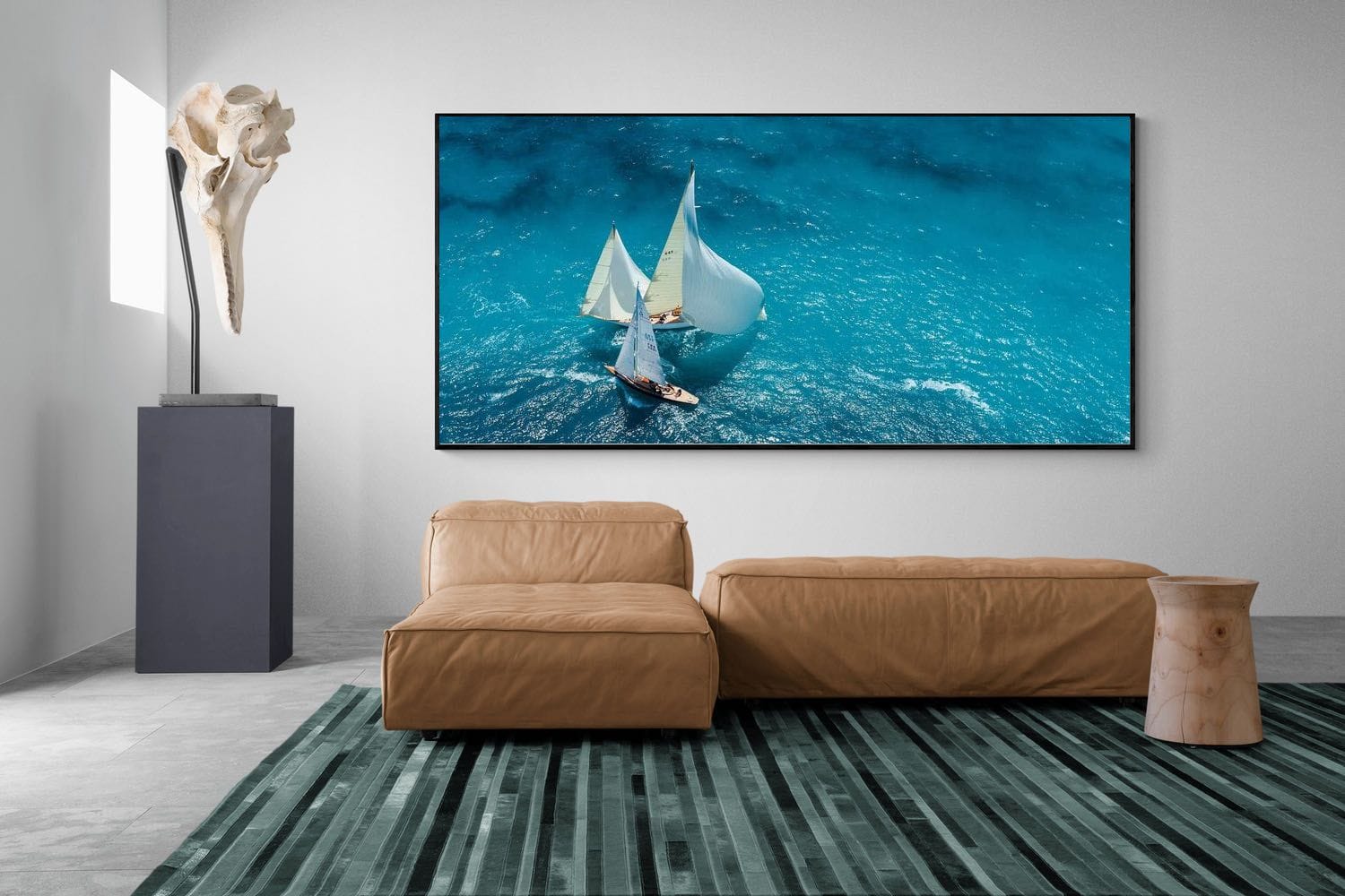 Two classic sailing yachts glide across vivid turquoise water, their white sails catching the light against the expansive sea below. Captured from above, the composition highlights clean lines, movement and open space, creating a refined nautical aesthetic. The rich blue tones and crisp detail evoke freedom, summer and timeless maritime elegance. Ideal for coastal homes, modern interiors or statement spaces, this artwork brings clarity, colour and effortless ocean sophistication to any wall.