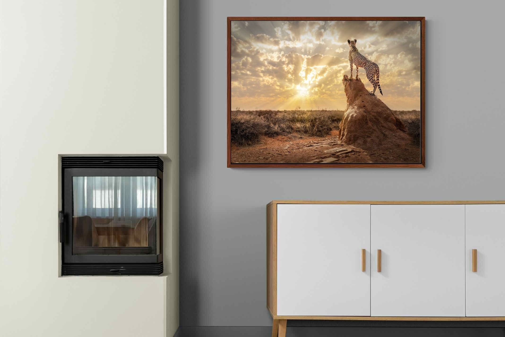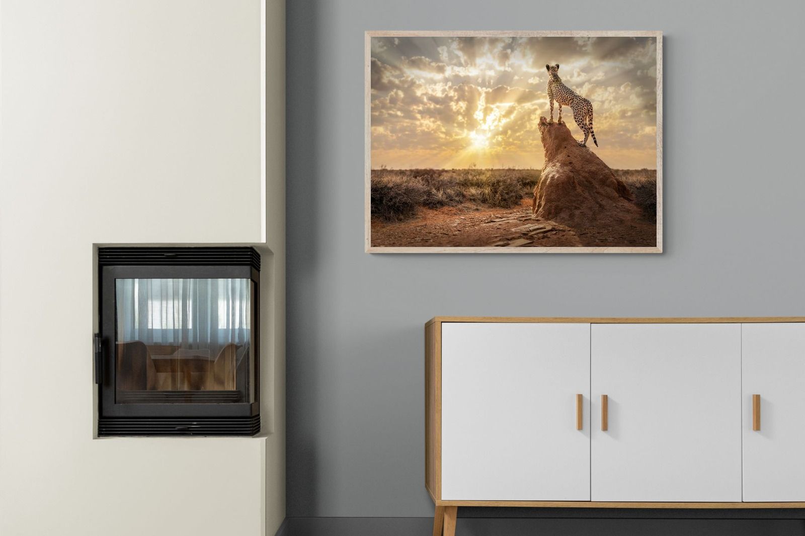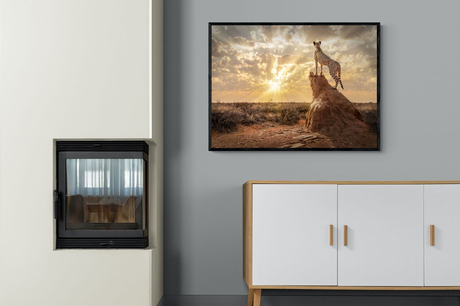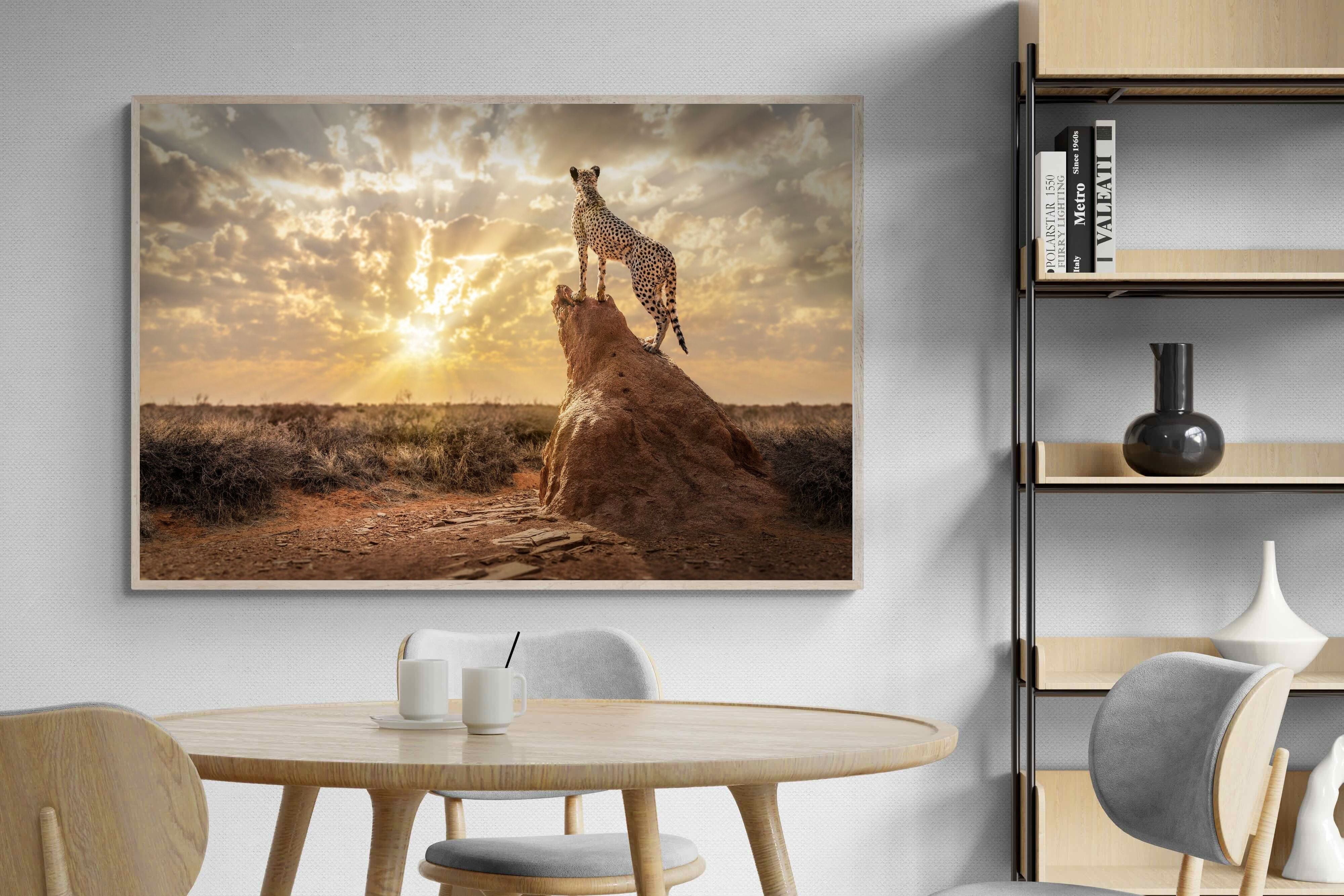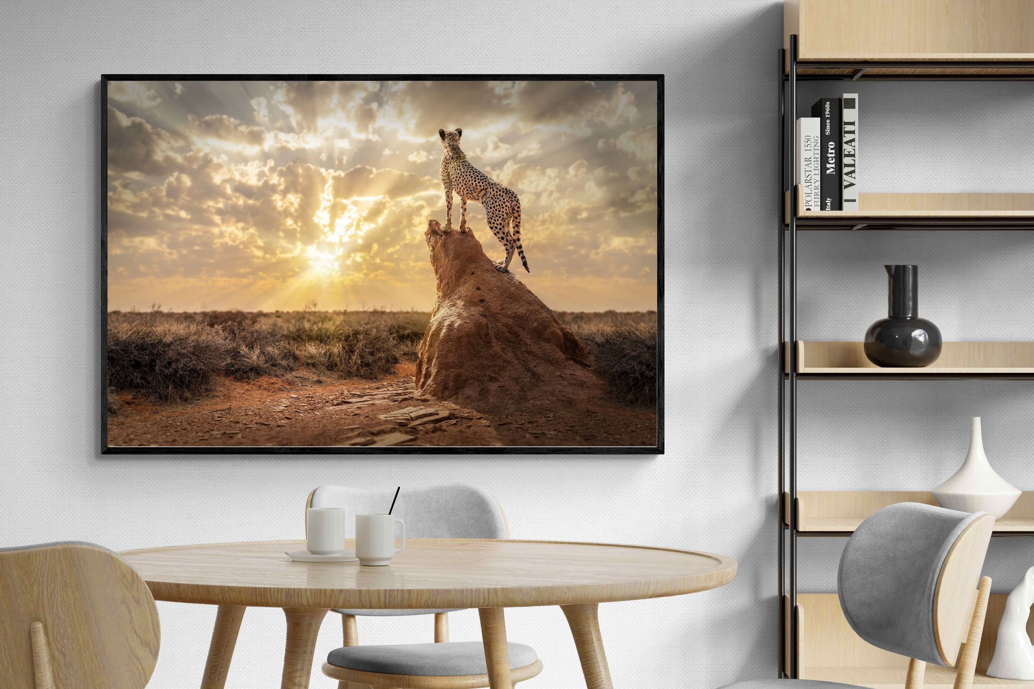 "King of the Savannah" captures the poised cheetah surveying the vast plains, framed against a dramatic sky. The striking black-and-white tones emphasize the grace and strength of this magnificent animal. Ideal for modern homes with an appreciation for wildlife and nature, this powerful image adds drama and depth to any space, serving as a reminder of the untamed beauty of the animal kingdom.