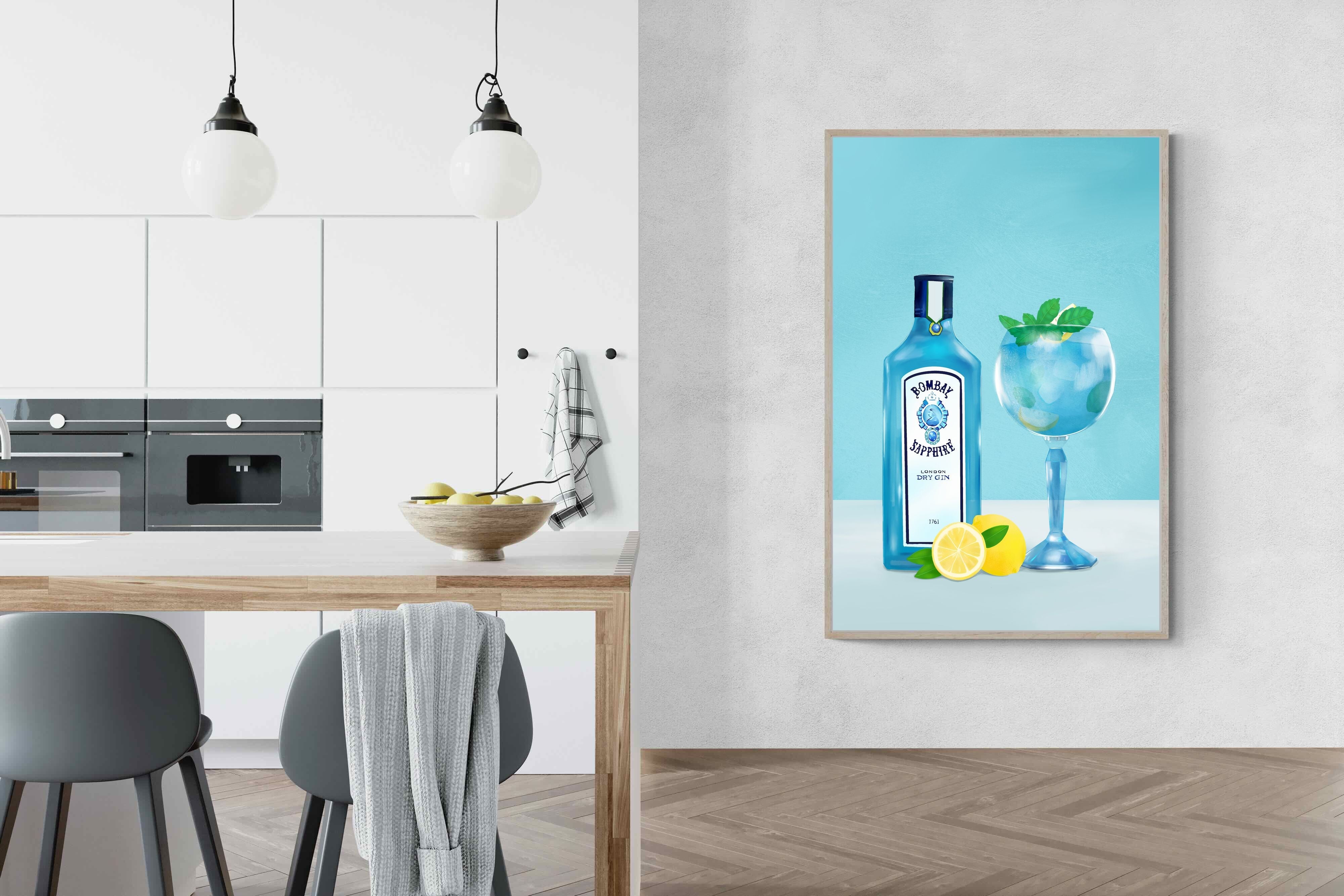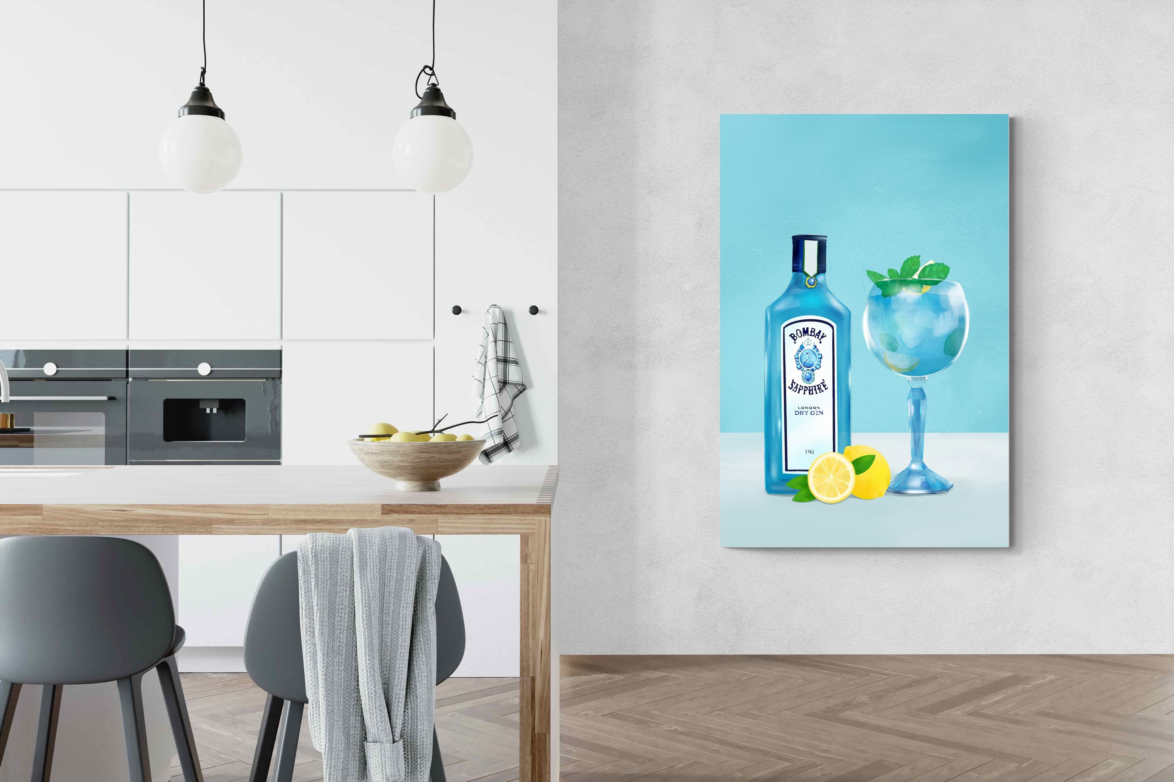 This artwork features a detailed illustration of a Bombay Sapphire gin bottle and a glass garnished with lemon and mint, set against a soothing blue background. The crisp lines and cool tones create a refreshing and sophisticated look. This piece would make an excellent addition to a contemporary home, especially in a bar area or dining room, adding a touch of elegance and a hint of luxury. Its clean and modern aesthetic complements various decor styles.