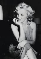 An enchanting black and white photograph featuring the captivating Marilyn Monroe. This image captures a candid moment of her seated in a club, her glance subtly darting across the room while her pinky finger rests delicately between her teeth. Whether presented as wall art on canvas, framed behind glass, or wallpaper, this mesmerizing photograph encapsulates Monroe's alluring charm and timeless elegance.