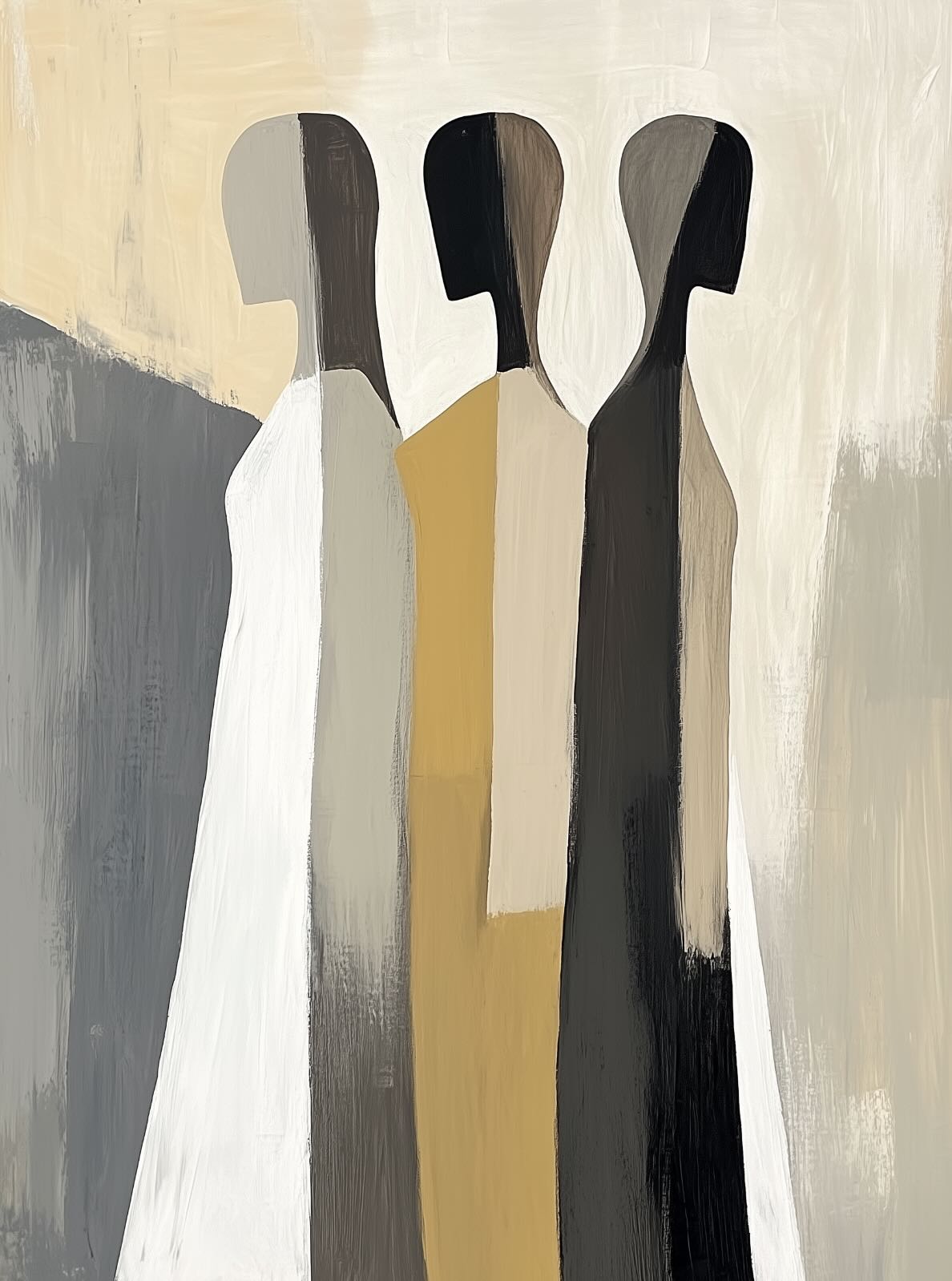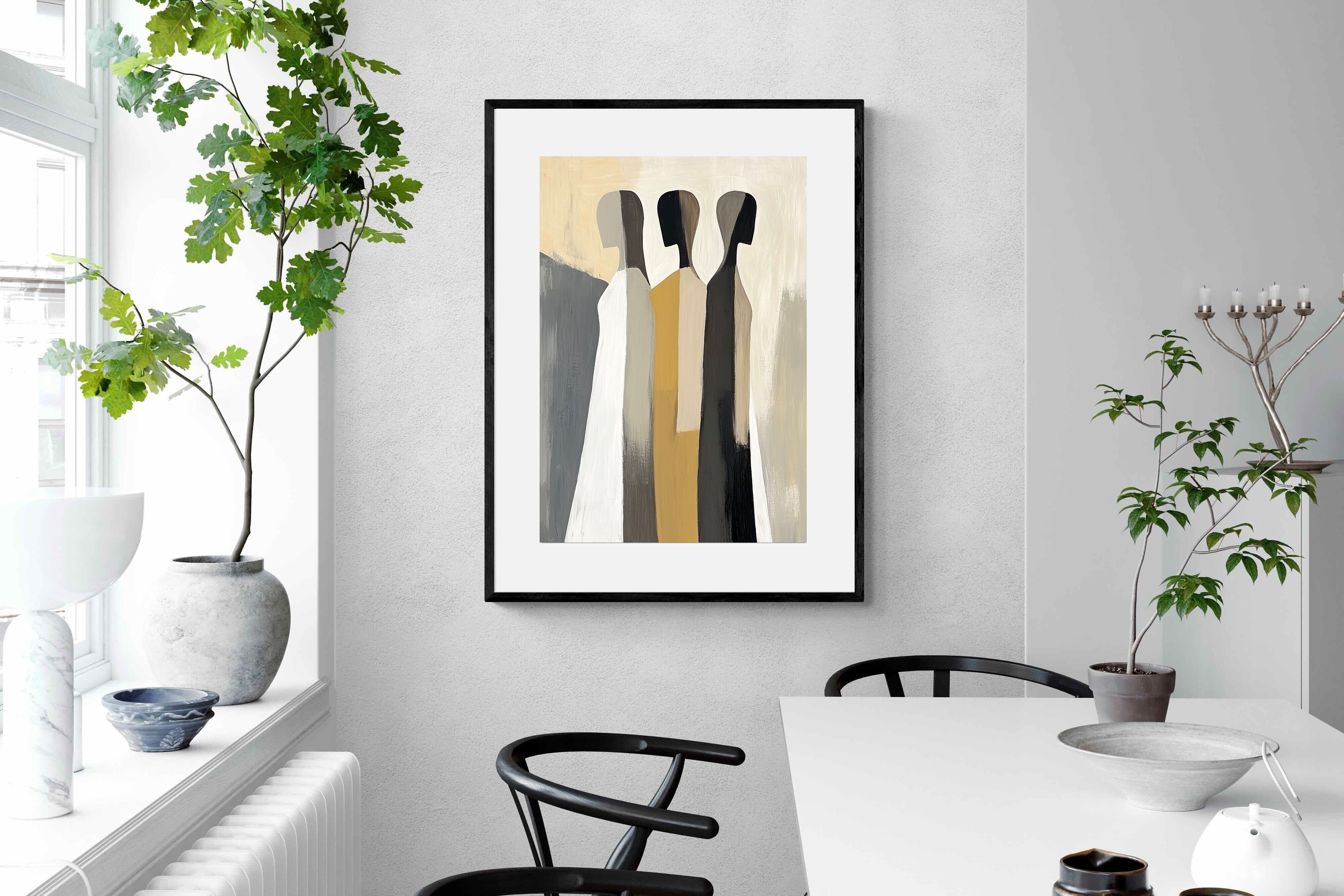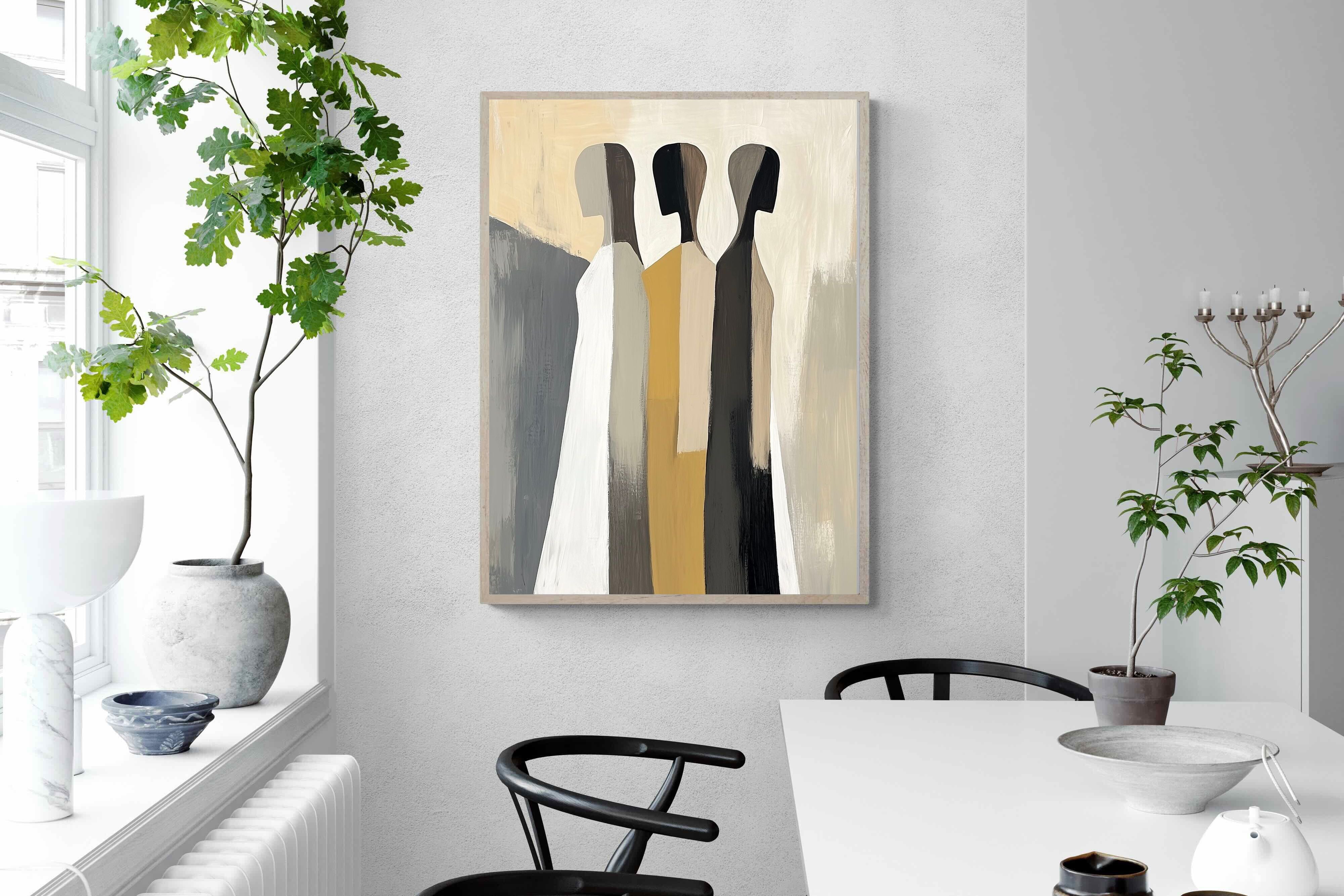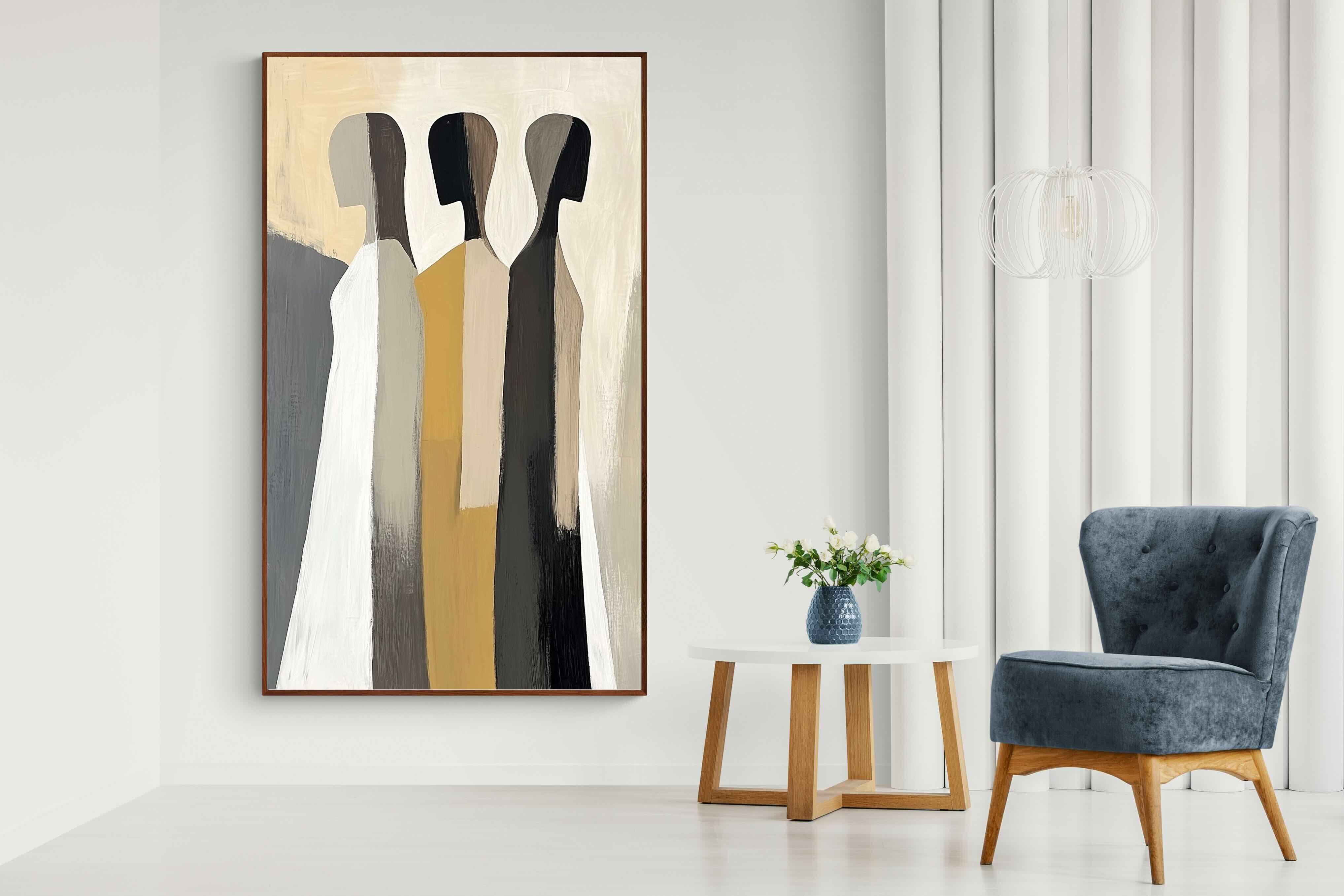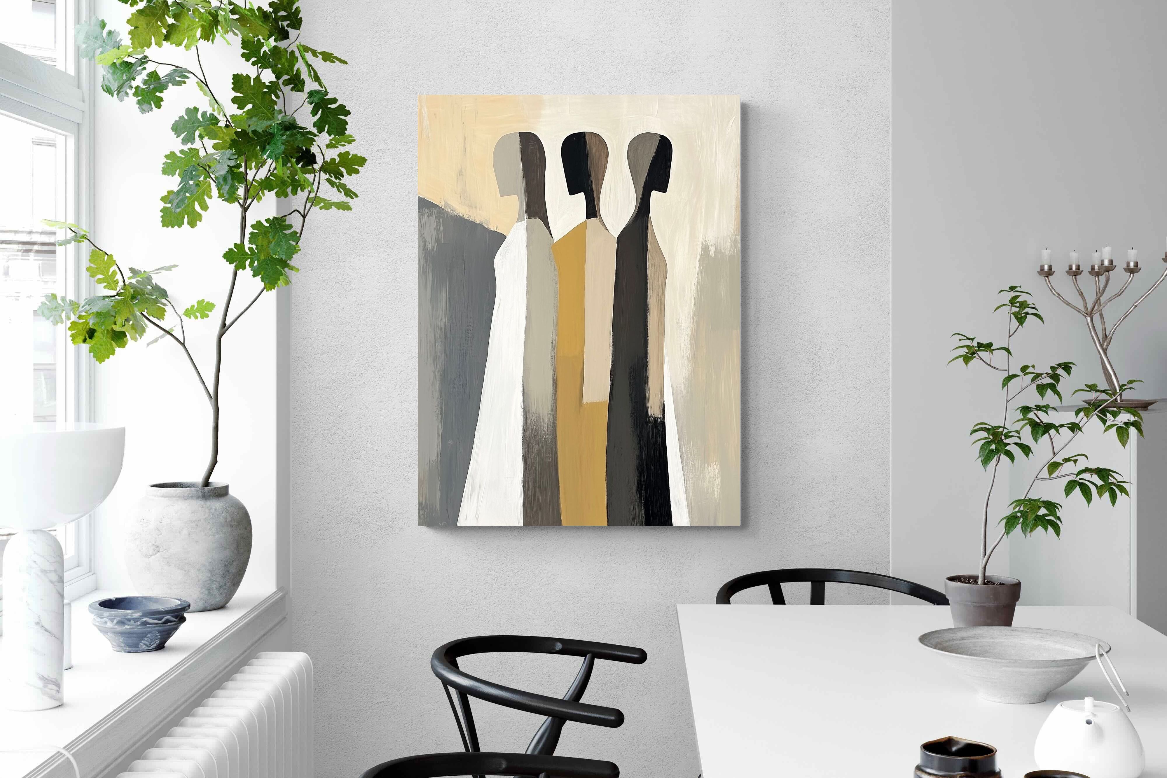 A striking abstract trio defined by clean vertical forms and a central band of warm gold. The contrast between deep blacks, soft whites and muted neutrals creates a balanced yet impactful composition. The simplicity of the figures allows texture and tone to take centre stage, making it ideal for modern interiors. Perfect for feature walls or refined living spaces, this piece delivers a strong, contemporary aesthetic with a subtle hint of warmth.