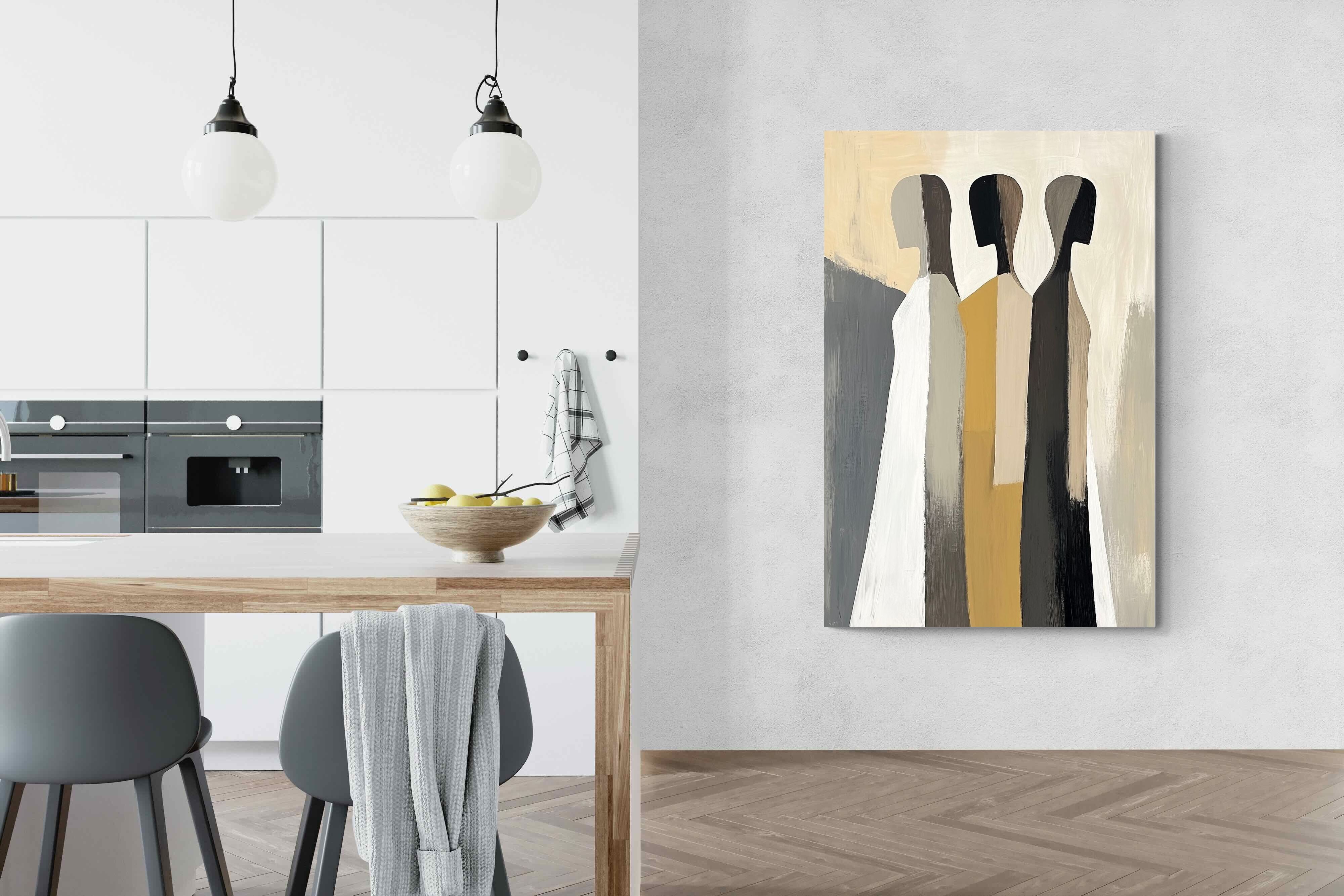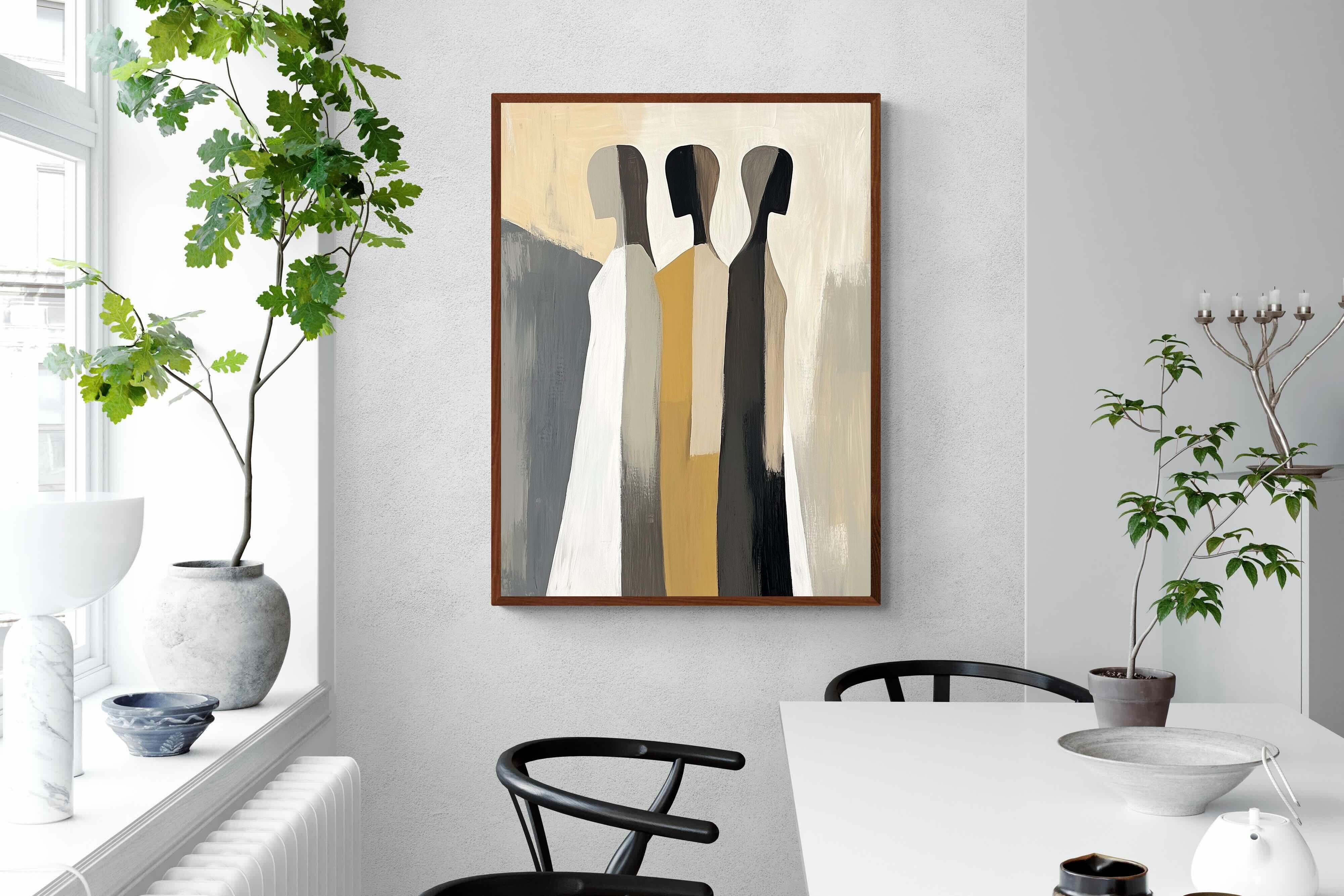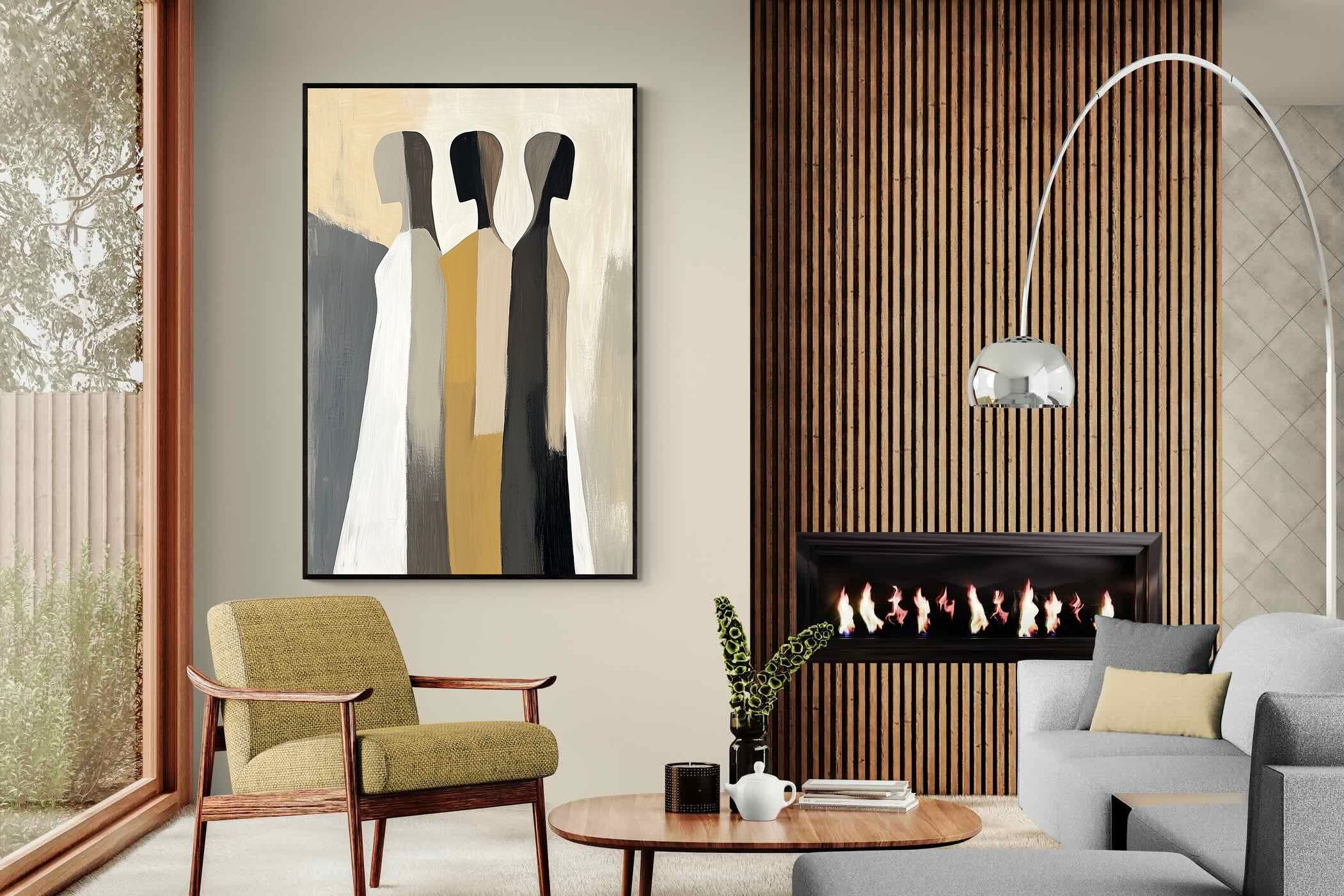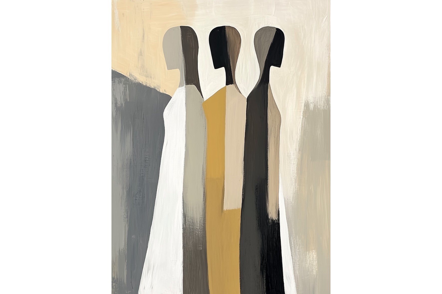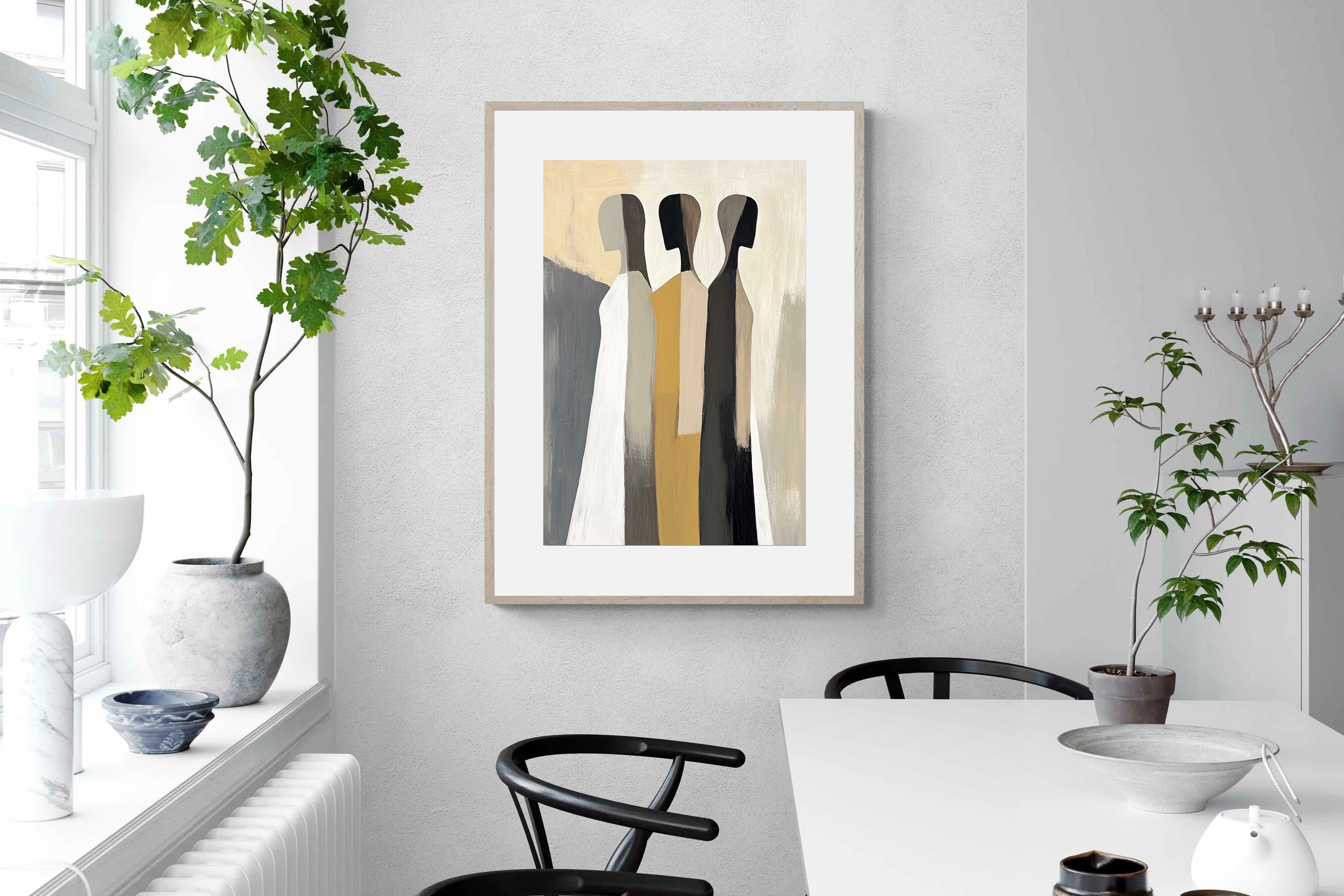 A striking abstract trio defined by clean vertical forms and a central band of warm gold. The contrast between deep blacks, soft whites and muted neutrals creates a balanced yet impactful composition. The simplicity of the figures allows texture and tone to take centre stage, making it ideal for modern interiors. Perfect for feature walls or refined living spaces, this piece delivers a strong, contemporary aesthetic with a subtle hint of warmth.