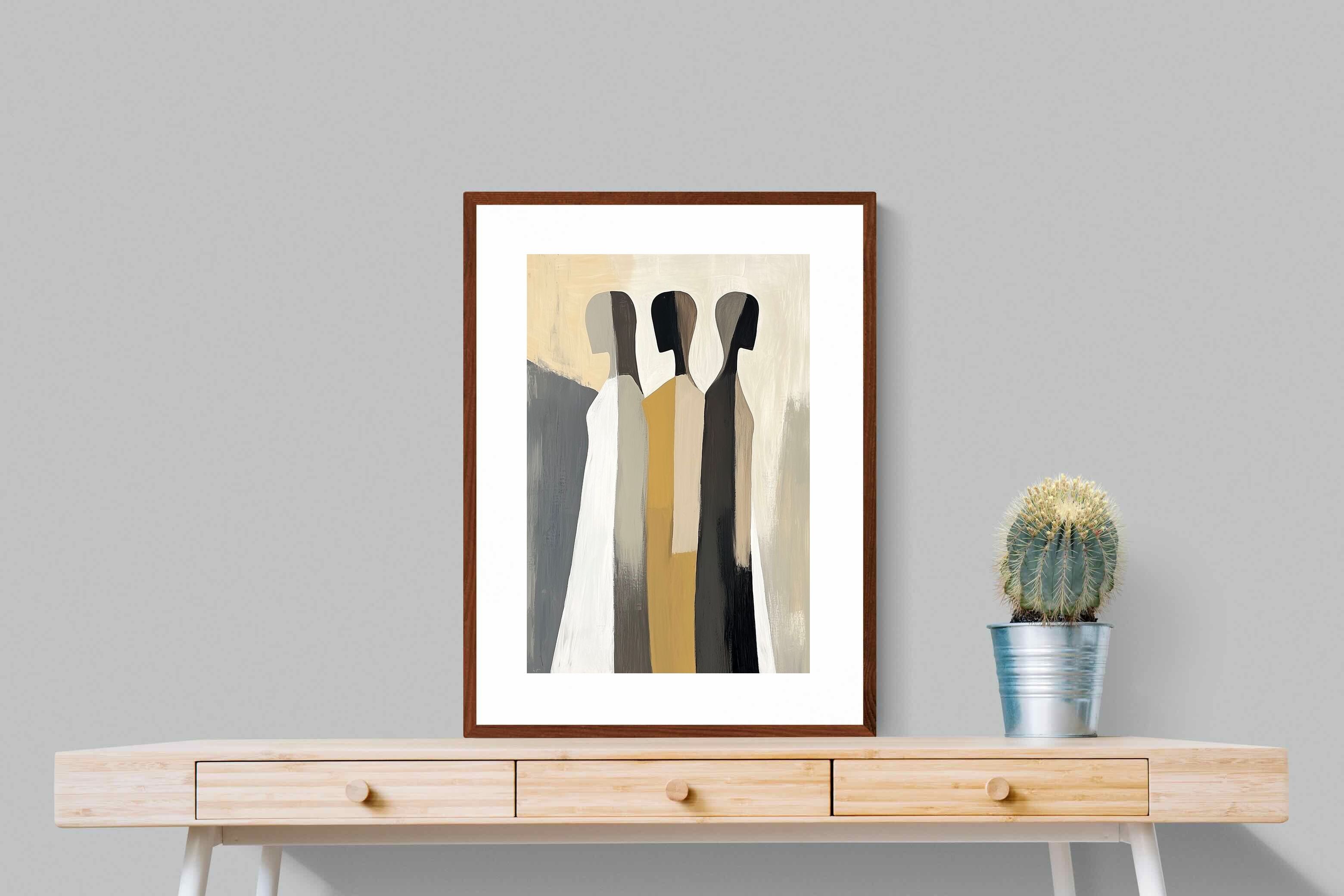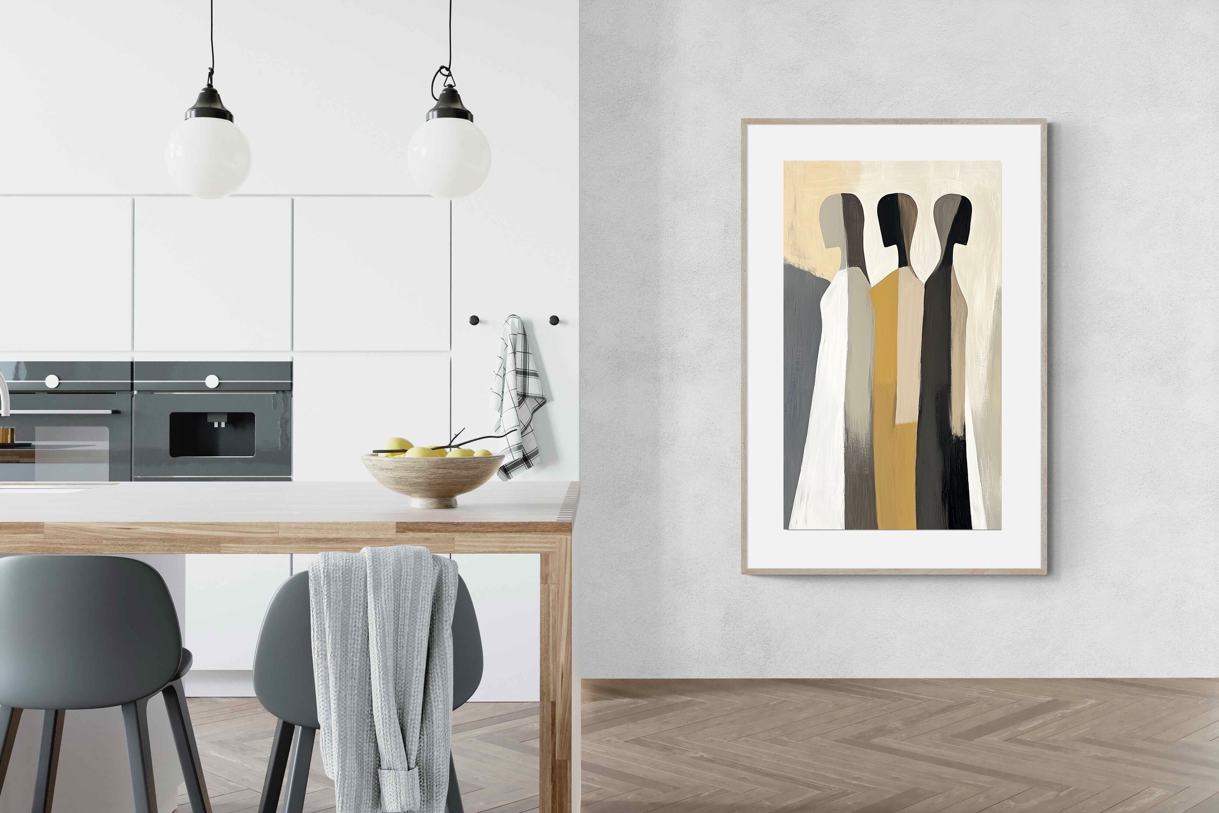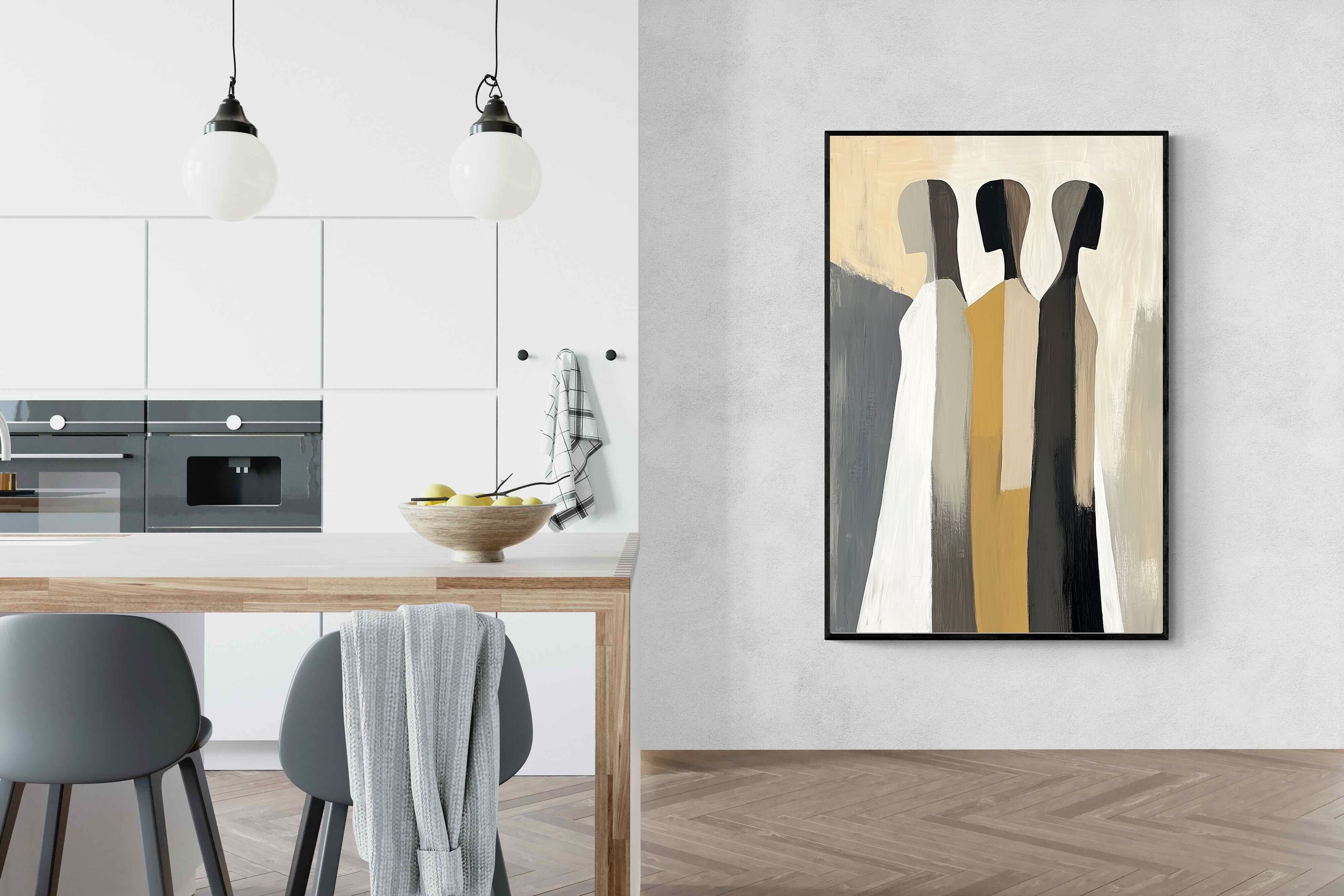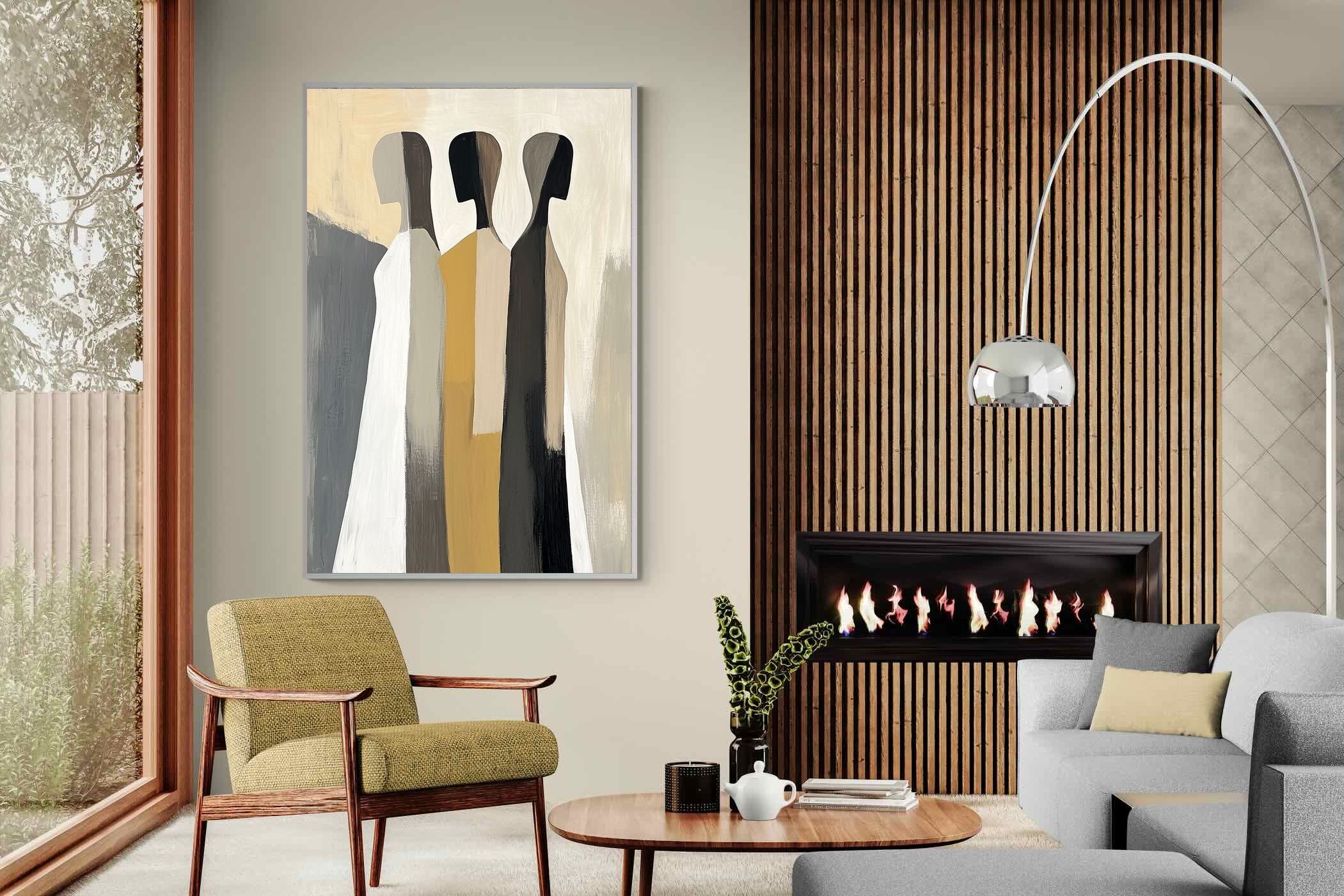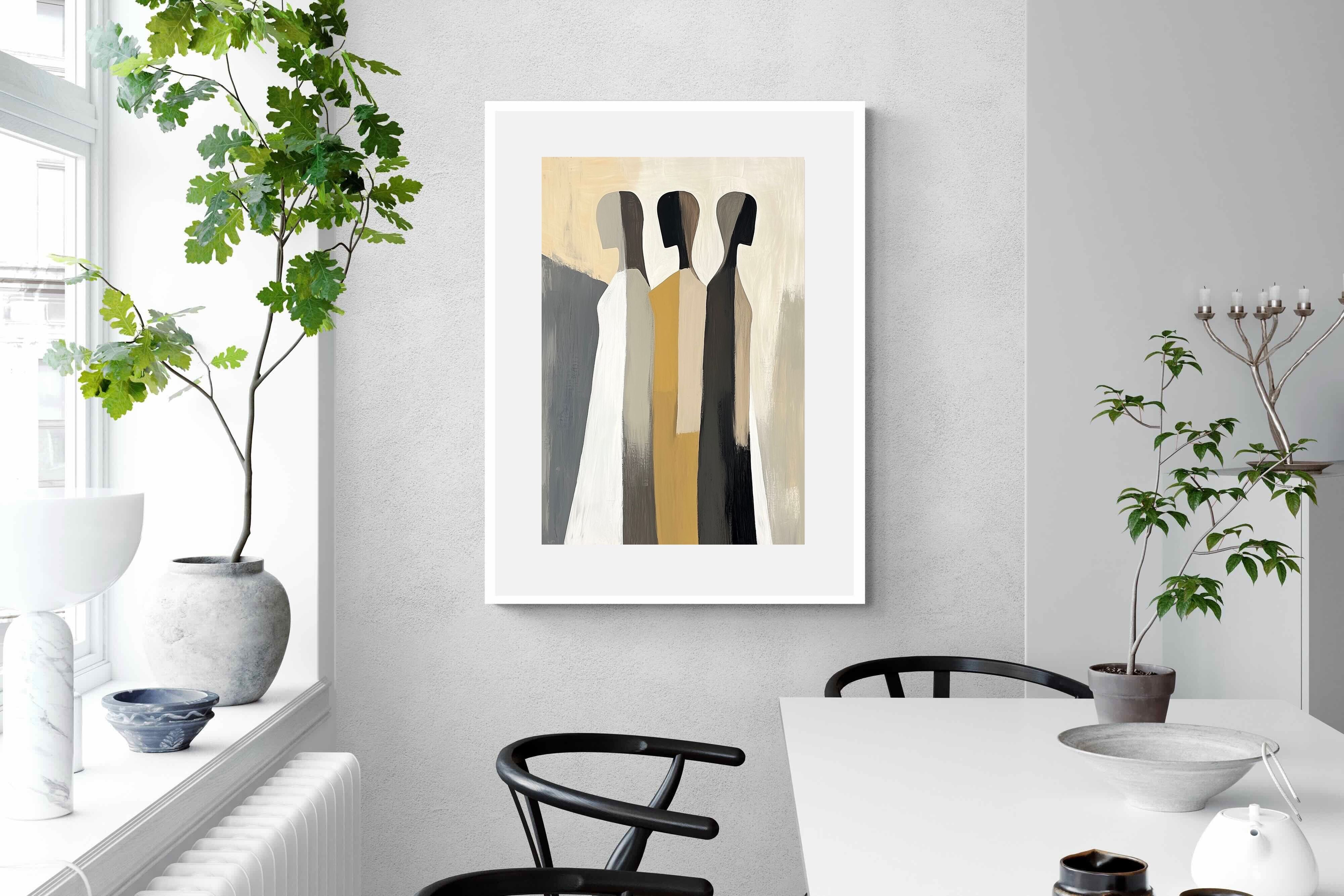 A striking abstract trio defined by clean vertical forms and a central band of warm gold. The contrast between deep blacks, soft whites and muted neutrals creates a balanced yet impactful composition. The simplicity of the figures allows texture and tone to take centre stage, making it ideal for modern interiors. Perfect for feature walls or refined living spaces, this piece delivers a strong, contemporary aesthetic with a subtle hint of warmth.