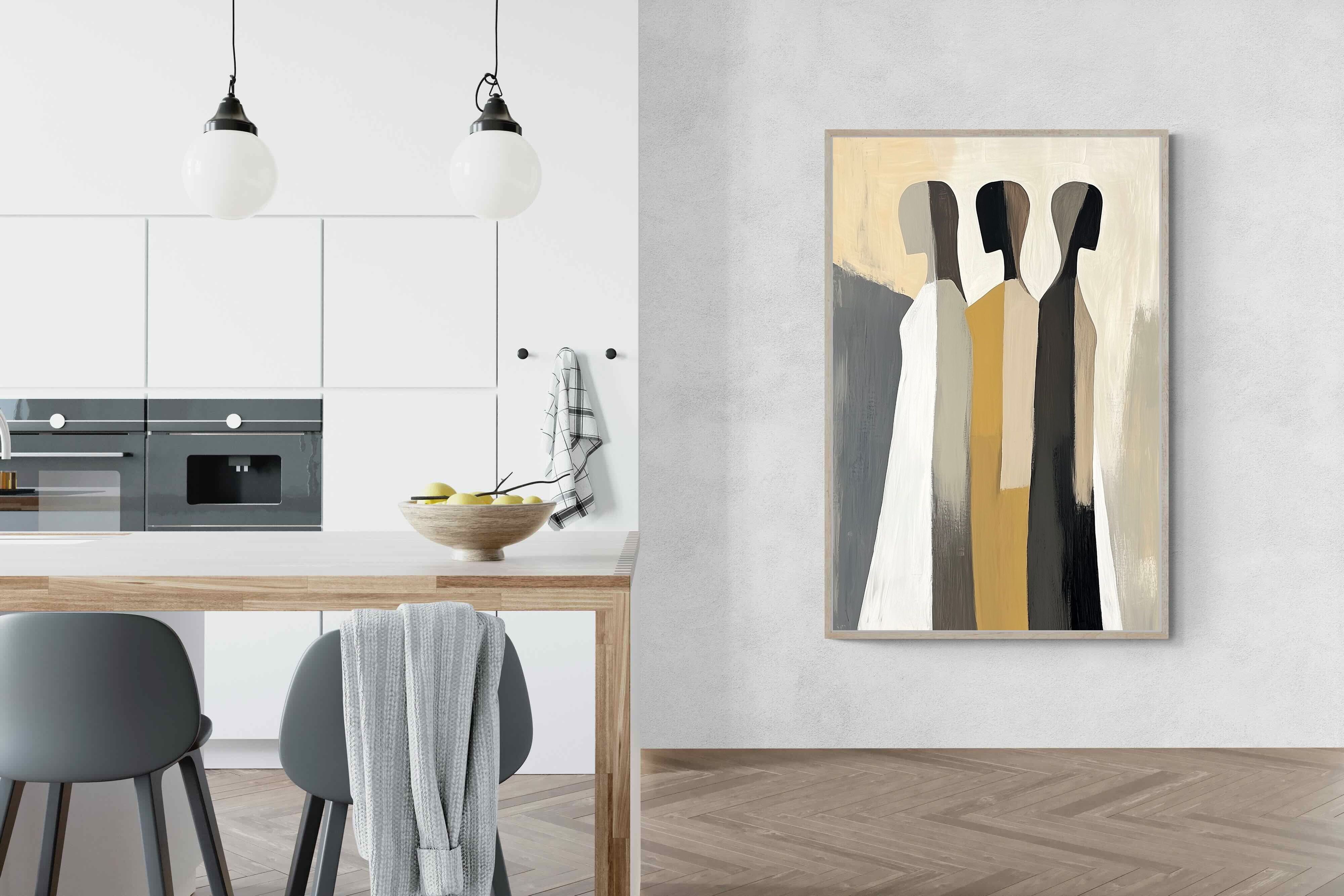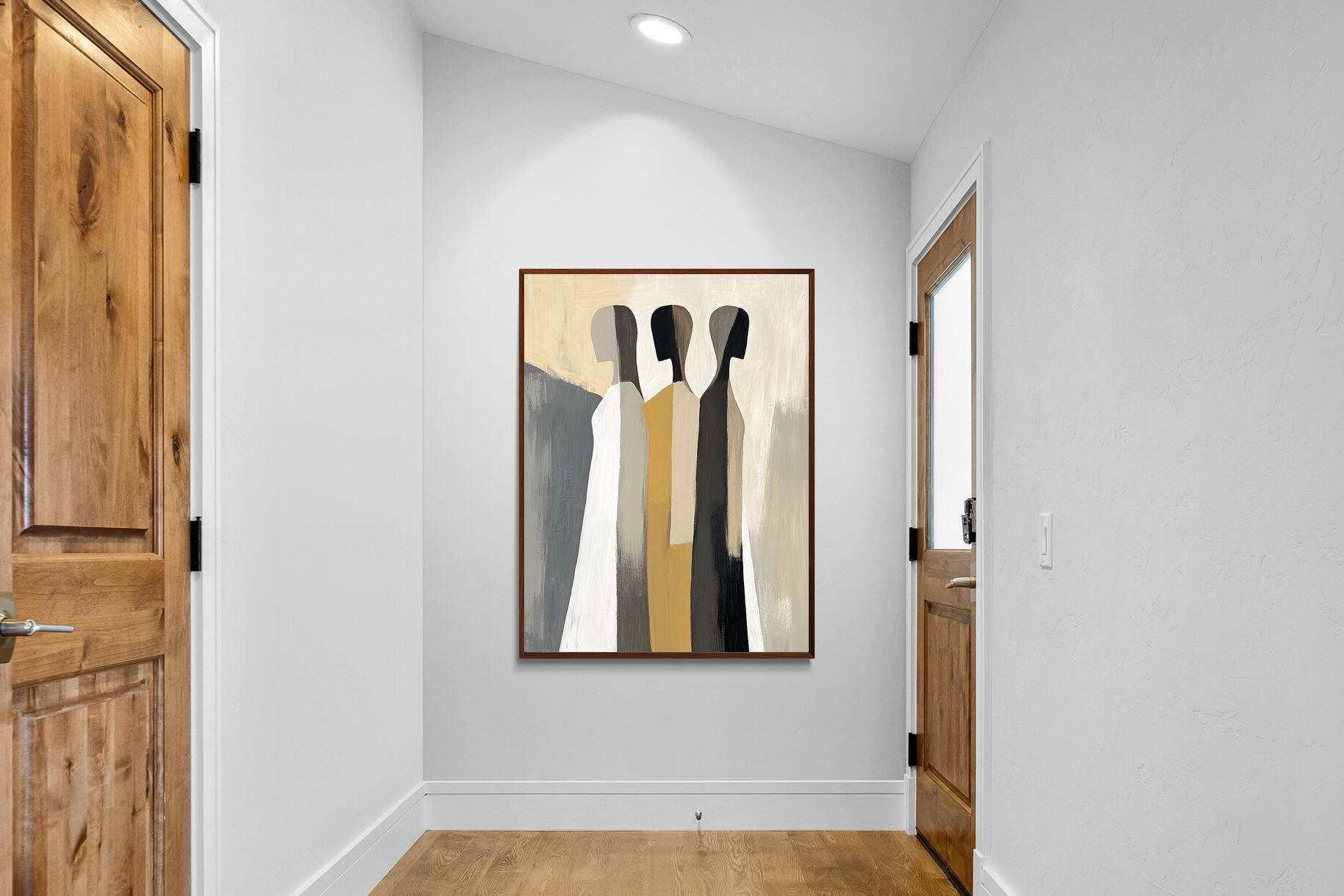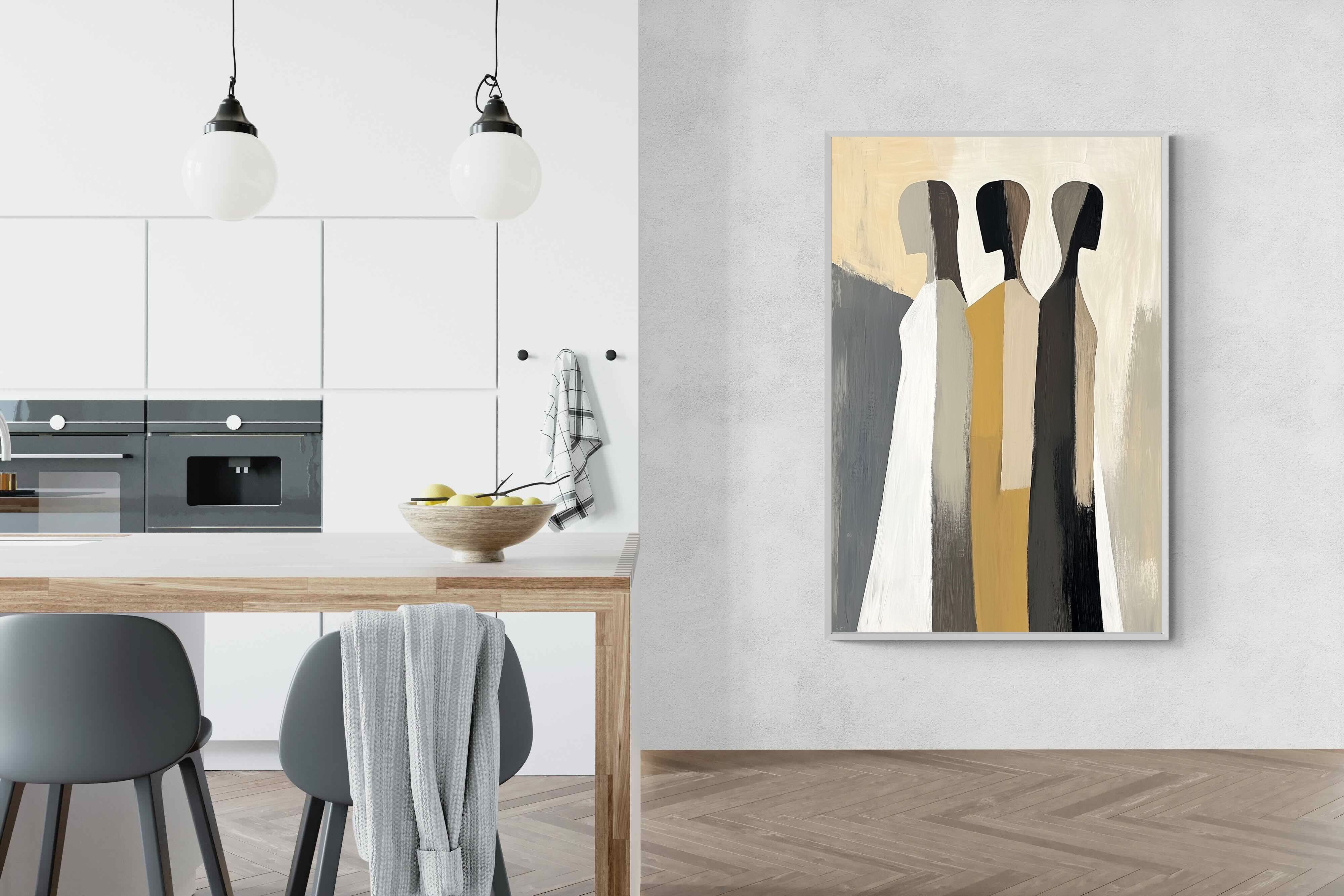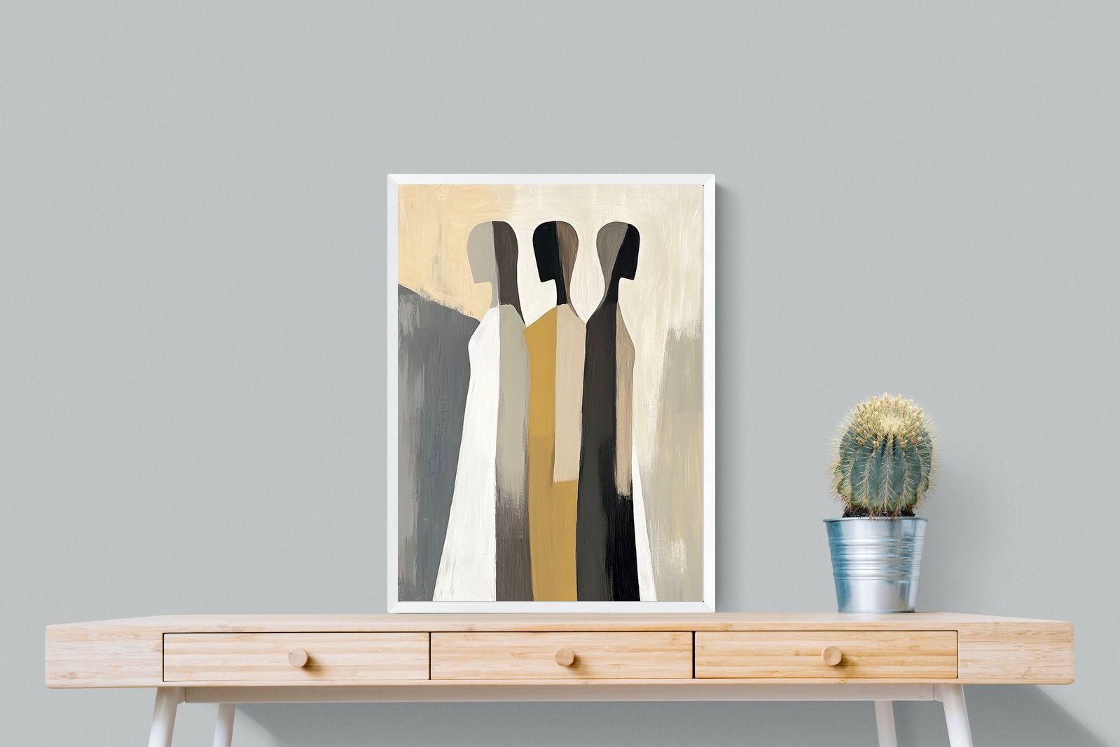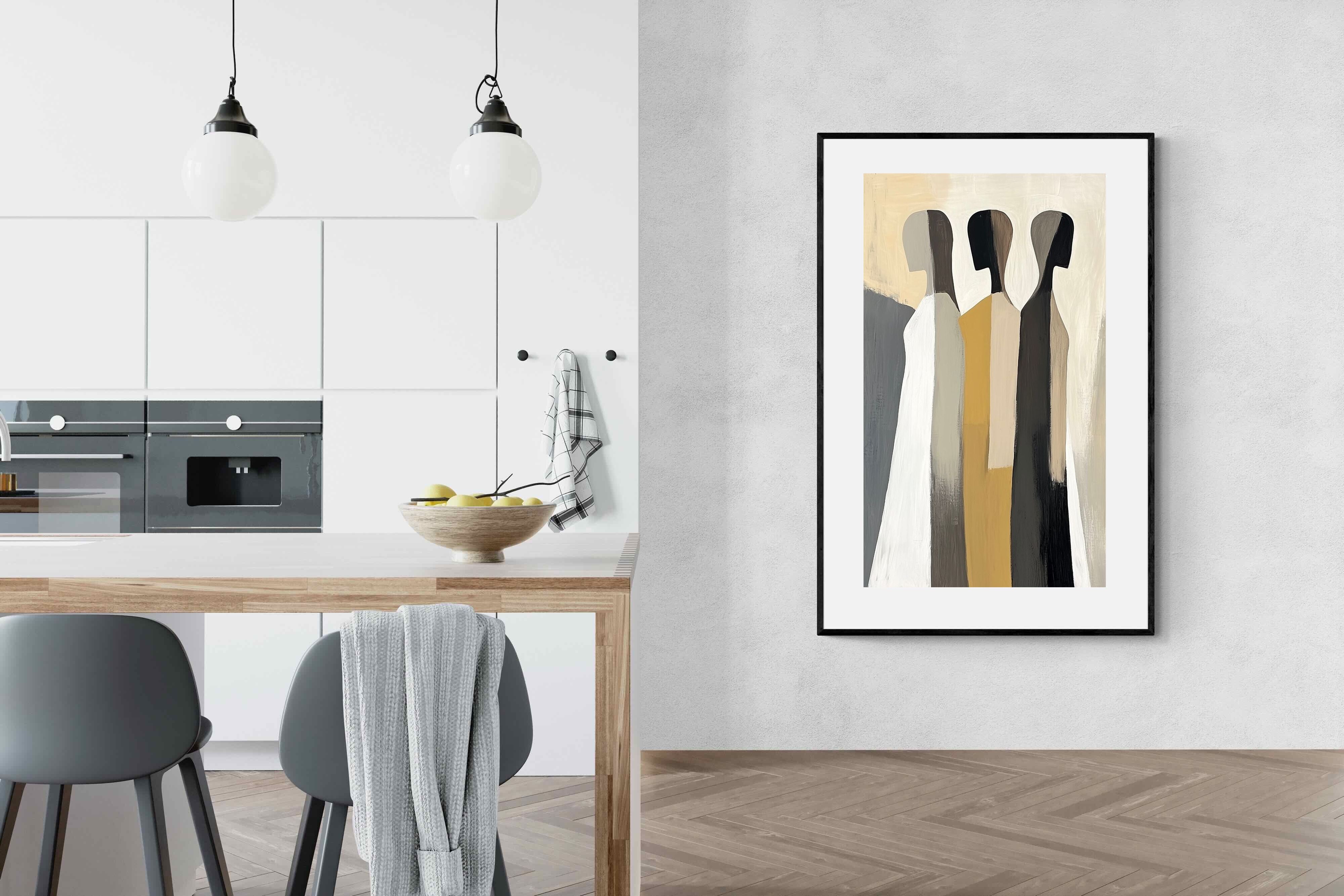 A striking abstract trio defined by clean vertical forms and a central band of warm gold. The contrast between deep blacks, soft whites and muted neutrals creates a balanced yet impactful composition. The simplicity of the figures allows texture and tone to take centre stage, making it ideal for modern interiors. Perfect for feature walls or refined living spaces, this piece delivers a strong, contemporary aesthetic with a subtle hint of warmth.