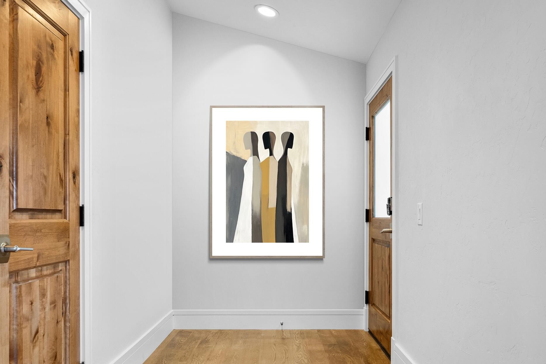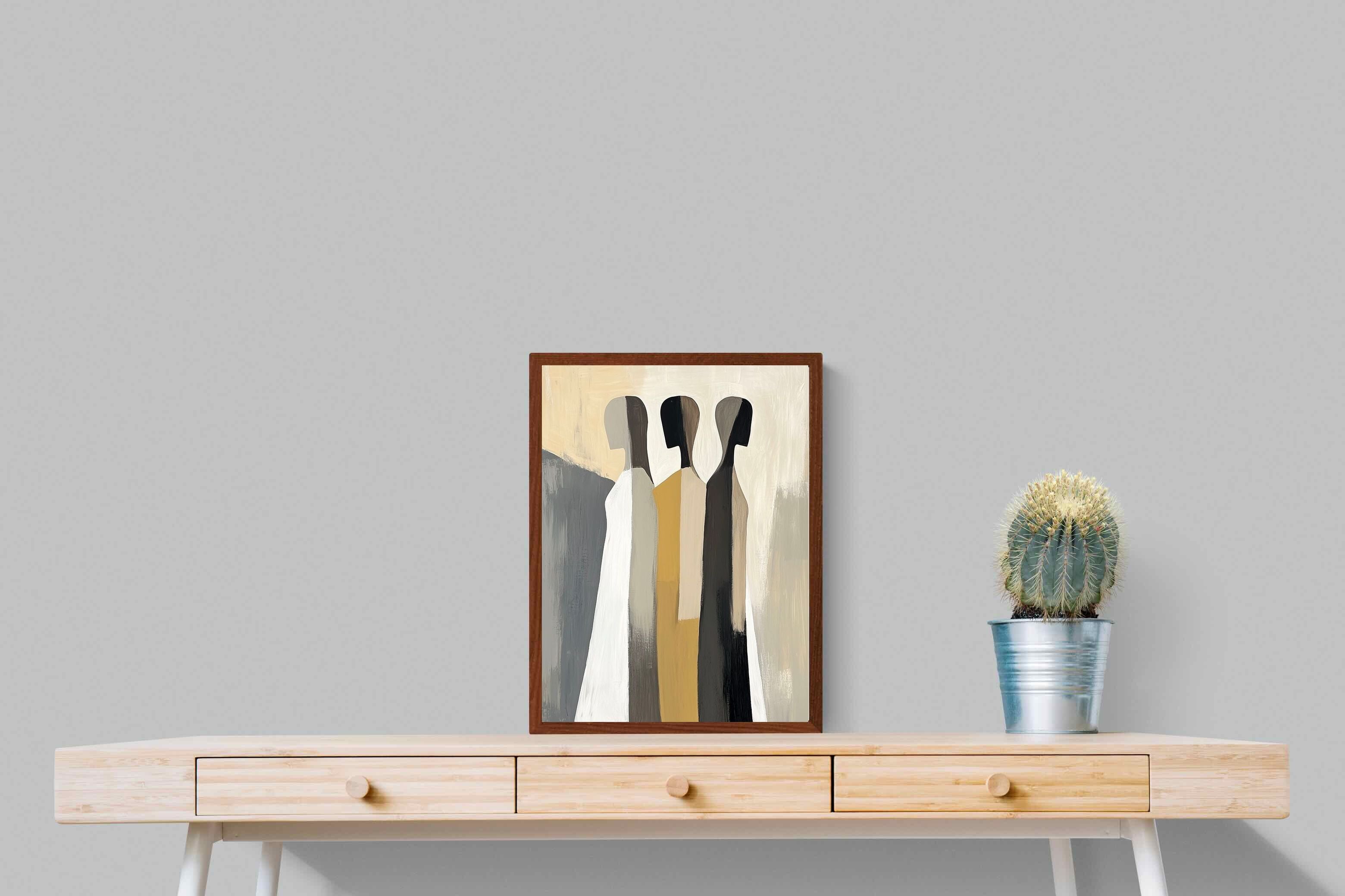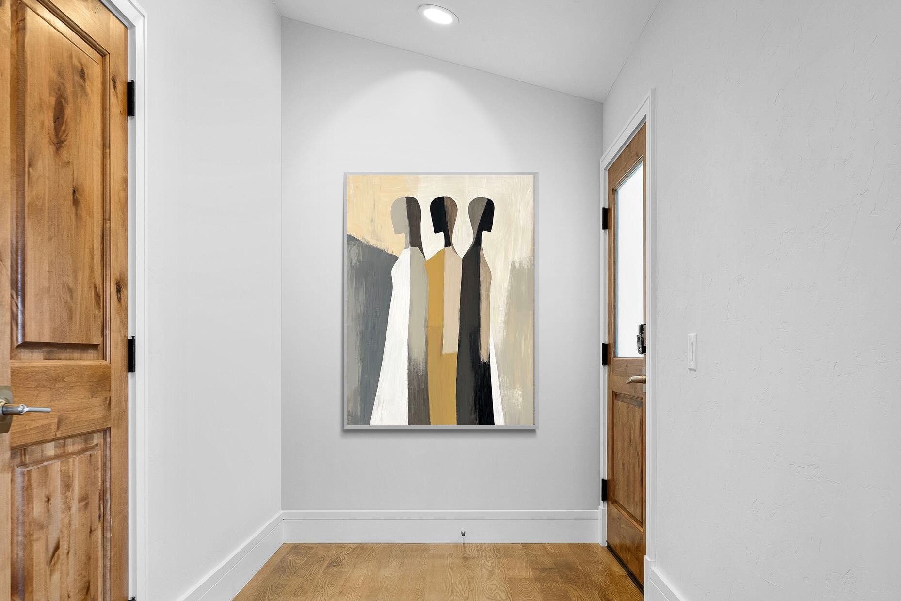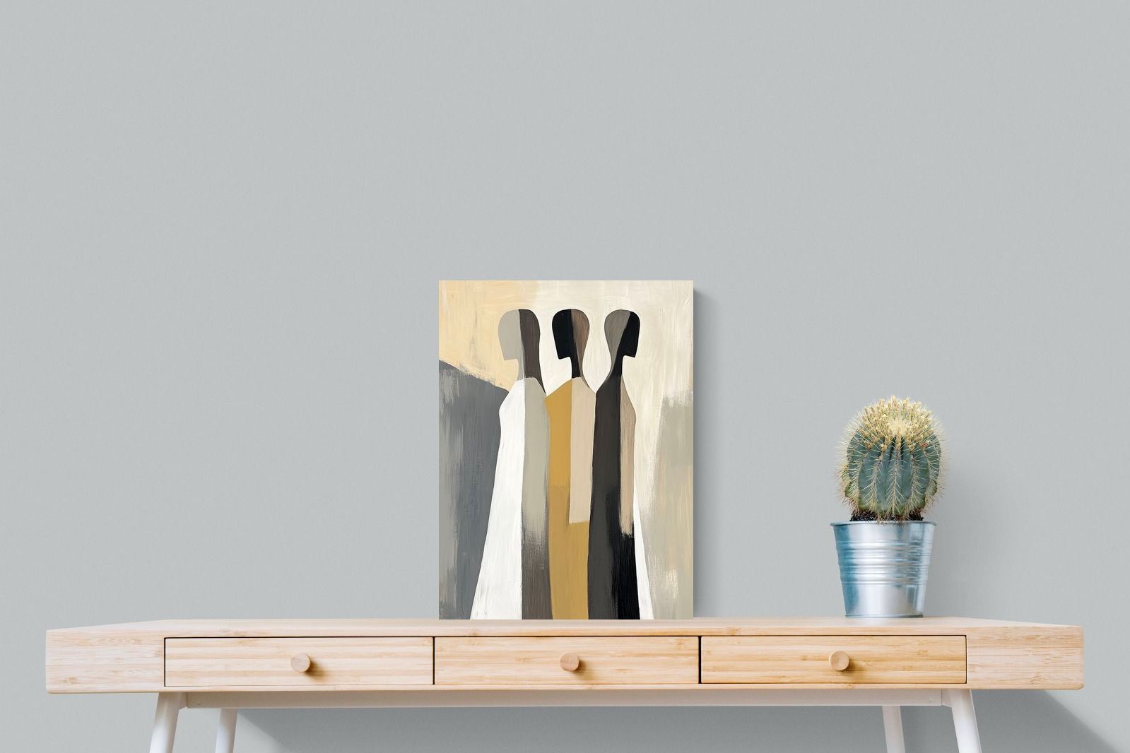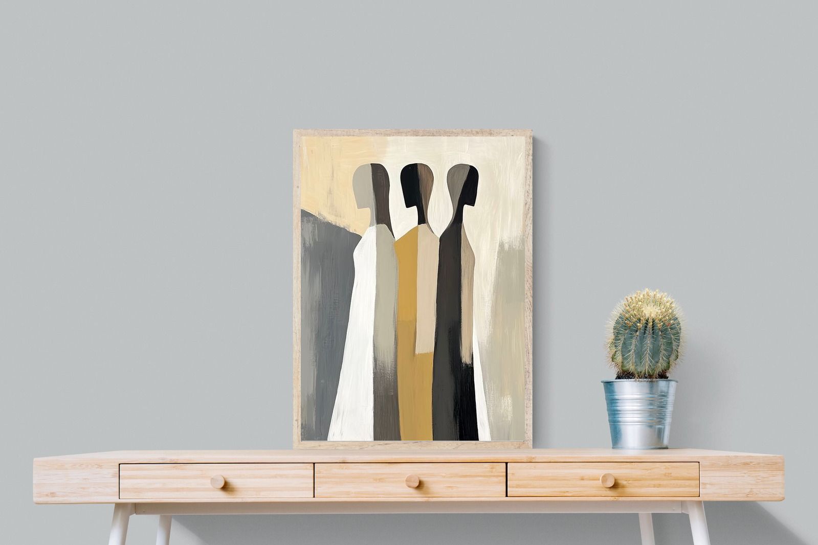 A striking abstract trio defined by clean vertical forms and a central band of warm gold. The contrast between deep blacks, soft whites and muted neutrals creates a balanced yet impactful composition. The simplicity of the figures allows texture and tone to take centre stage, making it ideal for modern interiors. Perfect for feature walls or refined living spaces, this piece delivers a strong, contemporary aesthetic with a subtle hint of warmth.