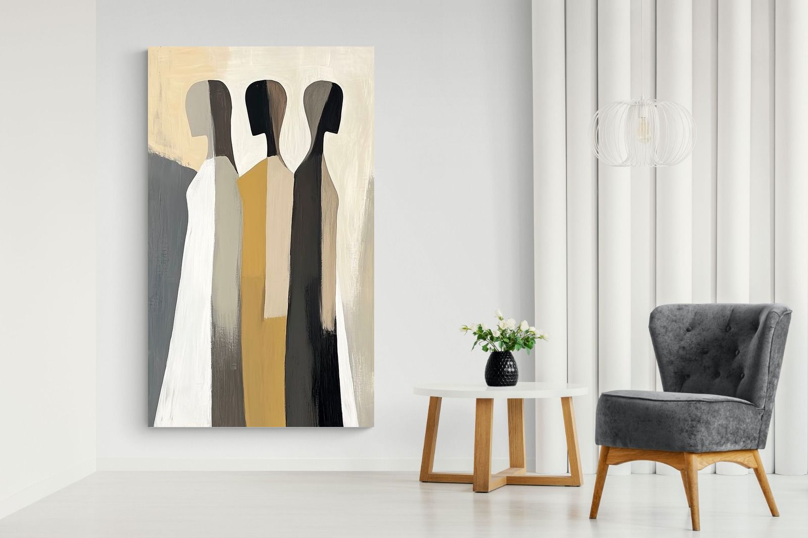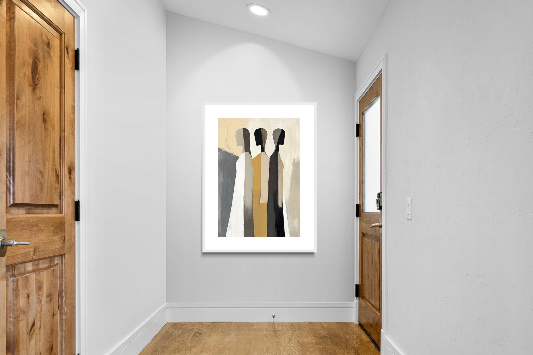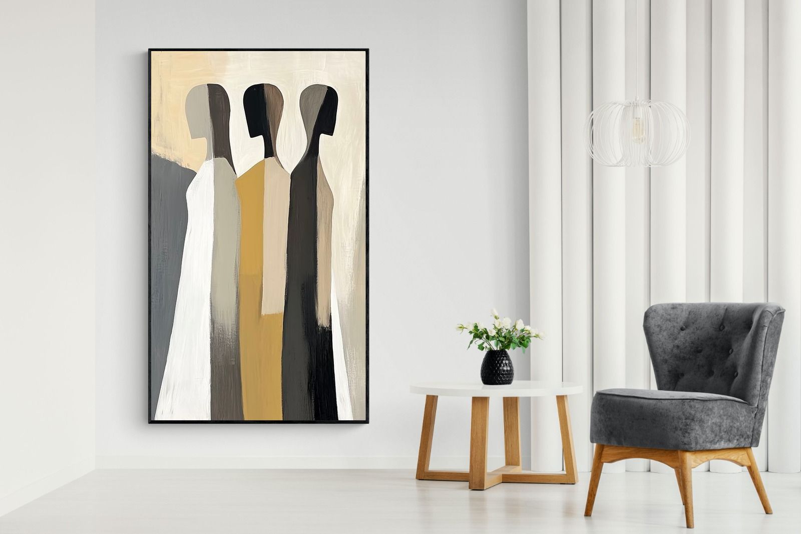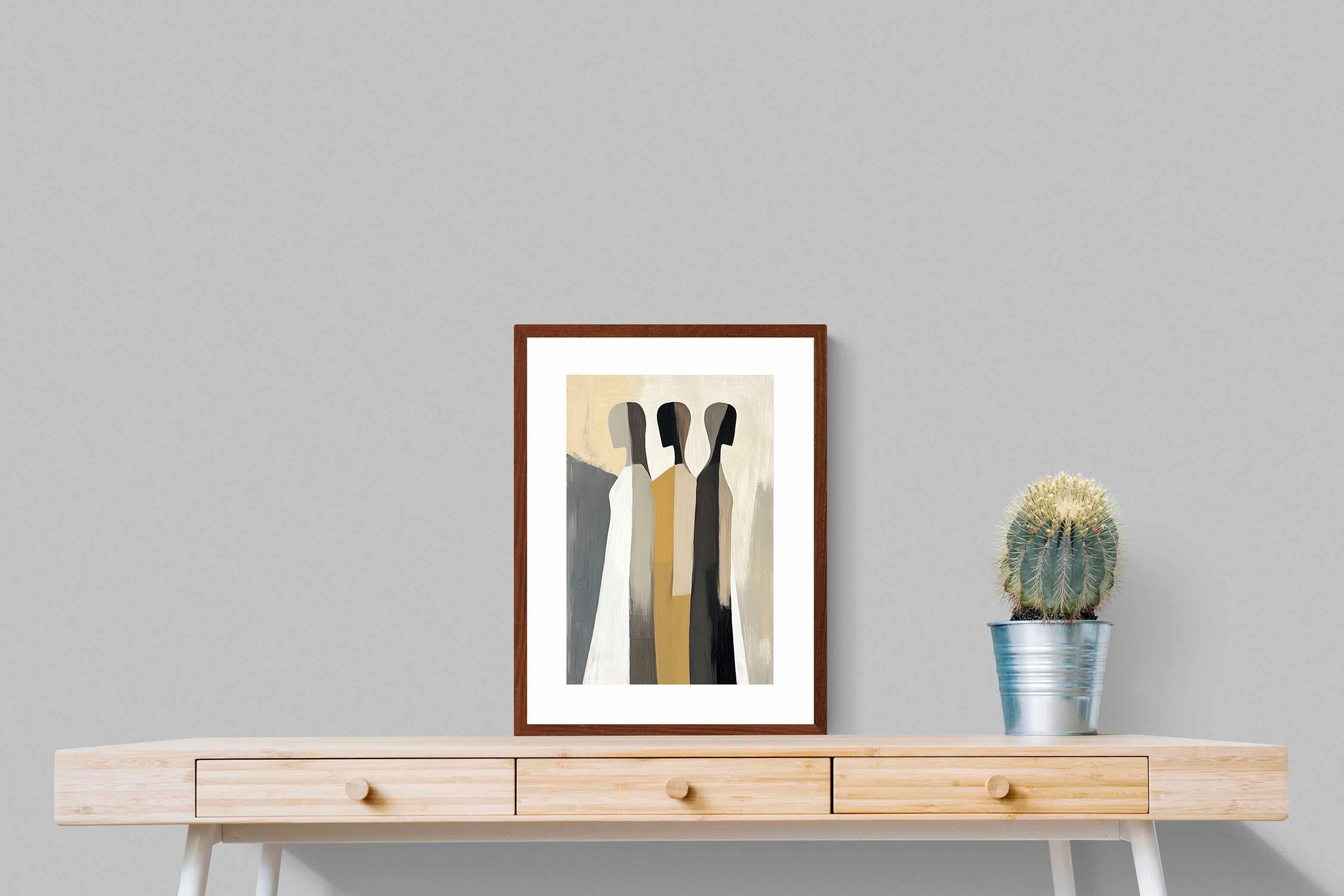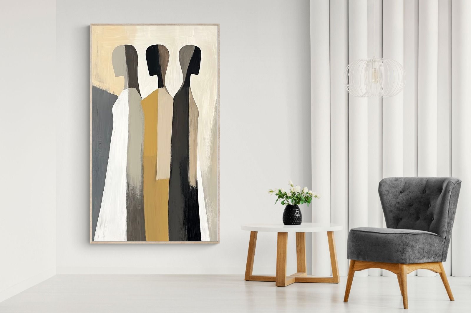A striking abstract trio defined by clean vertical forms and a central band of warm gold. The contrast between deep blacks, soft whites and muted neutrals creates a balanced yet impactful composition. The simplicity of the figures allows texture and tone to take centre stage, making it ideal for modern interiors. Perfect for feature walls or refined living spaces, this piece delivers a strong, contemporary aesthetic with a subtle hint of warmth.