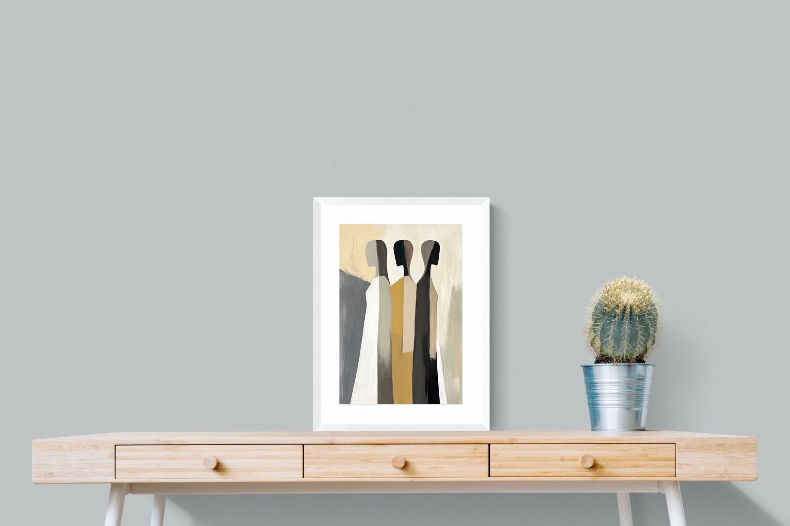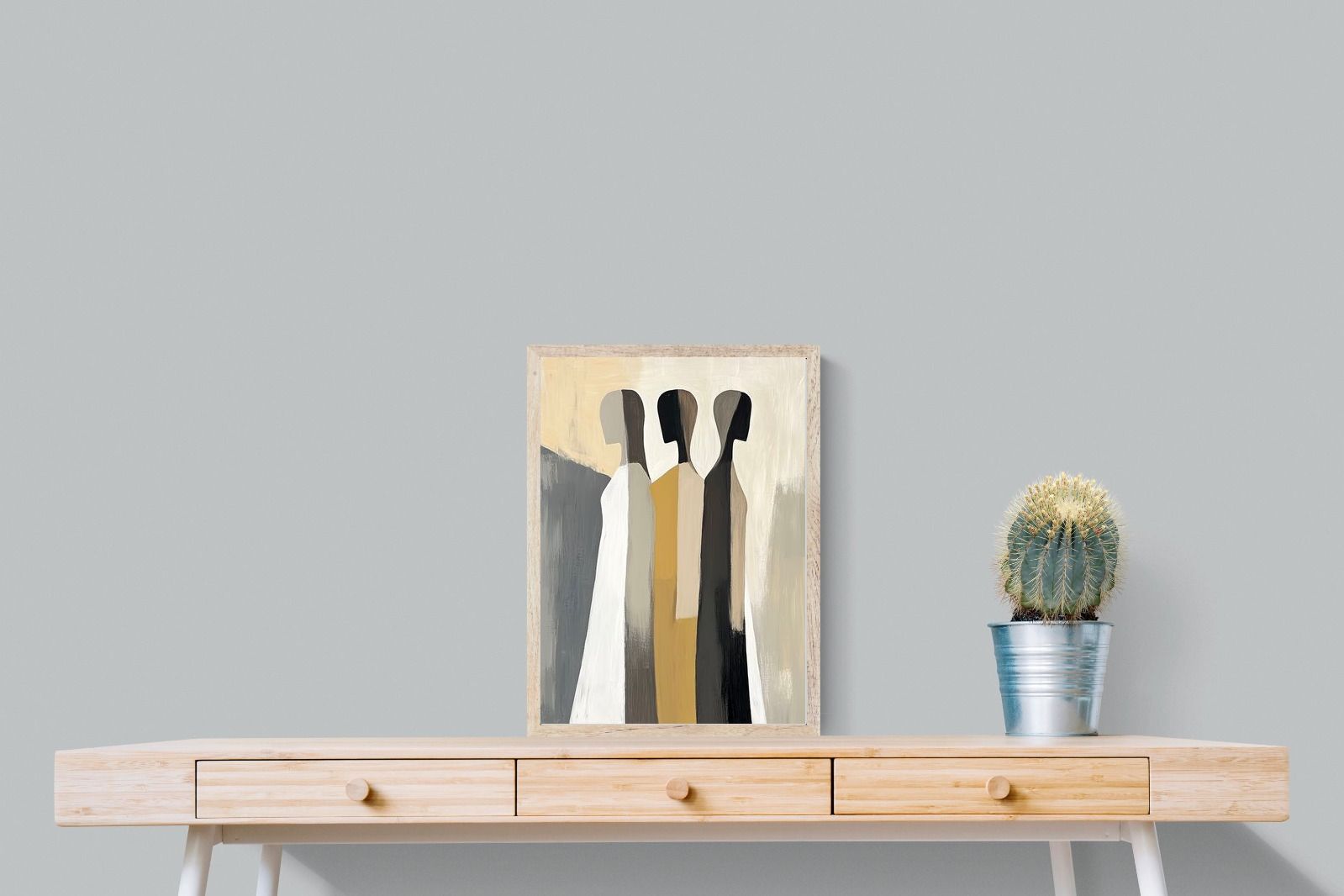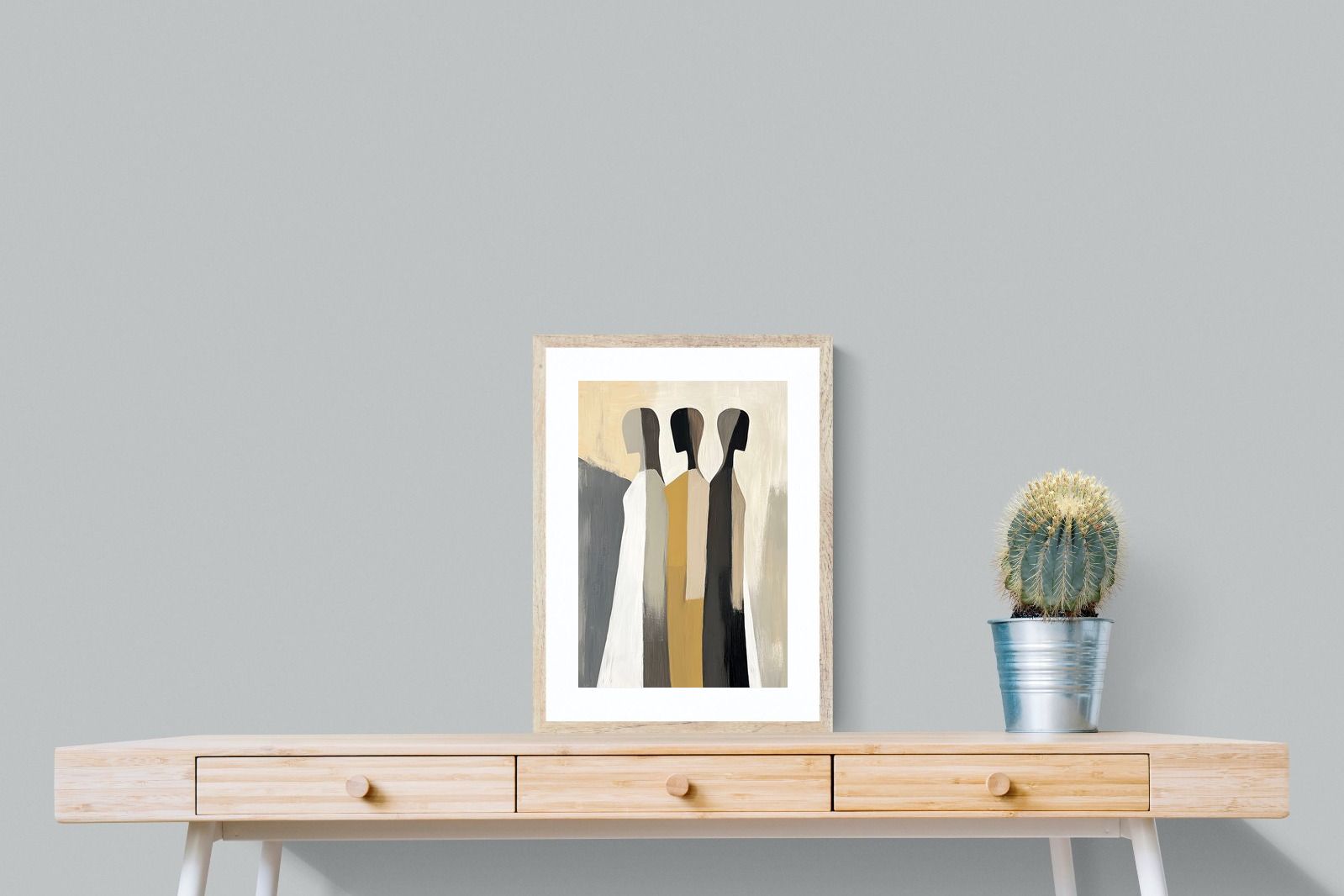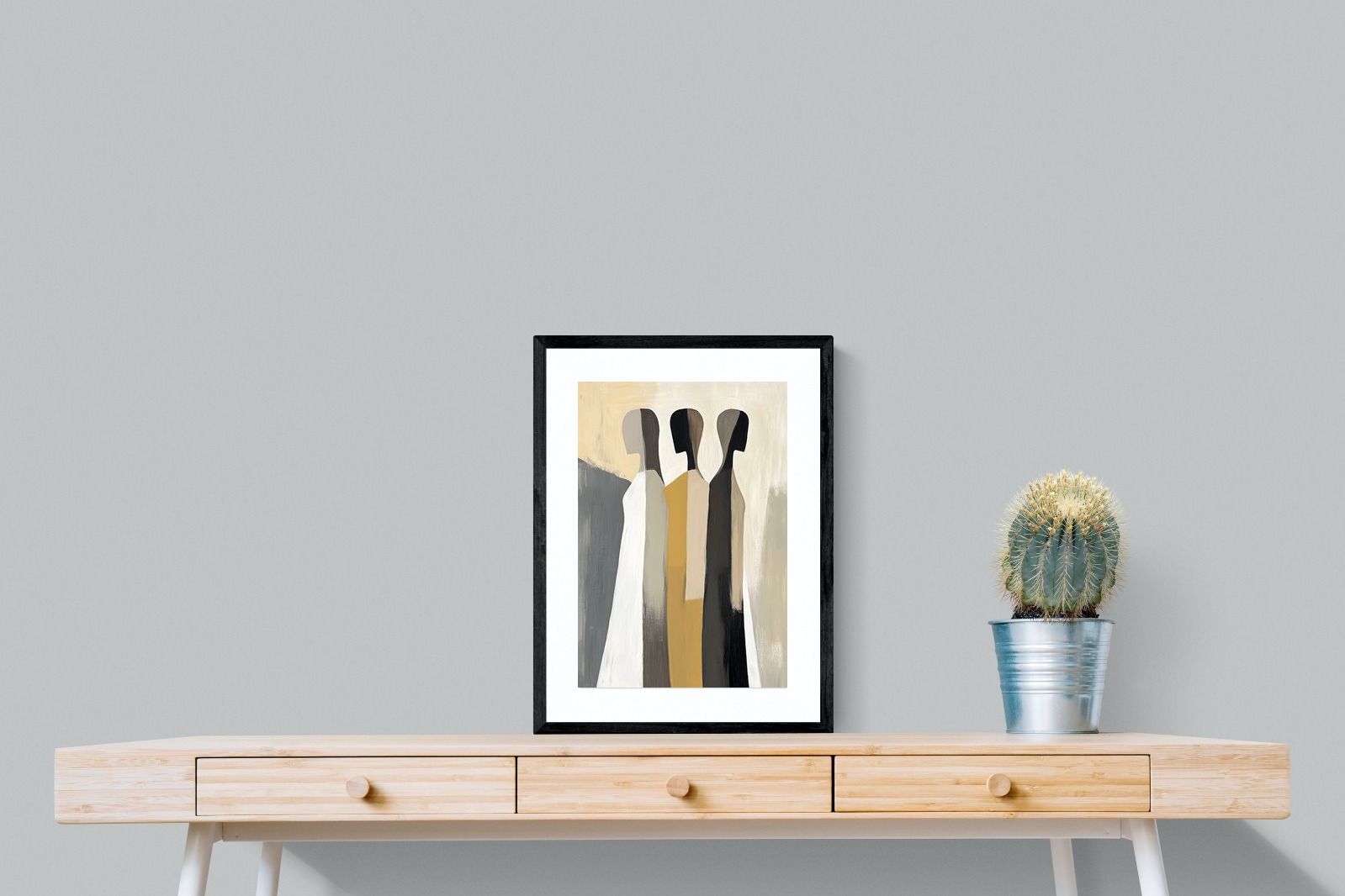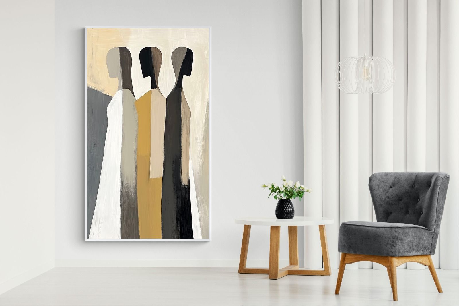 A striking abstract trio defined by clean vertical forms and a central band of warm gold. The contrast between deep blacks, soft whites and muted neutrals creates a balanced yet impactful composition. The simplicity of the figures allows texture and tone to take centre stage, making it ideal for modern interiors. Perfect for feature walls or refined living spaces, this piece delivers a strong, contemporary aesthetic with a subtle hint of warmth.
