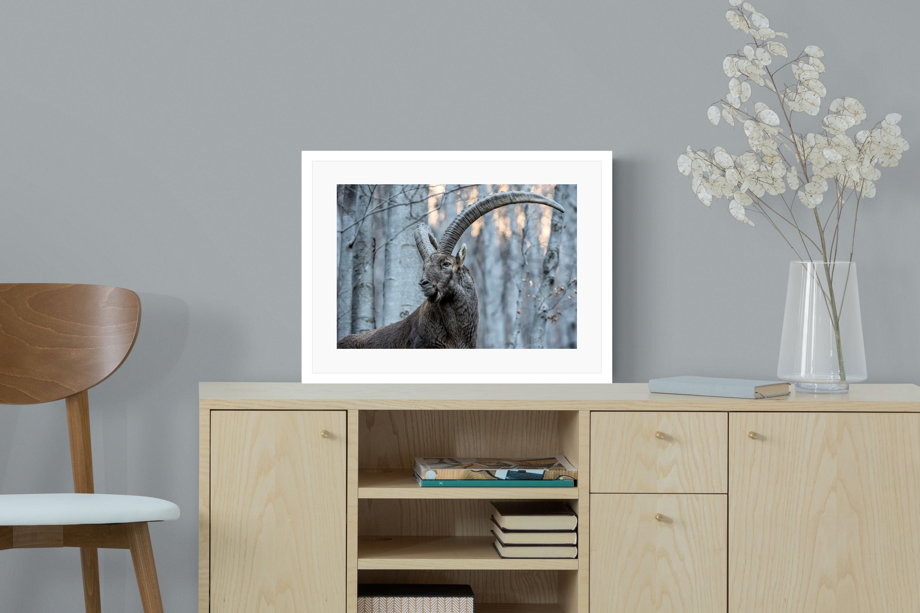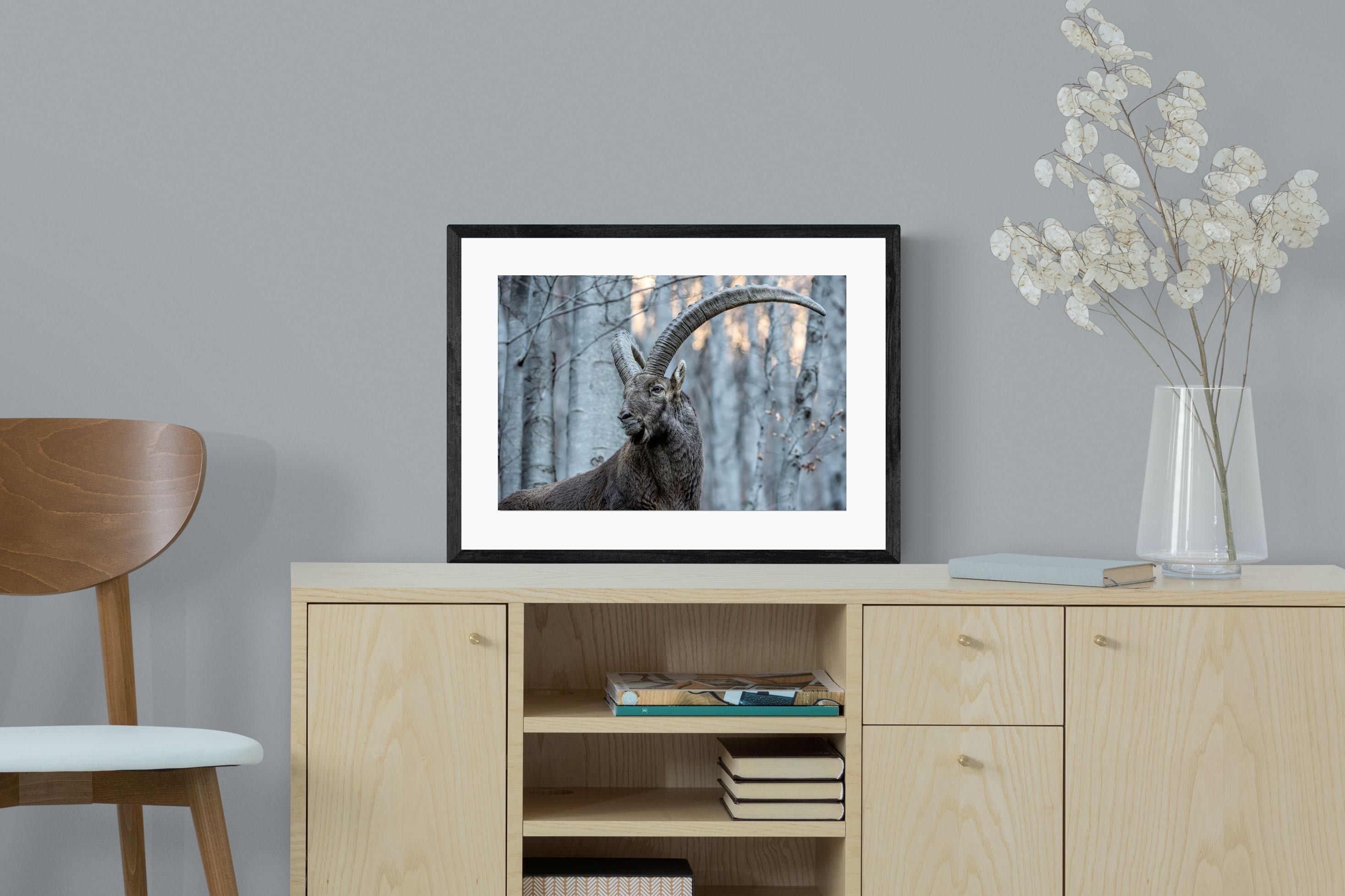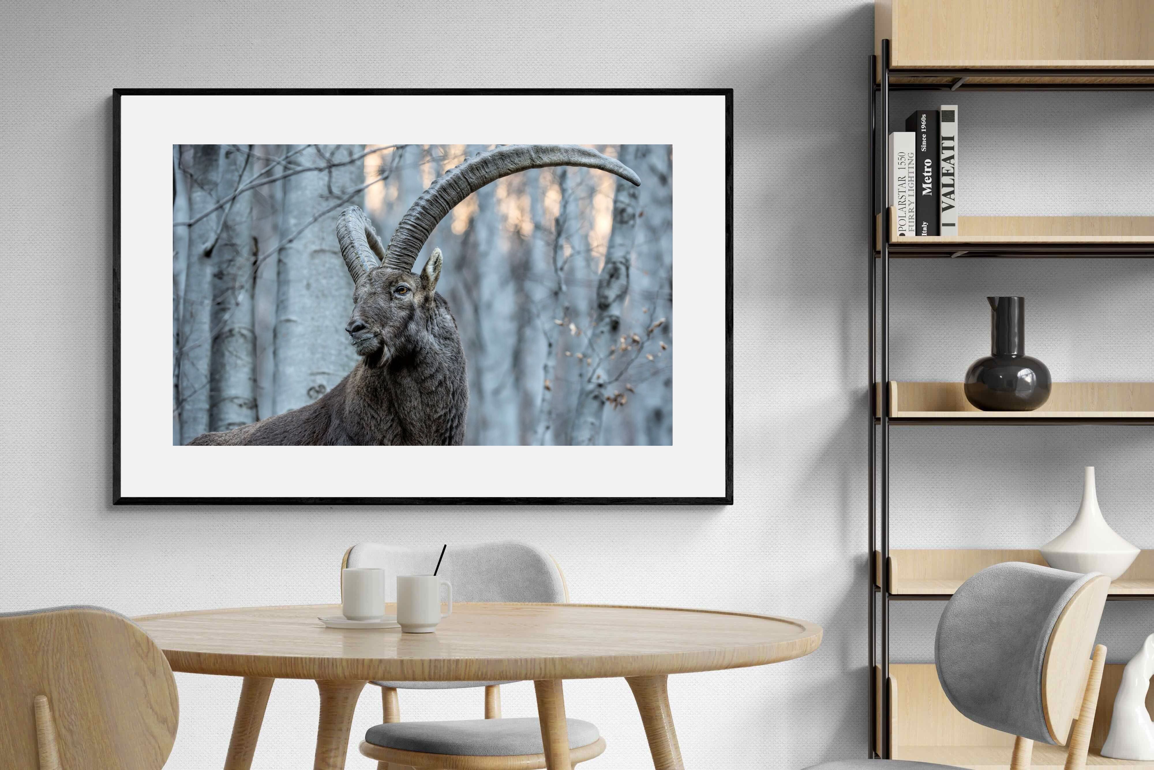This striking wildlife photograph captures the commanding presence of an Alpine ibex, its immense curved horns arching dramatically above a rugged mountain forest backdrop. The subtle winter tones and powerful composition highlight the animal’s strength, elegance and resilience in its natural habitat. Perfect for nature-inspired interiors, lodges or contemporary homes, this artwork brings a sense of wilderness, quiet power and refined natural beauty to any wall.