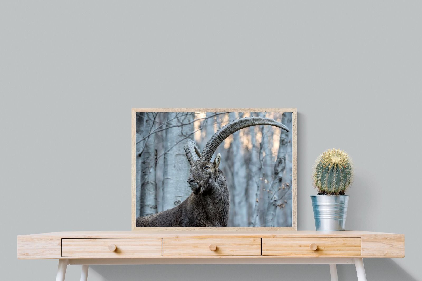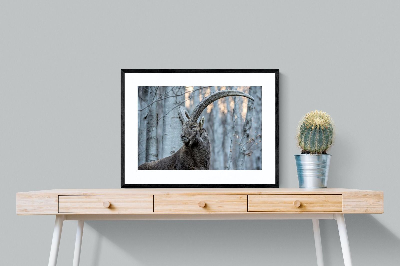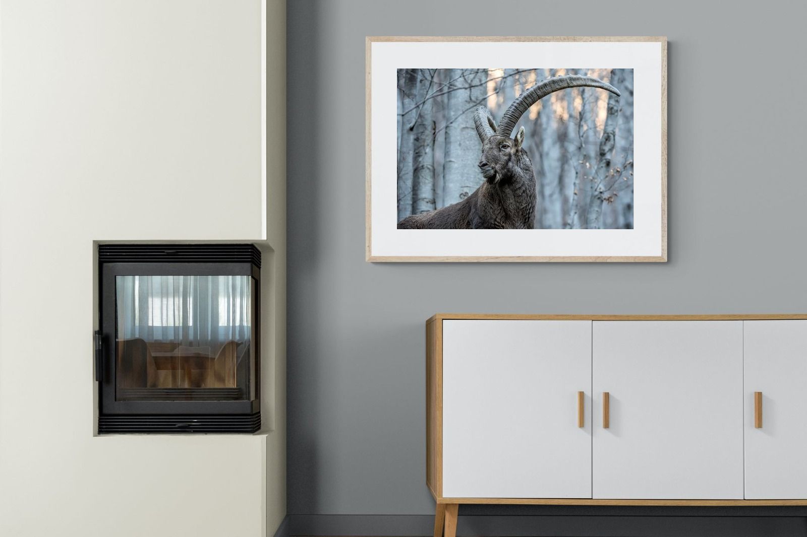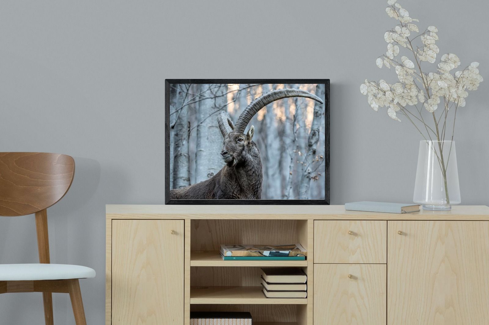 This striking wildlife photograph captures the commanding presence of an Alpine ibex, its immense curved horns arching dramatically above a rugged mountain forest backdrop. The subtle winter tones and powerful composition highlight the animal’s strength, elegance and resilience in its natural habitat. Perfect for nature-inspired interiors, lodges or contemporary homes, this artwork brings a sense of wilderness, quiet power and refined natural beauty to any wall.