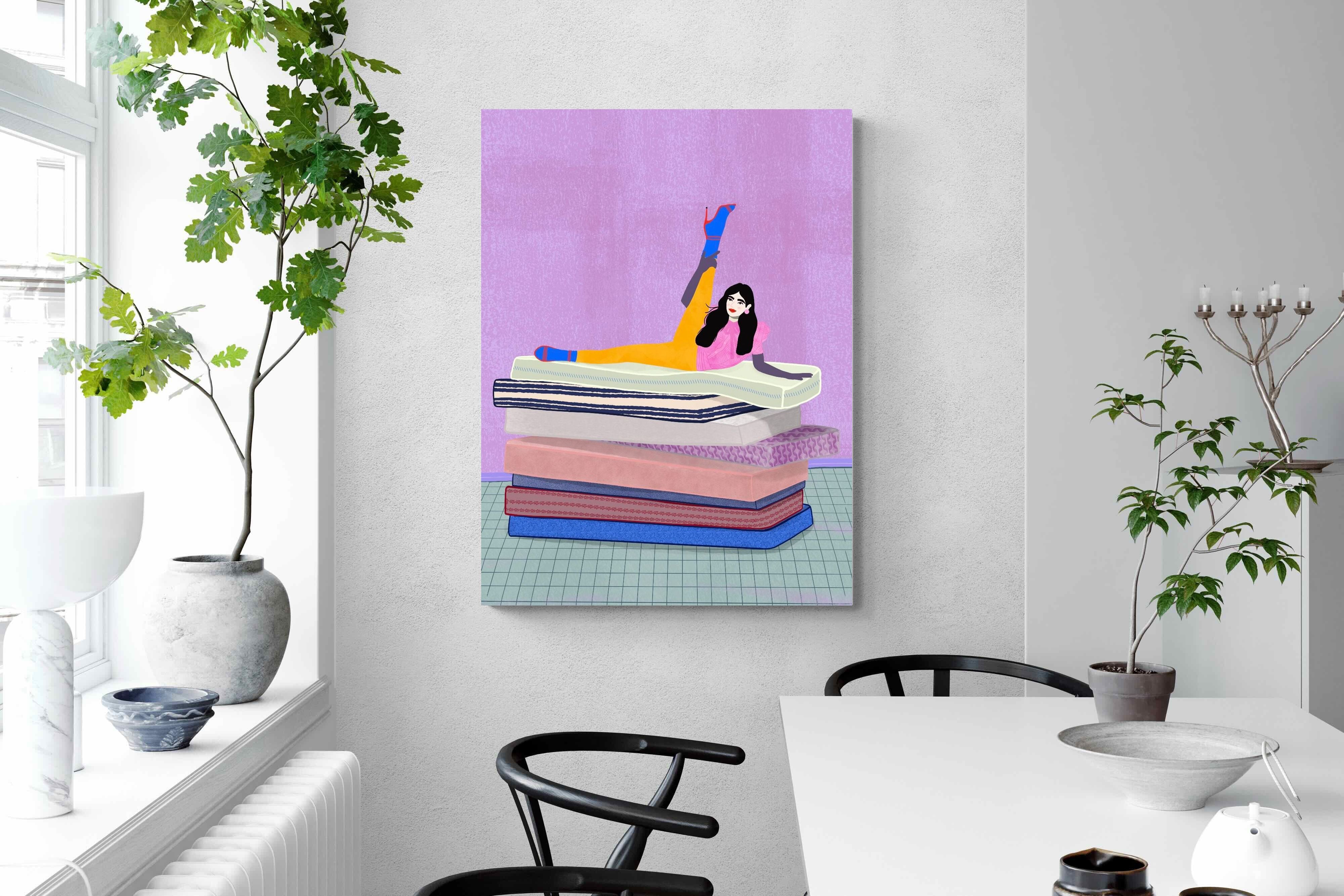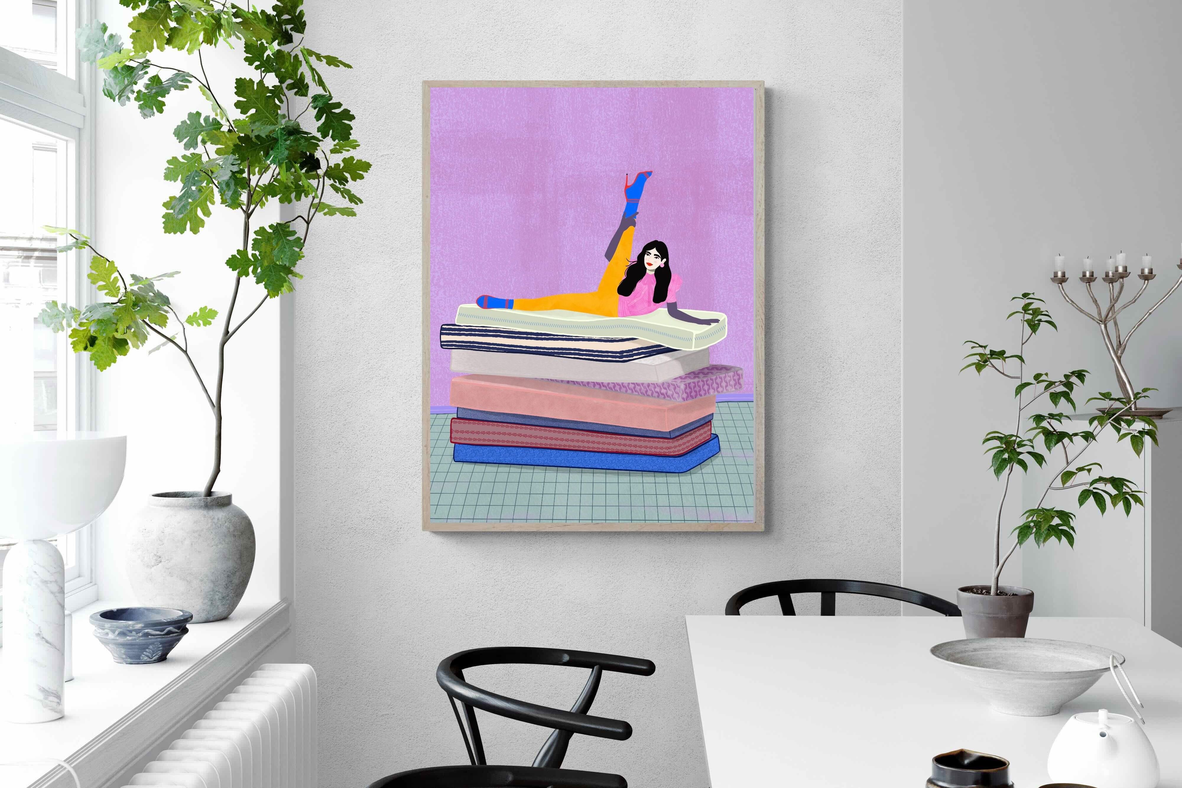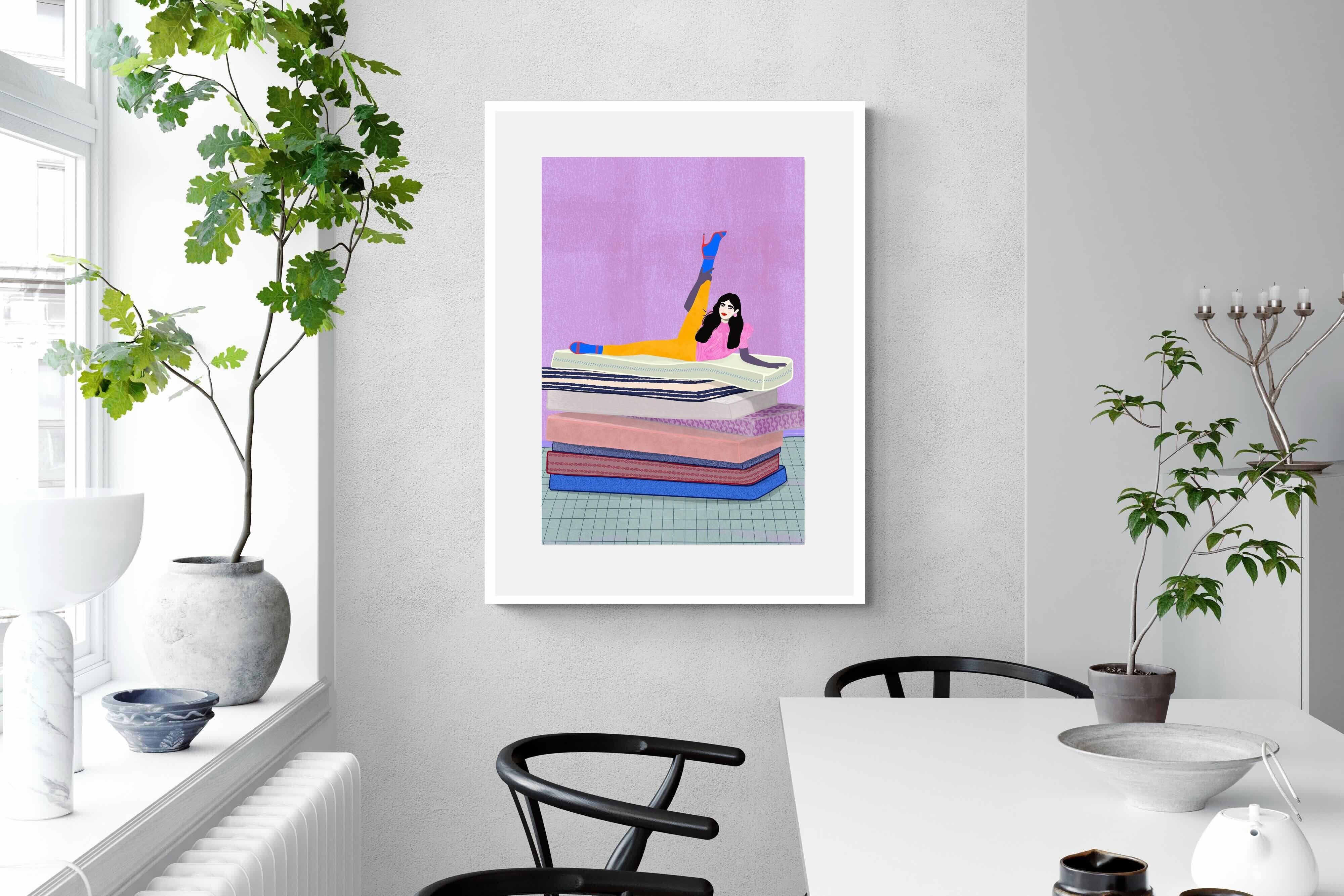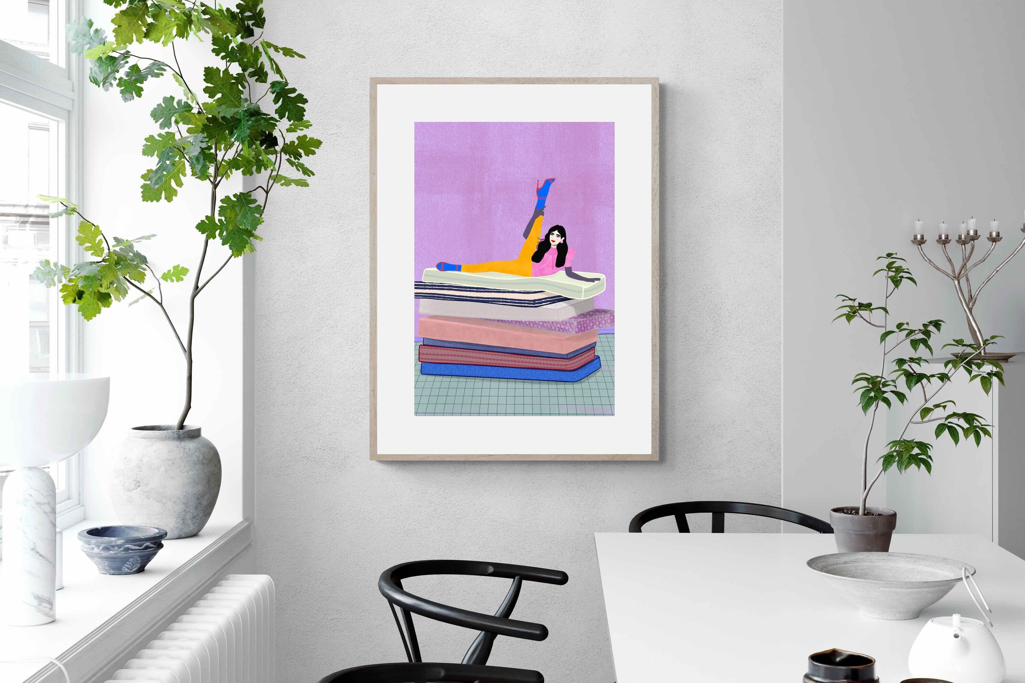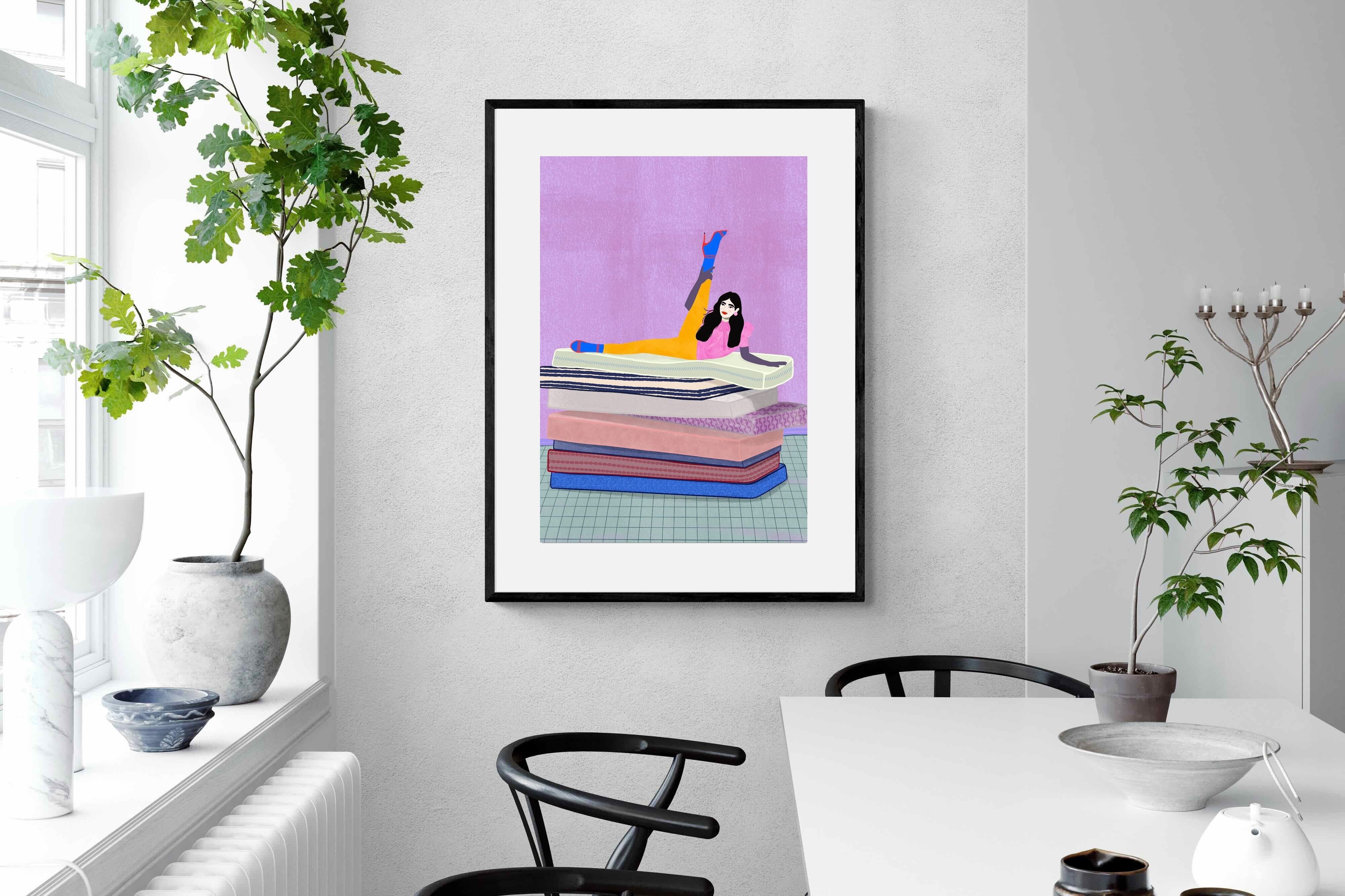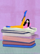 Playful and empowering, this colourful illustration turns a simple stretch into a statement. A relaxed figure reclines on stacked mattresses, with bright mustard leggings and cobalt socks popping against a lavender wash. It’s perfect for a home gym, Pilates studio, creative office, or a fun bedroom where you want personality without clutter. Looks brilliant as a framed print or canvas in modern, eclectic, or retro-inspired interiors with a quiet wink.