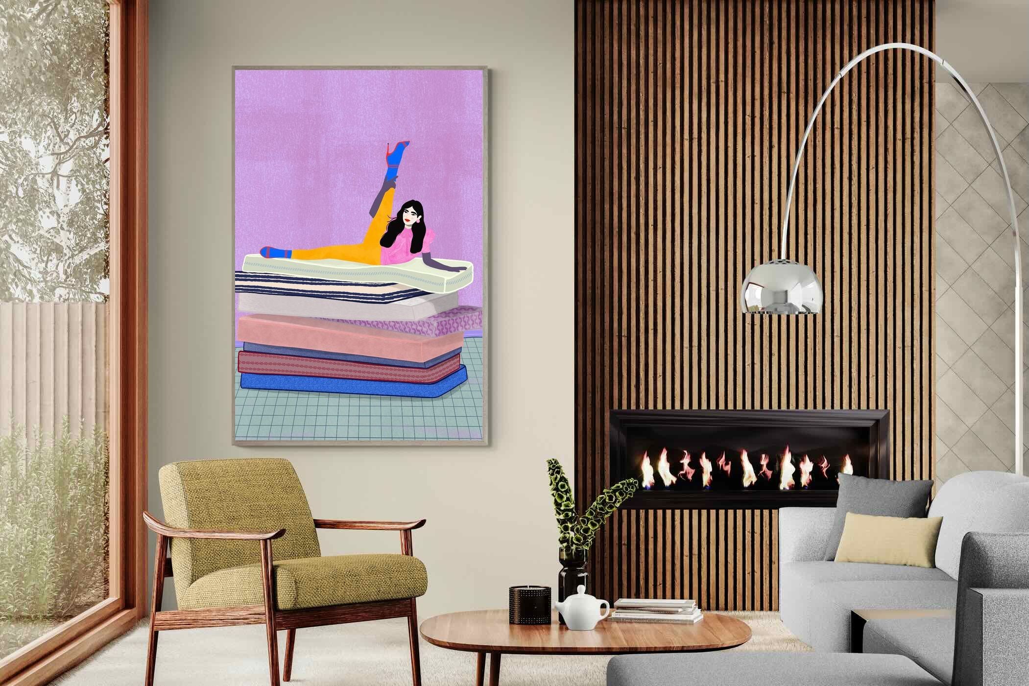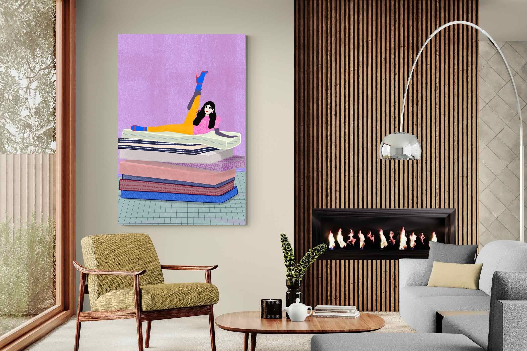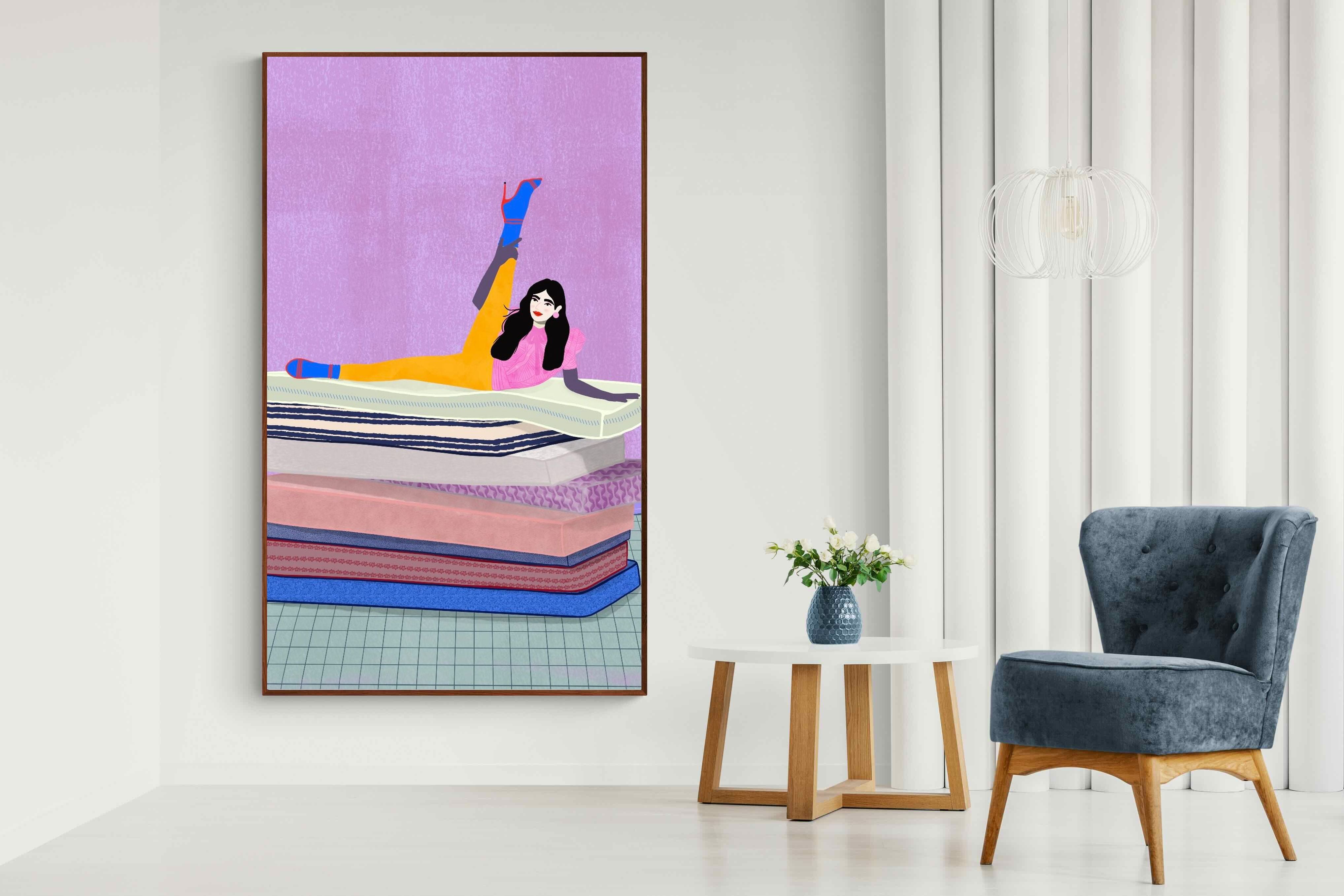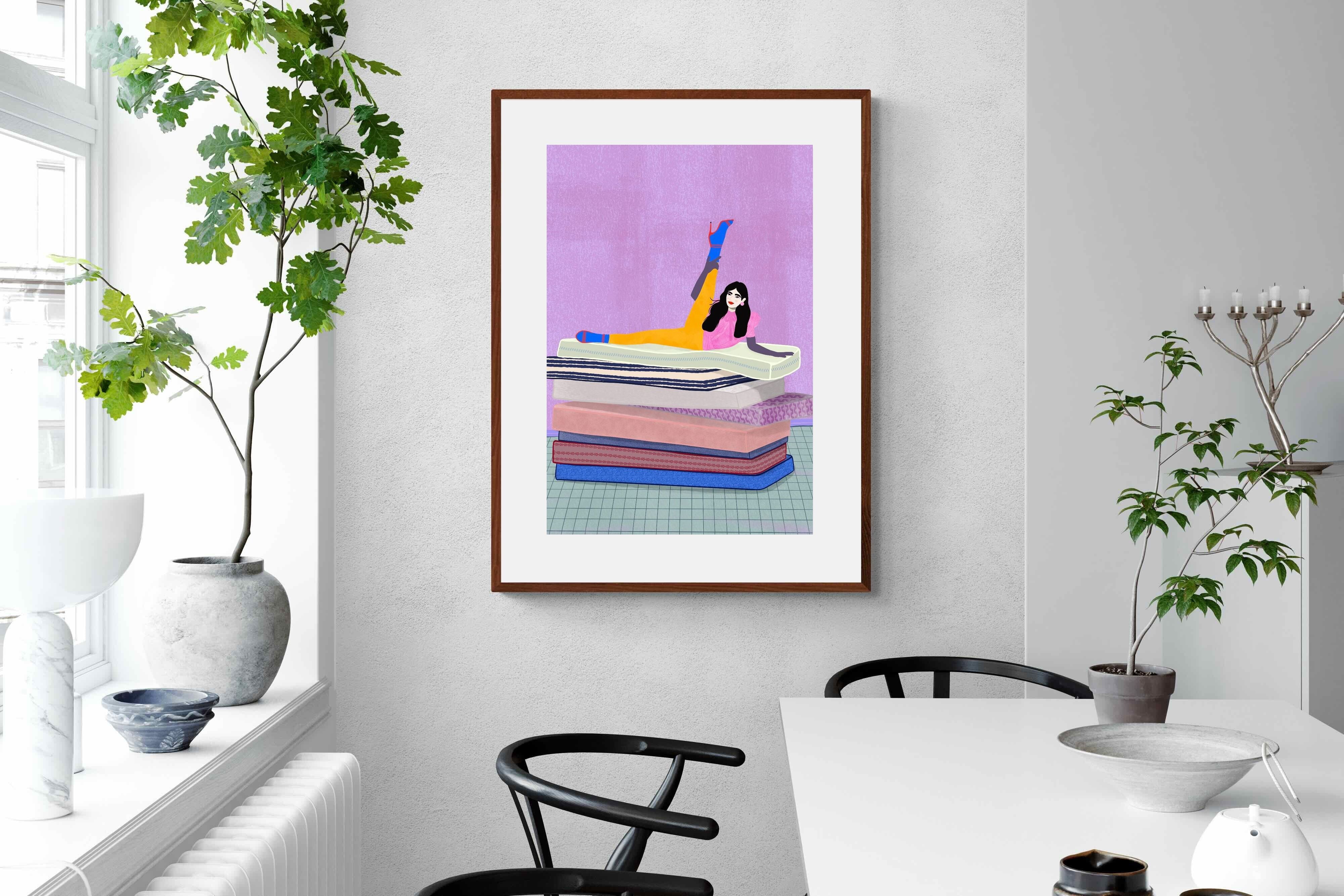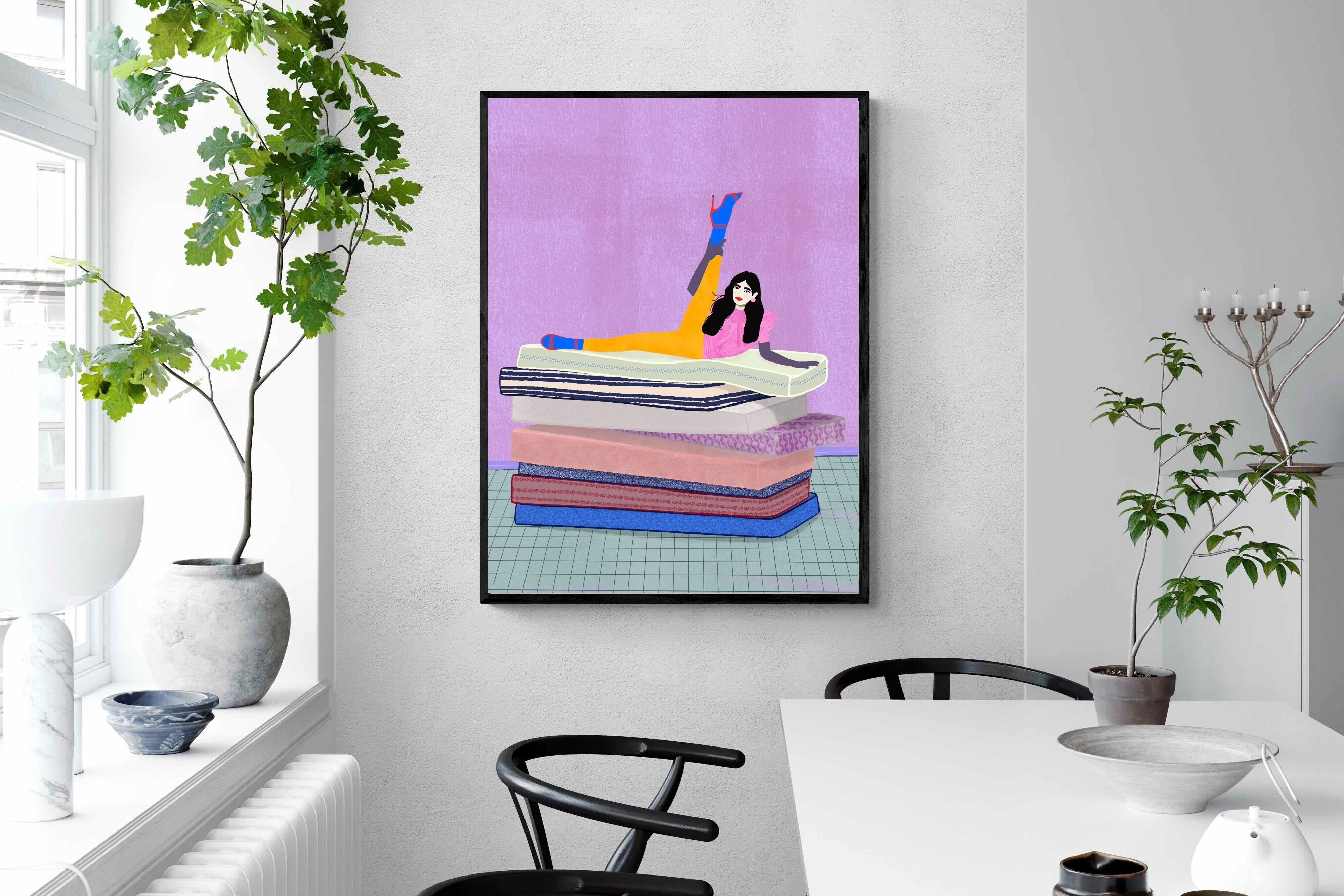 Playful and empowering, this colourful illustration turns a simple stretch into a statement. A relaxed figure reclines on stacked mattresses, with bright mustard leggings and cobalt socks popping against a lavender wash. It’s perfect for a home gym, Pilates studio, creative office, or a fun bedroom where you want personality without clutter. Looks brilliant as a framed print or canvas in modern, eclectic, or retro-inspired interiors with a quiet wink.