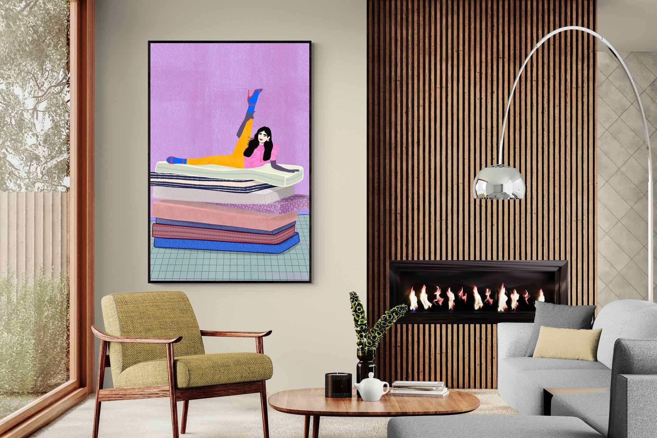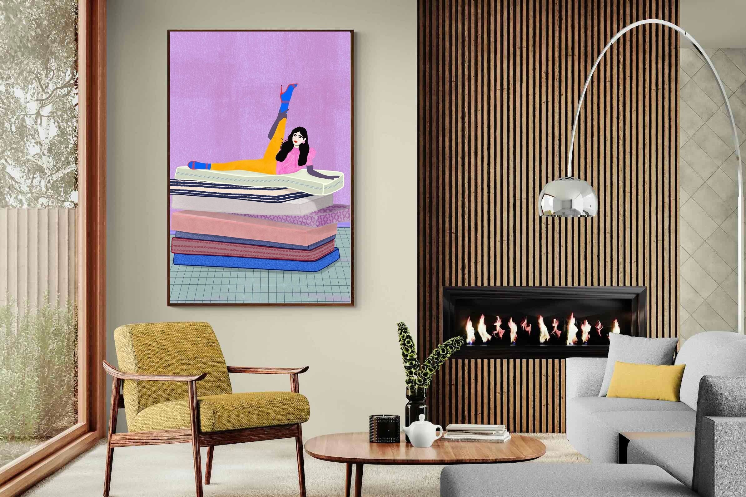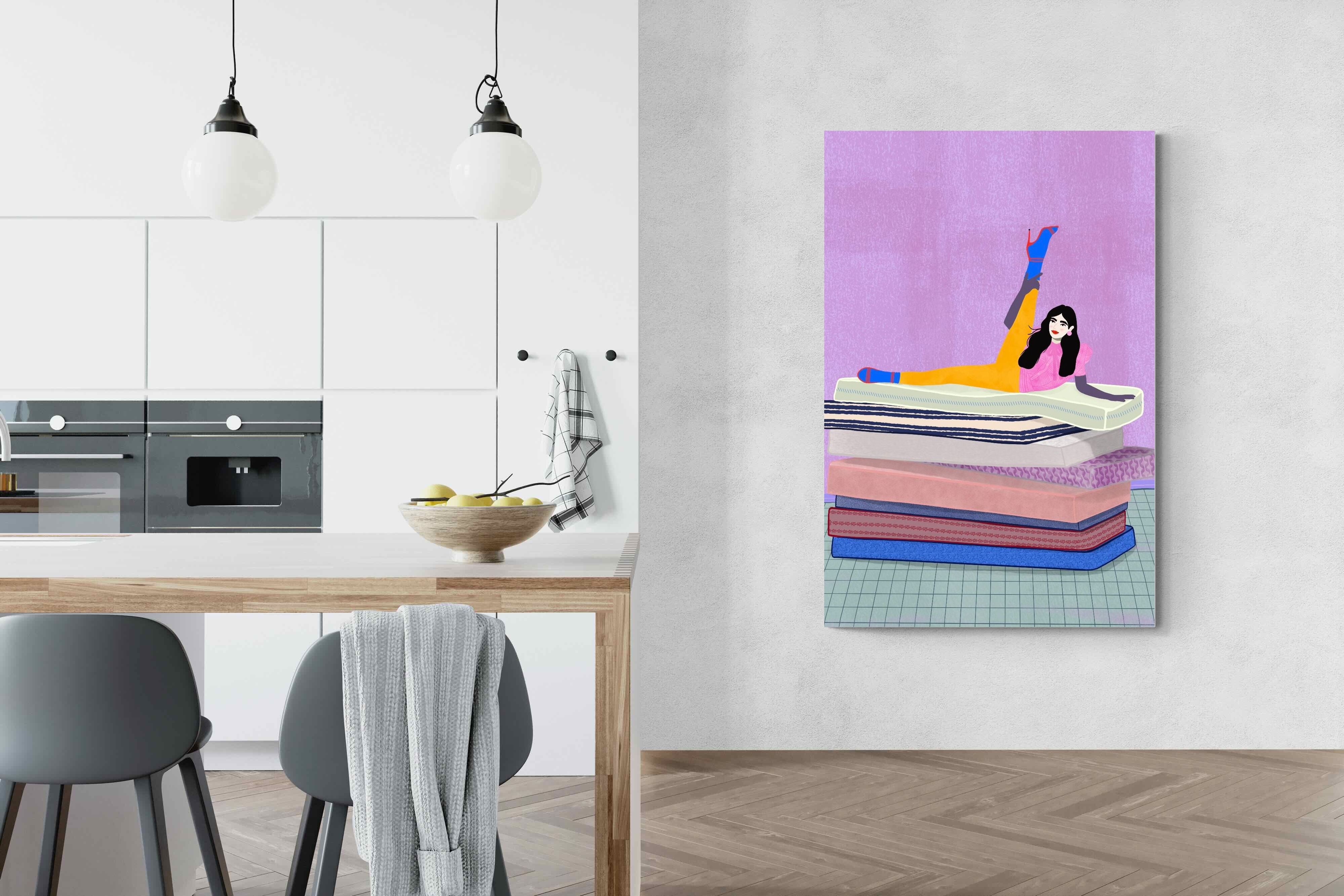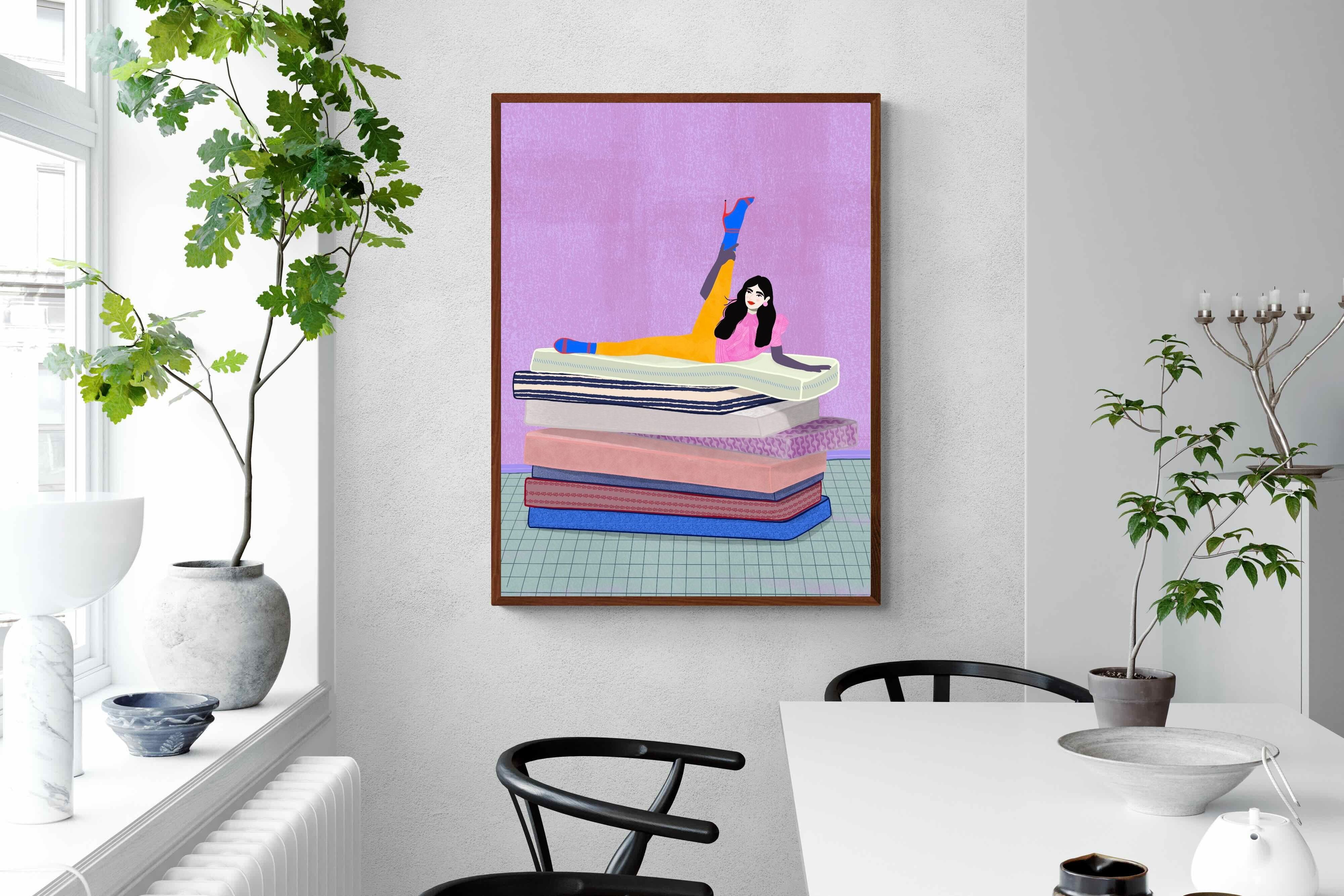 Playful and empowering, this colourful illustration turns a simple stretch into a statement. A relaxed figure reclines on stacked mattresses, with bright mustard leggings and cobalt socks popping against a lavender wash. It’s perfect for a home gym, Pilates studio, creative office, or a fun bedroom where you want personality without clutter. Looks brilliant as a framed print or canvas in modern, eclectic, or retro-inspired interiors with a quiet wink.