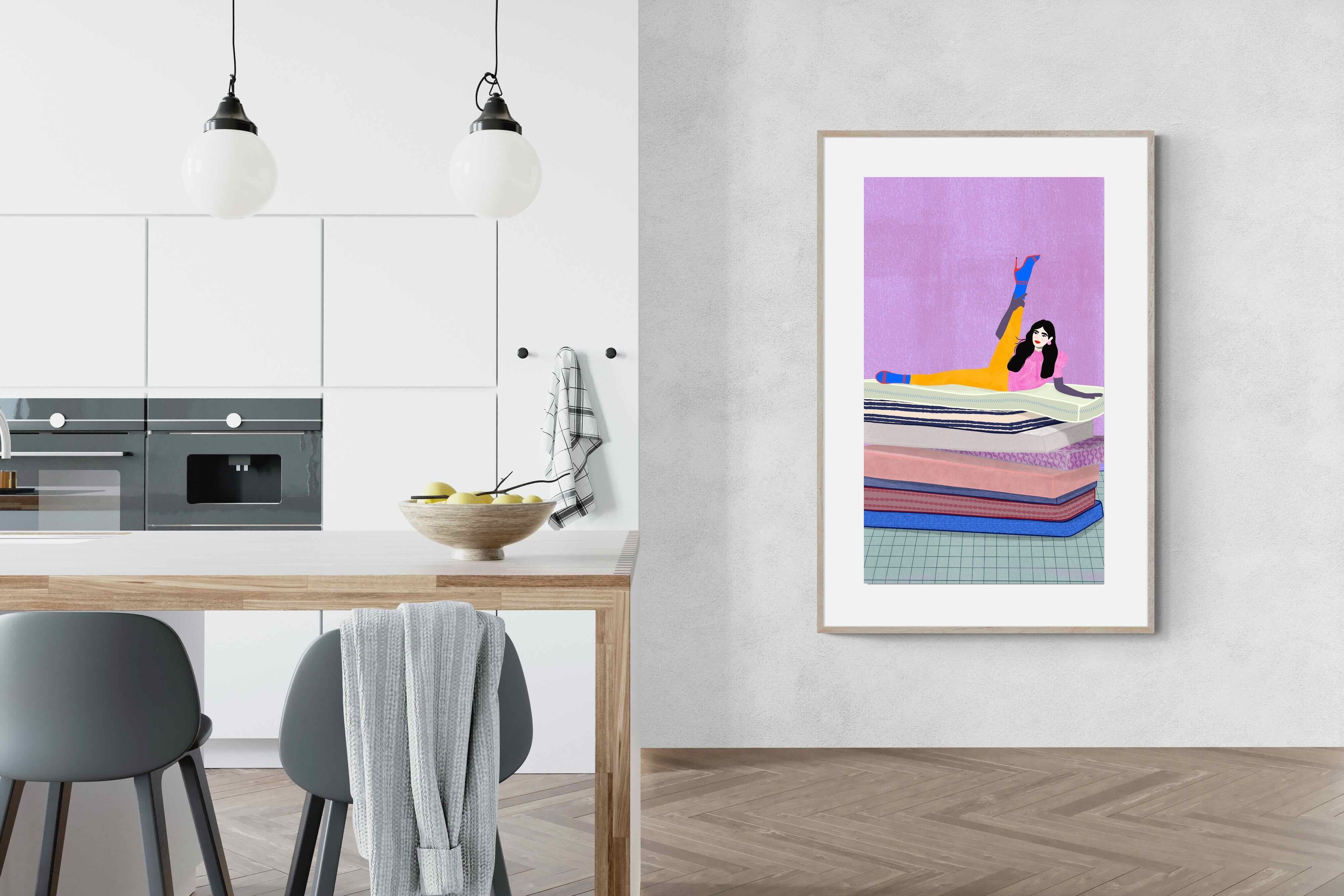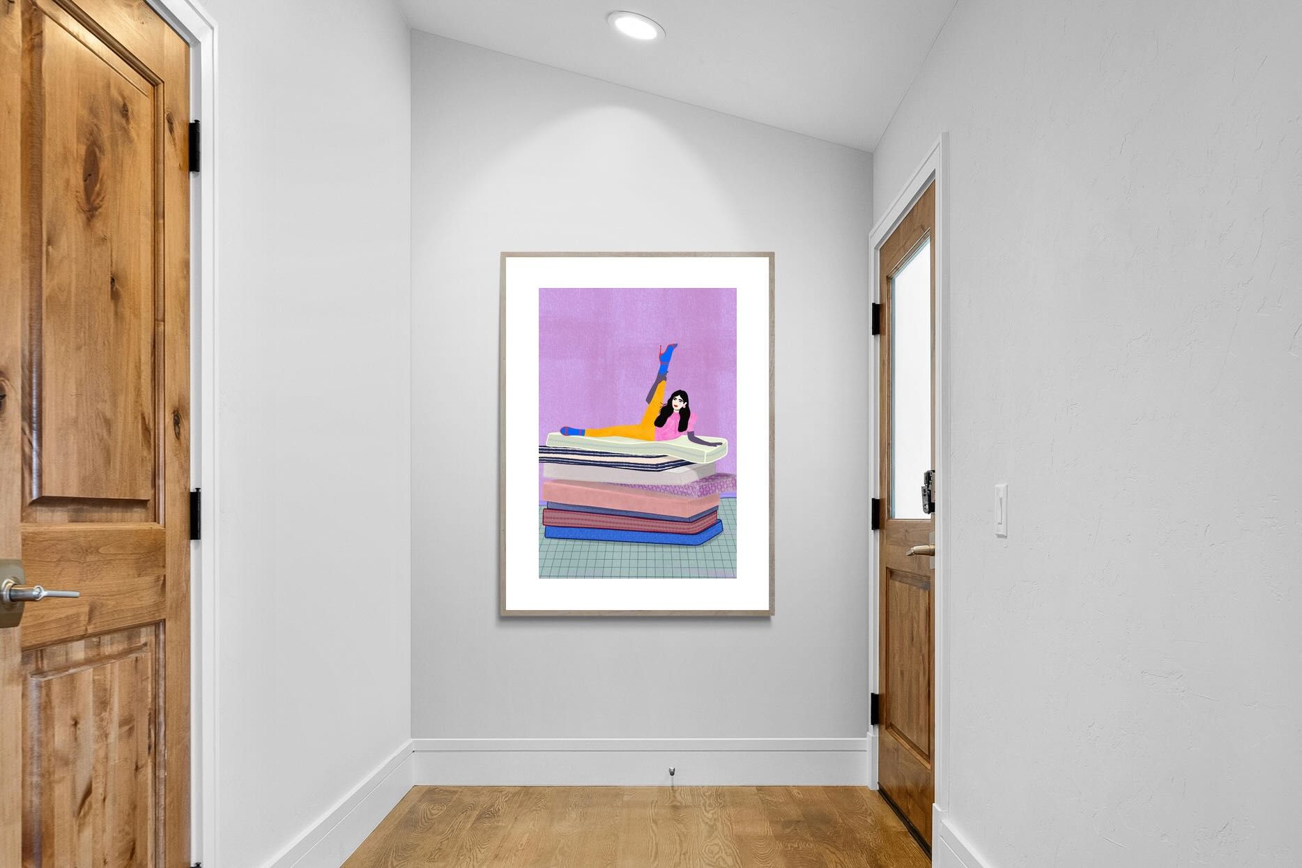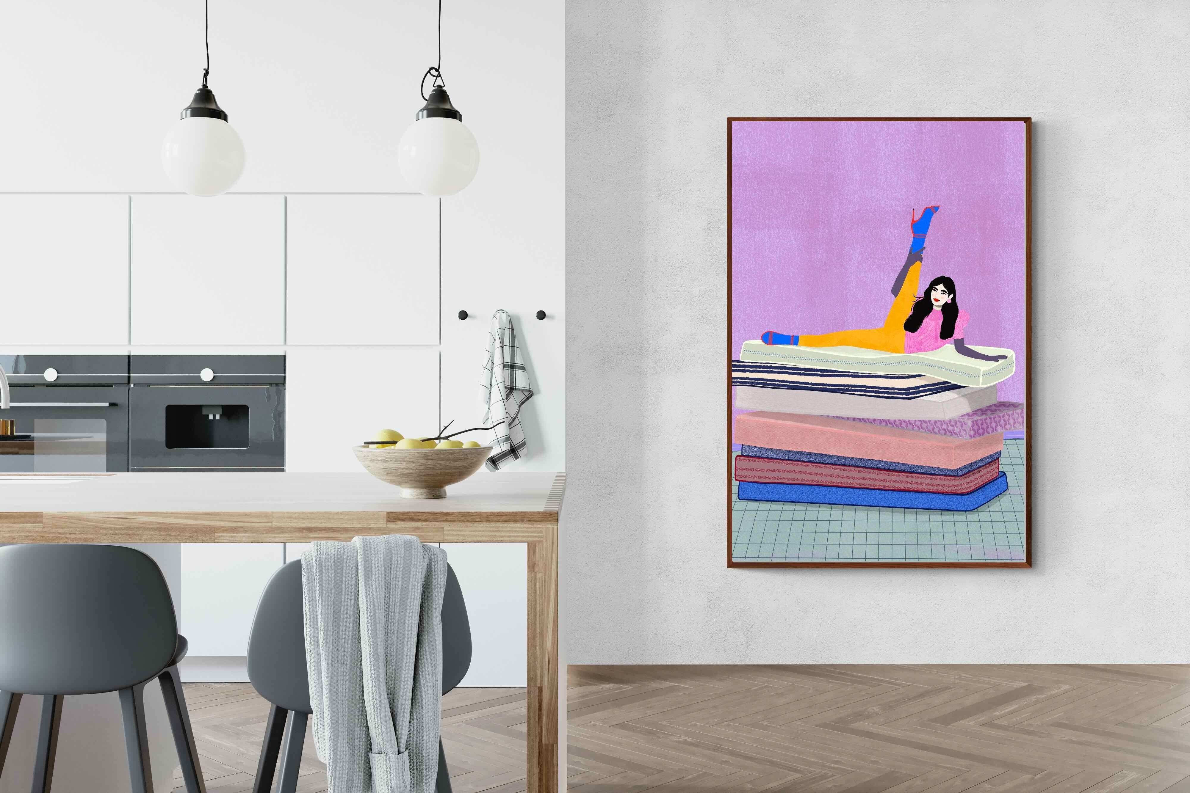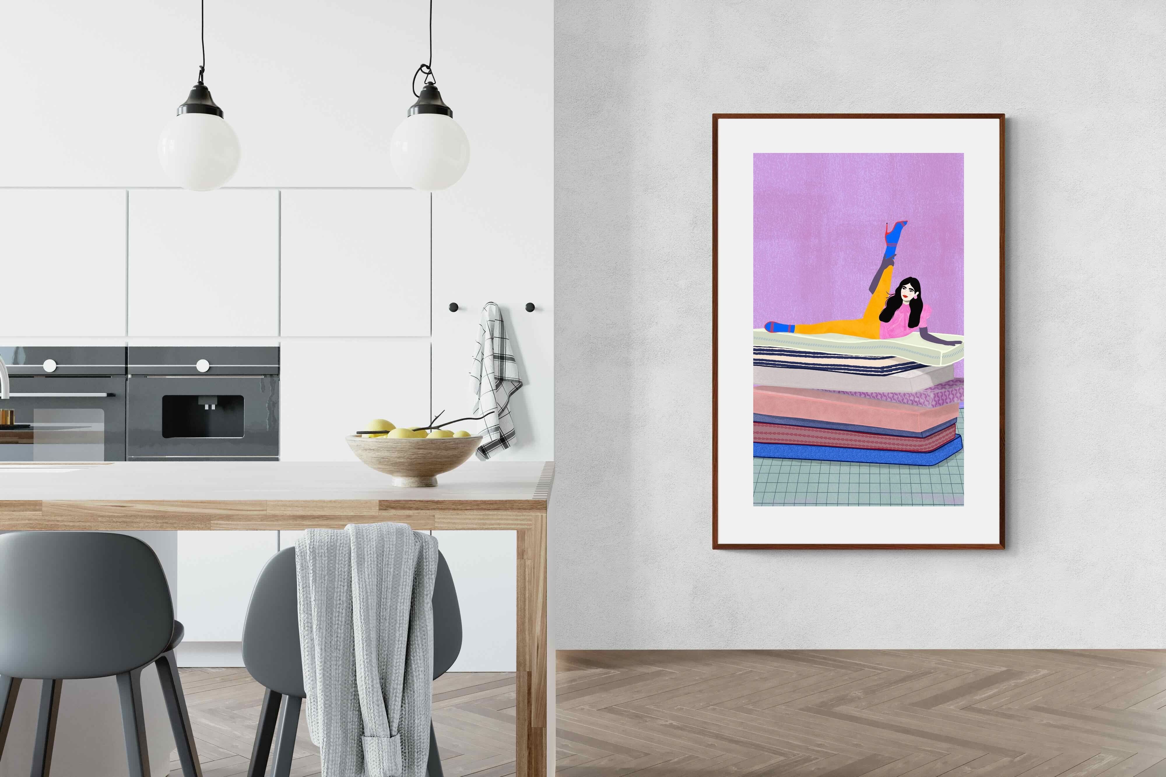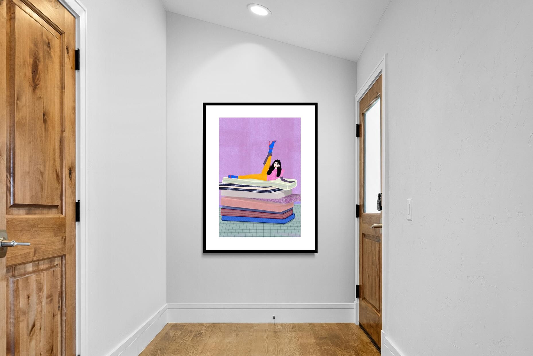 Playful and empowering, this colourful illustration turns a simple stretch into a statement. A relaxed figure reclines on stacked mattresses, with bright mustard leggings and cobalt socks popping against a lavender wash. It’s perfect for a home gym, Pilates studio, creative office, or a fun bedroom where you want personality without clutter. Looks brilliant as a framed print or canvas in modern, eclectic, or retro-inspired interiors with a quiet wink.