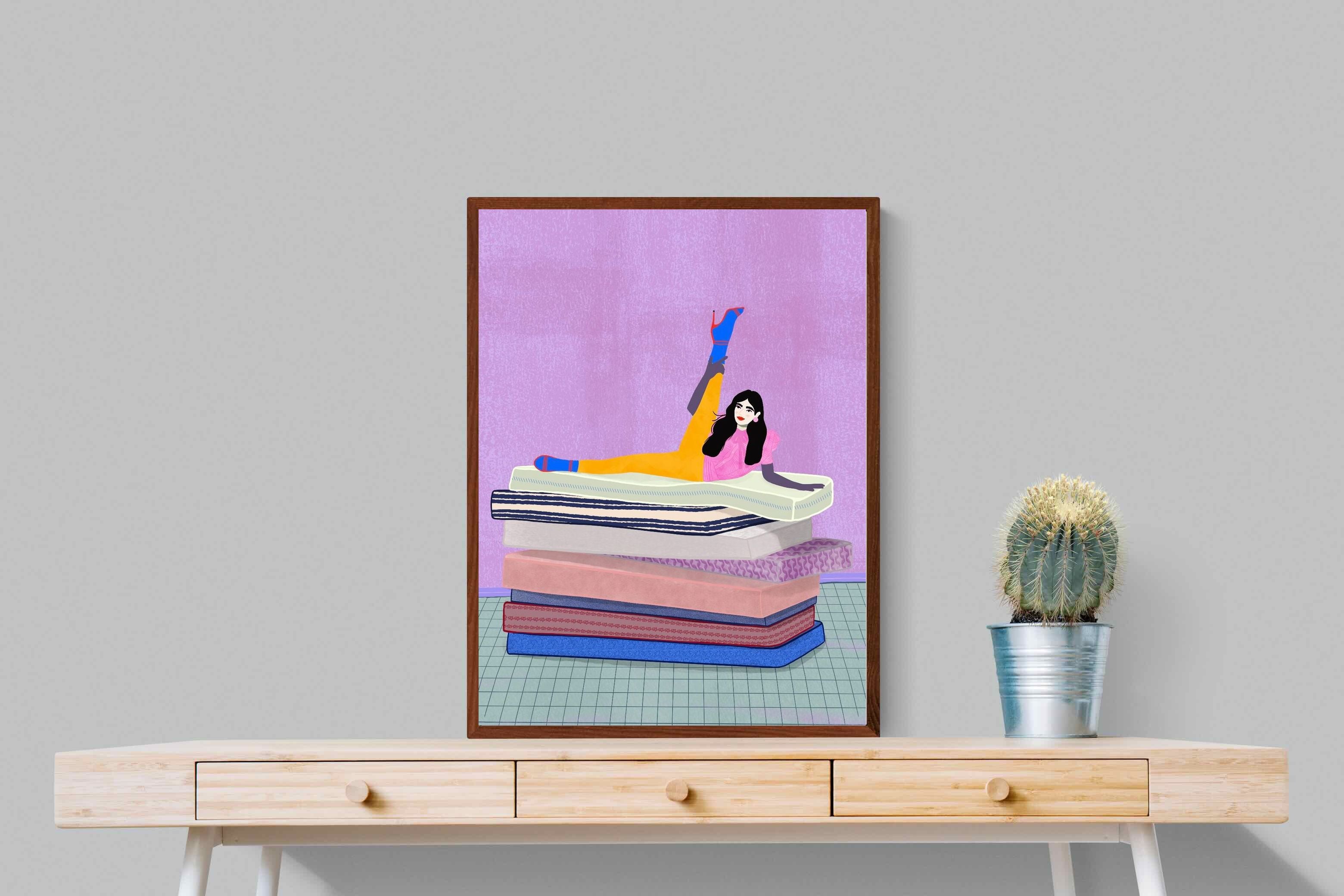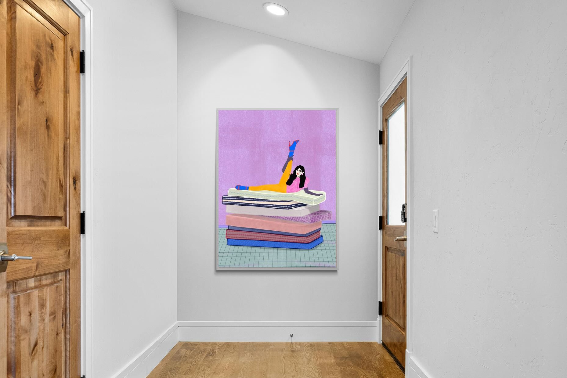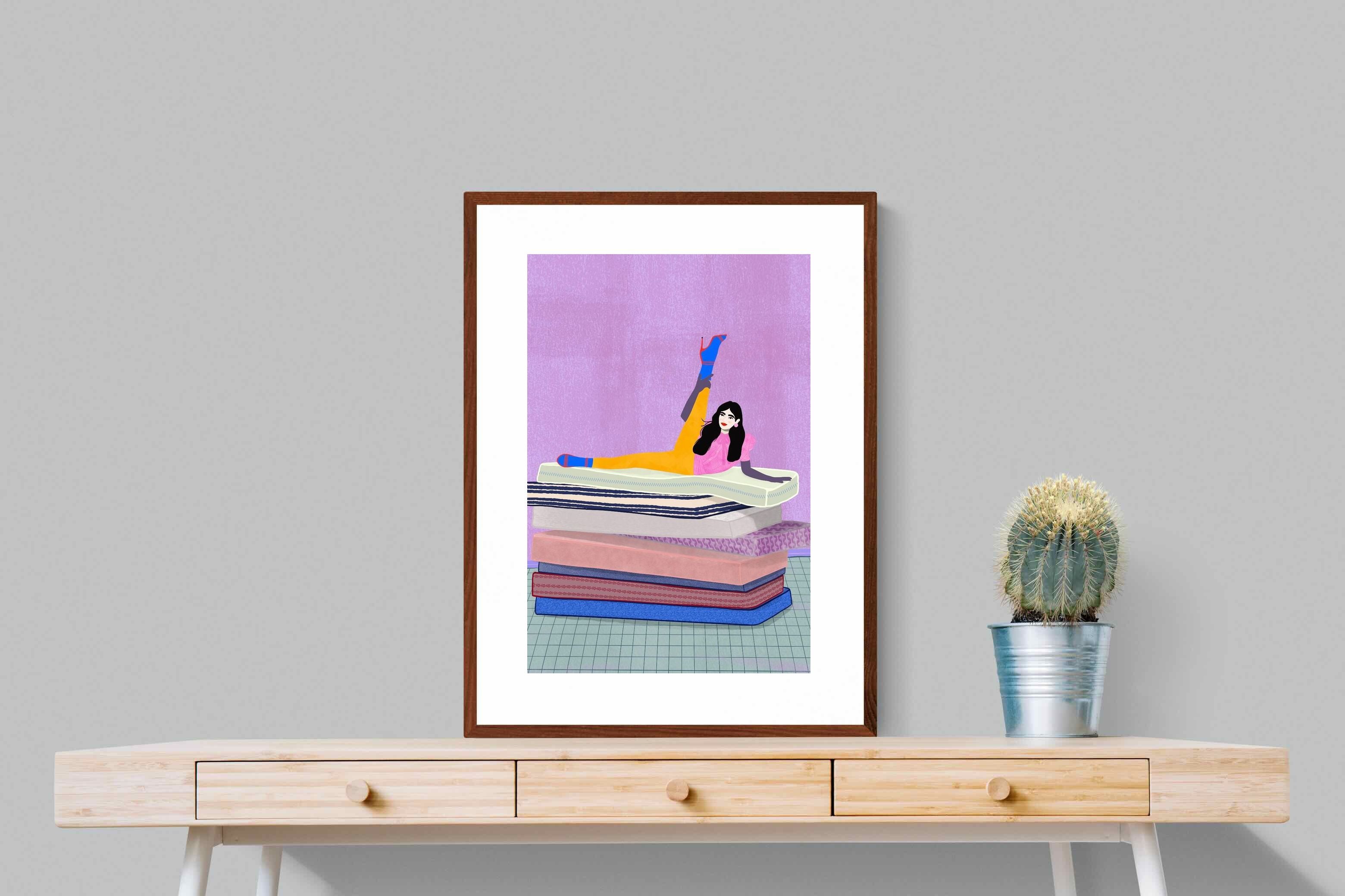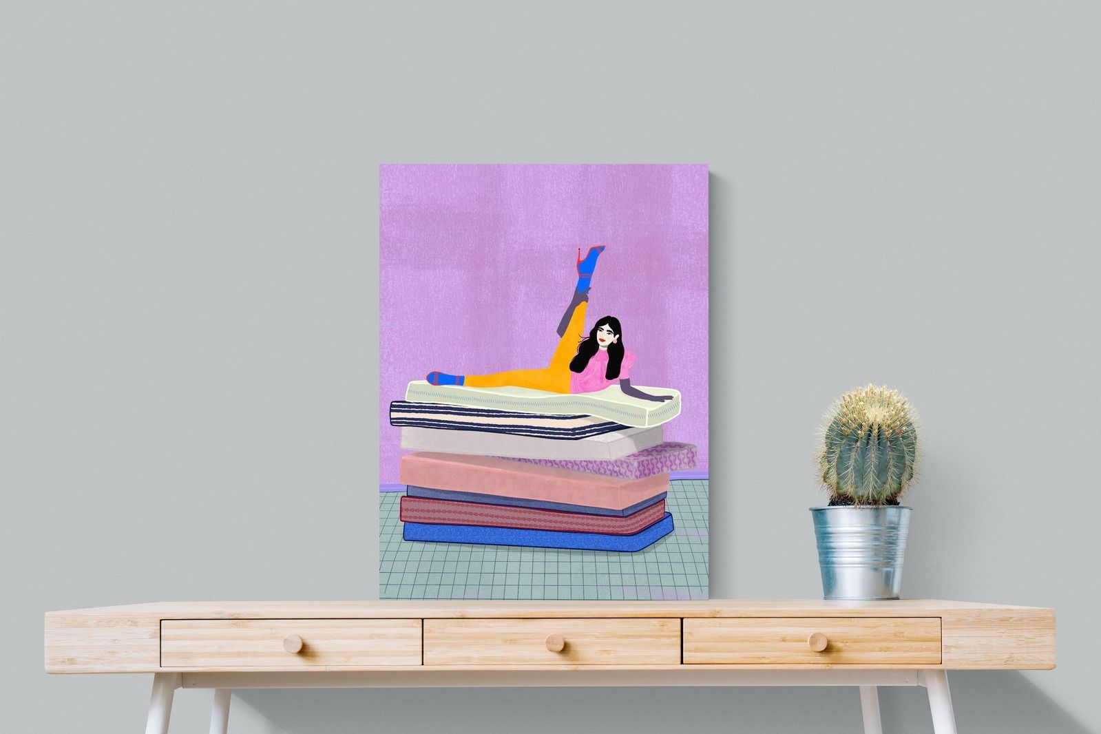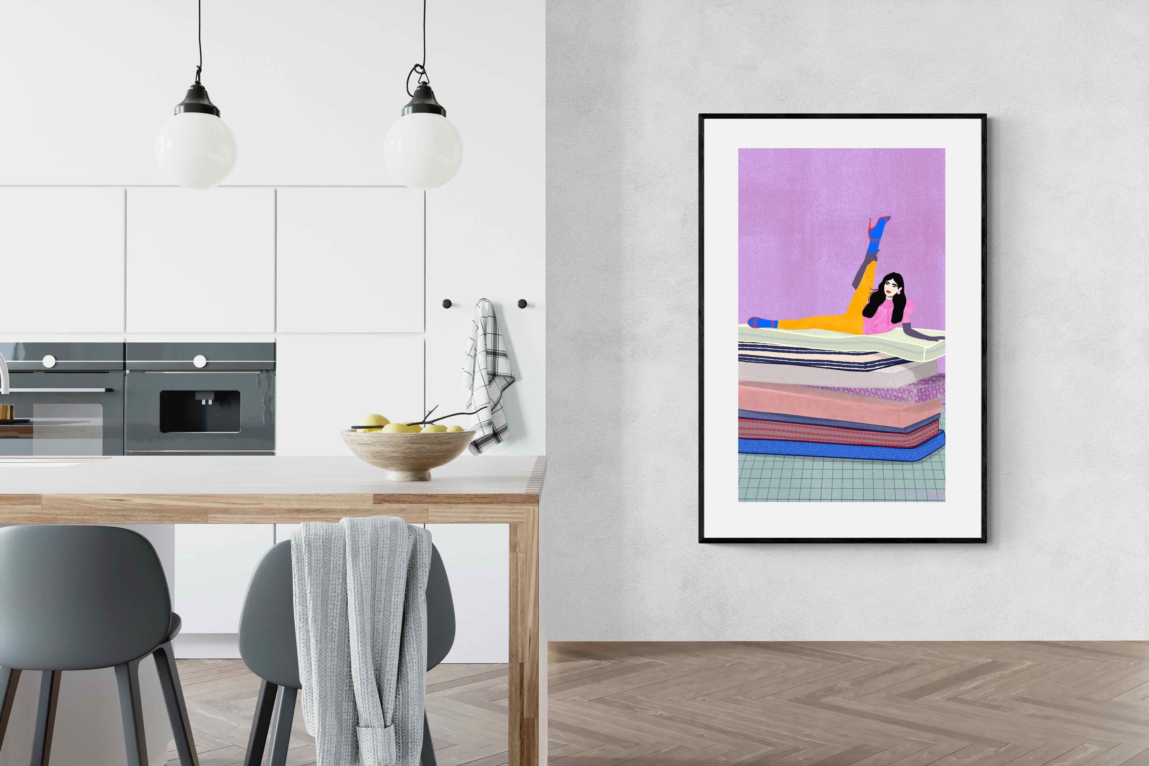 Playful and empowering, this colourful illustration turns a simple stretch into a statement. A relaxed figure reclines on stacked mattresses, with bright mustard leggings and cobalt socks popping against a lavender wash. It’s perfect for a home gym, Pilates studio, creative office, or a fun bedroom where you want personality without clutter. Looks brilliant as a framed print or canvas in modern, eclectic, or retro-inspired interiors with a quiet wink.