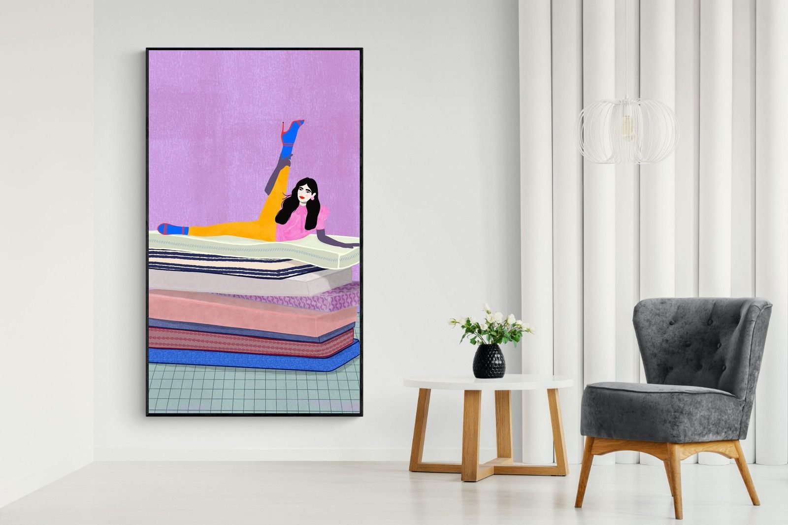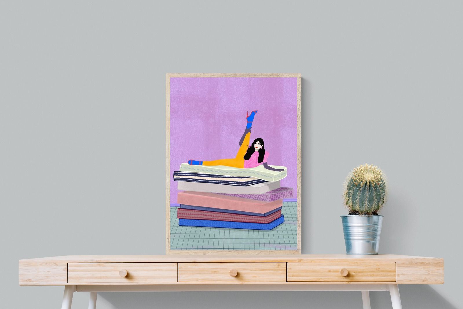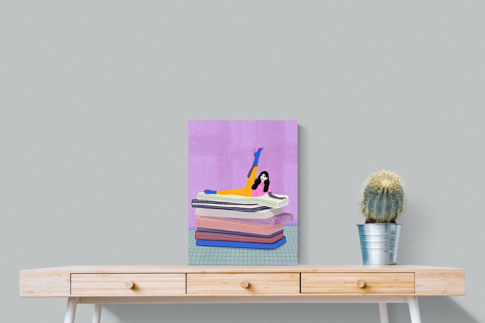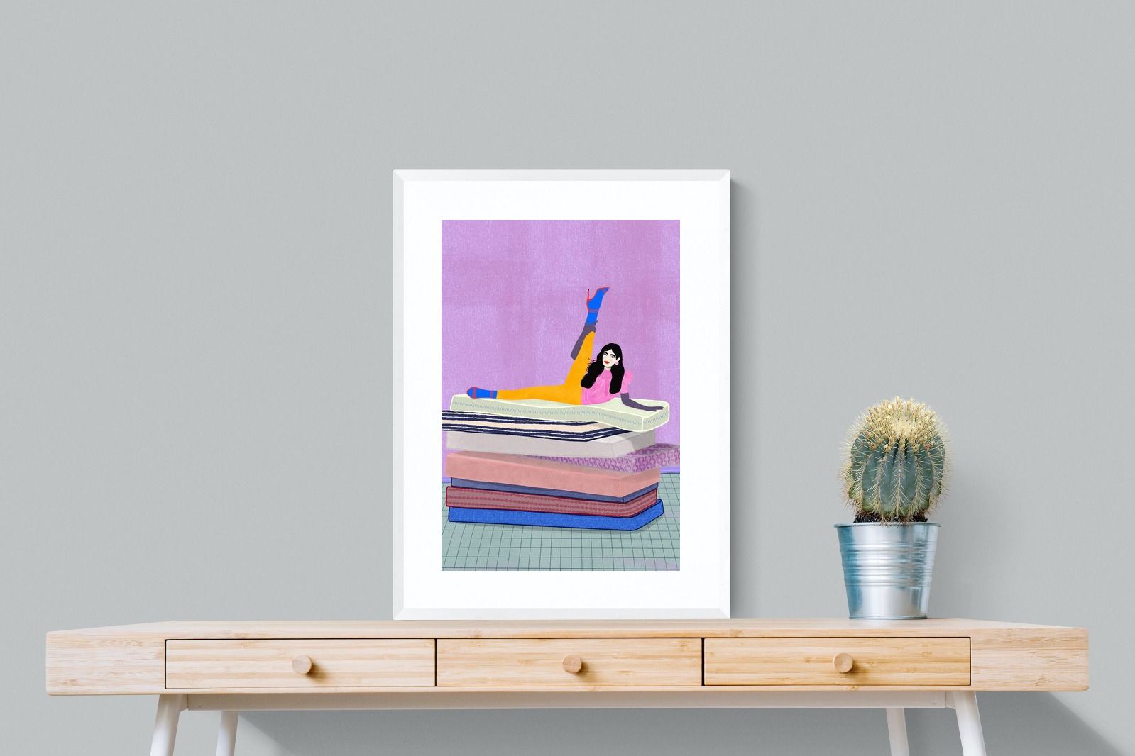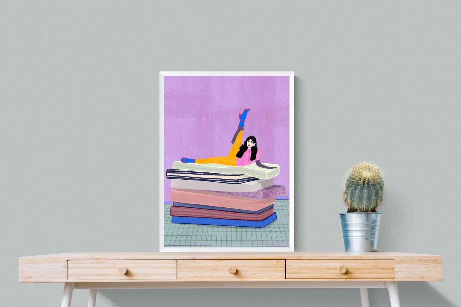 Playful and empowering, this colourful illustration turns a simple stretch into a statement. A relaxed figure reclines on stacked mattresses, with bright mustard leggings and cobalt socks popping against a lavender wash. It’s perfect for a home gym, Pilates studio, creative office, or a fun bedroom where you want personality without clutter. Looks brilliant as a framed print or canvas in modern, eclectic, or retro-inspired interiors with a quiet wink.