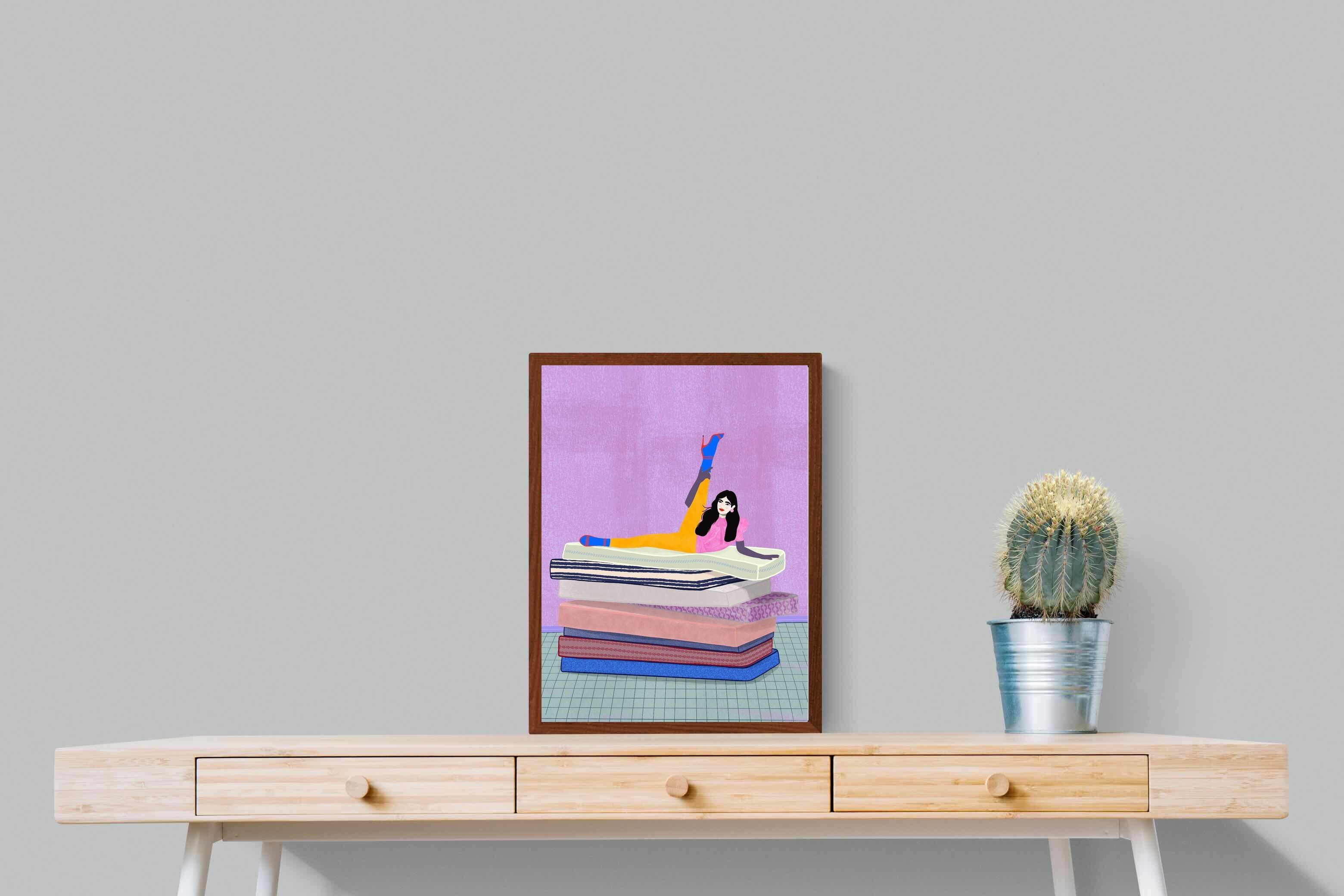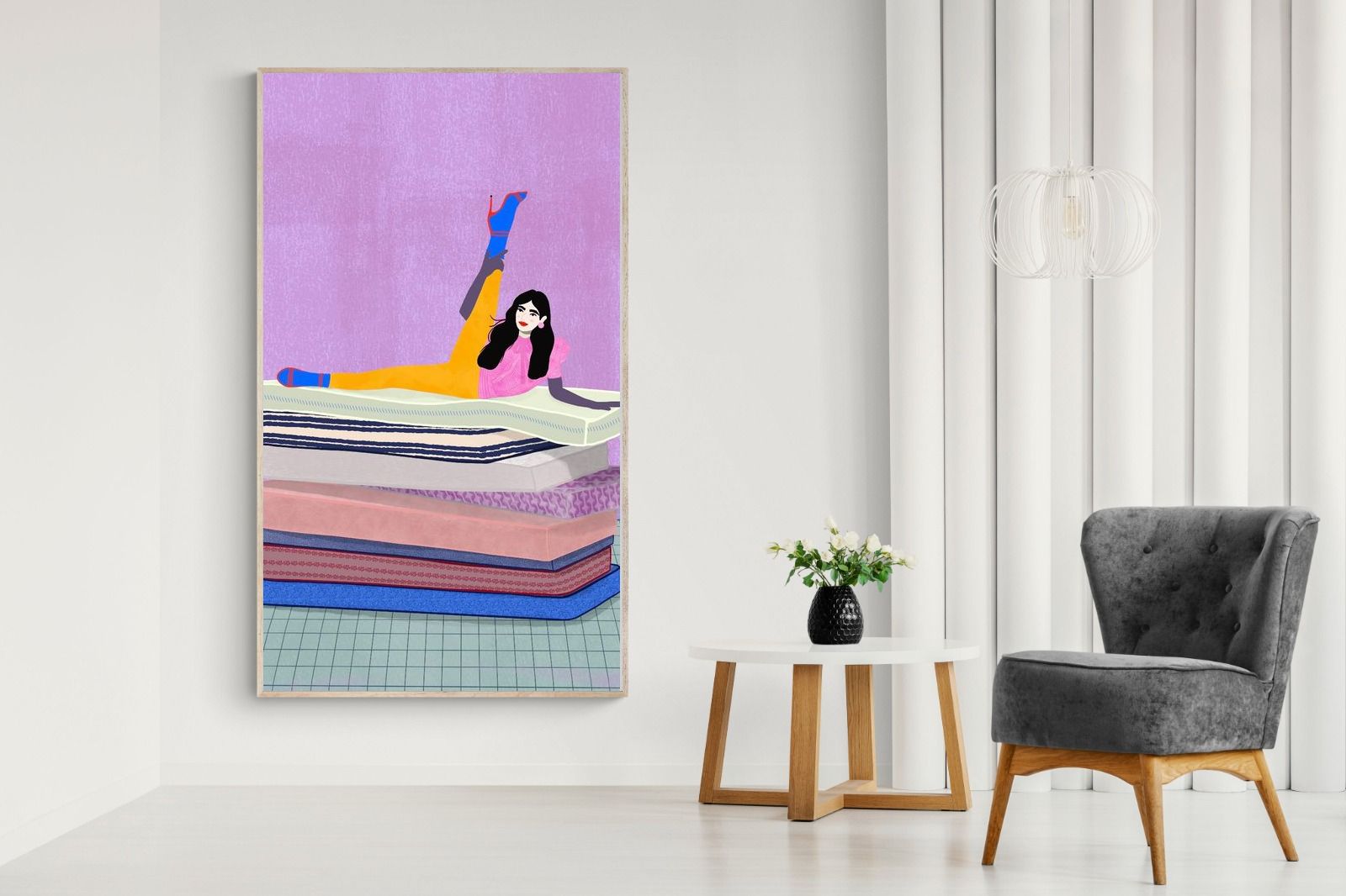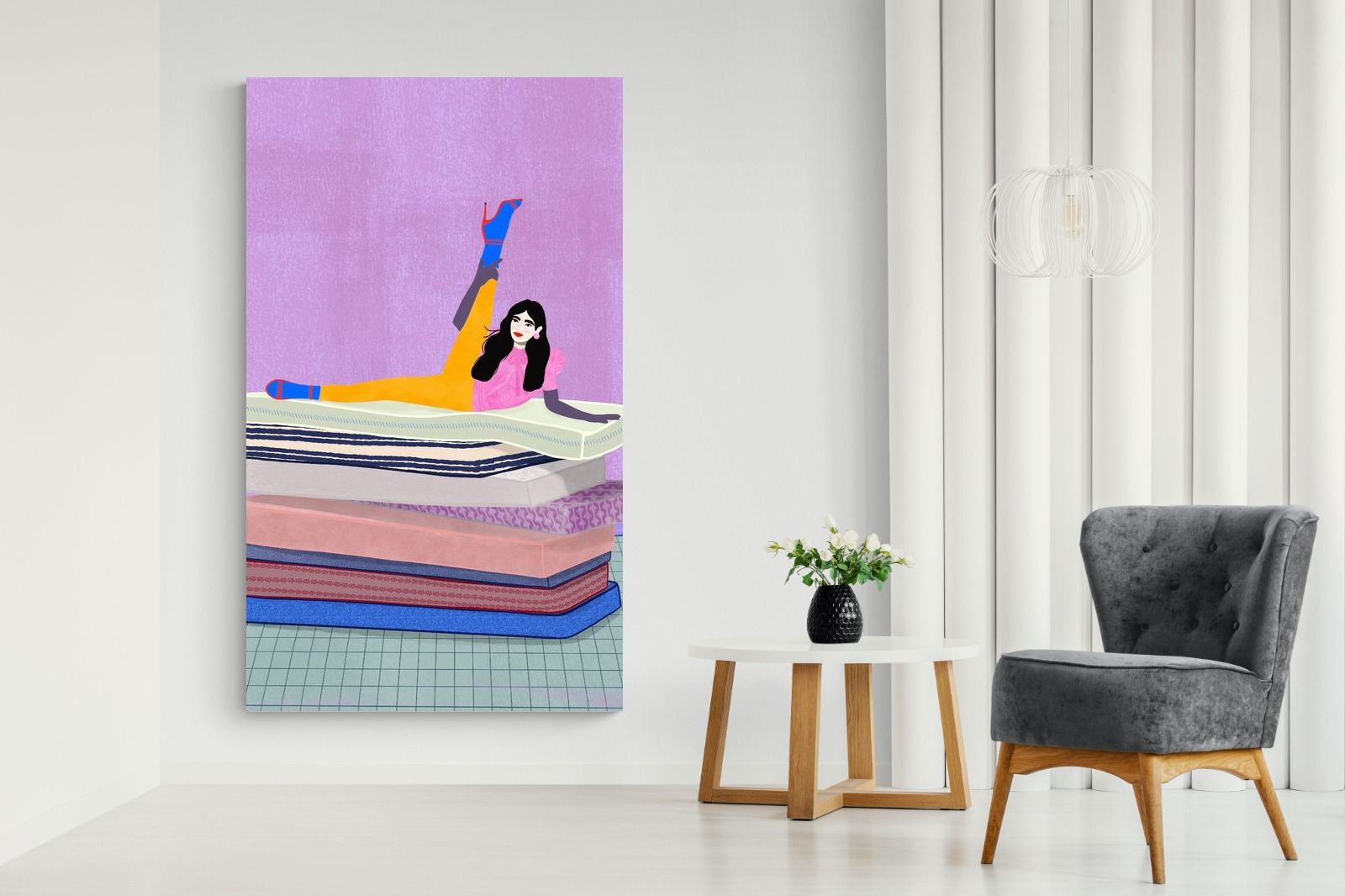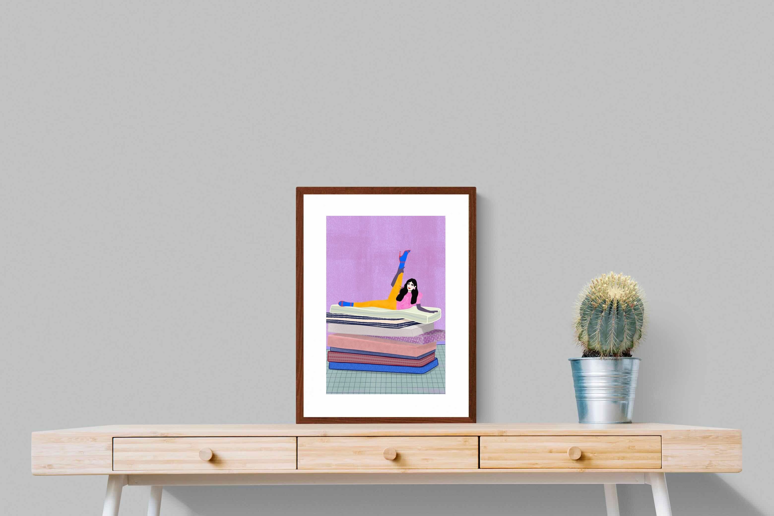 Playful and empowering, this colourful illustration turns a simple stretch into a statement. A relaxed figure reclines on stacked mattresses, with bright mustard leggings and cobalt socks popping against a lavender wash. It’s perfect for a home gym, Pilates studio, creative office, or a fun bedroom where you want personality without clutter. Looks brilliant as a framed print or canvas in modern, eclectic, or retro-inspired interiors with a quiet wink.