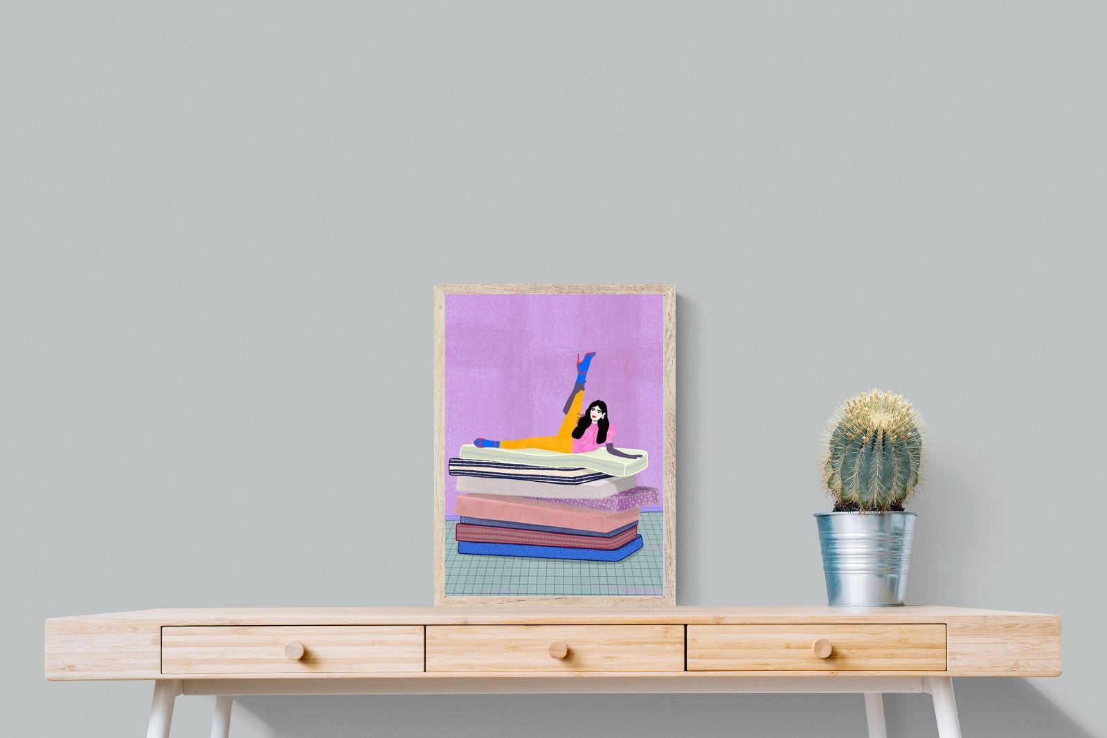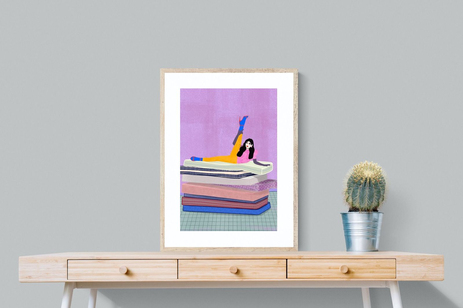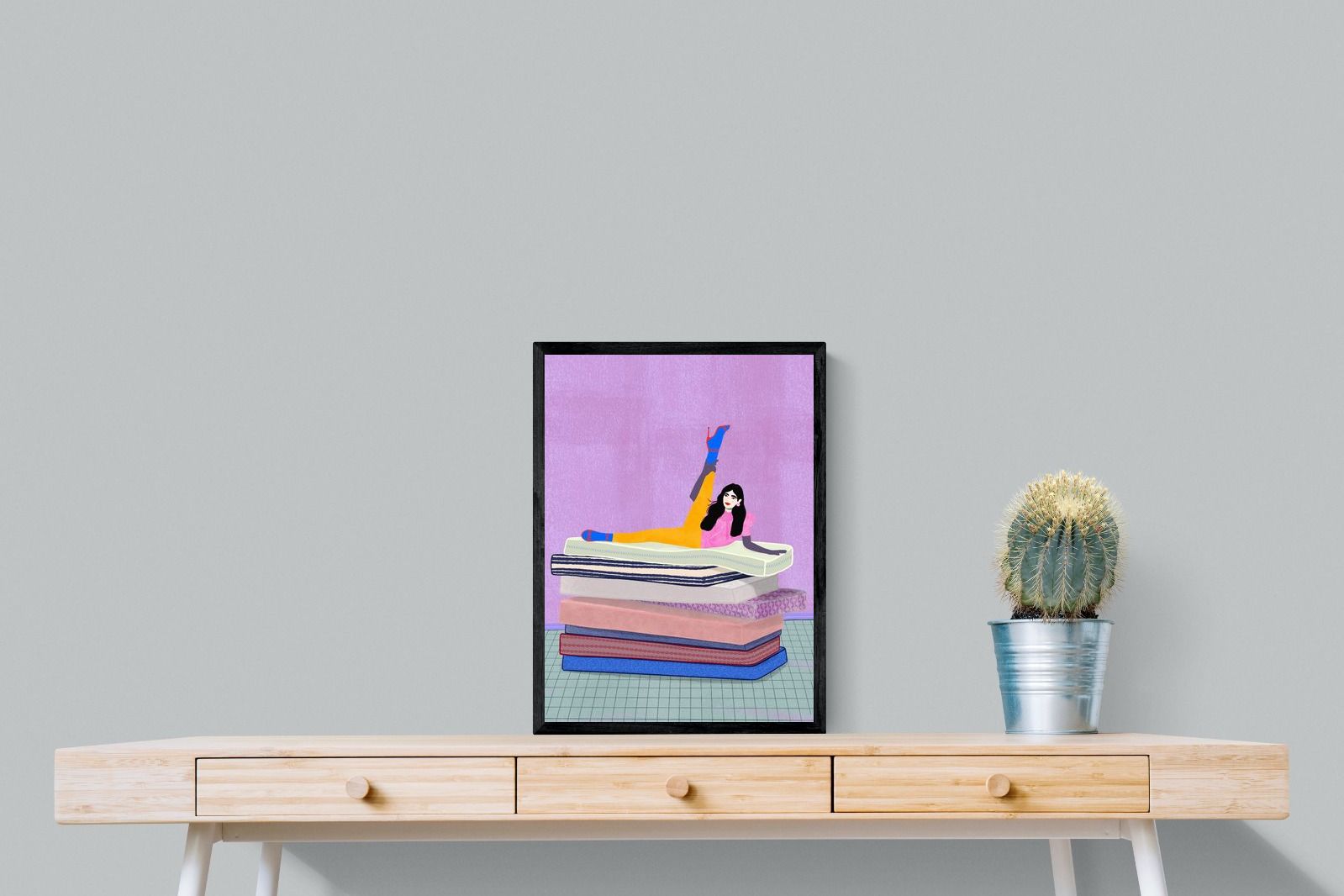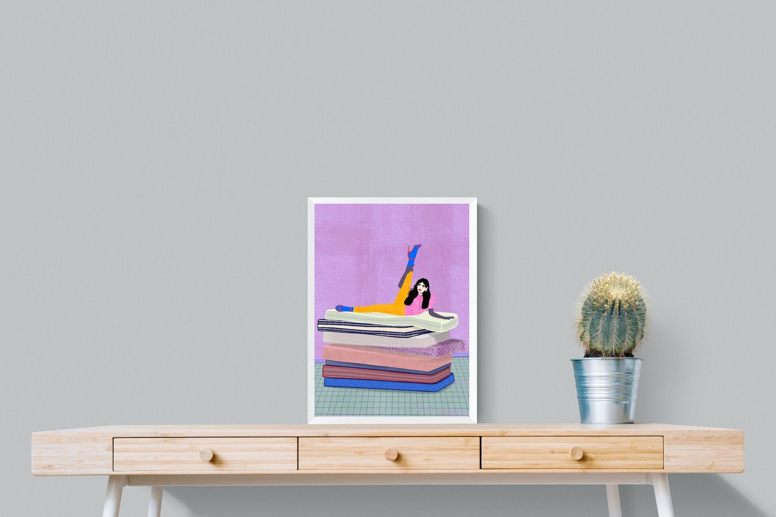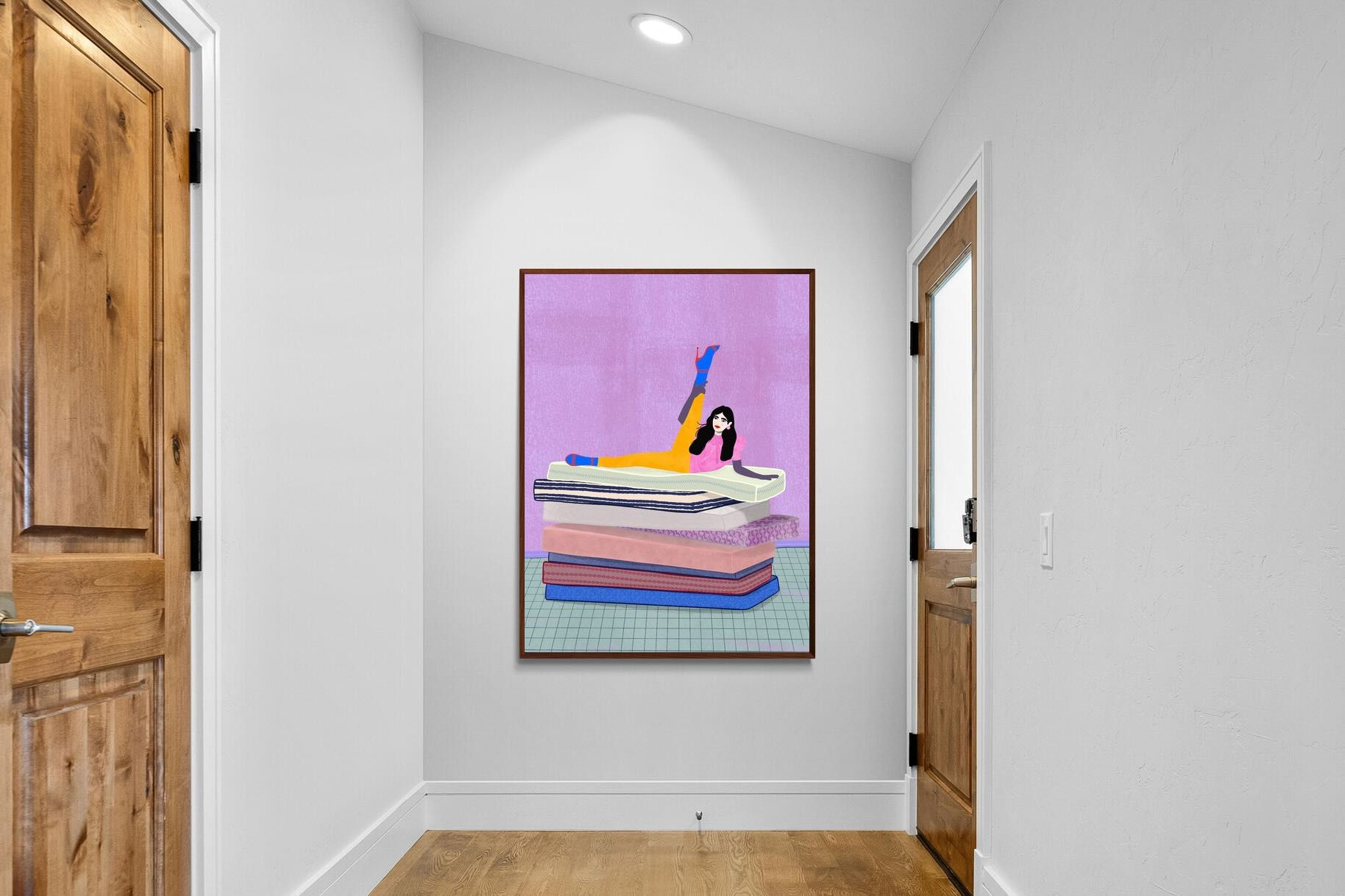 Playful and empowering, this colourful illustration turns a simple stretch into a statement. A relaxed figure reclines on stacked mattresses, with bright mustard leggings and cobalt socks popping against a lavender wash. It’s perfect for a home gym, Pilates studio, creative office, or a fun bedroom where you want personality without clutter. Looks brilliant as a framed print or canvas in modern, eclectic, or retro-inspired interiors with a quiet wink.