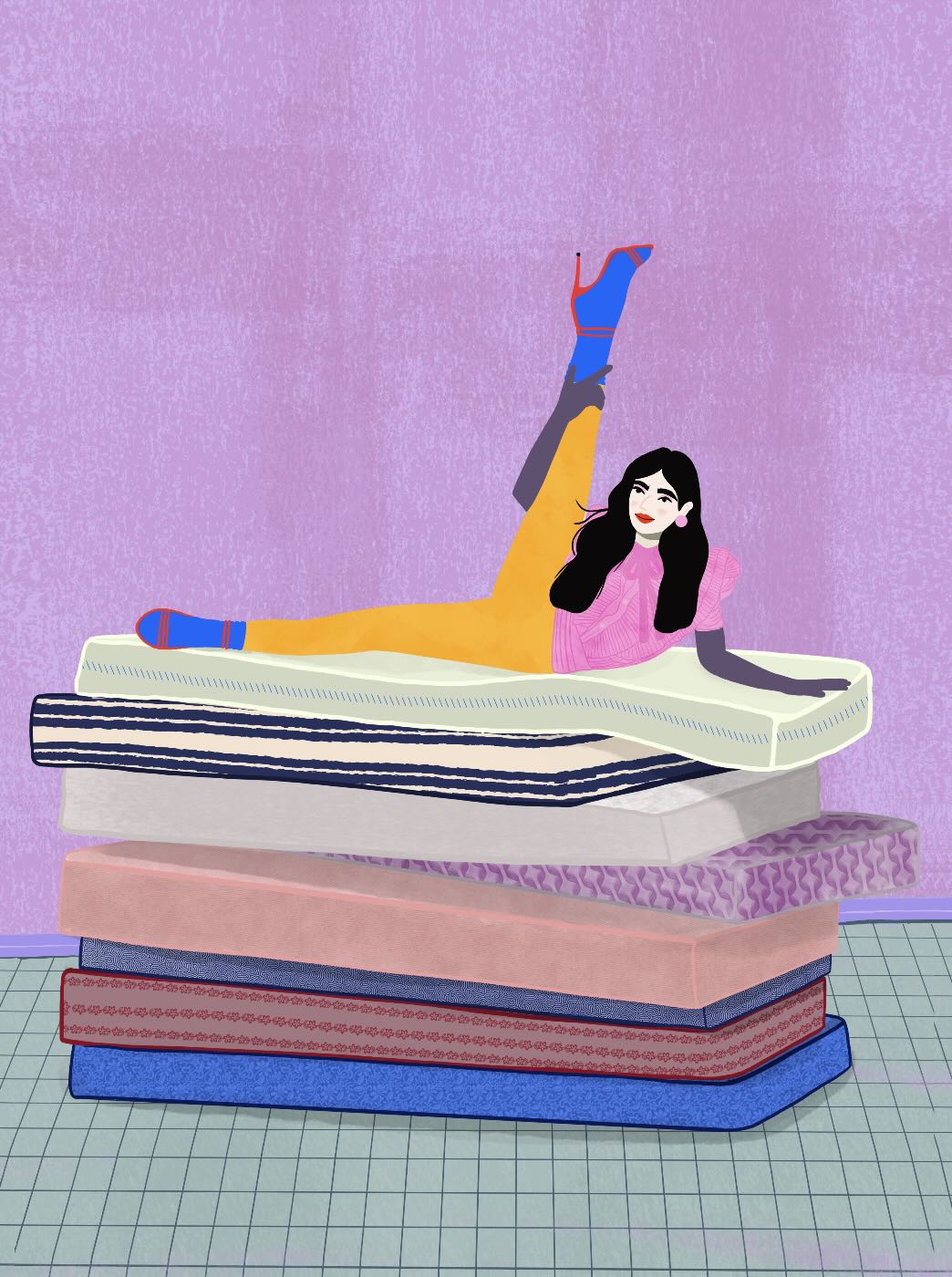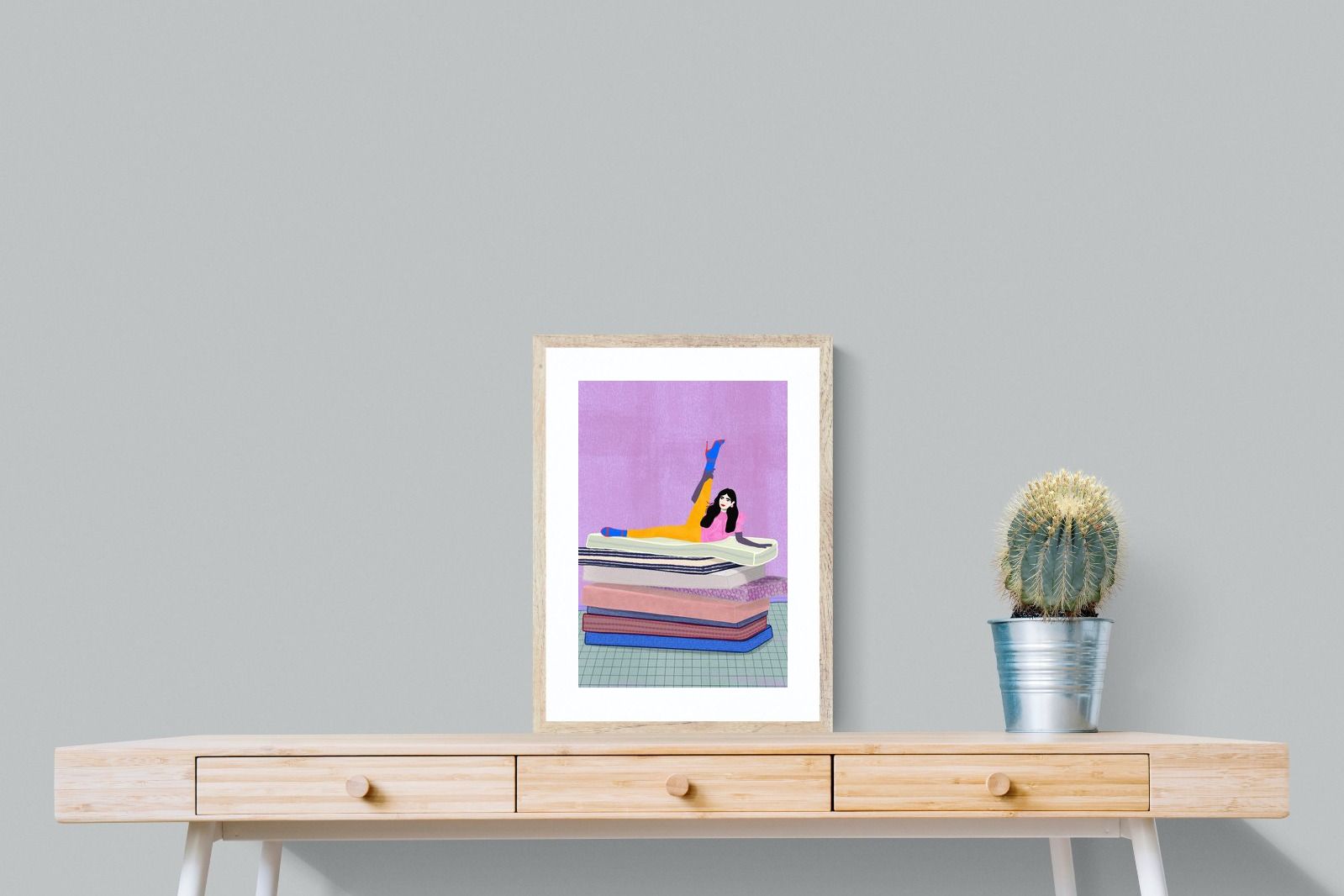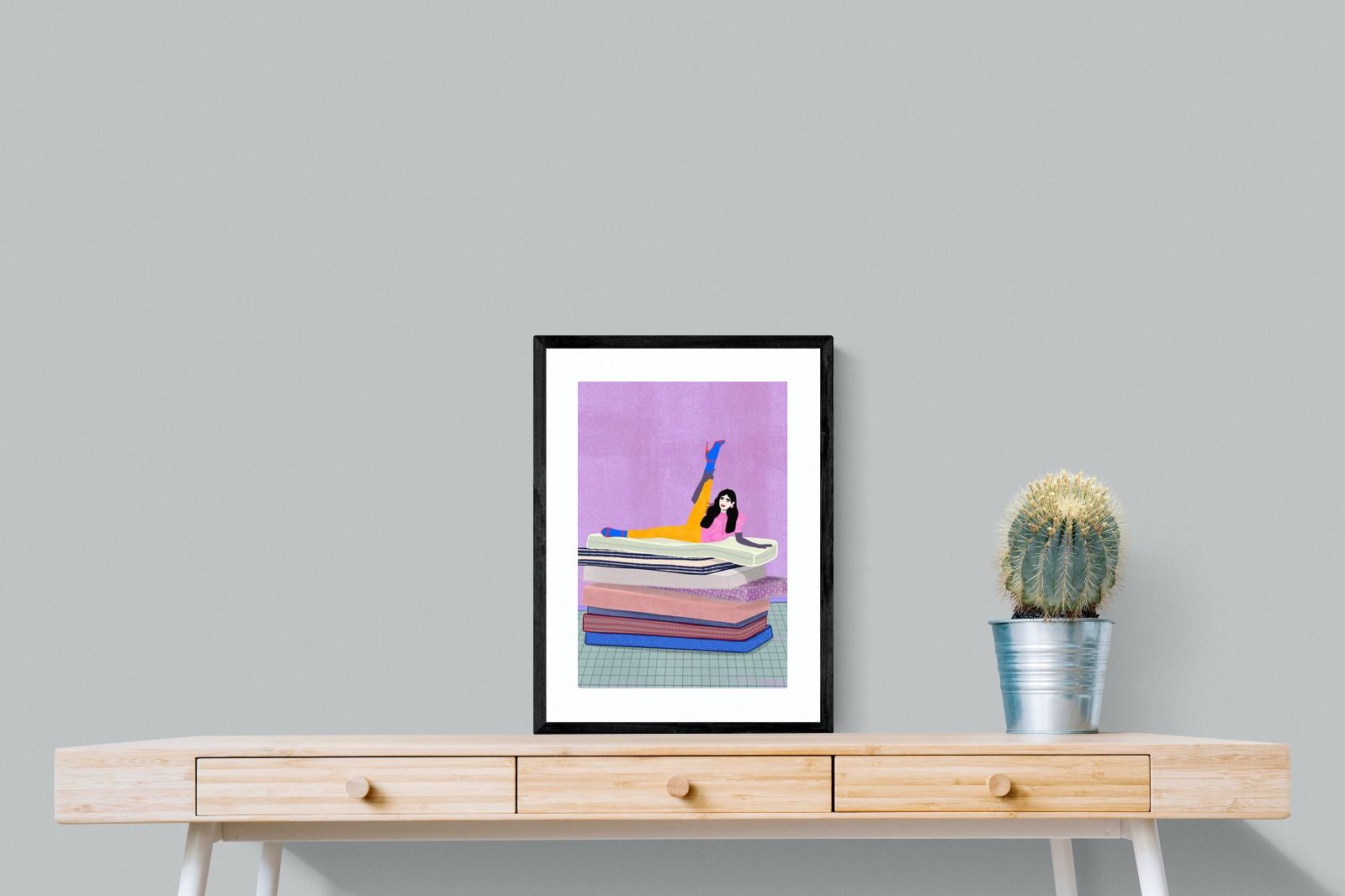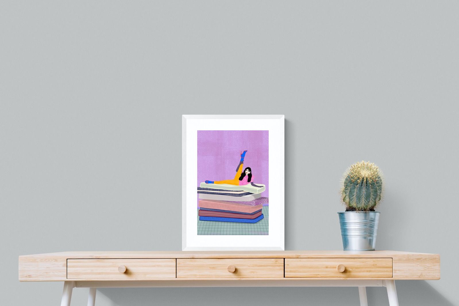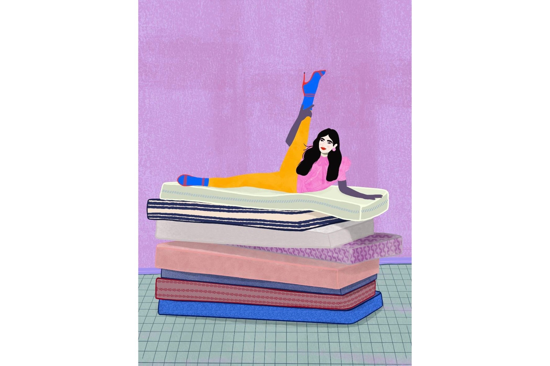 Playful and empowering, this colourful illustration turns a simple stretch into a statement. A relaxed figure reclines on stacked mattresses, with bright mustard leggings and cobalt socks popping against a lavender wash. It’s perfect for a home gym, Pilates studio, creative office, or a fun bedroom where you want personality without clutter. Looks brilliant as a framed print or canvas in modern, eclectic, or retro-inspired interiors with a quiet wink.