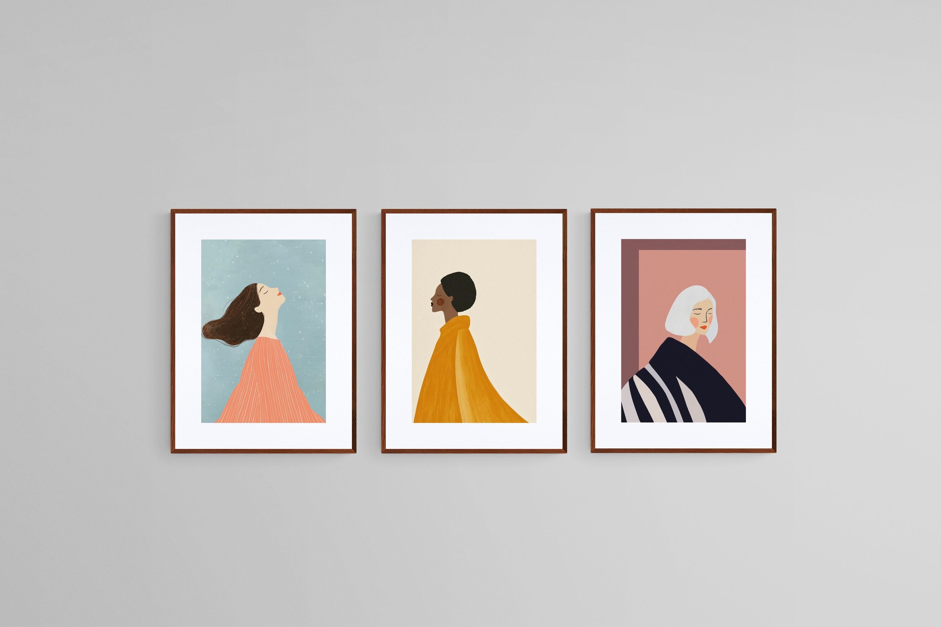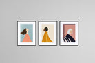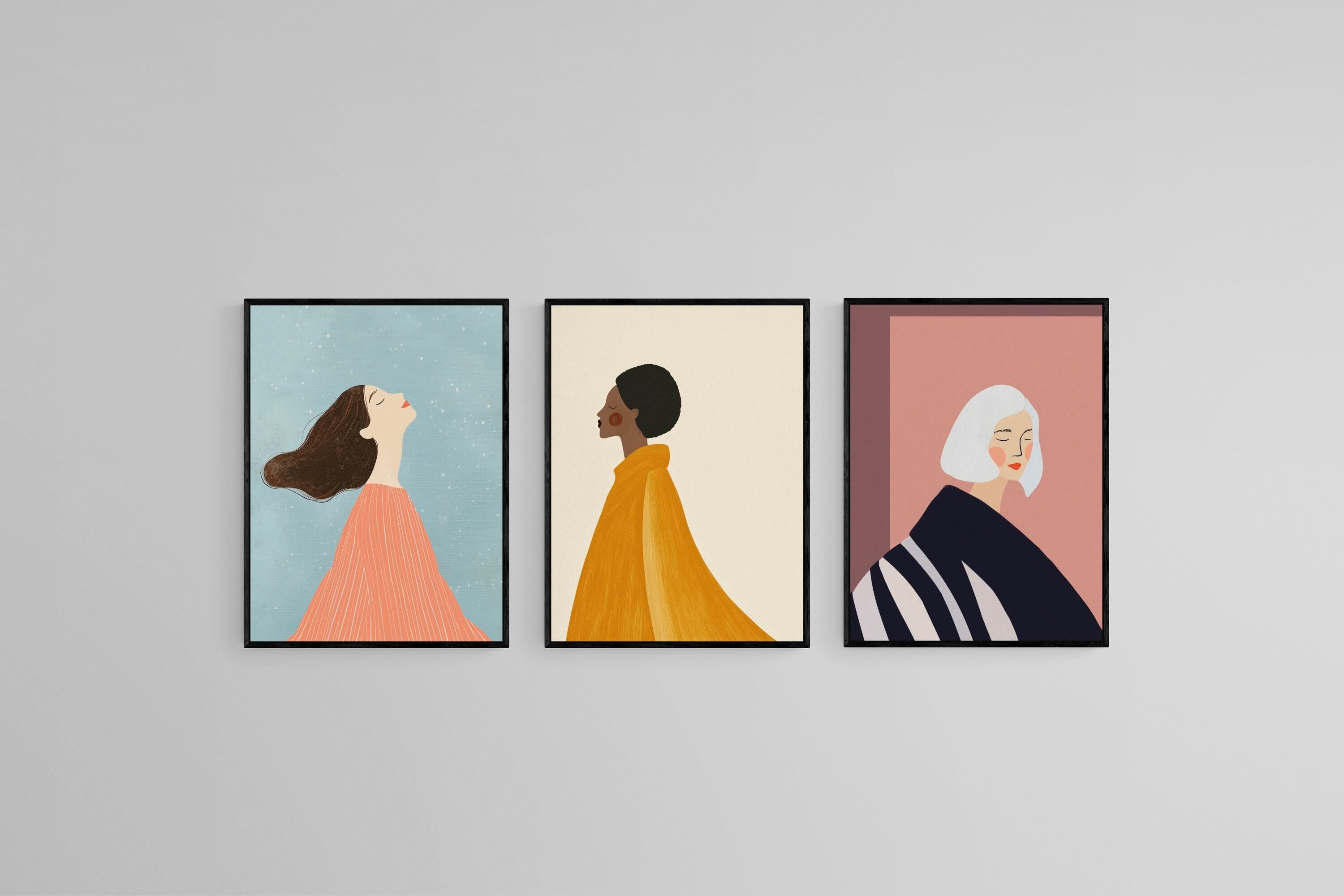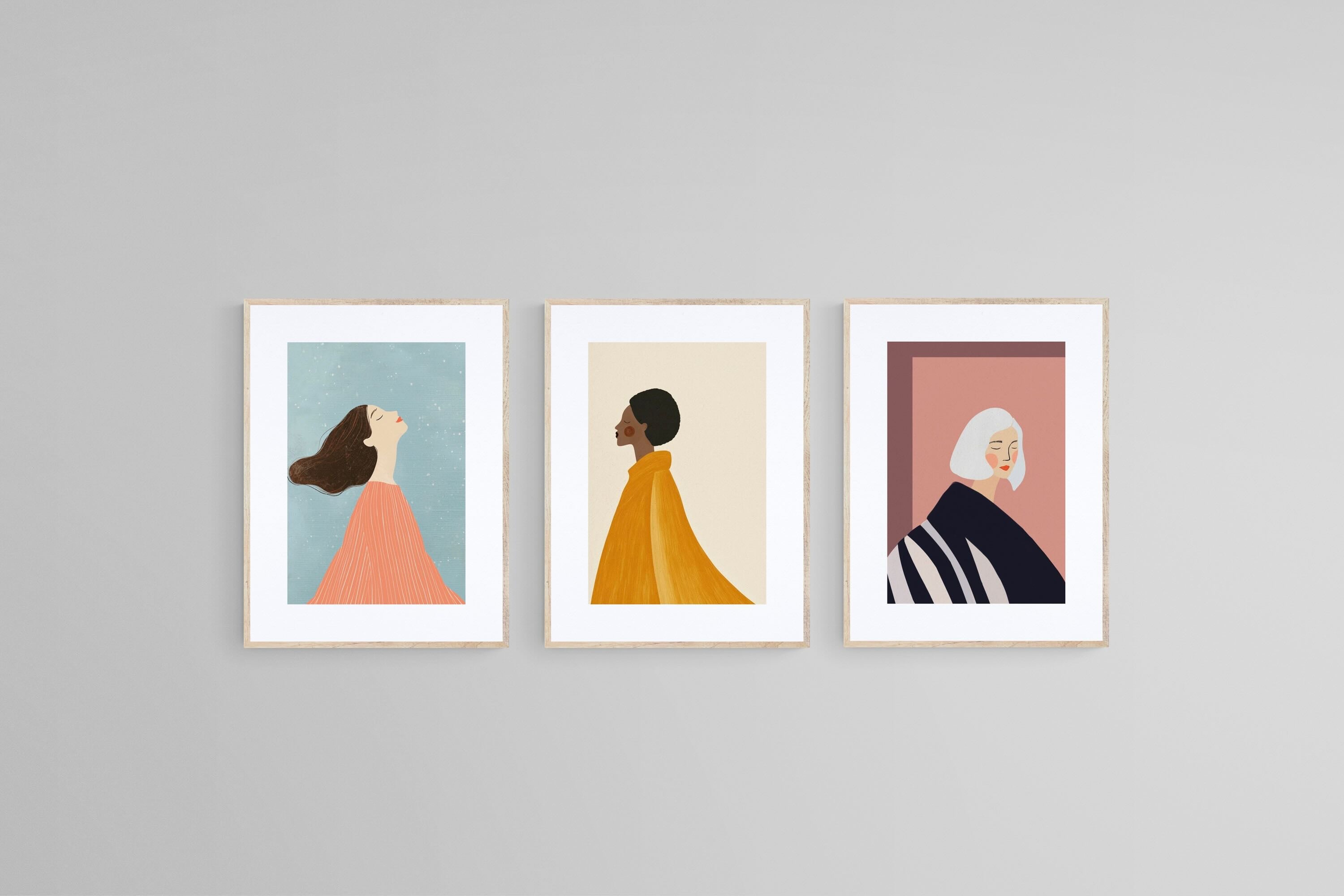 This elegant triptych of stylised female portraits blends soft colour palettes with clean, modern illustration. Each figure conveys calm confidence through subtle expression and flowing form, creating a cohesive yet varied composition. The muted blues, warm ochres and blush tones offer balance and sophistication, making it ideal for bedrooms, dressing areas or contemporary living spaces seeking a refined, feminine aesthetic.