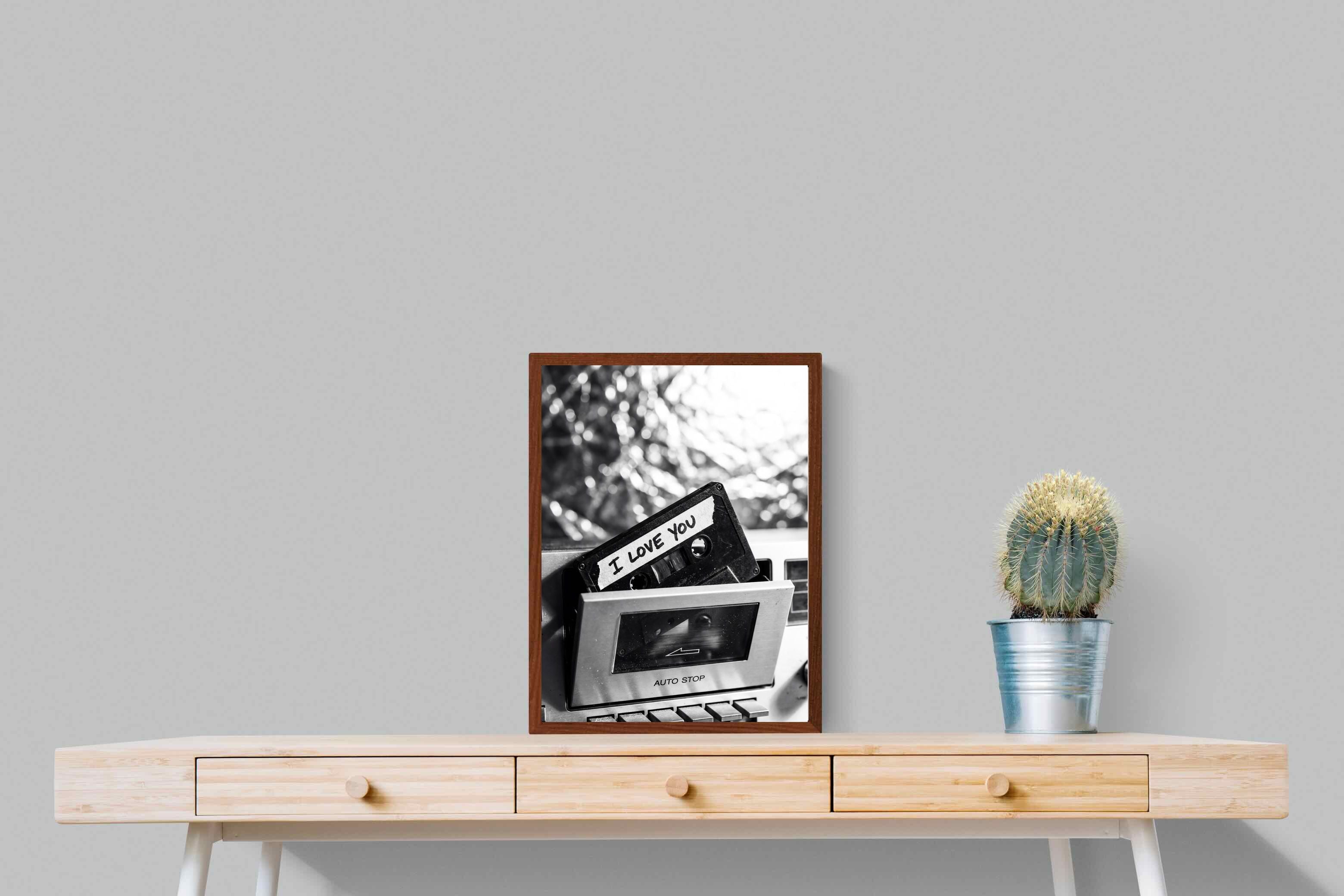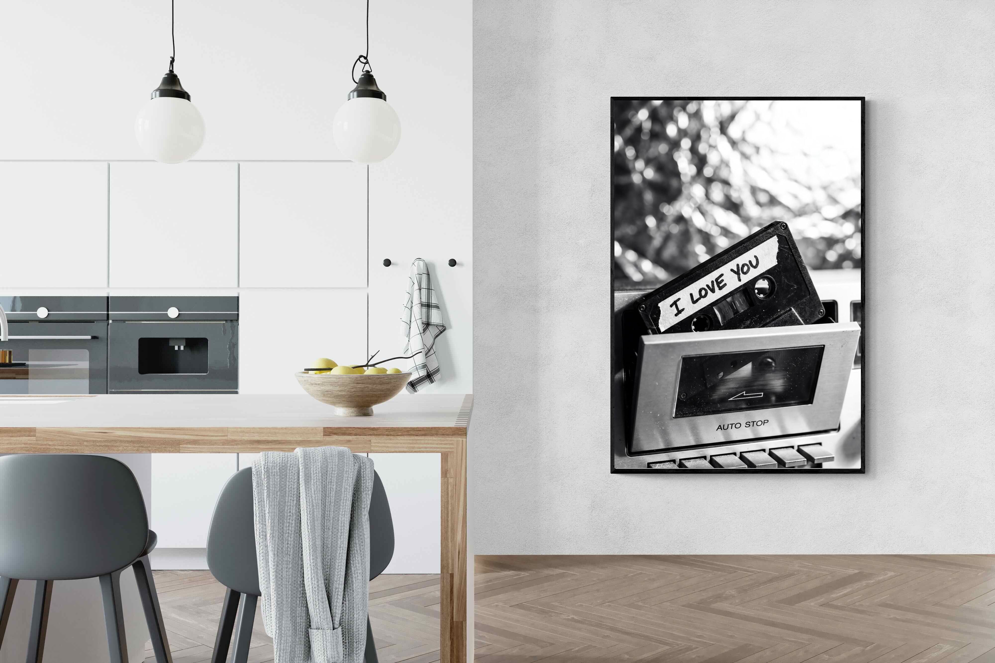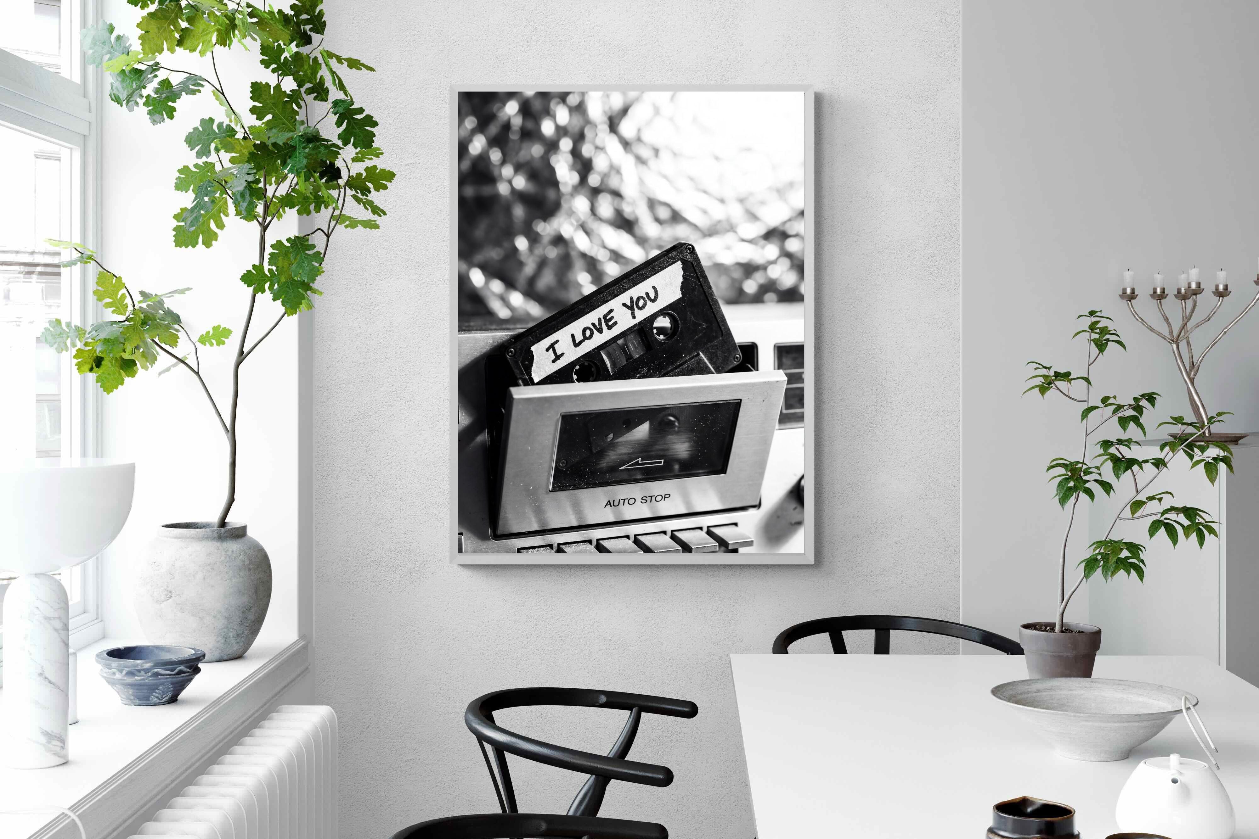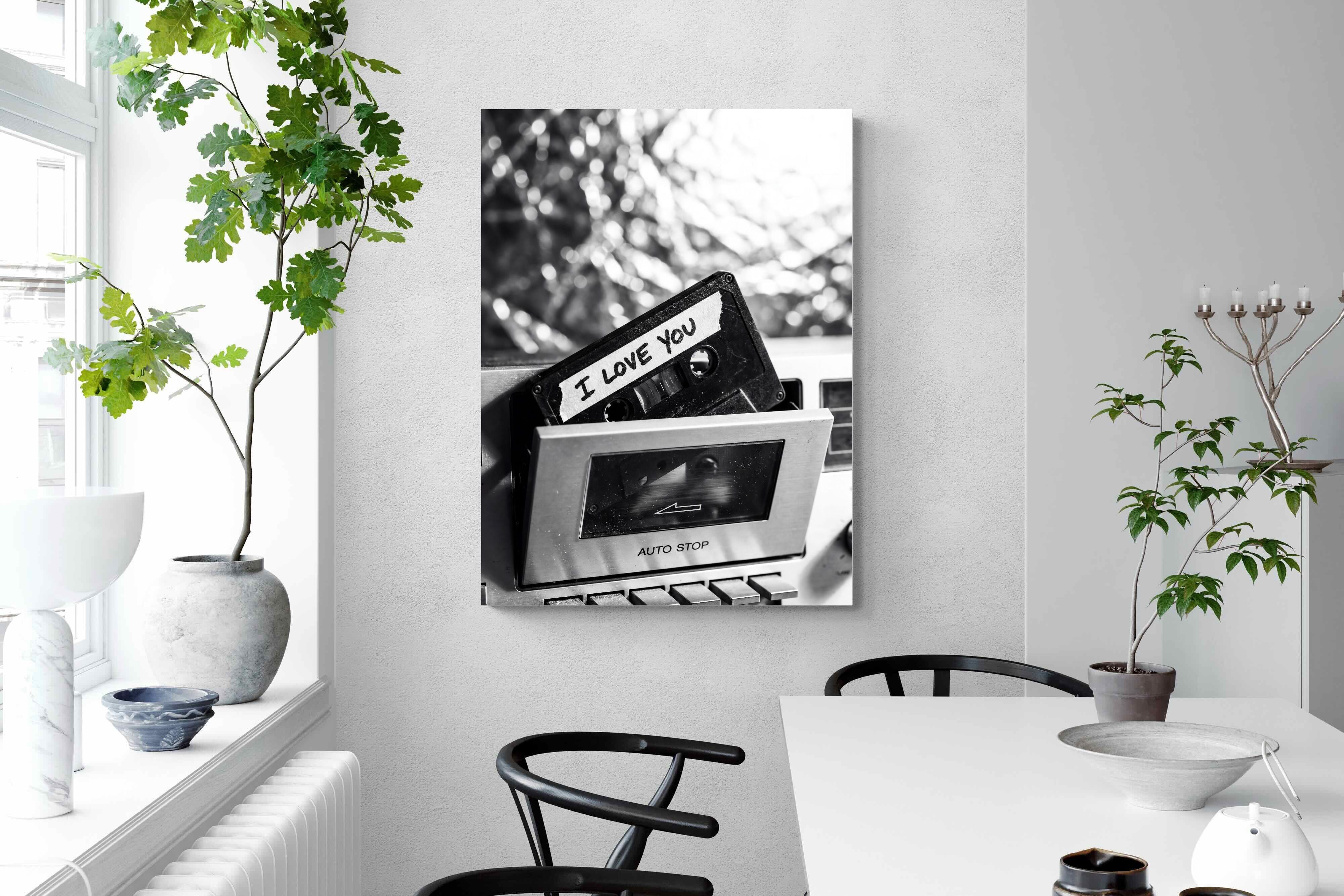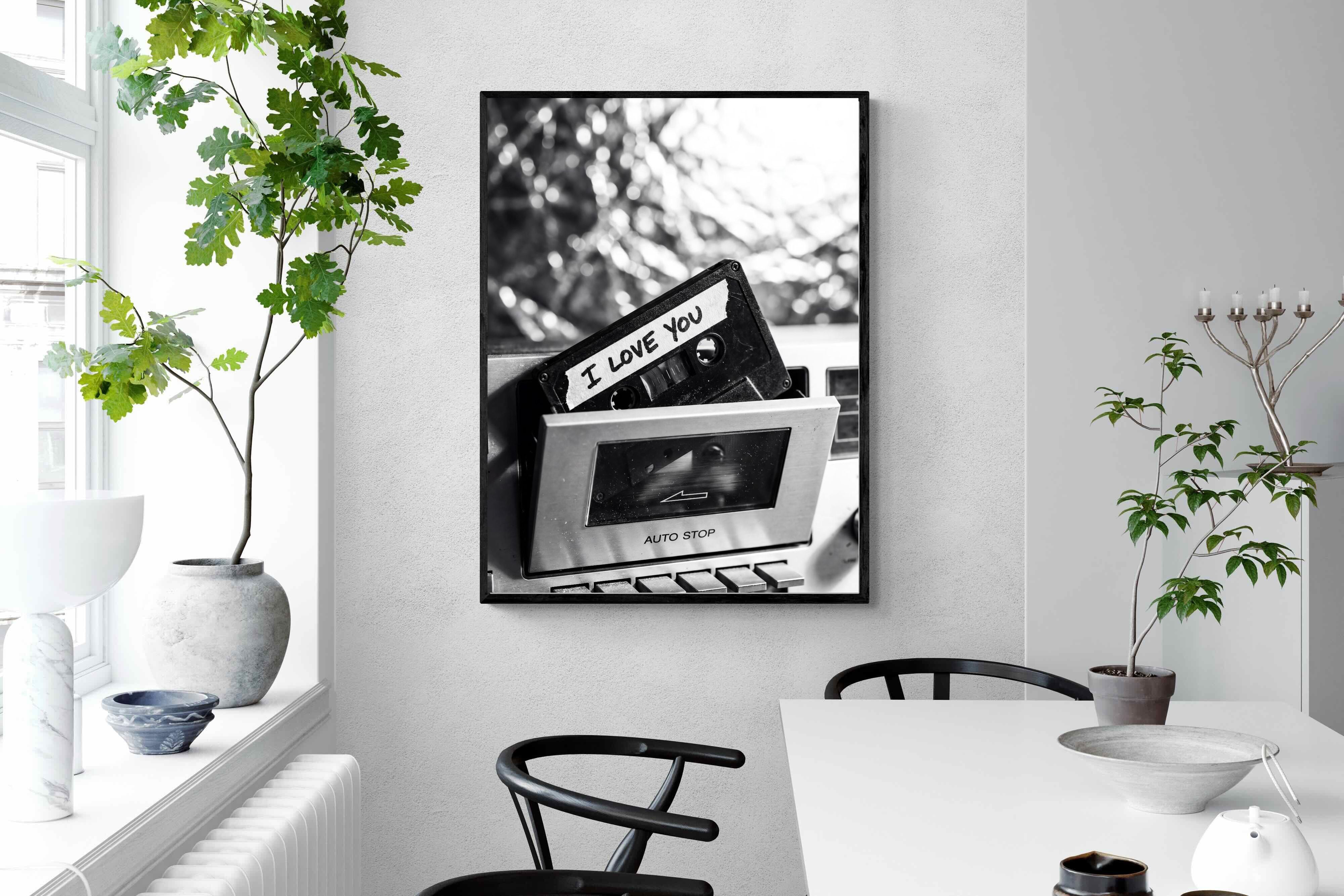A nostalgic black-and-white photograph of a cassette tape labelled “I Love You” sliding into a retro tape deck. The grainy textures and soft highlights capture the tactile charm of analogue music culture, recalling an era when playlists were handmade and deeply personal. Perfect for music lovers and retro enthusiasts, the image carries both romance and nostalgia. It suits modern, industrial and eclectic interiors where vintage technology and storytelling photography bring personality to the space.