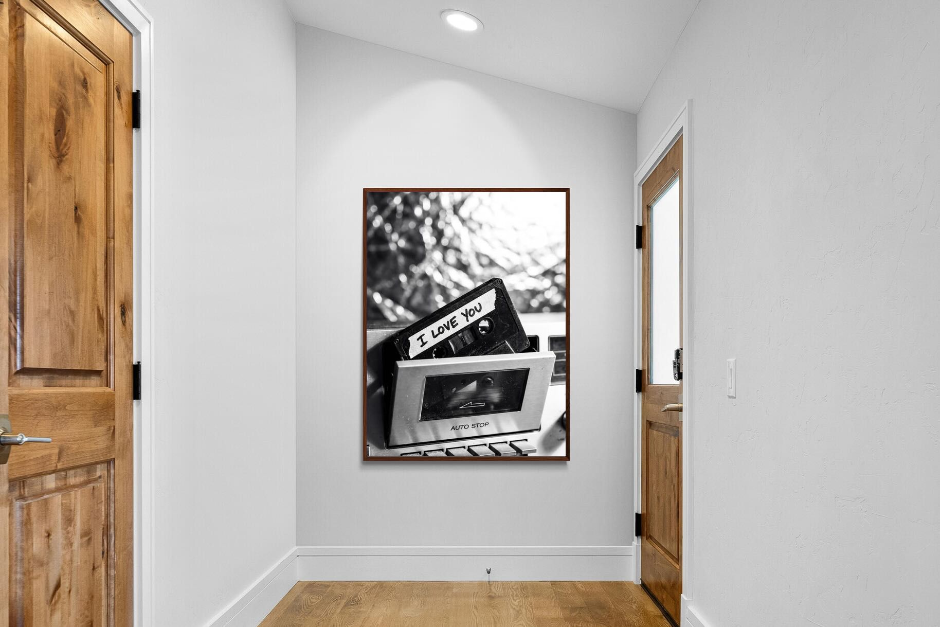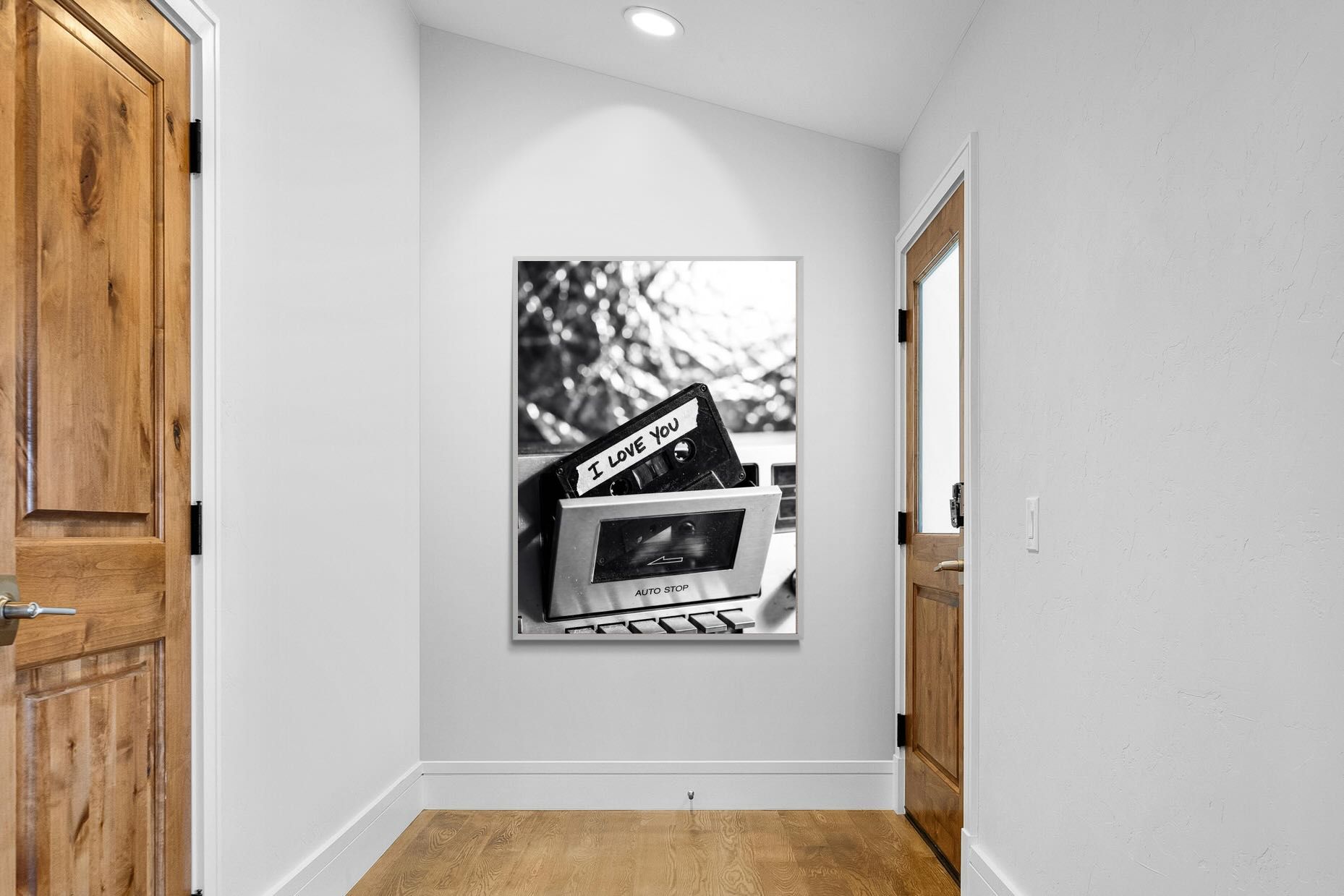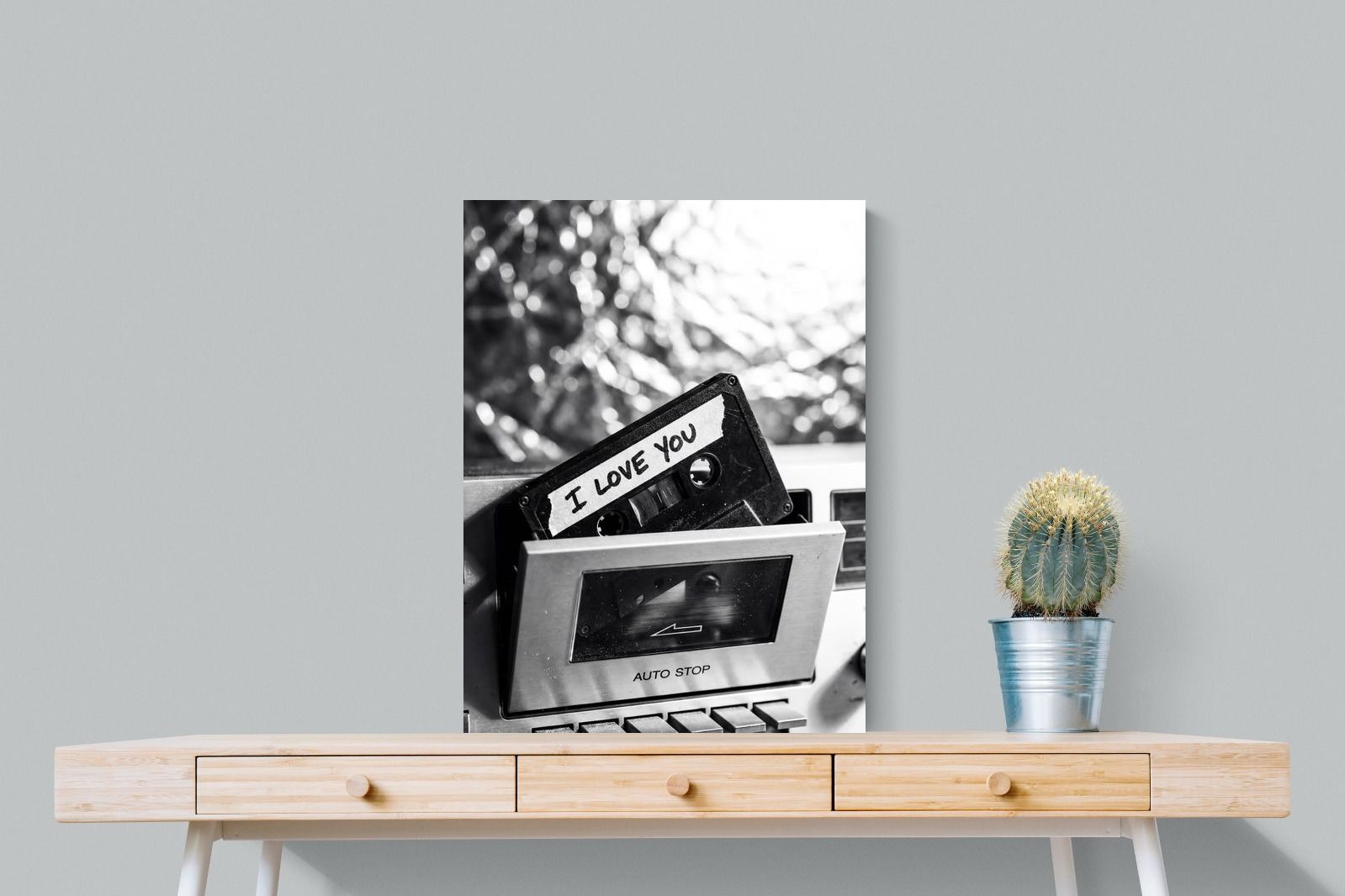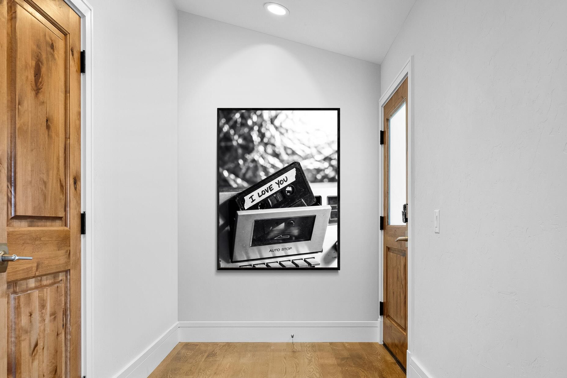 A nostalgic black-and-white photograph of a cassette tape labelled “I Love You” sliding into a retro tape deck. The grainy textures and soft highlights capture the tactile charm of analogue music culture, recalling an era when playlists were handmade and deeply personal. Perfect for music lovers and retro enthusiasts, the image carries both romance and nostalgia. It suits modern, industrial and eclectic interiors where vintage technology and storytelling photography bring personality to the space.