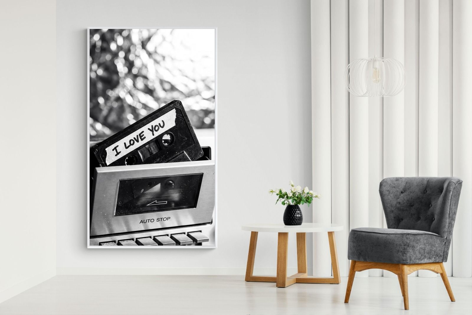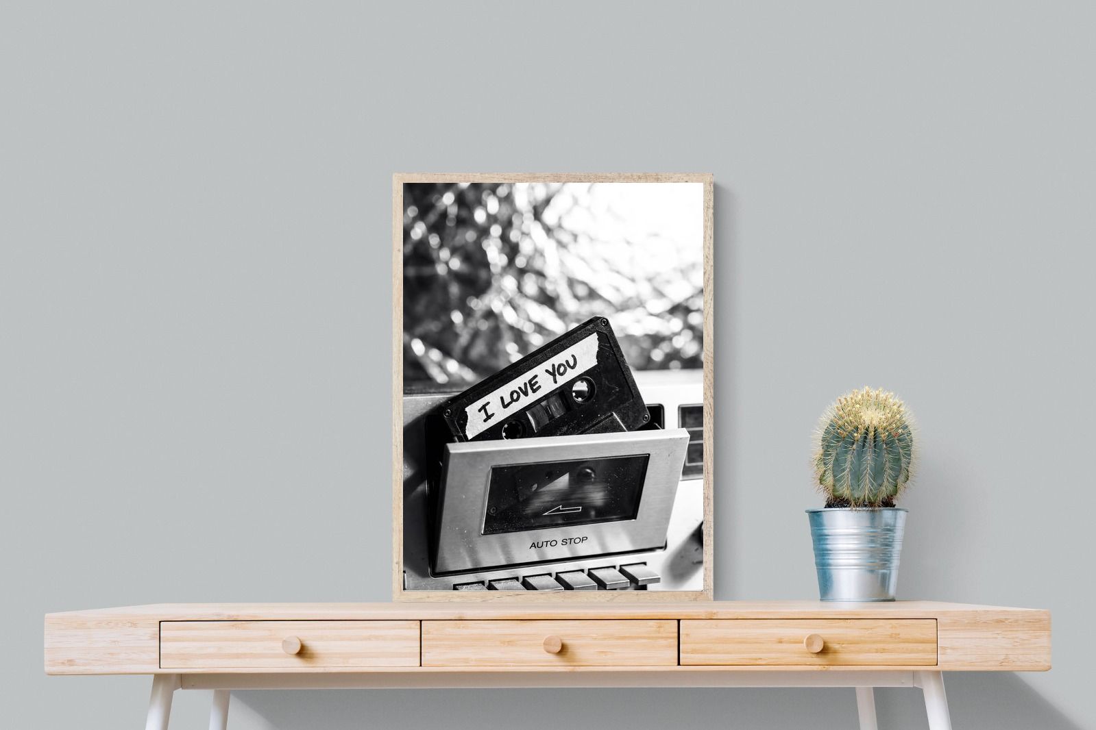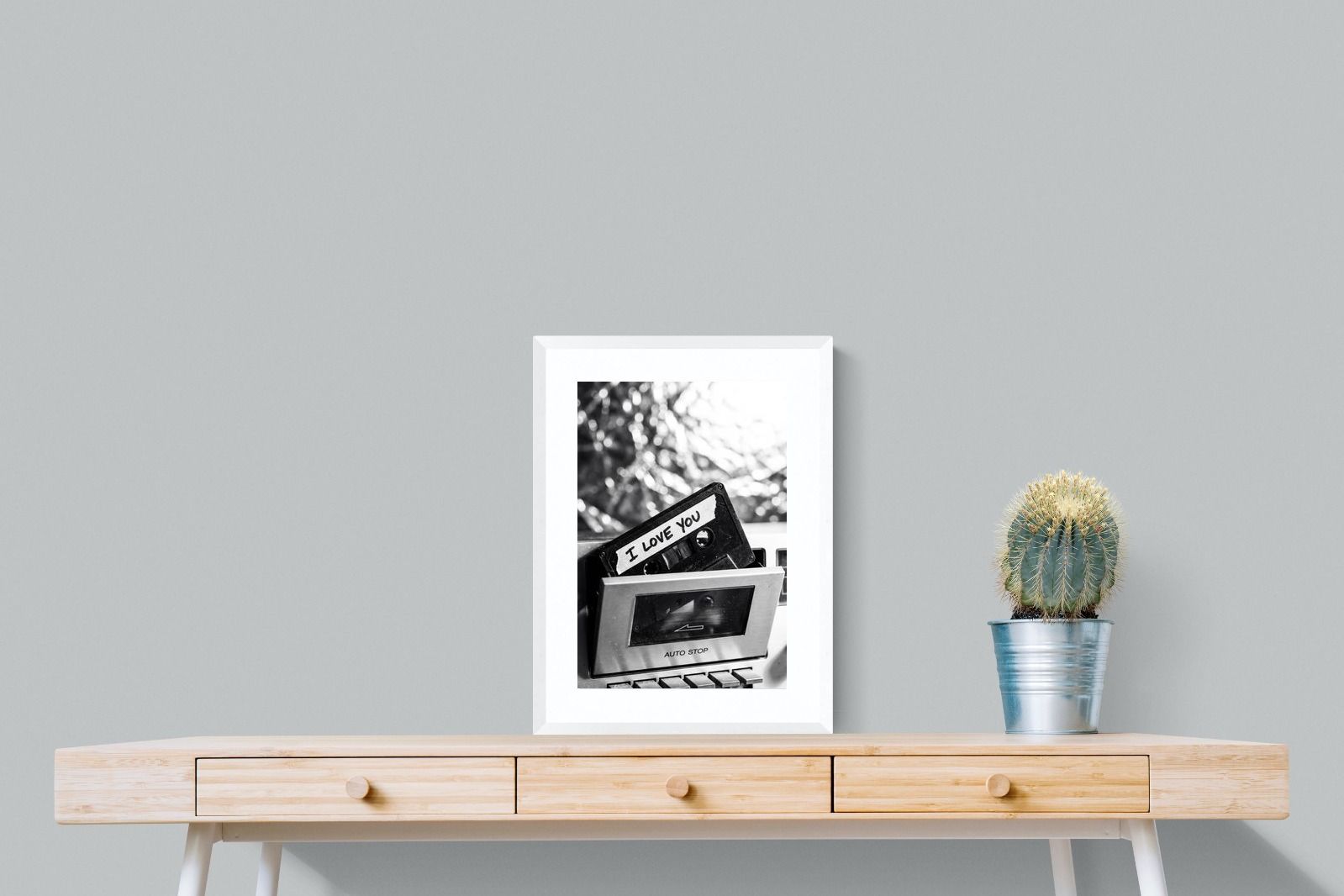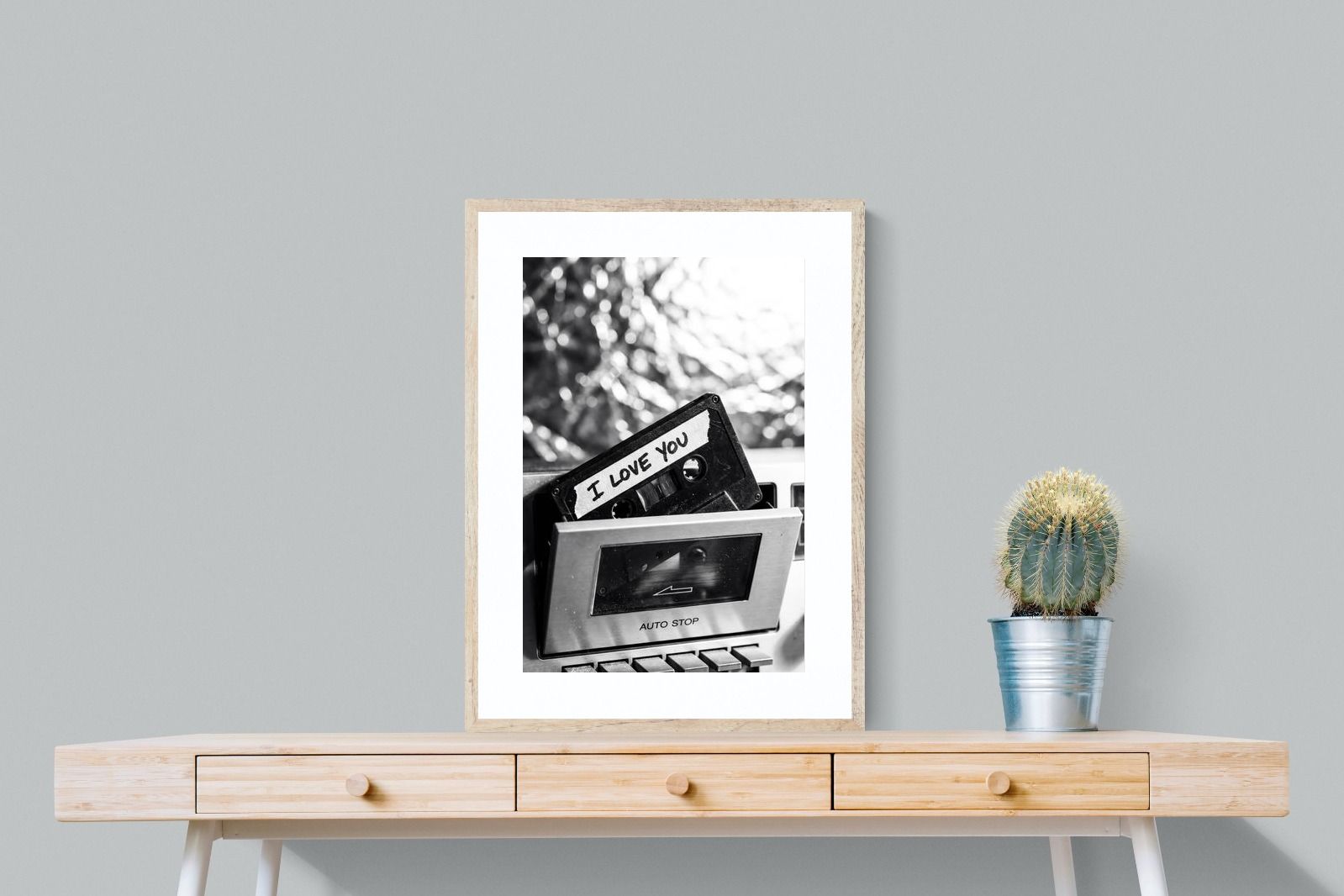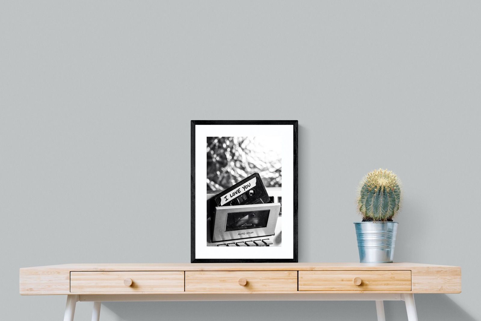 A nostalgic black-and-white photograph of a cassette tape labelled “I Love You” sliding into a retro tape deck. The grainy textures and soft highlights capture the tactile charm of analogue music culture, recalling an era when playlists were handmade and deeply personal. Perfect for music lovers and retro enthusiasts, the image carries both romance and nostalgia. It suits modern, industrial and eclectic interiors where vintage technology and storytelling photography bring personality to the space.