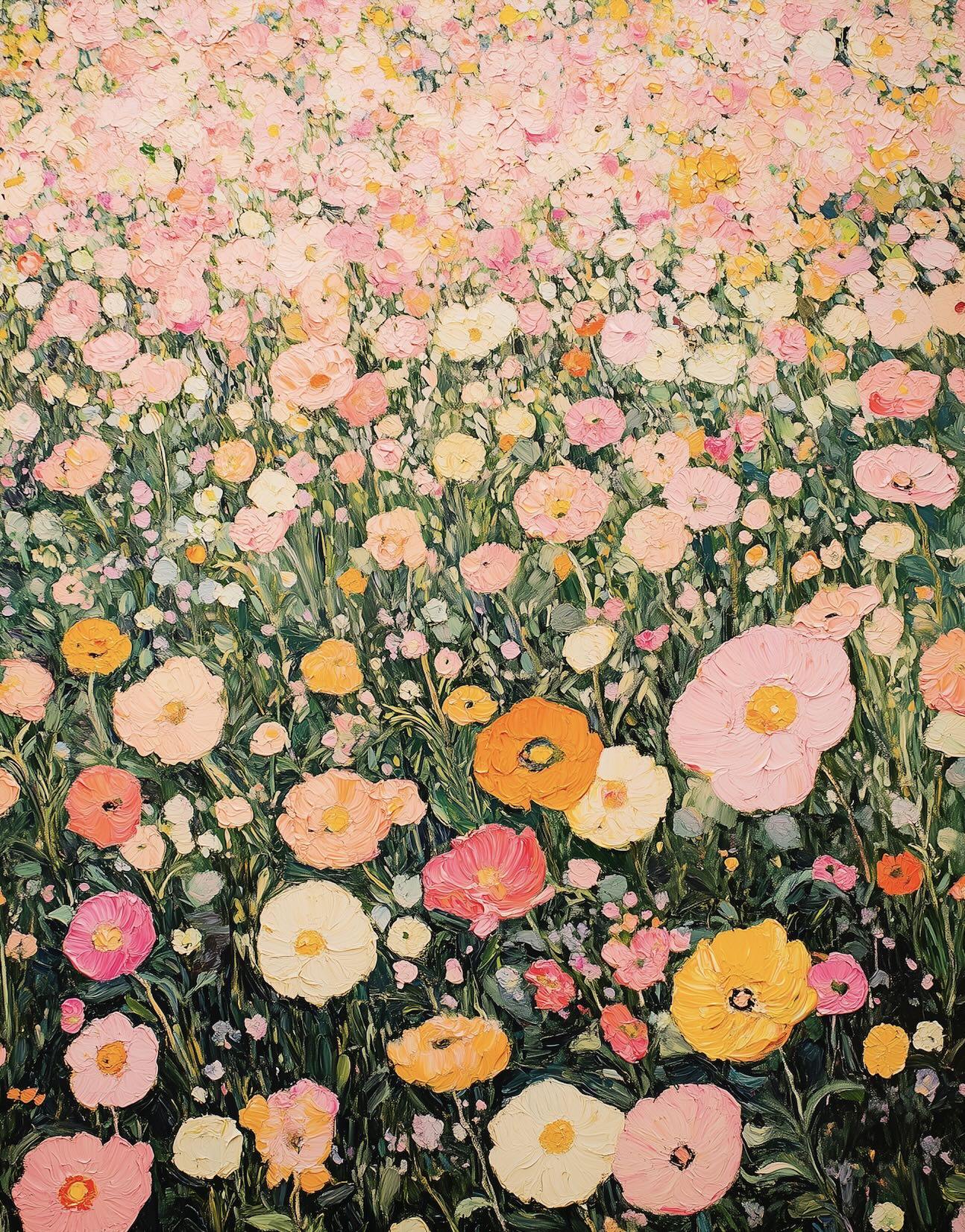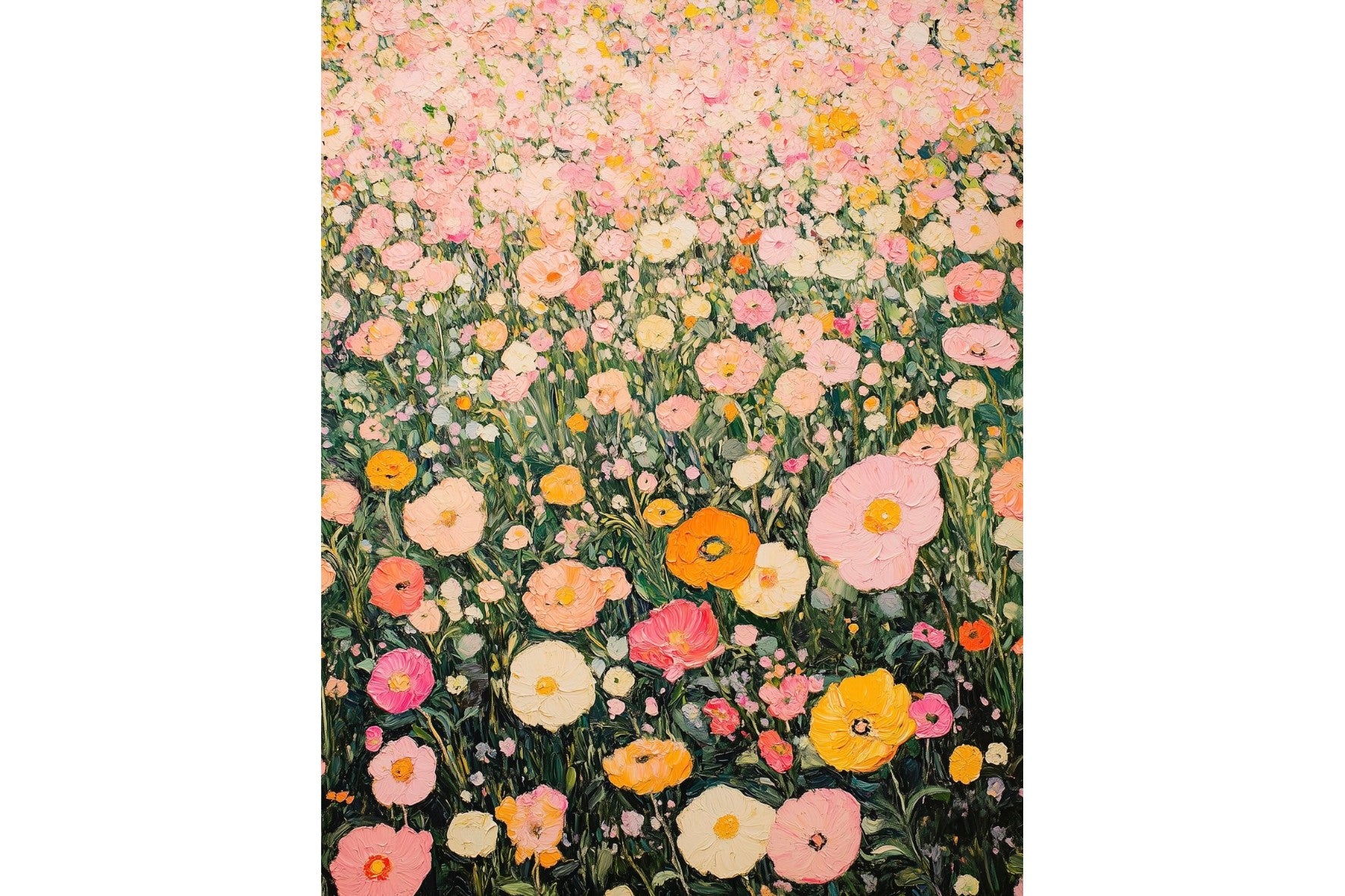This joyful floral artwork, in the style of Gustav Klimt, is filled with soft pink, cream and golden blooms, creating a lush field of colour with a romantic, painterly feel. Rich in detail yet light in mood, it suits bedrooms, lounges, hallways or feminine living spaces beautifully. Ideal for interiors that favour softness, charm and a gentle decorative lift, it brings warmth, freshness and an uplifting sense of abundance to the wall without feeling heavy.